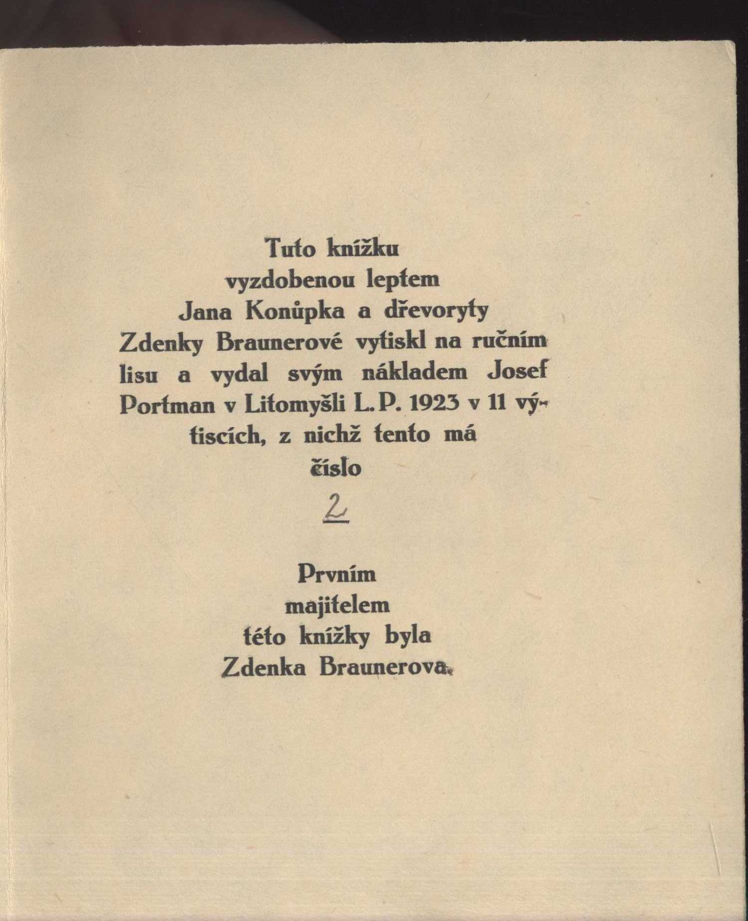 Názvové údaje Česká dekadence : Kontext - Text - Interpretace / Hana Bednaříková ; Graf. úpr. Zdeněk Granát Osobní jméno Bednaříková, Hana, 1964- (Autor) Další autoři Granát, Zdeněk, 1965- (Grafický technik) Nakladatel Brno : Centrum pro studium demokracie a kultury, 2000 Rozsah 133 s. Klíčová slova česká literatura * literární studie * literární směry * česká dekadence Počet ex. 1, z toho volných 1 Druh dok. monografie Signatura C12b 4600 Názvové údaje Stíny : básně / Hermor Lilia Osobní jméno Bíbl, František, 1880-1932 (Autor) Nakladatel Praha : [H. Lilia], 1931 Rozsah 53 stran Klíčová slova česká literatura * poezie * básně * symbolismus * dekadence * česká dekadence * česká poezie Počet ex. 2, z toho volných 2 Druh dok. monografie Signatura C12c 1754, KaG LXV 294 Názvové údaje Básnické spisy / Otokar Březina ; [úpravu její a kresby pořídil Jaroslav Benda] Osobní jméno Březina, Otokar, 1868-1929 (Autor) Další autoři Benda, Jaroslav, 1882-1970 (Knižní grafik) Korp. Spolek výtvarných umělců Mánes (Nakladatel, vydavatel) František Obzina (tiskárna, nakladatelství) (Tiskař) Nakladatel Praha : [Spolek výtvarných umělců Mánes], 1926 Výrobce F. Obzina) Rozsah 191 s. Klíčová slova česká literatura * česká poezie * symbolismus * dekadence * česká dekadence Počet ex. 1, z toho volných 1 Druh dok. monografie Signatura VHB 1444 Názvové údaje Básnické spisy II : 1901-1906 / Otokar Březina ; [vyzdobil Jan Konůpek ; vytiskl na ručním lisu a vydal svým nákladem Josef Portman] Osobní jméno Březina, Otokar, 1868-1929 (Autor) Další autoři Braunerová, Zdenka, 1858-1934 (Dřívější majitel) Konůpek, Jan, 1883-1950 (Ilustrátor) (Grafický technik) (Leptař) Portman, Josef, 1893-1968 (Tiskař) (Nakladatel, vydavatel) Nakladatel V Litomyšli : Josef Portman, 1925 Rozsah 15 s., [1] l. obr. příl. : il. Klíčová slova česká literatura * česká poezie * symbolismus * česká dekadence * dekadence * bibliofilie * bibliofilská vydání * bibliofilské tisky Počet ex. 1, z toho volných 1 Druh dok. monografie Signatura VHB 0296 Názvové údaje Jediné dílo : essay / Otokar Březina ; [tuto knížku vyzdobenou leptem Jana Konůpka a dřevoryty Zdenky Braunerové vytiskl na ručním lisu a vydal svým nákladem Josef Portman] Osobní jméno Březina, Otokar, 1868-1929 (Autor) Další autoři Braunerová, Zdenka, 1858-1934 (Dedikant) (Dřívější majitel) (Ilustrátor) (Grafický technik) (Dřevorytec) Konůpek, Jan, 1883-1950 (Ilustrátor) (Grafický technik) (Leptař) Portman, Josef, 1893-1968 (Tiskař) (Nakladatel, vydavatel) Nakladatel V Litomyšli : Josef Portman, 1923 Rozsah 16 s., [2] l. obr. příl. : il. Klíčová slova česká literatura * esej * eseje * česká esejistika * esejistické texty * symbolismus * dekadence * česká dekadence * bibliofilie * bibliofilská vydání * bibliofilské tisky Počet ex. 1, z toho volných 1 Druh dok. monografie Signatura VHB 0297 Názvové údaje Ruce / Otokar Březina ; kresbami doprovází František Bílek Osobní jméno Březina, Otokar, 1868-1929 (Autor) (Nakladatel, vydavatel) (Dedikátor) Další autoři Bílek, František, 1872-1941 (Ilustrátor) Procházka, Arnošt, 1869-1925 (Dedikant) (Dřívější majitel) Korp. Dr. Ed. Grégr (nakladatelství, tiskárna) (Tiskař) Husník a Häusler (Jiná role) Nakladatel [S. l.] : Nákladem vlastním, [1901] Výrobce (Tiskem Dra. Ed. Grégra) Rozsah 35 s., [2] s. obsahu, [3] dvojlisty, [5] listů obr. přílohy : il. + papírové pouzdro, přebal Osobní hesla Procházka, Arnošt, 1869-1925 - básník, esejista, literární a výtvarný kritik, překladatel Klíčová slova česká literatura * česká poezie * česká dekadence * přelom 19. a 20. stol. * bibliofilský tisk * bibliofilská vydání * bibliofilie Počet ex. 2, z toho volných 2 Druh dok. monografie Signatura KaG II A 25, P 142 A 1 Odkazy (1) - Monografie Názvové údaje Stráž nad mrtvými / báseň Otokara Březiny z knihy "Ruce" Osobní jméno Březina, Otokar, 1868-1929 (Autor) Další autoři Vydavatelstvo "Stanu" (Břeclav) (Nakladatel, vydavatel) Knihtiskárna Františka Navrátila (Břeclav) (Tiskař) Nakladatel V Břeclavi : Vydavatelstvo "Stanu", 1929 Výrobce Knihtiskárna Františka Navrátila Rozsah 6 stran ; 23 cm Klíčová slova česká poezie * česká dekadence * bibliofilie * smuteční tisk Počet ex. 2, z toho volných 2 Druh dok. monografie Signatura KaG XVI C 257, Holman-Březina 0506 Názvové údaje Zrcadlení v hloubce : essay / Otokar Březina ; [tuto knížku vyzdobenou leptem Jana Konůpka vytiskl na ručním lisu a vydal svým nákladem Josef Portman] Osobní jméno Březina, Otokar, 1868-1929 (Autor) Další autoři Braunerová, Zdenka, 1858-1934 (Dřívější majitel) Konůpek, Jan, 1883-1950 (Ilustrátor) (Grafický technik) (Leptař) Váchal, Josef, 1884-1969 (Ilustrátor) (Grafický technik) (Dřevorytec) Portman, Josef, 1893-1968 (Tiskař) (Nakladatel, vydavatel) Nakladatel V Litomyšli : Josef Portman, 1924 Rozsah 17 s. : il. Klíčová slova česká literatura * esej * eseje * česká esejistika * esejistické texty * symbolismus * dekadence * česká dekadence * bibliofilie * bibliofilská vydání * bibliofilské tisky Počet ex. 1, z toho volných 1 Druh dok. monografie Signatura VHB 0298 Názvové údaje Marnosti : básně / Viktor Dyk Osobní jméno Dyk, Viktor, 1877-1931 (Autor) Další autoři Stivín, Emanuel, 1848-1925 (Tiskař) Korp. Moderní revue (nakladatelství) (Nakladatel, vydavatel) Emanuel Stivín (v Praze) (Tiskař) Nakladatel Praha : Moderní revue, [1900] Výrobce (Tiskem Em. Stivína) Rozsah 76 s. Klíčová slova česká literatura * česká poezie * česká dekadence * dekadence * básně * přelom 19. a 20. stol. Počet ex. 1, z toho volných 1 Druh dok. monografie Signatura KaG XVI B 319 Názvové údaje Sursum : František Kobliha, Josef Váchal, Jan