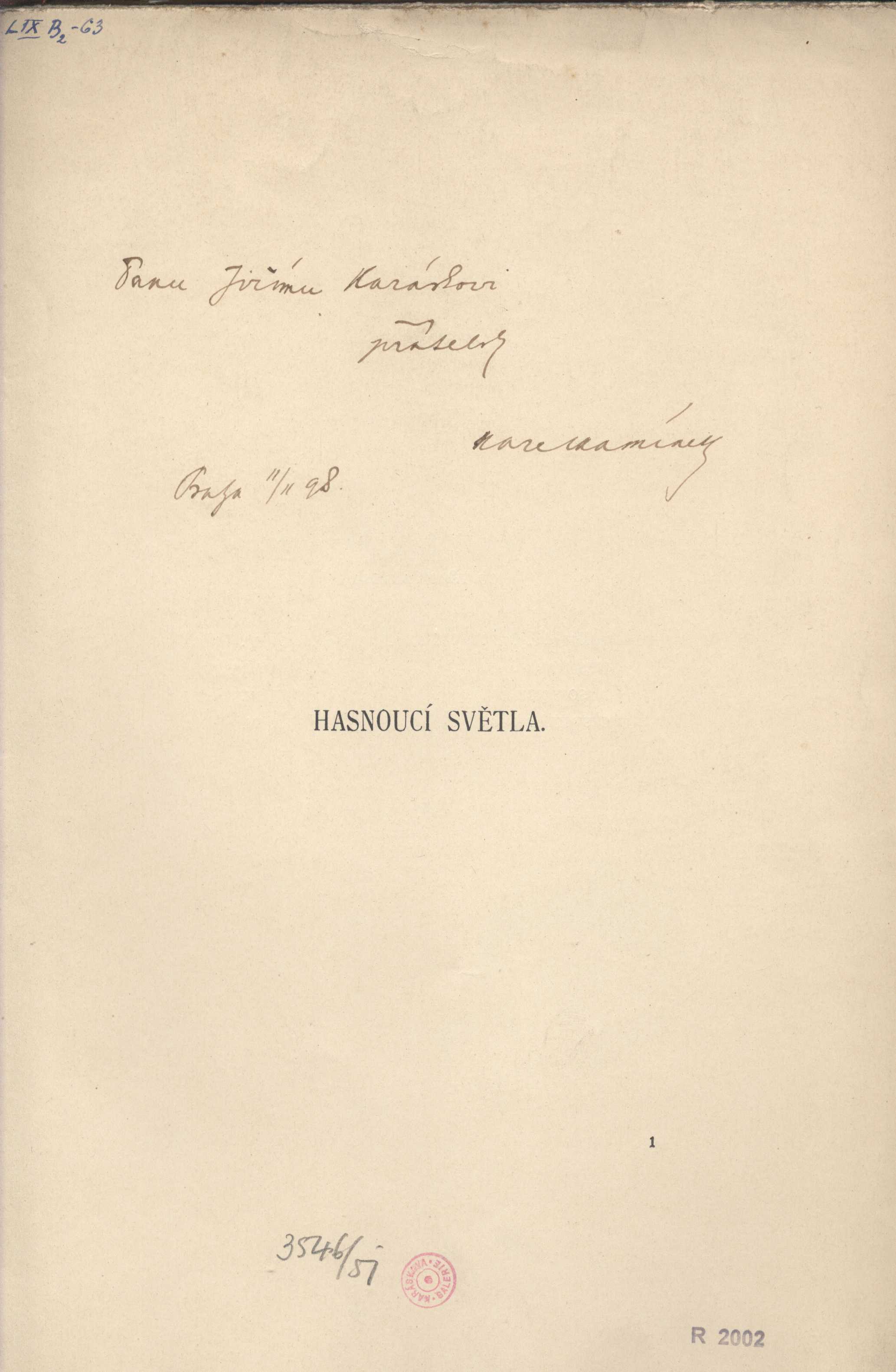Názvové údaje Z galerie českého herectva : studie a črty biografické. 1. / J. Arbes. Osobní jméno Arbes, Jakub, 1840-1914 (Autor) Další autoři Nakladatelství Jan Otto (Nakladatel, vydavatel) Unie (tiskárna) (Tiskař) Nakladatel V Praze : J. Otto, [ca 1911] Výrobce Unie Rozsah 405 stran Osobní hesla Kolár, Josef Jiří, 1812-1896 - dramatik, básník, beletrista, překladatel * Grau, Vilém, 1807-1863 - český herec * Šamberková, Julie, 1847-1892 - česká herečka Klíčová slova česká literatura * české divadlo * české dramatické umění * čeští herci * české herečky * české herectví * biografie * biografické články * biografické studie * stol. 19. * divadlo Počet ex. 7, z toho volných 7 Druh dok. monografie Signatura KaG XV B 95/1, P 125 f 30, P31 e 32, F I 2499, P 55 a 98, P 31 e 33, F I 2500 Názvové údaje Z galerie českého herectva : studie a črty biografické. 2. / J. Arbes. Osobní jméno Arbes, Jakub, 1840-1914 (Autor) Další autoři Nakladatelství Jan Otto (Nakladatel, vydavatel) Unie (tiskárna) (Tiskař) Nakladatel [ca 10.-20. léta 20. st.] V Praze : J. Otto, [1914] Výrobce Unie Rozsah 311 stran Osobní hesla Podhorská, Kateřina, 1807-1889 - operní pěvkyně * Kolár, František Karel, 1829-1895 - herec, kreslíř, karikaturista Humoristických listů, režisér a kostýmní výtvarník, ředitel Prozatímního divadla * Mošna, Jindřich, 1837-1911 - herec, autor sólových výstupů a memoárových publikací * Heintzová, Albína - česká herečka * Mácha, Karel Hynek, 1810-1836 - básník, beletrista, dramatik * Seifert, Jakub, 1846-1919 - český herec a režisér * Seifertová, Terezie, 1844-1914 - česká herečka * Sklenářová-Malá, Otylie, 1844-1912 - herečka Klíčová slova česká literatura * české divadlo * české dramatické umění * čeští herci * české herečky * české herectví * biografie * biografické články * biografické studie * stol. 19. * divadlo Počet ex. 10, z toho volných 10 Druh dok. monografie Signatura KaG XV B 95/2, L 25 d 67, P 31 e 35, F I 2501, P 55 a 99, P 125 f 37, P 73 g 13, P 23 b 37, F I 2491, P 31 e 34 Názvové údaje Zlatovlasá furie : zpěvohra o třech jednáních / Jakub Arbes ; z pozůstalosti Jakuba Arbesa vybrala, upravila a poznámkami opatřila Anna Karasová ; předmluvu napsal Karel Polák ; v typografické úpravě M. Kalába Osobní jméno Arbes, Jakub, 1840-1914 (Autor) Další autoři Polák, Karel, 1903-1956 (Autor úvodu atd.) Karasová, Anna, 1909- (Editor) Kaláb, Method, 1885-1963 (Typograf) Girgal, Otto, 1886-1958 (Nakladatel, vydavatel) Korp. Otto Girgal (nakladatelství) (Nakladatel, vydavatel) Průmyslová tiskárna v Praze (Tiskař) Nakladatel Praha : Nakladatelství Otto Girgal, 1942 Výrobce (Průmyslová tiskárna) Rozsah 41 stran Klíčová slova česká literatura * české drama * české dramatické umění * opera Počet ex. 7, z toho volných 7 Druh dok. monografie Signatura KaG XXXIII E 69, VHB 0246, Thon 1551, P 94 d 20, P 65 e 77, P 22 d 80, K Y VI 28 Názvové údaje J. K. Tyla Had z ráje : život - divadlo / V. Kr. Blahník ; s Tylovou podobiznou dle současné kresby J. Bekla Osobní jméno Blahník, Vojtěch Kristián, 1888-1934 (Autor) Další autoři Karásek ze Lvovic, Jiří, 1871-1951 (Autor podpisu) Bekl, Josef, 1806-1865 (Ilustrátor) Korp. Knihtiskárna Prometheus (Nakladatel, vydavatel) Litera (Praha, Česko) (Tiskař) Nakladatel Praha : Prometheus, 1926 Výrobce (Knihtiskárna "Litera") Rozsah 439 s. : il. Osobní hesla Tyl, Josef Kajetán, 1808-1856 - dramatik, prozaik, novinář a kritik Klíčová slova česká literatura * české drama * české dramatické umění * Tyl J. K. * monografie Počet ex. 1, z toho volných 1 Druh dok. monografie Signatura KaG XXXVII A 17 Názvové údaje Divadelní radosti i starosti : vzpomínky / Frant. Bohuslav Osobní jméno Bohuslav, František, 1882-1953 (Autor) (Nakladatel, vydavatel) Další autoři Dr. Ed. Grégr a syn (nakladatelství, tiskárna) (Tiskař) Nakladatel V Praze : [F. Bohuslav], 1925 Výrobce (Tiskem Dr. Ed. Grégra a syna) Rozsah 95 s. Osobní hesla Bohuslav, František, 1882-1953 - herec, básník, dramatik Klíčová slova česká literatura * divadlo * české divadlo * české dramatické umění * herci * vzpomínky * memoárová literatura Počet ex. 1, z toho volných 1 Druh dok. monografie Signatura KaG XLVIII D3 183 Názvové údaje Železná doba divadla : [projevy z války] / Jiří Frejka ; [frontispice kresba Františka Tröstera ke Gogolovu Revisoru ; s obálkou a v úpravě Jiřího Trnky] Osobní jméno Frejka, Jiří, 1904-1952 (Autor) Další autoři Tröster, František, 1904-1968 (Ilustrátor) Trnka, Jiří, 1912-1969 (Autor obálky) (Knižní grafik) Korp. Melantrich (nakladatelství) (Nakladatel, vydavatel) Nakladatel V Praze : Melantrich, 1945 Výrobce (Melantrich) Rozsah 136, [4] s., [24] s. obr.příl. : il. ; 20,2 cm Klíčová slova česká literatura * eseje * studie * české divadlo * české dramatické umění Počet ex. 5, z toho volných 5 Druh dok. monografie Signatura MUK 153, LK M 73 b 12, MEL 1325, MEL 1325a, OŘíha 017 Názvové údaje Hry a protihry / napsal a nakreslil Adolf Hoffmeister ; [typograficky upravil Antonín Dvořák ; hudbu k Zpívajícím Benátkám napsal Jaroslav Ježek ; operu Brundibár Hans Krása] Osobní jméno Hoffmeister, Adolf, 1902-1973 (Autor) (Ilustrátor) Další autoři Dvořák, Antonín, 1920-1997 (Grafický technik) Krása, Hans, 1899-1944 (Skladatel) Ježek, Jaroslav, 1906-1942 (Skladatel) Korp. Orbis (tiskárna) (Nakladatel, vydavatel) Polygrafia (tiskárna, Praha) (Tiskař) Nakladatel Praha : Orbis, 1963 Výrobce (Polygrafia) Rozsah 335 s. : il. Klíčová slova české divadlo * české drama * české dramatické umění * divadelní hry * drama * válka Počet ex. 1, z toho volných 1 Druh dok. monografie Signatura Hoffmeister 0107 Názvové údaje Hry z avantgardy / napsal