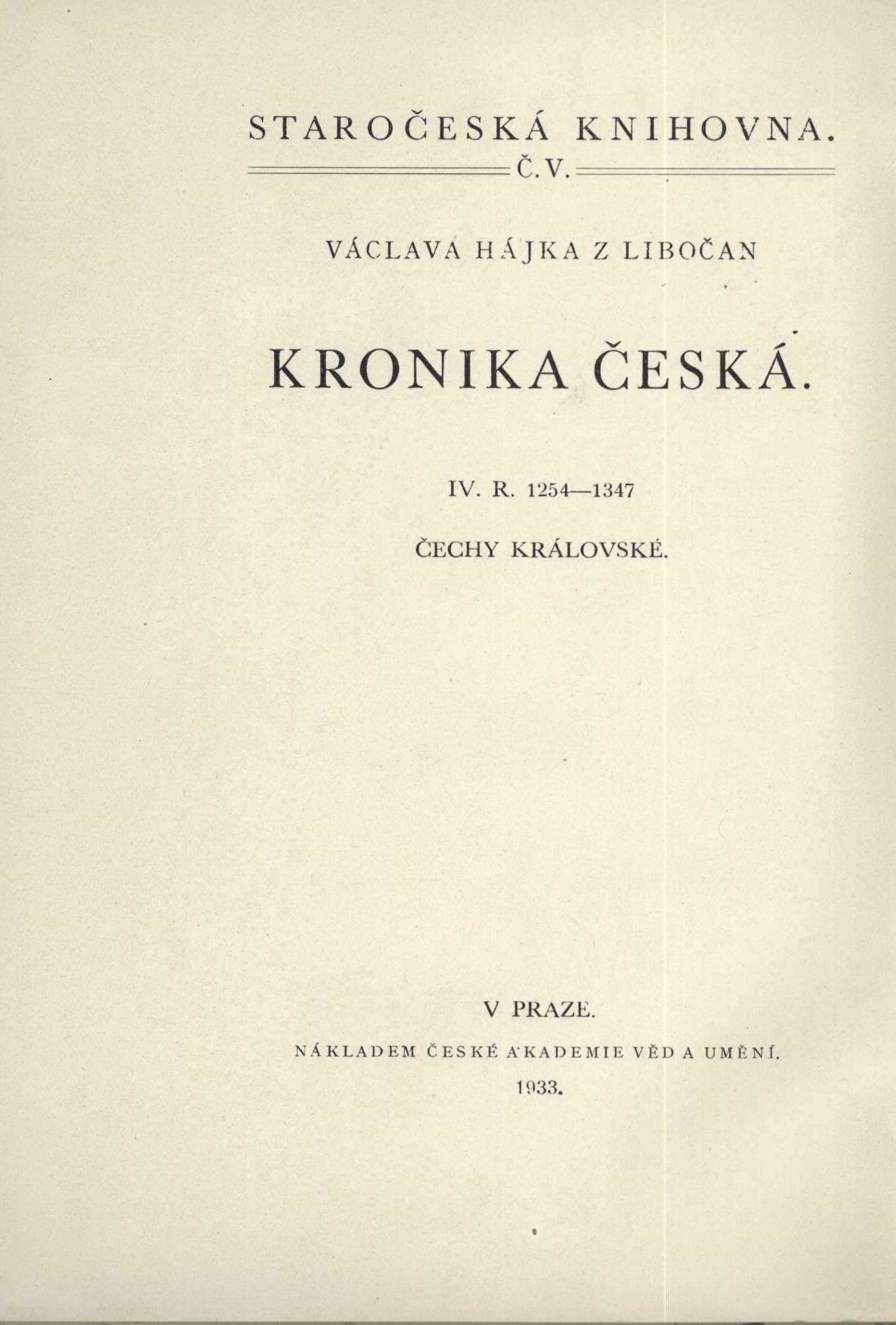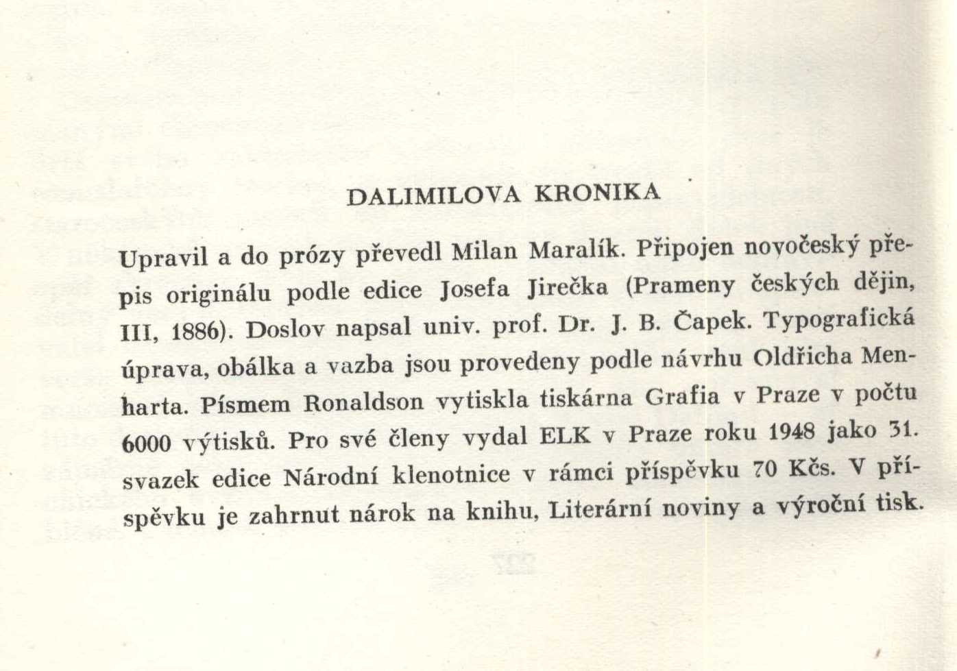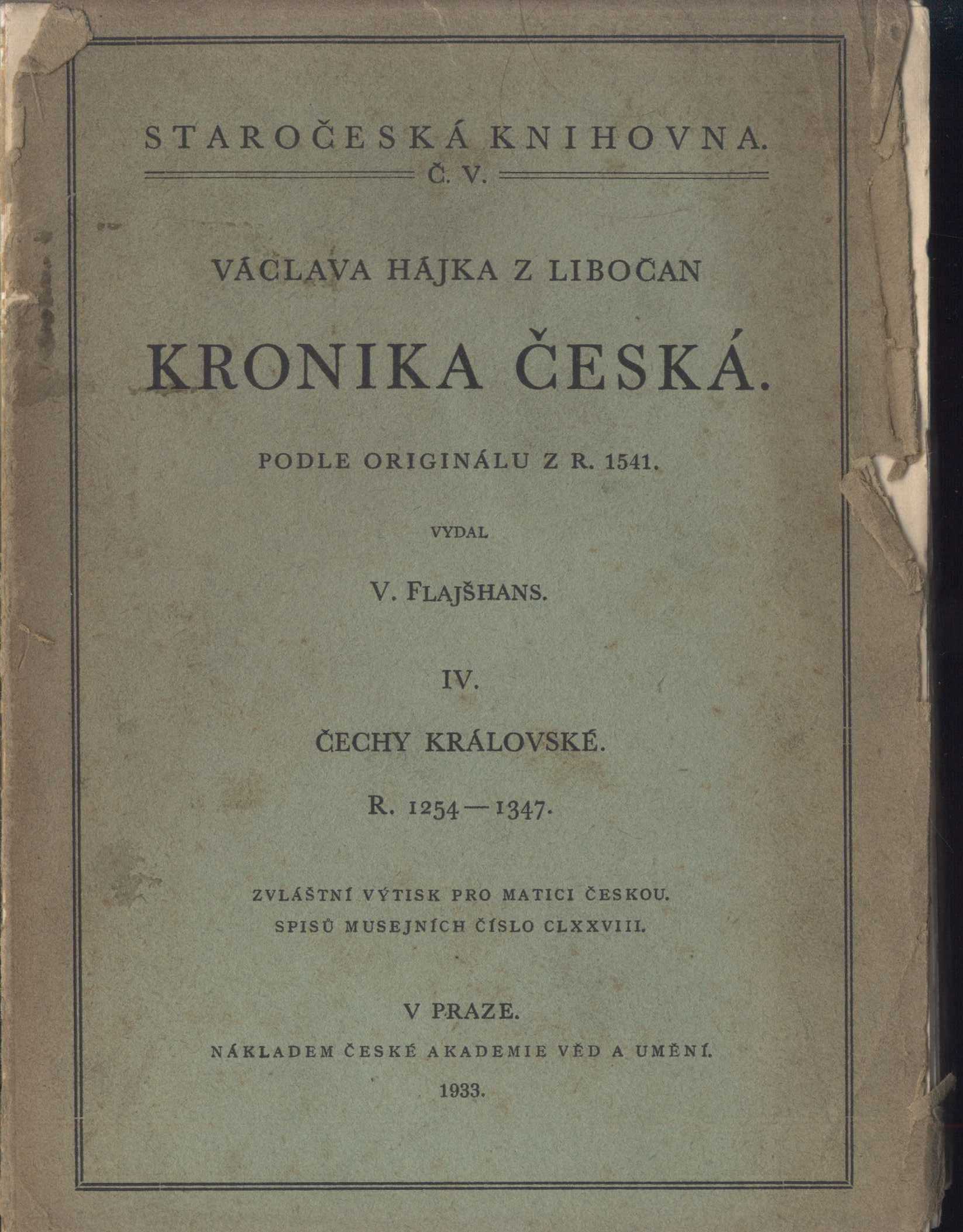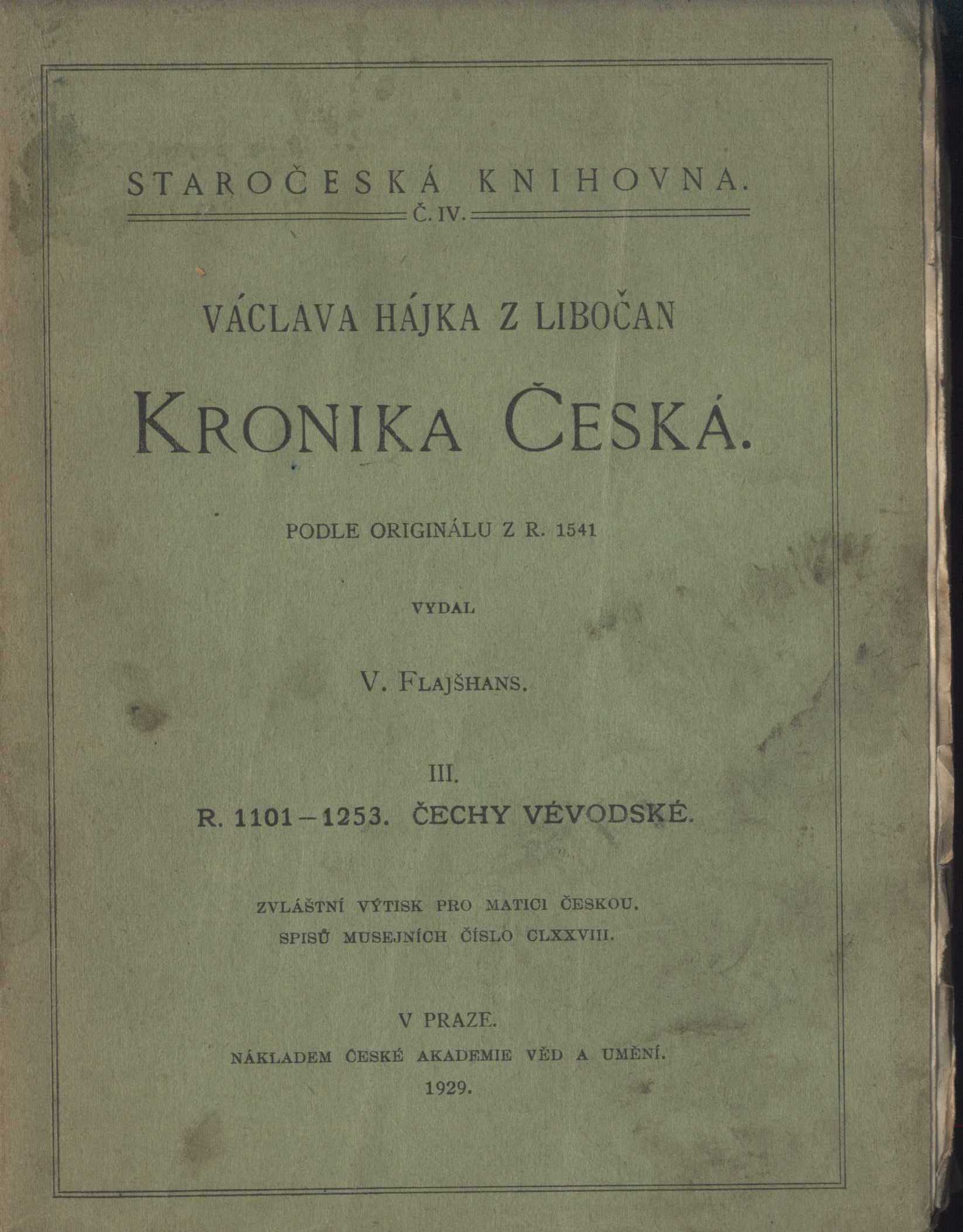 Názvové údaje Bohuslava Bílejovského Kronika česká : studijní texty ETF v Praze / [k vydání připravil, úvodní studií, poznámkami a rejstříky opatřil Ota Halama ; typografie Petr Kadlec] Osobní jméno Bílejovský, Bohuslav, 1480-1555 (Autor) Další autoři Halama, Ota, 1974- (Editor) Kadlec, Petr (Typograf) Korp. Univerzita Karlova. Evangelická teologická fakulta (Nakladatel, vydavatel) Kalich, nakladatelství a knihkupectví (Nakladatel, vydavatel) Protisk (tiskárna, České Budějovice) Nakladatel Praha : Kalich : Univerzita Karlovav Praze, Evangelická teologická fakulta, 2011 Rozsah 147 s. : il., faksim. Osobní hesla Bílejovský, Bohuslav, 1480-1555 - kališnický kněz, autor církevní České kroniky Klíčová slova česká literatura * studie * studijní texty * kronika * stol. 15.-16. * utrakvisté * kněží * Bílejovský B. * Čechy a Morava Počet ex. 1, z toho volných 1 Druh dok. monografie Signatura C12b 13682 Názvové údaje Dalimilova kronika / upravil [a do prózy převedl] Milan Maralík / [připojen novočeký překlad originálu podle edice Josefa Jirečka (Prameny českých dějin III, 1886) ; doslov napsal J.B. Čapek ; typografická úprava, obálka a vazba jsou provedeny podle návrhu Oldřicha Menharta] Autor Dalimil, -asi 1347 (Autor) Další autoři Maralík, Milan, 1912-1987 (Autor adaptace, upravovatel) Jireček, Josef, 1825-1888 (Autor adaptace, upravovatel) Čapek, Jan Blahoslav, 1903-1982 (Autor doslovu, tiráže atd.) Menhart, Oldřich, 1897-1962 (Typograf) (Autor obálky) Korp. Evropský literární klub (nakladatelství) (Nakladatel, vydavatel) Grafia (tiskárna, nakladatelství) (Tiskař) Nakladatel V Praze : Nakladatelství ELK, 1948 Výrobce (Grafia) Rozsah 227 s. Klíčová slova české kroniky * staročeské kroniky * dějiny českých zemí * poč.-stol. 14. Počet ex. 1, z toho volných 1 Druh dok. monografie Signatura VMartínek 0753 Názvové údaje Václava Hájka z Libočan Kronika česká / podle originálu z r. 1541 vydal V. Flajšhans. III., Čechy vévodské. R. 1101-1253 Osobní jméno Hájek z Libočan, Václav, -1553 (Autor) Další autoři Flajšhans, Václav, 1866-1950 (Editor) Korp. Česká akademie věd a umění (Nakladatel, vydavatel) E. Leschinger (knihtiskař, nakladatel) (Tiskař) Nakladatel V Praze : Nákladem České akademie věd a umění, 1929 Výrobce (Tiskem E. Leschingra) Rozsah 458 s. : il. Klíčová slova česká literatura * starší česká literatura * renesanční literatura * české kroniky * kroniky * kroniky * české dějiny Počet ex. 1, z toho volných 1 Druh dok. monografie Signatura VHB 199/1 Názvové údaje Václava Hájka z Libočan Kronika česká / podle originálu z r 1541 vydal V. Flajšhans. IV., Čechy královské. R. 1254-1347 Osobní jméno Hájek z Libočan, Václav, -1553 (Autor) Další autoři Flajšhans, Václav, 1866-1950 (Editor) Korp. Česká akademie věd a umění (Nakladatel, vydavatel) Československá grafická unie (tiskařství a nakladatelství) (Tiskař) Nakladatel V Praze : Nákladem České akademie věd a umění, 1933 Výrobce (Tiskem Československé grafické Unie) Rozsah 410 s. : il. Klíčová slova česká literatura * starší česká literatura * renesanční literatura * české kroniky * kroniky * kroniky * české dějiny * r. 1254-1347 Počet ex. 4, z toho volných 4 Druh dok. monografie Signatura MUK 87, LK P I E 29, VMartínek 0751, VHB 0199/2 Názvové údaje Hystorye města Litomyssle / sepsána od Frantisska Geljnka. dlj prwnj Osobní jméno Jelínek, František, 1783-1856 (Autor) Další autoři Tureček, Jan Josef, -1836 (Nakladatel, vydavatel) Nakladatel Litomyssl : Tisstěná u Jana Turečkovwých Dědičů, 1838 Rozsah XVI, 304 s. ; 8° Klíčová slova české kroniky * kroniky * česká města * města * Litomyšl Počet ex. 1, z toho volných 1 Druh dok. monografie Signatura L VIII e 23 Názvové údaje Hystorye města Litomyssle / sepsána od Frantisska Geljnka. dlj třetj Osobní jméno Jelínek, František, 1783-1856 (Autor) Další autoři Tureček, Jan Josef, -1836 (Nakladatel, vydavatel) Nakladatel Litomyssl : Tisstěná u Jana Turečkovwých Dědičů, 1845 Rozsah 272, [24] s. ; 8° Klíčová slova česká literatura * kroniky * české kroniky * města * česká města * Litomyšl Počet ex. 2, z toho volných 2 Druh dok. monografie Signatura L VI f 15, L VIII e 25 Názvové údaje Des Dekans Cosmas Chronik von Böhmen / nach der Ausgabe der Monumenta germaniae übersetzt von Georg Grandaur Autor Kosmas, asi 1045-1125 (Autor) Další autoři Grandaur, Georg (Překladatel) (Autor úvodu atd.) Vochoč, Martin Jan, 1910-1967 (Autor podpisu) (Dřívější majitel) Korp. Franz Duncker (Berlin, Německo) (Nakladatel, vydavatel) Beck & Schirmer (tiskárna) (Tiskař) Nakladatel Leipzig : Franz Duncker, 1885 Výrobce (Beck & Schirmer) Rozsah vi, 246 s. Klíčová slova česko-latinská literatura * latinská literatura * česká literatura * starší česká literatura * česká středověká literatura * středověká latinská literatura * středověká literatura * české kroniky * kronika * kroniky * kronikářské záznamy Počet ex. 1, z toho volných 1 Druh dok. monografie Signatura VHB 0173 Názvové údaje Kosmova kronika česká / [překlad Karel Hrdina a Marie Bláhová ; úvod Dušan Třeštík ; komentáře Petr Kopal ; seznam rukopisů, vysvětlivky a poznámky Marie Bláhová] Autor Kosmas, asi 1045-1125 (Autor) Další autoři Bláhová, Marie, 1944- (Překladatel) (Bibliografický předchůdce) Hrdina, Karel, 1882-1949 (Překladatel) Třeštík, Dušan, 1933-2007 (Autor úvodu atd.) Kopal, Petr, 1834-1917 (Autor komentáře textu) Nakladatel Praha ; Litomyšl : Paseka, 2005 Rozsah 301 s. Osobní hesla Kosmas, asi 1045-1125 - katolický kněz, děkan pražské kapituly, autor Kroniky české Klíčová slova česká literatura * dějiny českých zemí * české kroniky * stol. 12. Počet ex. 1, z to