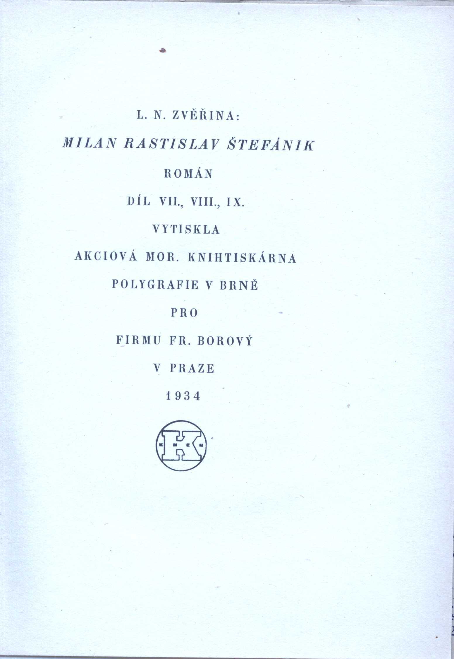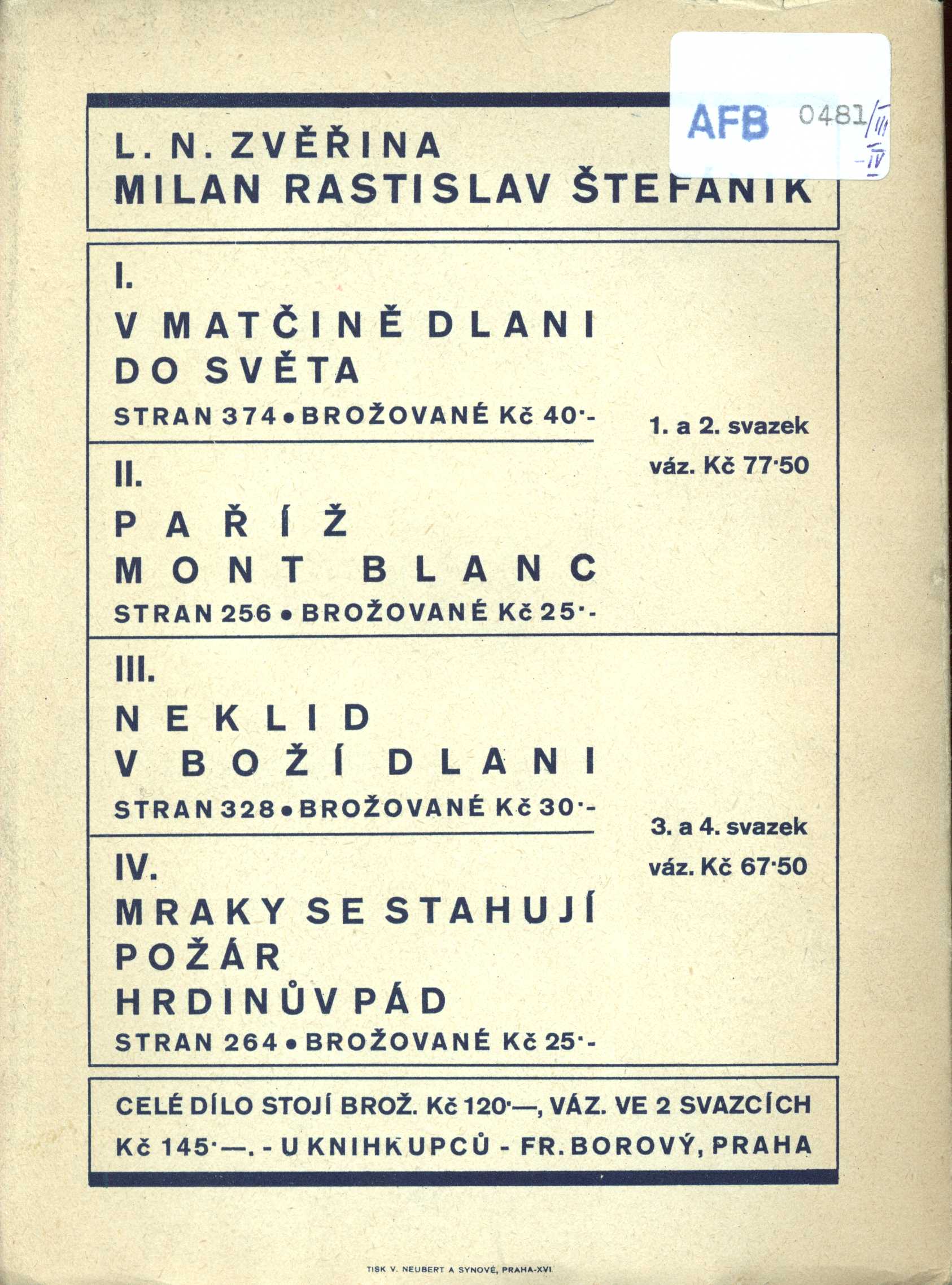 Názvové údaje M. R. Štefánik a V. Bigourdan od Arnošta Bareše : [... příspěvek k Štefánikovu životopisu ...] / Arnošt Bareš Osobní jméno Bareš, Arnošt, 1898-1974 (Autor) Další autoři Vokolek, Václav (tiskárna : Pardubice) (Tiskař) Nakladatel V Pardubicích : Vlastimil Vokolek, 1930 Rozsah 17 s. Osobní hesla Štefánik, Milan Rastislav, 1880-1919 - slovenský astronom, diplomat, politik, voj. činitel * Bigourdan, Guillaume, 1851-1932 - francouzský astronom Klíčová slova Štefánik M. R. * korespondence Počet ex. 1, z toho volných 1 Druh dok. monografie Signatura C12b 14149 Názvové údaje Štefánikova přátelství : [feuilleton] / Arnošt Bareš Osobní jméno Bareš, Arnošt, 1898-1974 (Autor) Další autoři Vokolek, Václav (tiskárna : Pardubice) (Tiskař) Nakladatel Pardubice : Ladislav Lochman, 1929 Výrobce V. Vokolek) Rozsah 25 s. Osobní hesla Štefánik, Milan Rastislav, 1880-1919 - slovenský astronom, diplomat, politik, voj. činitel Klíčová slova česká literatura * Štefánik M. R. * biografická literatura * fejeton Počet ex. 1, z toho volných 1 Druh dok. monografie Signatura C12c 3798 Názvové údaje Jsem na Slovensku Osobní jméno Deml, Jakub, 1878-1961 (Autor) (Nakladatel, vydavatel) Další autoři Kryl a Scotti (firma) (Tiskař) Nakladatel Topolčanky : Jakub Deml, 1920 Výrobce Kryl a Scotti) Rozsah 5 s. : il. Klíčová slova česká literatura * česká próza * Slovensko * Štefánik M. R. * katolická literatura * stol. 20., léta 20. * r. 1920 Počet ex. 1, z toho volných 1 Druh dok. monografie Signatura KaG XXVI A 21 Názvové údaje Dr. Milan Rastislav Štefánik / napsal Frant. Loubal Osobní jméno Loubal, František, 1893-1950 (Autor) Další autoři Jeřábek, Josef, 1877-1957 (Autor podpisu) (Dřívější majitel) Korp. Národní knihtiskárna (Moravský Krumlov, Česko) (Tiskař) Moravský legionář (nakladatelství) (Nakladatel, vydavatel) Nakladatel Brno : Moravský Legionář, 1929 Výrobce V M. Krumlově : Národní knihtiskárna, 1929 Rozsah 65 stran Osobní hesla Štefánik, Milan Rastislav, 1880-1919 - slovenský politik, generál a astronom Klíčová slova česká literatura * československá politika * českoslovenští politici * Štefánik M. R. Počet ex. 1, z toho volných 1 Druh dok. monografie Signatura M 43 G 44 Názvové údaje Štefánikova pařížská léta / Rostislav Rajchl ; [podle typografické úpravy Jindřicha Štyrského ; vazba i ochranný obal jsou provedeny podle návrhu Františka Muziky] Osobní jméno Rajchl, Rostislav, 1910-1987 (Autor) (Autor úvodu atd.) Další autoři Štyrský, Jindřich, 1899-1942 (Typograf) Muzika, František, 1900-1974 (Výtvarník vazby) Korp. Evropský literární klub (nakladatelství) (Nakladatel, vydavatel) Müller a spol. (tiskárna) (Tiskař) Dr. Ed. Grégr a syn (nakladatelství, tiskárna) (Tiskař) Nakladatel Praha : Evropský literární klub, 1937 Výrobce knihtiskárna Müller a spol.) Rozsah 230 s., [1+7] l. obr. příl. ; 22 cm Osobní hesla Štefánik, Milan Rastislav, 1880-1919 - slovenský astronom, diplomat, politik, voj. činitel Klíčová slova česká literatura * životopis * Štefánik M. R. * Paříž * Tahiti Počet ex. 2, z toho volných 2 Druh dok. monografie Signatura ELK 0201, ELK 0201a Názvové údaje Osobnost Milana Štefánika / F. X. Šalda Osobní jméno Šalda, F. X., 1867-1937 (Autor) Další autoři Vacík, Miloš, 1922-1999 (Dřívější majitel) Nakladatel Praha : Společnost F.X. Šaldy, 1991 Výrobce (Jiří Gába) Rozsah s. 80 - 84 Osobní hesla Štefánik, Milan Rastislav, 1880-1919 - slovenský astronom, diplomat, politik, voj. činitel Klíčová slova Slovensko * politici * slovenské osobnosti * Štefánik M. R. * medailony osobností Počet ex. 1, z toho volných 1 Druh dok. monografie Signatura C12a 3024 Názvové údaje Vzpomínky na Milana Štefánika / Jaromír Vávra Osobní jméno Vávra, Jaromír (Autor) Nakladatel České Velenice : Pavel Nobis, 1930 Rozsah 32 s. Osobní hesla Štefánik, Milan Rastislav, 1880-1919 - slovenský astronom, diplomat, politik, voj. činitel * Štefánik, Milan Rastislav, 1880-1919 - slovenský astronom, diplomat, politik, voj. činitel * Štefánik, Milan Rastislav, 1880-1919 - slovenský astronom, diplomat, politik, voj. činitel Klíčová slova česká literatura * vzpomínky * Štefánik M. R. * život * činnost * stol. 20., léta 10. Počet ex. 3, z toho volných 3 Druh dok. monografie Signatura C12b 2749, LK P 122 a 27, LK M 74 f 37 Názvové údaje Milan Rastislav Štefánik : román československého hrdiny. [Díl VII., VIII., IX.] / L. N. Zvěřina Osobní jméno Zvěřina, Ladislav Narcis, 1891-1980 (Autor) Další autoři Bouda, Cyril, 1901-1984 (Autor obálky) Korp. Fr. Borový (firma) (Nakladatel, vydavatel) Polygrafia (nakladatelství a tiskárna, Brno) (Tiskař) Nakladatel V Praze : Fr. Borový, 1934 Výrobce Polygrafia) Rozsah 259 s. ; 8° Osobní hesla Štefánik, Milan Rastislav, 1880-1919 - slovenský astronom, diplomat, politik, voj. činitel Klíčová slova česká literatura * česká próza * Štefánik M. R. * biografický román Počet ex. 1, z toho volných 1 Druh dok. monografie Signatura AFB 0481-VII-IX Názvové údaje Milan Rastislav Štefánik : román československého hrdiny. [Díl I., II.] / L. N. Zvěřina Osobní jméno Zvěřina, Ladislav Narcis, 1891-1980 (Autor) Další autoři Bouda, Cyril, 1901-1984 (Autor obálky) Korp. Fr. Borový (firma) (Nakladatel, vydavatel) Polygrafia (nakladatelství a tiskárna, Brno) (Tiskař) Nakladatel V Praze : Fr. Borový, 1928 Výrobce Polygrafia) Rozsah 138, 227 s. ; 8° Osobní hesla Štefánik, Milan Rastislav, 1880-1919 - slovenský astronom, diplomat, politik, voj. činitel Klíčová slova česká literatura * česká próza * Štefánik M. R. * biografický román Počet ex. 1, z toho volných 1 Druh dok. monografie Signatura AFB 0481/I-II Názvové údaje Milan Rastislav Štef