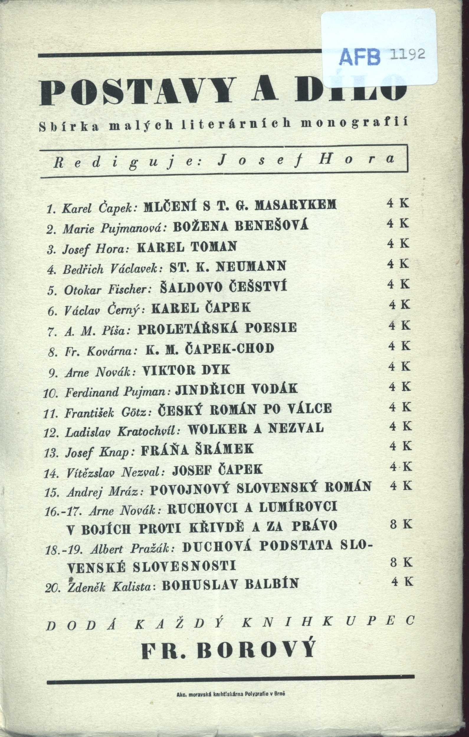 Názvové údaje Bohuslava Balbína Rozprava na obranu jazyka slovanského, zvláště pak českého = Dissertatio apologetica pro lingua / z původního spisu latinského věrně přeložil a poznámkami, jakož i životopisy Balbína a Tom. Pešiny opatřil Emanuel Tonner Osobní jméno Balbín, Bohuslav, 1621-1688 (Autor) Další autoři Tonner, Emanuel, 1829-1900 (Překladatel) (Autor úvodu atd.) Korp. Matice lidu. Spolek pro vydávání laciných knih českých (Praha) (Nakladatel, vydavatel) Nakladatel Praha : Spolek pro vydávání laciných knih českých, 1869 Rozsah LXIV, 151 s. ; 8° Osobní hesla Pešina z Čechorodu, Tomáš, 1629-1680 * Balbín, Bohuslav, 1621-1688 - S.J., historik a básník Klíčová slova česká literatura * jazykověda * český jazyk * obrana Počet ex. 1, z toho volných 1 Druh dok. monografie Signatura L XXI g 4 Názvové údaje Rukověť humanitních disciplín / Bohuslav Balbín ; k vydání připravila, komentářem a poznámkami opatřila a z latinského originálu s použitím překladu Bohumila Ryby přeložila Olga Spevak = Verisimilia humaniorum disciplinarum / Bohuslai Balbini ; editit, commentario notisque instruxit et in linguam Bohemicam post Bohumil Ryba vertit Olga Spevak Osobní jméno Balbín, Bohuslav, 1621-1688 (Autor) Další autoři Spěváková, Olga, 1969- (Překladatel) (Editor) Ryba, Bohumil, 1900-1980 (Překladatel) Korp. Nadace pro dějiny kultury ve střední Evropě Unifikovaný název Verisimilia humaniorum disciplinarum. Česky & Latinsky Nakladatel Praha : KLP, 2006 Rozsah xxxviii, 696 s. : il. Osobní hesla Balbín, Bohuslav, 1621-1688 - S.J., historik a básník Klíčová slova humanitní vzdělávání * středoškolské studium * literární teorie * dějepis * Česko * stol. 17. * pojednání * dvojjazyčné vydání * komentované vydání * kritické vydání Počet ex. 1, z toho volných 1 Druh dok. monografie Signatura C12c 3228 Názvové údaje Balbínovská miscellanea : sborník příspěvků z konference konané u příležitosti 380. výročí narození Bohuslava Balbína : Klatovy 3. a 4. prosince 2001 / [uspořádali Viktor Viktora, Milena Hálková] Záhlaví-akce Balbínovská miscellanea (2001 : Klatovy, Česko) Další autoři Viktora, Viktor, 1942-2022 (Editor) Hálková, Milena, 1954- (Editor) Nakladatel Klatovy : Městská knihovna Klatovy, 2002 Rozsah 152 s. : il. Osobní hesla Balbín, Bohuslav, 1621-1688 - S.J., historik a básník Klíčová slova jezuité * jezuitské koleje * česká literatura * čeština * historiografie * Balbín B. * české země * stol. 17. * konference * Klatovy * sborníky z konferencí Počet ex. 1, z toho volných 1 Druh dok. monografie Signatura C12c 1635 Názvové údaje Bohuslav Balbín / Zdeněk Kalista Osobní jméno Kalista, Zdeněk, 1900-1982 (Autor) Další autoři Fr. Borový (firma) (Nakladatel, vydavatel) Nakladatel Praha : Borový, 1939 Rozsah 24 s. Osobní hesla Balbín, Bohuslav, 1621-1688 - S.J., historik a básník Klíčová slova osobnosti * Česko * stol. 17. * činnost * biografická studie Počet ex. 1, z toho volných 1 Druh dok. monografie Signatura M 170 g 111 Názvové údaje Bohuslav Balbín / Zdeněk Kalista ; [v úpravě Františka Muziky] Osobní jméno Kalista, Zdeněk, 1900-1982 (Autor) Další autoři Muzika, František, 1900-1974 (Knižní grafik) Korp. Fr. Borový (firma) (Nakladatel, vydavatel) Akciová moravská knihtiskárna Polygrafie (Tiskař) Nakladatel Praha : Fr. Borový, 1939 Výrobce Akciová moravská knihtiskárna Polygrafie) Rozsah 24 s. ; 8° Osobní hesla Balbín, Bohuslav, 1621-1688 - S.J., historik a básník Klíčová slova česká literatura * Balbín B. * život a dílo Počet ex. 3, z toho volných 3 Druh dok. monografie Signatura AFB 1192, AFB 1192a, R XVIII f 55/b Názvové údaje Bohuslav Balbín a jeho místo v české kultuře / Jan P. Kučera, Jiří Rak ; Vybrané texty z lat. přel. Martin Svatoš, Helena Businská ; Typogr. Clara Istlerová ; Fotogr. Jan Malý Osobní jméno Kučera, Jan P., 1948-2025 (Autor) Další autoři Rak, Jiří, 1947- (Autor) Svatoš, Martin, 1951- (Překladatel) Businská, Helena, 1919-2005 (Překladatel) Istlerová, Clara, 1944- (Grafický technik) Malý, Jan, 1954-2017 (Fotograf) Nakladatel Praha : Vyšehrad, 1983 Výrobce Stráž) Rozsah 415 s. : il., fot Osobní hesla Balbín, Bohuslav, 1621-1688 - S.J., historik a básník Klíčová slova česká literatura * próza * biografie * Balbín B. * studie Počet ex. 1, z toho volných 1 Druh dok. monografie Signatura NK/83 0036 Názvové údaje Balbínovy pomůcky a prameny : příspěvek k studiím o Balbínově vlastivědě = sources et auxiliaires de Balbin / Josef Pelikán Osobní jméno Pelikán, Josef, 1900-1956 (Autor) Nakladatel V Praze : nákladem Filosofické fakulty University Karlovy, 1936 Výrobce Dyrynkova tiskárna K. Reyl Rozsah 82 stran ; 24, 5 cm Osobní hesla Balbín, Bohuslav, 1621-1688 - S.J., historik a básník Klíčová slova vlastivěda * literární prameny * historické prameny * bibliografie textů Počet ex. 1, z toho volných 0 Druh dok. monografie Signatura Patočka 0220 Názvové údaje P. Bohuslav Balbín T.J. : jeho život a práce / Napsal P. Ant. Rejzek T. J. Osobní jméno Rejzek, Antonín, 1844-1920 (Autor) Nakladatel V Praze : Dědictví sv. Prokopa, 1908 Rozsah 465 s., [4] s. obr. příl. Osobní hesla Balbín, Bohuslav, 1621-1688 - S.J., historik a básník Klíčová slova česká literatura * jezuité * historici * Česko * stol. 17. * Balbín B. * biografie * dílo * kritické rozbory * literárněhistorická práce Počet ex. 1, z toho volných 1 Druh dok. monografie Signatura C12c 1777 Názvové údaje Bohuslav Balbín : Významná osobnost Klementina / Aut. katalogu Jan Vít ; Graf. úpr. Zbyněk Weinfurter ; Fotogr. Jiří Egert a Vladimír Uher Osobní jméno Vít , Jan (Autor) Další autoři Weinfurter, Zbyněk, 1930-2000 (Grafický technik) Egert, Jiří, 1942- (Fotogr