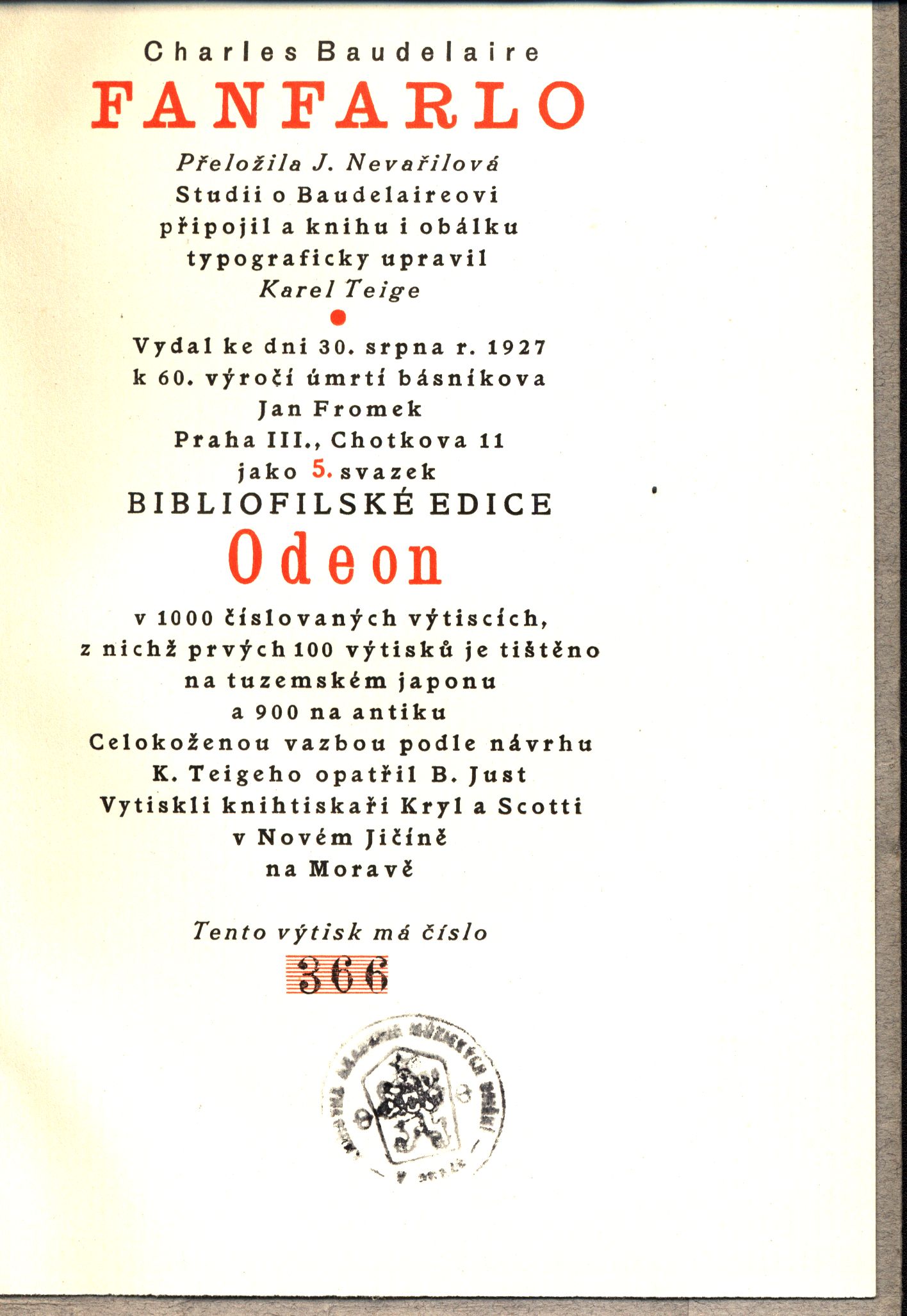 Názvové údaje Baudelaires Intime Tagebücher, Bildnisse und Zeichnungen Osobní jméno Baudelaire, Charles, 1821-1867 (Autor) (Ilustrátor) Další autoři Blei, Franz, 1871-1942 (Autor úvodu atd.) Korp. Georg Müller Verlag (Mnichov, Německo) Poeschel & Trepte (Leipzig) (Tiskař) Nakladatel München : Georg Müller Verlag, 1920 Výrobce Poeschel & Trepte) Rozsah 59 s., 19 l. obr. příl. : il. Osobní hesla Baudelaire, Charles, 1821-1867 - francouzský básník, umělecký kritik a překladatel Klíčová slova francouzská literatura * dekadence * deník * deníkové zápisky * deníkové záznamy * deníky * kresby Počet ex. 1, z toho volných 1 Druh dok. monografie Signatura KaG LV 106-2 Názvové údaje Čas je hráč : výbor z díla / Charles Baudelaire ; [z francouzských originálů přeložili Karel Čapek ... [et al.] ; verše a básně v próze vybral, svazek uspořádal a doprovod. citacemi doplnil Vladimír Mikeš, který je autorem eseje, životopisného pásma, vysvětlivek a bibliografické a ediční poznámky ; fotografie Neradovy a Eugéna Atgeta ; typografie Oldřich Hlavsa] Osobní jméno Baudelaire, Charles, 1821-1867 (Autor) Další autoři Čapek, Karel, 1890-1938 (Překladatel) Mikeš, Vladimír, 1927- (Sestavovatel, kompilátor) (Autor komentáře textu) (Autor úvodu atd.) Atget, Eugène, 1857-1927 (Fotograf) Hlavsa, Oldřich, 1909-1995 (Typograf) Korp. Československý spisovatel (nakladatelství) (Nakladatel, vydavatel) Stráž, tiskařské závody (Tiskař) Nakladatel Praha : Československý spisovatel, 1986 Výrobce Stráž) Rozsah 339 s. : il. Osobní hesla Baudelaire, Charles, 1821-1867 - francouzský básník, umělecký kritik a překladatel Klíčová slova francouzská literatura * francouzská poezie * básně v próze * výbor Počet ex. 3, z toho volných 3 Druh dok. monografie Signatura AČS 04676, AČS 04676a, RSzpuk 0075 Názvové údaje Fanfarlo / Charles Baudelaire ; přeložila J. Nevařilová ; studii o Baudelairovi připojil a knihu i obálku typograficky upravil Karel Teige Osobní jméno Baudelaire, Charles, 1821-1867 (Autor) Další autoři Nevařilová, Jožka, -1951 (Překladatel) Teige, Karel, 1900-1951 (Typograf) (Autor obálky) (Autor komentáře) Korp. Odeon, Jan Fromek (Praha) (Nakladatel, vydavatel) Kryl a Scotti (firma) (Tiskař) Nakladatel Praha : Odeon, 1927 Výrobce v Novém Jičíně na Moravě : Kryl a Scotti Rozsah 125 stran ; 19 cm Osobní hesla Baudelaire, Charles, 1821-1867 - francouzský básník, umělecký kritik a překladatel Klíčová slova francouzská literatura * prokletí básníci * překlady do češtiny Počet ex. 1, z toho volných 0 Druh dok. monografie Signatura Janeček 0315 Názvové údaje Hašiš a víno / Charles Baudelaire ; Z franc. přel. J. Hart Osobní jméno Baudelaire, Charles, 1821-1867 (Autor) Další autoři Bíbl, František, 1880-1932 (Překladatel) Nakladatel Praha : Alois Hynek, b.r. Rozsah 103 s. Osobní hesla Baudelaire, Charles, 1821-1867 - francouzský básník, umělecký kritik a překladatel Klíčová slova francouzská literatura * próza * psychologická esej Počet ex. 3, z toho volných 3 Druh dok. monografie Signatura POR 13, LK P 22 F 97, LK M 200 g 47 Názvové údaje Hořké propasti / Charles Baudelaire ; [uspořádal, úvodní essay, životopisná data a ediční poznámky napsal a dobový obrazový materiál vybral Jan Tomeš ; básně přeložili Karel Čapek ... [et al.] ; typografická úprava Oldřich Hlavsa] Osobní jméno Baudelaire, Charles, 1821-1867 (Autor) Další autoři Tomeš, Jan Marius, 1913-2010 (Sestavovatel, kompilátor) (Autor úvodu atd.) (Autor komentáře) (Překladatel) Čapek, Karel, 1890-1938 (Překladatel) Hlavsa, Oldřich, 1909-1995 (Typograf) Korp. Československý spisovatel (nakladatelství) (Nakladatel, vydavatel) Polygrafia (tiskárna, Praha) (Tiskař) Nakladatel Praha : Československý spisovatel, 1966 Výrobce Polygrafia) Rozsah 150 s. : il. + 1 gramodeska Osobní hesla Baudelaire, Charles, 1821-1867 - francouzský básník, umělecký kritik a překladatel Klíčová slova francouzská literatura * překlad * poezie * výbor básní Počet ex. 3, z toho volných 3 Druh dok. monografie Signatura AČS 04342, EJulis 0715, RSzpuk 0089 Názvové údaje Květy zla / Charles Baudelaire ; česky Vítězslav Nezval Osobní jméno Baudelaire, Charles, 1821-1867 (Autor) Další autoři Nezval, Vítězslav, 1900-1958 (Překladatel) Blahynka, Milan, 1933- (Autor komentáře) (Autor doslovu, tiráže atd.) Vodáková, Sylvie, 1926-2016 (Výtvarník vazby) Korp. Mladá fronta (nakladatelství) (Nakladatel, vydavatel) Mír, novinářské závody (tiskárna) (Tiskař) Unifikovaný název Fleurs du mal. Česky Nakladatel Praha : Mladá fronta, 1964 Výrobce Praha : Mír, novinářské závody, n. p., závod 3 Rozsah 232 stran ; 15 cm Osobní hesla Baudelaire, Charles, 1821-1867 - francouzský básník, umělecký kritik a překladatel Klíčová slova francouzská literatura * poezie * Baudelaire Ch. * český překlad * Nezval V. * r. 1964 Počet ex. 1, z toho volných 1 Adr. el. zdr. http://krameriusndk.nkp.cz/search/handle/uuid:096e1170-b30b-11e7-a6f3-005056827e52 Druh dok. monografie Signatura VZinková 0653 Názvové údaje Květy zla : výbor / Charles Baudelaire ; [z francouzského originálu vybral] přeložil [a doslov napsal] Ivan Slavík ; [vazba a kresby Sylvie Vodákové ; typograficky upravil František Plaček] Osobní jméno Baudelaire, Charles, 1821-1867 (Autor) Další autoři Slavík, Ivan, 1920-2002 (Sestavovatel, kompilátor) (Překladatel) (Autor doslovu, tiráže atd.) Vodáková, Sylvie, 1926-2016 (Autor obálky) Plaček, František (Typograf) Korp. Mladá fronta (nakladatelství) (Nakladatel, vydavatel) Mír, novinářské závody (tiskárna) (Tiskař) Nakladatel Praha : Mladá fronta, 1976 Výrobce Mír, novinářské závody) Rozsah 152 s. Osobní hesla Baudelaire, Charles, 1821-1867 - francouzský básník, uměl