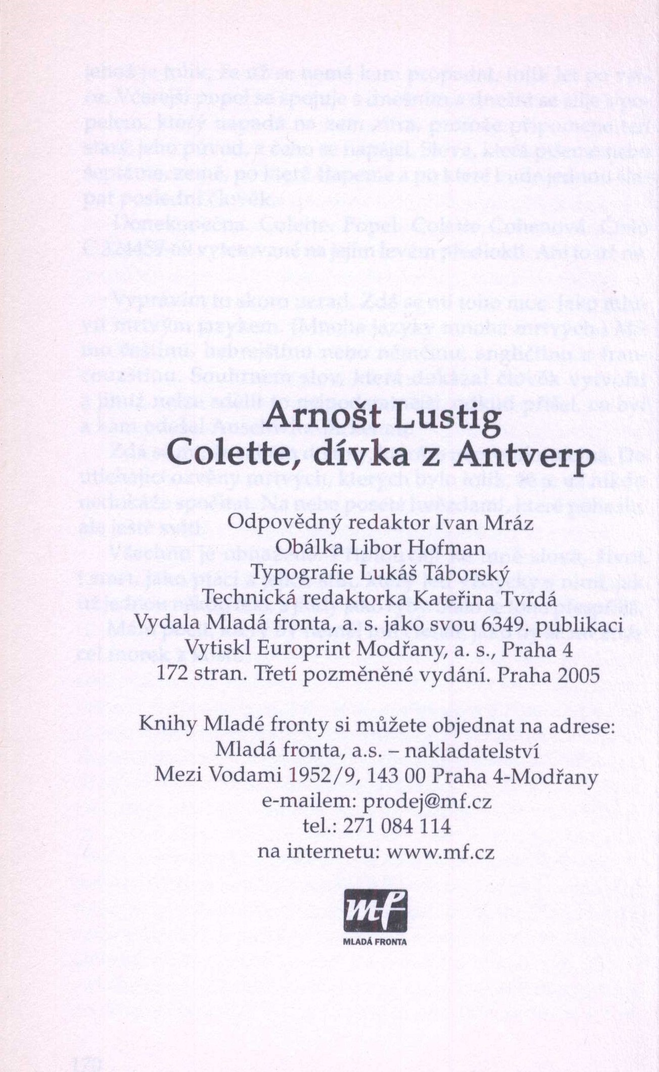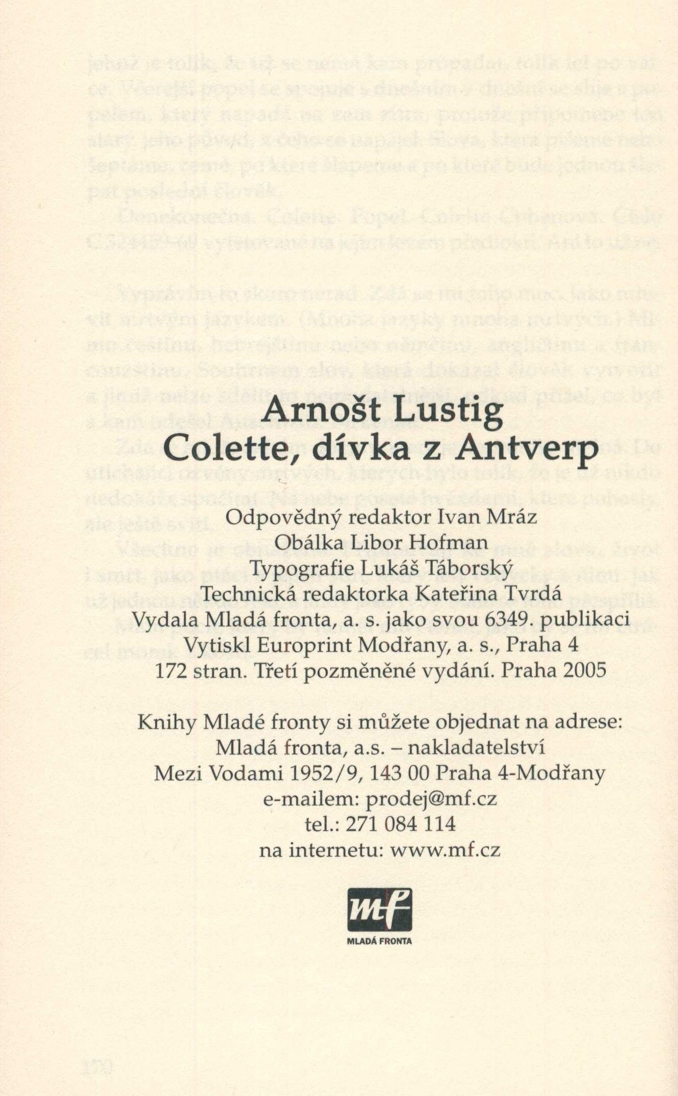 Názvové údaje Colette / Arnošt Lustig ; grafická úprava Richard Pergl Osobní jméno Lustig, Arnošt, 1926-2011 (Autor) Další autoři Pergl, Richard, 1972- (Knižní grafik) Korp. C.A.T. International (nakladatelství) (Nakladatel, vydavatel) Unitisk, s.r.o. (tiskárna) (Tiskař) Nakladatel [Praha] : C.A.T. Internacional s.r.o., 2003 Výrobce Unitisk Rozsah 189 stran ; 20 cm Heslo korporace (zkrác. heslo korp.) : Birkenau (koncentrační tábor) Klíčová slova česká próza * český román * holokaust * židovské ženy * koncentrační tábory * Polsko * r. 1939-1945 Počet ex. 1, z toho volných 1 Druh dok. monografie Signatura LITb 02369 Názvové údaje Colette / Arnošt Lustig ; obálku navrhl a knihu graficky upravil Richard Pergl ; foto Petra Růžičková Osobní jméno Lustig, Arnošt, 1926-2011 (Autor) Další autoři Pergl, Richard, 1972- (Autor obálky) (Knižní grafik) Růžičková, Petra, 1963-2021 (Fotograf) Korp. C.A.T. International (nakladatelství) (Nakladatel, vydavatel) Unitisk, s.r.o. (tiskárna) (Tiskař) Nakladatel [Praha] : C.A.T. Internacional s.r.o., 2002 Výrobce Unitisk s.r.o. Rozsah 235 stran ; 20 cm Heslo korporace (zkrác. heslo korp.) : Birkenau (koncentrační tábor) Klíčová slova česká próza * český román * holokaust * židovské ženy * koncentrační tábory * Polsko * r. 1939-1945 Počet ex. 1, z toho volných 1 Druh dok. monografie Signatura LITb 02368 Názvové údaje Colette, dívka z Antverp : (židovská trilogie II.) / Arnošt Lustig ; obálka Libor Hofman ; typografie Lukáš Táborský Osobní jméno Lustig, Arnošt, 1926-2011 (Autor) Další autoři Hofman, Libor, 1955- (Autor obálky) Táborský, Lukáš (Typograf) Korp. Mladá fronta (nakladatelství) (Nakladatel, vydavatel) Europrint Modřany a. s. (tiskárna) (Tiskař) Nakladatel Praha : Mladá fronta, 2005 Výrobce Europrint Modřany, a.s. Rozsah 170 stran ; 20,5 cm Heslo korporace (zkrác. heslo korp.) : Birkenau (koncentrační tábor) Klíčová slova česká próza * český román * holokaust * židovské ženy * koncentrační tábory * Polsko * r. 1939-1945 Počet ex. 1, z toho volných 1 Druh dok. monografie Signatura LITb 02333/2 Názvové údaje Colette, dívka z Antverp : (židovská trilogie II.) / Arnošt Lustig ; obálka Libor Hofman ; typografie Lukáš Táborský Osobní jméno Lustig, Arnošt, 1926-2011 (Autor) Další autoři Hofman, Libor, 1955- (Autor obálky) Táborský, Lukáš (Typograf) Korp. Mladá fronta (nakladatelství) (Nakladatel, vydavatel) Europrint Modřany a. s. (tiskárna) (Tiskař) Nakladatel Praha : Mladá fronta, 2005 Výrobce Europrint Modřany, a.s. Rozsah 170 stran ; 20,5 cm Heslo korporace (zkrác. heslo korp.) : Birkenau (koncentrační tábor) Klíčová slova česká próza * český román * holokaust * židovské ženy * koncentrační tábory * Polsko * r. 1939-1945 Počet ex. 1, z toho volných 1 Druh dok. monografie Signatura LITb 02414 Názvové údaje Colette, dívka z Antverp : strhující příběh o lásce silnější než smrt / Arnošt Lustig ; fotografie Bioscop, foto Jozef Krivošík Osobní jméno Lustig, Arnošt, 1926-2011 (Autor) Další autoři Krivošík, Jozef, 1960- (Fotograf) Korp. Mladá fronta (nakladatelství) (Nakladatel, vydavatel) Europrint (tiskárna) (Tiskař) Nakladatel Praha : Mladá fronta, 2013 Výrobce Europrint a.s. Rozsah 196 stran, 16 nečíslovaných stran obrazových příloh : barevné ilustrace, portréty ; 21 cm Heslo korporace (zkrác. heslo korp.) : Birkenau (koncentrační tábor) Klíčová slova česká próza * český román * židovské ženy * holokaust * koncentrační tábory * Polsko * r. 1944 * r. 1939-1945 Počet ex. 2, z toho volných 2 Druh dok. monografie Signatura LITb 02383, LITb 02383a Názvové údaje F.K. Slib / texty Zuzana Válková, Michaela Rozov ; editor sborníku Michaela Rozov ; fotografie Libor Fojtík ; grafický design Milan Nedvěd Osobní jméno Válková, Zuzana, 1983- (Autor) Další autoři Rozov, Michaela, 1973- (Autor) (Editor) Fojtík, Libor, 1977- (Fotograf) Nedvěd, Milan, 1978- (Knižní grafik) Korp. Nakladatelství PositiF (Nakladatel, vydavatel) Český osvětimský výbor, z.s. (Nakladatel, vydavatel) Tiskárna Helbich (Tiskař) Nakladatel Praha : Nakladatelství Positif : Český osvětimský výbor, z.s., 2021 Výrobce [Brno] : Tiskárna Helbich, a.s. Rozsah 55 stran : barevné ilustrace, portréty ; 29 cm + brožura (47 stran ; 21 cm) Osobní hesla Kolmer, Felix, 1922-2022 - vědecký pracovník, pedagog, skaut Heslo korporace (zkrác. heslo korp.) : Terezín (koncentrační tábor) * Birkenau (koncentrační tábor) Předmětová hesla scientists - Czechia - 20th-21st centuries * scouts - Czechia - 20th-21st centuries * Jews - Czechia - 20th-21st centuries * holocaust survivors - Czechia * concentration camps - Czechia - 1939-1945 * concentration camps - Poland - 1939-1945 * holocaust (1939-1945) Klíčová slova česká literatura * jubilejní publikace * vzpomínková publikace * biografie * vědci * skauting * Židé * holokaust * koncentrační tábory * Polsko * Česko * r. 1939-1945 * přeživší holocaust * stol. 20.-21. * Nejkrásnější české knihy * r. 2021 Počet ex. 2, z toho volných 1, prezenčně 1 Druh dok. monografie Signatura NK/21 001, N/A