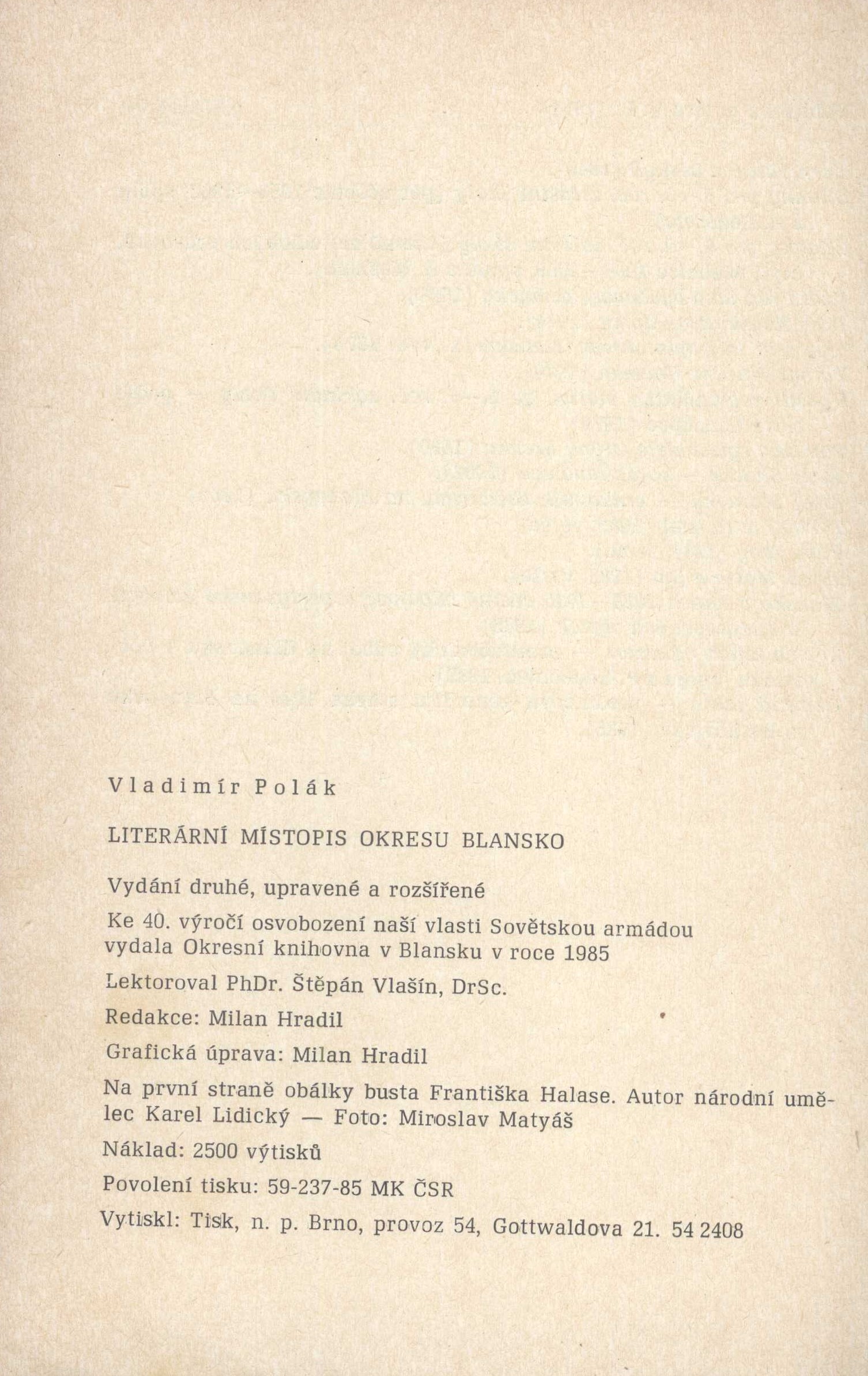 Názvové údaje Literární místopis okresu Blansko / Vladimír Polák Osobní jméno Polák, Vladimír, 1914-2004 (Autor) Další autoři Hradil, Milan, 1935-1988 (Redaktor, výkonný redaktor) (Autor úvodu atd.) (Knižní grafik) Korp. Okresní knihovna (Blansko, Česko) (Nakladatel, vydavatel) Tisk Brno (tiskárna) (Tiskař) (Tiskař obrazu) Nakladatel V Blansku : Okresní knihovna, 1985 Výrobce Brno : Tisk, n. p. Brno, provoz 54 Rozsah 186 stran ; 21 cm Předmětová hesla osobnosti regionu - Česko - 19.-20. stol. * literární místopis - Česko Geografické heslo Blansko (Česko : oblast) Klíčová slova česká literatura * osobnosti * osobnosti regionu * Blansko, okres * literární místopis Počet ex. 1, z toho volných 1 Druh dok. monografie Signatura C12b 19376 Názvové údaje Vlastivědná ročenka Okresního archívu v Blansku. IV / odpovědný redaktor Jan Skutil Další autoři Skutil, Jan, 1934-1998 (Šéfredaktor, odpovědný redaktor) Stehlík, Antonín František, 1921-1989 (Ilustrátor) Korp. Blansko (Česko : okres : 1960-). Okresní národní výbor (Nakladatel, vydavatel) Okresní archiv Blansko (Nakladatel, vydavatel) Grafia (Kyjov, Česko) (Tiskař) Nakladatel Blansko : ONV v Blansku, 1969 Výrobce Kyjov : Grafia Rozsah 94 stran : ilustrace, 1 portrét, 1 faksimile, noty ; 20,5 cm Geografické heslo Blansko (Česko : oblast) Klíčová slova vlastivěda * dějiny * literatura * etymologie * Moravský kras * Boskovice * Blansko * Březina O. * ročenky Počet ex. 1, z toho volných 1 Druh dok. monografie Signatura Holman-Březina 0486