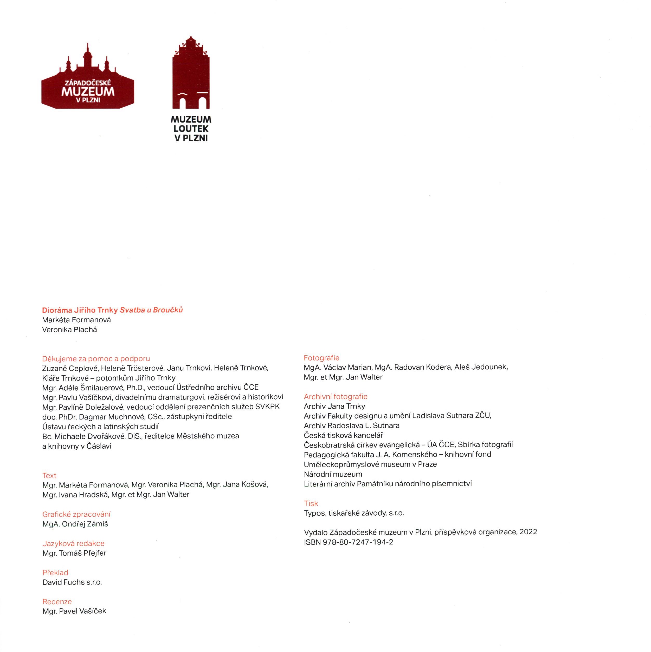 Názvové údaje Broučci : (pro malé i dospělé děti) / Jan Karafiát ; vybral ..., typograficky navrhl s ručně kolorovanými ilustracemi Aleny Krchové a vlastním nákladem vydal Martin Dyrynk Osobní jméno Karafiát, Jan, 1846-1929 (Autor) Další autoři Krchová, Alena, 1990- (Ilustrátor) Dyrynk, Martin, 1941-2019 (Editor) (Autor komentáře) (Typograf) (Nakladatel, vydavatel) (Autor podpisu) Stecker, David, (Sazeč) 1984- Korp. MD ateliér grafického designu (Praha) (Knižní grafik) Europrinty, s.r.o. (tiskárna) (Tiskař) Nakladatel Praha : Martin Dyrynk, 2016 Výrobce Břeclav : Europrinty s.r.o. Rozsah 44 stran : barevné ilustrace ; 23 x 24 cm Klíčová slova česká literatura * literatura pro děti a mládež * próza * pohádkové vyprávění * příběhy * Broučci Počet ex. 1, z toho volných 0 Druh dok. monografie Signatura Bbf III 0160 Názvové údaje Broučci Jana Karafiáta / texty: Daniela Růžičková a Věra Brožová ; grafická úprava: Jiřina Kopicová Osobní jméno Karafiát, Jan, 1846-1929 (Ilustrátor) Další autoři Růžičková, Daniela, 1978- (Autor úvodu atd.) Brožová, Věra, 1957- (Autor úvodu atd.) Korp. Galerie výtvarného umění (Havlíčkův Brod, Česko) (Organizátor akce) (Nakladatel, vydavatel) Nová tiskárna Pelhřimov (tiskárna) (Tiskař) Nakladatel V Havlíčkově Brodě : Galerie výtvarného umění, 2016 Výrobce Nová tiskárna Pelhřimov spol. s r.o. Rozsah 56 stran : barevné ilustrace ; 21 cm Osobní hesla Karafiát, Jan, 1846-1929 Broučci Klíčová slova ilustrátoři * české výtvarné umění * knižní ilustrace * umělecké náměty * Česko * r. 1902-2011 * stol. 20.-21. * katalog výstavy Počet ex. 1, z toho volných 0 Druh dok. monografie Signatura LITb 01408 Názvové údaje Broučci v díle národního umělce Jiřího Trnky / [uspořádal Jindřich Hilčr ; graficky upravil Zdeněk Mlčoch] Další autoři Hilčr, Jindřich, 1921-2003 (Sestavovatel, kompilátor) Mlčoch, Zdeněk, 1921-1995 (Grafický technik) Korp. Městské muzeum (Čáslav, Česko) Nakladatelství Albatros (Nakladatel, vydavatel) Nakladatel Praha : Albatros, 1974 Rozsah 1 l. Osobní hesla Trnka, Jiří, 1912-1969 - malíř, ilustrátor, animátor Klíčová slova čeští malíři * české malířství * knižní ilustrace * Broučci * Trnka J. * výstava * Čáslav * r. 1974 * příležitostný tisk Počet ex. 1, z toho volných 1 Druh dok. ČLÁNKY Signatura C12b 6233 Názvové údaje Dioráma Jiřího Trnky Svatba u Broučků / Markéta Formanová, Veronika Plachá Osobní jméno Formanová, Markéta, 1975- (Autor) Další autoři Plachá, Veronika (Autor) Korp. Západočeské muzeum (Plzeň, Česko) (Nakladatel, vydavatel) Muzeum loutek (Plzeň, Česko) (Organizátor akce) Typos, tiskařské závody (firma) (Tiskař) Nakladatel V Plzni : Západočeské muzeum, 2022 Výrobce Typos, tiskařské závody, s.r.o. Rozsah 69 stran : ilustrace (převážně barevné), portréty, faksimile ; 22 cm Osobní hesla Trnka, Jiří, 1912-1969 - výtvarník, ilustrátor, spisovatel, sochař, scenárista, loutkář, kostýmní výtvarník a režisér animovaných filmů Svatba u Broučků * Karafiát, Jan, 1846-1929 - evangelický kněz, spisovatel, učitel Broučci Klíčová slova muzejní sbírky * loutky * dioramata * výstavy * světové výstavy * New York * Česko * Plzeň * r. 1939-1940 Počet ex. 1, z toho volných 1 Druh dok. monografie Signatura LITb 01856