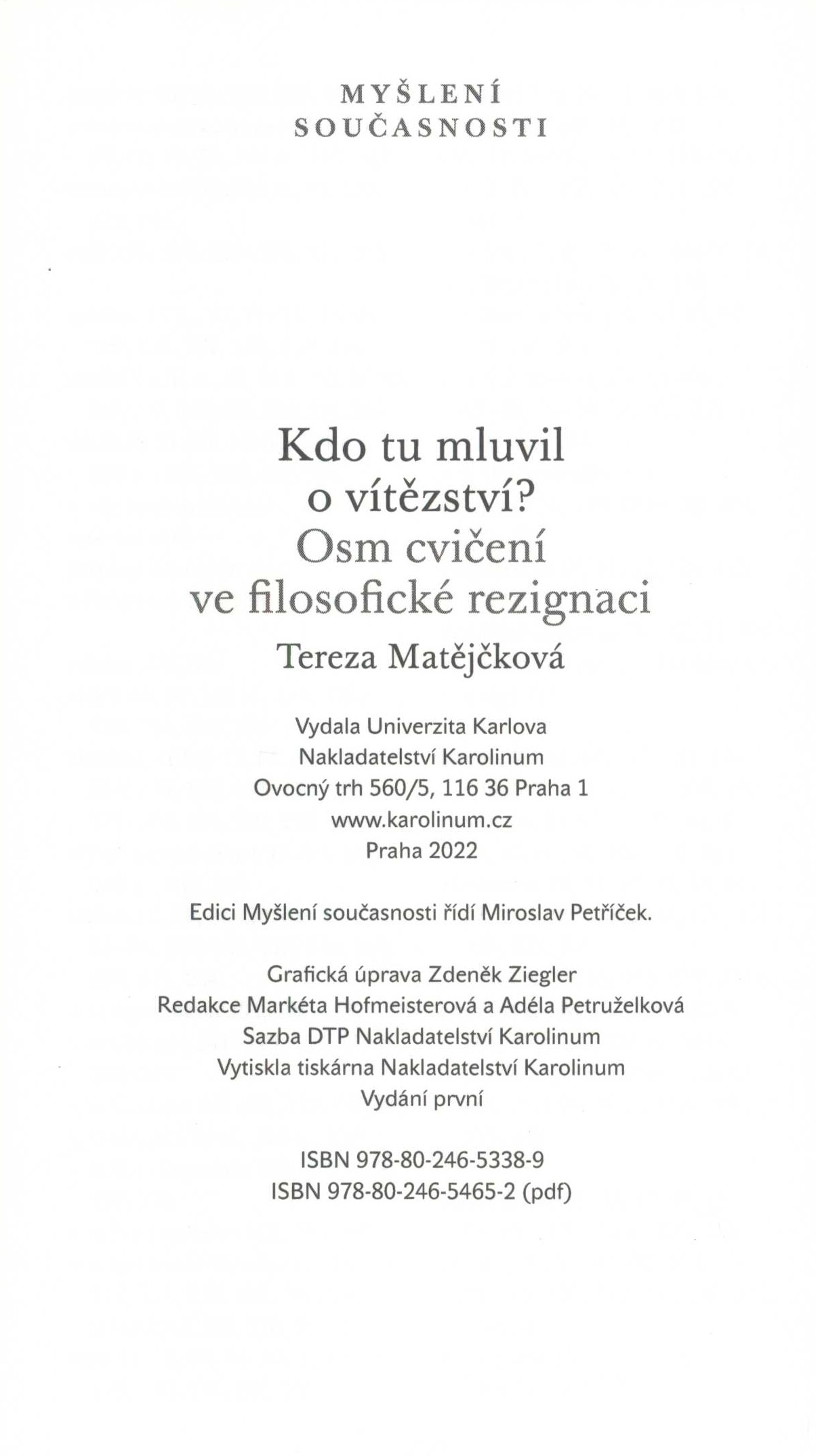 Názvové údaje Kdo tu mluvil o vítězství? : Osm cvičení ve filosofické rezignaci / Tereza Matějčková ; grafická úprava Zdeněk Ziegler Osobní jméno Matějčková, Tereza, 1984- (Autor) (Autor úvodu atd.) Další autoři Ziegler, Zdeněk, 1932-2023 (Knižní grafik) Korp. Univerzita Karlova (Nakladatel, vydavatel) Karolinum (nakladatelství, tiskárna) (Nakladatel, vydavatel) Tiskárna nakladatelství Karolinum (Tiskař) Nakladatel Praha : Nakladatelstvi Karolinum, 2022 Výrobce [Praha] : tiskárna Nakladatelství Karolinum Rozsah 280 stran Osobní hesla Hegel, Georg Wilhelm Friedrich, 1770-1831 - německý filozof a pedagog * Schopenhauer, Arthur, 1788-1860 - německý filozof * Nietzsche, Friedrich, 1844-1900 - německý filolog, filozof, spisovatel * Kierkegaard, Søren Aabye, 1813-1855 - dánský filozof, teolog a myslitel * Camus, Albert, 1913-1960 - francouzský prozaik, dramatik a esejista * Cioran, Emil, 1911-1995 - francouzský filozof, překladatel rumunského původy * Weil, Simone, 1909-1943 - francouzská filozofka a spisovatelka Klíčová slova filozofie * dějiny filozofie * etika * sebepoznání * sebeovládání * vůle * svoboda * filozofická rezignace * duchovní cvičení * sebepřijetí * duchovní růst Počet ex. 1, z toho volných 1 Druh dok. monografie Signatura LITb 01711