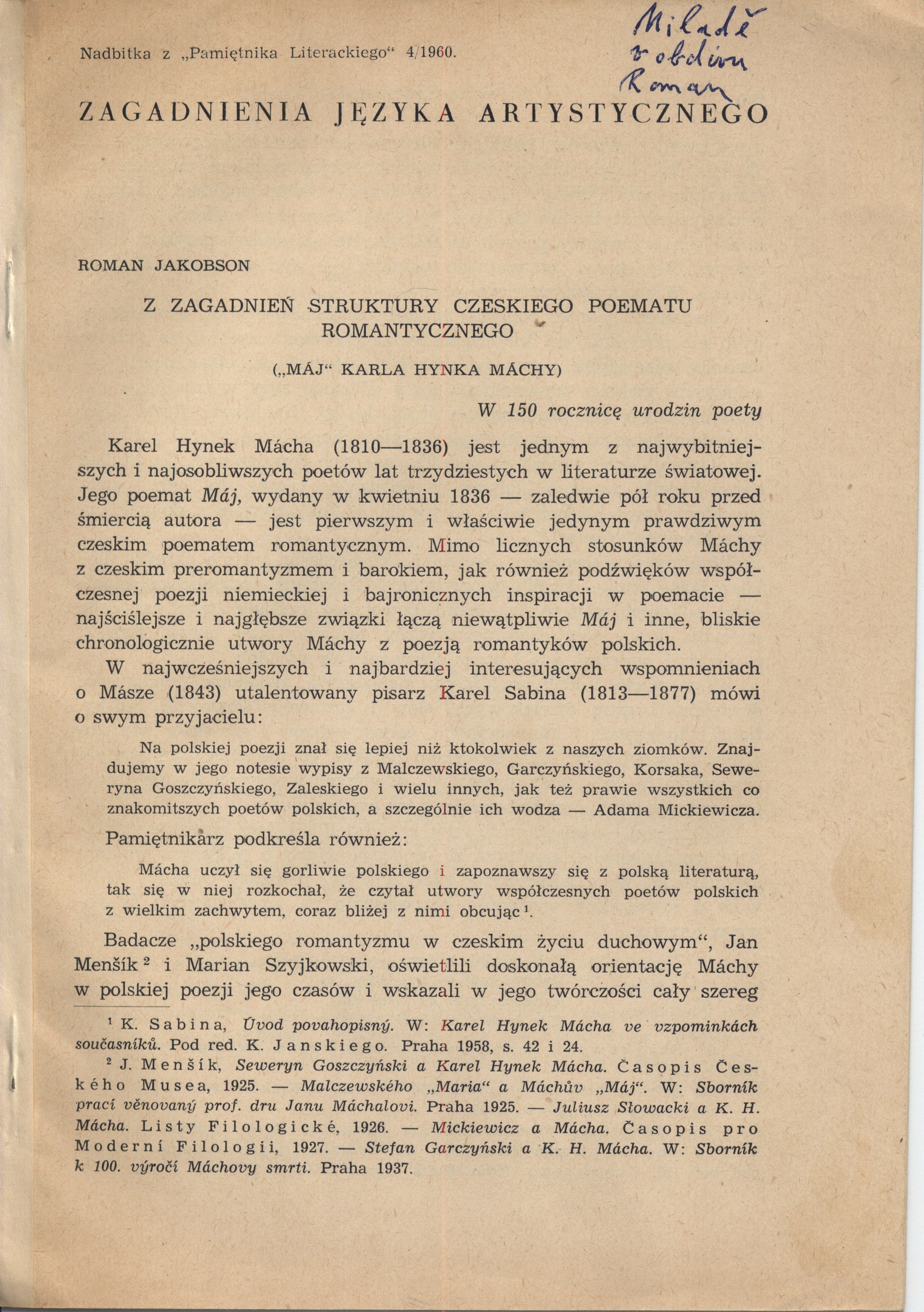Názvové údaje Roman Jakobson Echols of his Scholarship / edited by Daniel Armstrong and C. H. van Schooneveld Osobní jméno Armstrong, Daniel (Autor) Další autoři Schooneveld, C. H. van, 1921-2003 (Autor) Winner, Thomas Gustav, 1917-2004 (Autor) Nakladatel Lisse : Peter de Ridder Press, 1977 Rozsah S. 504-514 Klíčová slova jazykověda * umění * literatura * Jakobson R. * avantgardní umění Počet ex. 1, z toho volných 0 Druh dok. monografie Signatura M 220 a 19 Názvové údaje Quadrilog : vzájemná korespondence 1930-1978 / [editoři] Marie Havránková, Jindřich Toman ; jmenný rejstř. zprac. Pavel Weigel ; graf. úpr. Kateřina Řezáčová Osobní jméno Havránková, Marie, 1949- (Autor) Další autoři Toman, Jindřich, 1944- (Autor) Weigel, Pavel, 1942- (Bibliografický předchůdce) Řezáčová, Kateřina, 1955- (Grafický technik) Nakladatel Praha : Karolinum, 2001 Rozsah 131 s. Klíčová slova Havránek B. * Havránková Z. * Jakobson R. * Pírková-Jakobsonová S. * vzájemná korespondence * r. 1930-1978 Počet ex. 1, z toho volných 1 Druh dok. monografie Signatura C12b 5312 Názvové údaje Stichotvornyje citaty v velikomoravskoj agiografii / R. Jakobson Osobní jméno Jakobson, Roman, 1896-1982 (Autor) Nakladatel Ljubljana, 1957 Rozsah S. 111-118 ; 25 cm Klíčová slova ruská literární věda * Jakobson R. * Velká Morava * hagiografie * verše * citáty * rozbory * separáty Počet ex. 1, z toho volných 1 Druh dok. PERIODIKA - Souborný záznam periodika Signatura Topič 0805 Názvové údaje Studies in Russian Philology / by Roman Jakobson. I., Toward a linguistic analysis of Russian rhyme. II., On the morphological structure of the Old Russian patronymics Osobní jméno Jakobson, Roman, 1896-1982 (Autor) Další autoři University of Michigan. Department of Slavic Languages and Literatures (Nakladatel, vydavatel) Nakladatel [Ann Arbor] : The University of Michigan, [1962] Rozsah 23 s. ; 28 cm Klíčová slova filologie * Jakobson R. * ruský jazyk * historie * rozbory * verše * jazykové rozbory * morfologie Počet ex. 1, z toho volných 1 Druh dok. monografie Signatura Topič 0794 Názvové údaje An Unknown Album Page by Nikolaj Gogol' / Roman Jakobson and Bayara Aroutunova Osobní jméno Jakobson, Roman, 1896-1982 (Autor) Další autoři Aroutunova, Bayara (Autor) Nakladatel Harvard, 1972 Rozsah S. 236-254, [2] s. obr. příl. ; 26 cm Osobní hesla Gogol‘, Nikolaj Vasil‘jevič, 1809-1852 - ruský prozaik, dramatik Klíčová slova anglicky psaná literatura * ruská literatura * Gogol N. V. * studie * Jakobson R. * rozbory Počet ex. 1, z toho volných 1 Druh dok. PERIODIKA - Souborný záznam periodika Signatura Topič 0804 Názvové údaje Z zagadnień struktury czeskiego poematu romantycznego : ("Máj" Karla Hynka Máchy) : w 150 rocznicę urodzin poety / Roman Jakobson Osobní jméno Jakobson, Roman, 1896-1982 (Autor) (Autor podpisu) (Dedikátor) Další autoři Blekastad, Milada, 1917-2003 (Dedikant) Nakladatel [Wrocław], 1960 Rozsah S. [389]-409 ; 24 cm Osobní hesla Mácha, Karel Hynek, 1810-1836 - básník, beletrista, dramatik Klíčová slova ruská literární věda * Jakobson R. * rozbory * Máj * Mácha K. H. * romantismus * polština * separáty Počet ex. 1, z toho volných 1 Druh dok. PERIODIKA - Souborný záznam periodika Signatura Topič 0806 Názvové údaje Teze Praškog lingvističkog kružoka / Jan Mukaržovski ; Izbor, prevod i pogovor Aleksandar Illić Osobní jméno Mukařovský, Jan, 1891-1975 (Autor) Další autoři Ilić, Aleksandar, 1945-2018 (Editor) Ilić, Aleksandar, 1945-2018 (Překladatel) Ilić, Aleksandar, 1945-2018 (Autor úvodu atd.) Nakladatel Beograd : Zavod za udžbenike i nastavna sredstva, 1986 Rozsah 190 s. Osobní hesla Mukařovský, Jan, 1891-1975 - literární vědec, estetik, pedagog Klíčová slova česká literatura * lingvistické studie * Pražský lingvistický kroužek * Jakobson R. * Trubeckoj N. S. * Mathesius V. * Havránek B. * Bogatyrjov P. G. * Durnovo N. * Mukařovský J. * Savicki P. * stol. 20., léta 20. Počet ex. 1, z toho volných 1 Druh dok. monografie Signatura MUK 106 Názvové údaje Roman Jakobson, The Poetry of Grammar and the Grammar of Poetry / Thomas G. Winner Osobní jméno Winner, Thomas Gustav, 1917-2004 (Autor) Nakladatel [S.l.s.n.], [1984?] Rozsah S. 160-171 Osobní hesla Jakobson, Roman, 1896-1982 - ruský literární vědec, filolog, lingvista, kritik Klíčová slova lingvistika * sémiotika * Jakobson R. Počet ex. 1, z toho volných 1 Druh dok. PERIODIKA - Souborný záznam periodika Signatura M 220 b 64 Názvové údaje Jaroslav Seifert (1901-1986) Nakladatel Praha : Nadace Charty 77, 1994 Rozsah [Nestr.] Klíčová slova česká literatura * Nobelova cena * Seifert J. * Jakobson R. * Kundera M. * Havel V. Počet ex. 1, z toho volných 1 Druh dok. monografie Signatura M 220 b 67 Názvové údaje Litteraria humanitas. Sv. IV=4., Roman Jakobson Nakladatel Brno : Masarykova univerzita, 1996 Rozsah 529 s. Osobní hesla Jakobson, Roman, 1896-1982 - ruský literární vědec, filolog, lingvista, kritik * Jakobson, Roman, 1896-1982 - ruský literární vědec, filolog, lingvista, kritik * Jakobson, Roman, 1896-1982 - ruský literární vědec, filolog, lingvista, kritik Klíčová slova filologické studie * lingvistické studie * Jakobson R. * dílo * slovanské literatury * vztah * sborník * stol. 20. Počet ex. 1, z toho volných 1 Druh dok. monografie Signatura C12b 1323