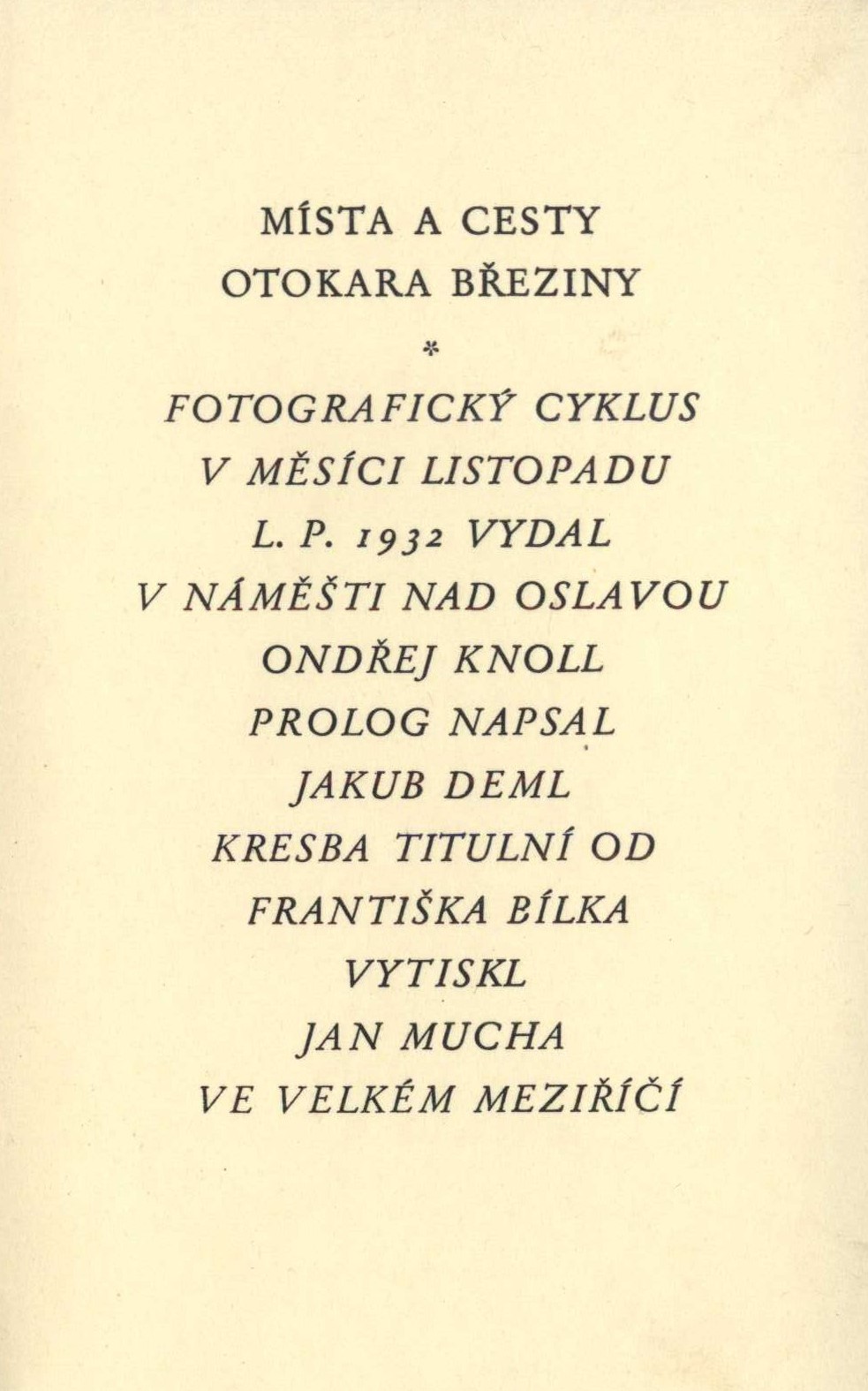 Názvové údaje Nebeklíče od Landfrasů : knižní bestsellery 19. století / Štěpánka Běhalová ; grafické zpracování Jakub Valášek, Helena Svobodová Osobní jméno Běhalová, Štěpánka, 1969- (Autor) Další autoři Valášek, Jakub, 1979- (Knižní grafik) (Sazeč) Korp. Muzeum Jindřichohradecka (Jindřichův Hradec, Česko) (Nakladatel, vydavatel) Nová tiskárna Pelhřimov (tiskárna) (Tiskař) Nakladatel Jindřichův Hradec : Muzeum Jindřichohradecka, 2017 Výrobce Pelhřimov : Nová tiskárna Pelhřimov Rozsah 81 stran : ilustrace (převážně barevné), portréty, faksimile ; 21 cm Heslo korporace (zkrác. heslo korp.) : Landfrasova tiskárna (Jindřichův Hradec, Česko) Geografické heslo Jindřichův Hradec (Česko) Klíčová slova tiskárny * nakladatelství * vydavatelství * vydávání * distribuce knih * distribuční firmy * knižní produkce * vzácné tisky * knižní vazby * obrazové publikace * studie * reprodukce Počet ex. 1, z toho volných 1 Druh dok. monografie Signatura C12b 17929 Názvové údaje Pozdvihni se duše z prachu-- : kramářské tisky s náboženskou tematikou ze sbírek Muzea Jindřichohradecka / Štěpánka Běhalová ; [grafické zpracování Jakub Valášek, Yvetta Měrtlová ; sazba Jakub Valášek] Osobní jméno Běhalová, Štěpánka, 1969- (Autor) Další autoři Valášek, Jakub, 1979- (Knižní grafik) (Sazeč) Měrtlová, Yvetta (Knižní grafik) Korp. Muzeum Jindřichohradecka (Jindřichův Hradec, Česko) Nakladatel [Jindřichův Hradec] : Muzeum Jindřichohradecka, 2013 Rozsah 70 s. : faksim. (některé barev.) Heslo korporace (zkrác. heslo korp.) : Muzeum Jindřichohradecka (Jindřichův Hradec, Česko) Chronologie 18.-19. stol. Geografické heslo Jindřichův Hradec (Česko) Klíčová slova kramářské tisky * náměty * témata * motivy * katolické písně * katolické modlitby * křesťanská symbolika * lidová zbožnost * náboženské poutě * regionální muzea * muzejní sbírky * Česko * stol. 18.-19. * katalogy výstav Počet ex. 1, z toho volných 1 Druh dok. monografie Signatura C12b 15275 Názvové údaje Bjlá panj w Gindřichowu Hradci : wyprawowánj z patnáctého stoletj Další autoři František X. Škarnicl - synové (tiskárna, nakladatelství) (Nakladatel, vydavatel) (Tiskař) Nakladatel W Skalicy : pjsmem Fr.X. Škarnicla Sinů, 1868 Rozsah 48 stran Osobní hesla z Rožmberka, Perchta, 1429-1476 - šlechtična Geografické heslo Jindřichův Hradec (Česko) Klíčová slova šlechtičny * Česko * stol. 15. * pověsti Počet ex. 1, z toho volných 1 Druh dok. monografie Signatura L X e 15/přív. 1 Názvové údaje Jak poznal prof. Pekař Jindřichův Hradec / Josef Klik Osobní jméno Klik, Josef, 1896-1965 (Autor) Další autoři Přátelé starého Jindřichova Hradce (sdružení) (Nakladatel, vydavatel) Alois Josef Landfras a syn (firma) (Tiskař) Nakladatel V J. Hradci : nákladem spolku "Přátelé starého Jindřichova Hradce", 1937 Výrobce V J. Hradci : tiskem knihtiskárny A. Landfras Syn Rozsah 44 stran : obrázky Osobní hesla Pekař, Josef, 1870-1937 - historik, pedagog, spisovatel a literární historik Geografické heslo Jindřichův Hradec (Česko) Klíčová slova česká literatura * regionální dějiny * biografie * čeští historici * Pekař J. * korespondence * dopisy * kultura * Česko * stol. 19.-20. Počet ex. 3, z toho volných 3 Druh dok. monografie Signatura M 54 b 236, H Z V 93, K U II 57 Názvové údaje Jindřichův Hradec : město nad Vajgarem / [autoři textů Štěpánka Běhalová ... [et al.] ; autoři fotografií Josef Böhm ... [et al.] ; grafická úprava Zdeněk Halla] Další autoři Běhalová, Štěpánka, 1969- (Autor) Böhm, Josef, 1944- (Fotograf) Halla, Zdeněk, 1962- (Knižní grafik) Korp. Jindřichův Hradec, město (Nakladatel, vydavatel) Graspo (tiskárna) (Tiskař) Aladin agency s.r.o. (grafické studio, Praha) (Tiskař) Nakladatel Jindřichův Hradec : město Jindřichův Hradec, 2008 Výrobce Graspo CZ, a. s. Rozsah 140 s. : il. (převážně barev.), faksim. ; 34 cm Geografické heslo Jindřichův Hradec (Česko) - dějiny * Jindřichův Hradec (Česko) - vlastivěda Klíčová slova monografie * Jindřichův Hradec * fotografická publikace * památky * krajina * vlastivěda * historie * dějiny města * hrady * zámky * interiéry * současnost Počet ex. 1, z toho volných 1 Druh dok. monografie Signatura C12d 1638 Názvové údaje Jindřichův Hradec sobě i budoucím! Další autoři Muk, Jan, 1901-1980 (Autor) Korp. Alois Josef Landfras a syn (firma) (Tiskař) Nakladatel Jindřichův Hradec : Přípravný výbor Družstva pro vystavění Masarykova osvětového domu, 1945 Výrobce A. Landfras Syn, náj. Fr. Pfauser Rozsah 18 stran ; 17 cm Předmětová hesla společenské domy - Československo Geografické heslo Jindřichův Hradec (Česko) Klíčová slova Československo * Jindřichův Hradec * společenský život * osvěta * jubilejní publikace * brožury Počet ex. 1, z toho volných 1 Druh dok. monografie Signatura M 17 g 30 Názvové údaje Místa a cesty Otokara Březiny. I. díl, Počátky, Panské Dubenky, Domašín, Telč / prolog napsal Jakub Deml ; kresba titulní od Františka Bílka Další autoři Deml, Jakub, 1878-1961 (Autor úvodu atd.) Bílek, František, 1872-1941 (Ilustrátor) Zapletal, Tomáš, 1881-1960 (Autor úvodu atd.) Knoll, Ondřej, 1883-1960 (Fotograf) (Nakladatel, vydavatel) Korp. Knihtiskárna Jana Muchy (Tiskař) Nakladatel V Náměšti nad Oslavou : Ondřej Knoll, 1932 Výrobce Ve Velkém Meziříčí : Jan Mucha Rozsah 4, 4 nečíslované strany, 14 nečíslovaných fotografií : 1 ilustrace, fotografie ; 14 cm Osobní hesla Březina, Otokar, 1868-1929 - učitel, básník, esejista, prozaik a myslitel Geografické heslo Počátky (Pelhřimov, Česko) * Panské Dubenky (Česko) * Domašín (Studená, Jindřichův Hradec, Česko) * Telč (Česko) Klíčová slova čeští spisovatelé *