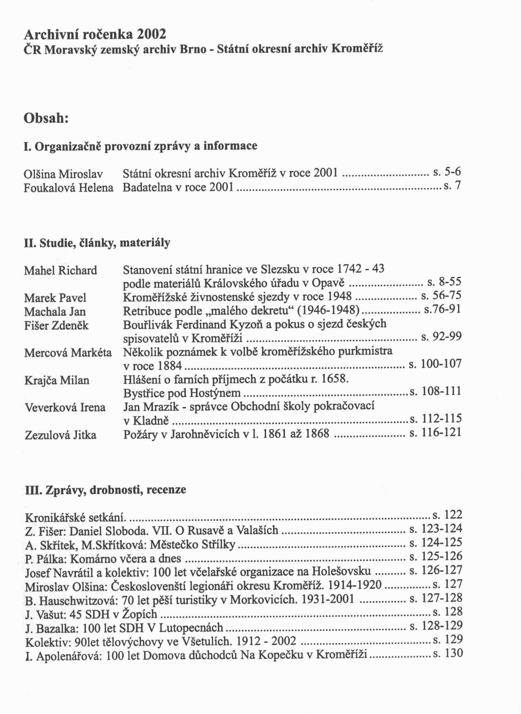 Názvové údaje Chřiby záhadné a mytické 2 / Michal Baščan ...[et al.] ; [foto Bořek Žižlavský, Pavel Bezděčka a archiv ; grafická úprava a sazba Vít Kučera] Osobní jméno Baščan, Michal, 1974-2009 (Autor) Další autoři Žižlavský, Bořek, 1962- (Fotograf) Kučera, Vít (Grafický technik) Nakladatel Buchlovice : Veligrad, 2013 Výrobce (Hudec) Rozsah 113 s. : il. Klíčová slova česká literatura * pověsti * moravské pověsti * záhady * sborníky * Morava * Kroměřížsko Počet ex. 1, z toho volných 1 Druh dok. monografie Signatura C12b 15063 Názvové údaje Vývoj regionálního tisku na Kroměřížsku / [Vojtěch Březina] Osobní jméno Březina, Vojtěch, 1929-2019 (Autor) Rozsah 1997, číslo 5, s. 107-113 Klíčová slova česká literatura * bibliografie * periodika * tiskoviny * noviny * regionální tvorba * Kroměříž * Kroměřížsko * studie * r. 1848-1996 Počet ex. 1, z toho volných 1 Druh dok. separáty Signatura PK 0039 Názvové údaje O životopisných románech / František Kožík ; [grafickou úpravu s použitím kreseb Zdeňka Mlčocha provedl Břetislav Dadák ; výběrovou bibliografii zpracoval a redigoval Oldřich Fiala] Osobní jméno Kožík, František, 1909-1997 (Autor) Další autoři Mlčoch, Zdeněk, 1921-1995 (Ilustrátor) Dadák, Břetislav, 1936-2014 (Grafický technik) Fiala, Oldřich, 1945- (Editor) Korp. Okresní knihovna (Kroměříž) Albatros. Klub dětských knihoven (Praha) Nakladatel Kroměříž : Městský národní výbor, 1979 Rozsah 38 s. Klíčová slova česká literatura * životopisné romány * Kroměřížsko * bibliografie * stol. 20. Počet ex. 1, z toho volných 1 Druh dok. monografie Signatura C12b 6232 Názvové údaje Výtvarné umění na Kroměřížsku a Zdounecku / Ludvík Páleníček ; [s ... obálkou Františka Vrobela] ; [knihtiskař Karel Kryl] Osobní jméno Páleníček, Ludvík, 1904-1991 (Autor) (Autor podpisu) Další autoři Vrobel, František, 1892-1953 (Autor obálky) Kryl, Karel, 1878-1943 (Tiskař) Korp. Osvětové sbory na Kroměřížsku a Zdounecku (Kroměříž) (Nakladatel, vydavatel) Nakladatel V Kroměříži : Nákaldem Osvětových sborů na Kroměřížsku a Zdounecku, 1940 Výrobce (Vytiskl Karel Kryl) Rozsah 107 s., [15] listů obr. příl. : il. Klíčová slova česká literatura * výtvarné umění * Kroměřížsko * město * Kroměříž * čeští výtvarníci * soupis * seznam * životopisy * přehledy Počet ex. 1, z toho volných 1 Druh dok. monografie Signatura KaG IA2 63 Názvové údaje Archivní ročenka 1998 / Státní okresní archiv Kroměříž ; [odpovědný redaktor Jarmila Bartošíková] Záhlaví-korpor. Státní okresní archiv Kroměříž (Nakladatel, vydavatel) Další autoři Bartošíková, Jarmila, 1954- (Editor) Nakladatel Kroměříž : Státní okresní archiv, 1998 Rozsah 116 s. : il., portréty, faksim., erby, tb. Klíčová slova Kroměřížsko * vlastivěda * historie kraje * osobnosti * r. 1998 * archivní ročenka Počet ex. 1, z toho volných 1 Druh dok. monografie Signatura C12b 14490 Názvové údaje Archivní ročenka 2002. VIII. ročník Záhlaví-korpor. Státní okresní archiv Kroměříž (Nakladatel, vydavatel) Nakladatel Brno : Moravský zemský archiv ; Kroměříž : Státní okresní archiv, 2002 Rozsah 130 s. : il., portréty, faksim. Klíčová slova Kroměřížsko * vlastivěda * historie kraje * osobnosti * archivní fondy * r. 2002 * archivní ročenka Počet ex. 1, z toho volných 1 Druh dok. monografie Signatura C12b 14492 Názvové údaje Květy sokolských vzpomínek z pohnutých dob / Miloš Živný ; [v typografické úpravě s osmi kresbami a obálkou Františka Vrobla] Osobní jméno Živný, Miloš, 1882-1940 (Autor) Další autoři Vrobel, František, 1892-1953 (Ilustrátor) (Autor obálky) (Typograf) Nakladatel V Kroměříži : Sokolská župa Hanácká, 1931 Výrobce (Čeněk Pechtor) Rozsah 88 s. ; 4° Klíčová slova Sokol * sokolstvo * Česko * Kroměřížsko * Kroměříž * tělovýchovné jednoty * historie * stol. 19.-20., léta 20. * 1. světová válka * vzpomínky Počet ex. 1, z toho volných 1 Druh dok. monografie Signatura C12d 1248 Názvové údaje Archivní ročenka 1999 : Státní okresní archiv Kroměříž Nakladatel Kroměříž : Státní okresní archiv, 1999 Rozsah 106 s. : il., portréty, faksim., mp. Klíčová slova archivní ročenka * Kroměřížsko * vlastivěda * historie kraje * osobnosti * r. 1999 Počet ex. 1, z toho volných 1 Druh dok. monografie Signatura C12b 14491 Názvové údaje Muzeum : sborník Muzea Kroměřížska / odpovědný redaktor Jiří Stránský ; k vydání připravila Eva Fuksová ; grafická úprava a sazba Šárka Hromková Další autoři Stránský, Jiří, (Redaktor, výkonný redaktor) 1931-2019 Fuksová, Eva (Editor) Hromková, Šárka, (Grafický technik) (Sazeč) 1968- Korp. Muzeum Kroměřížska (Kroměříž, Česko) (Nakladatel, vydavatel) Nakladatel Kroměříž : Muzeum Kroměřížska, 1999 Výrobce Přerov : KATOS Rozsah 112 stran : fotografie, ilustrace ; 23 cm Heslo korporace (zkrác. heslo korp.) : Muzeum Kroměřížska (Kroměříž, Česko) Klíčová slova muzea * Kroměřížsko * Kroměříž * sborník * vlastivěda Počet ex. 1, z toho volných 1 Druh dok. monografie Signatura Listopad 0088