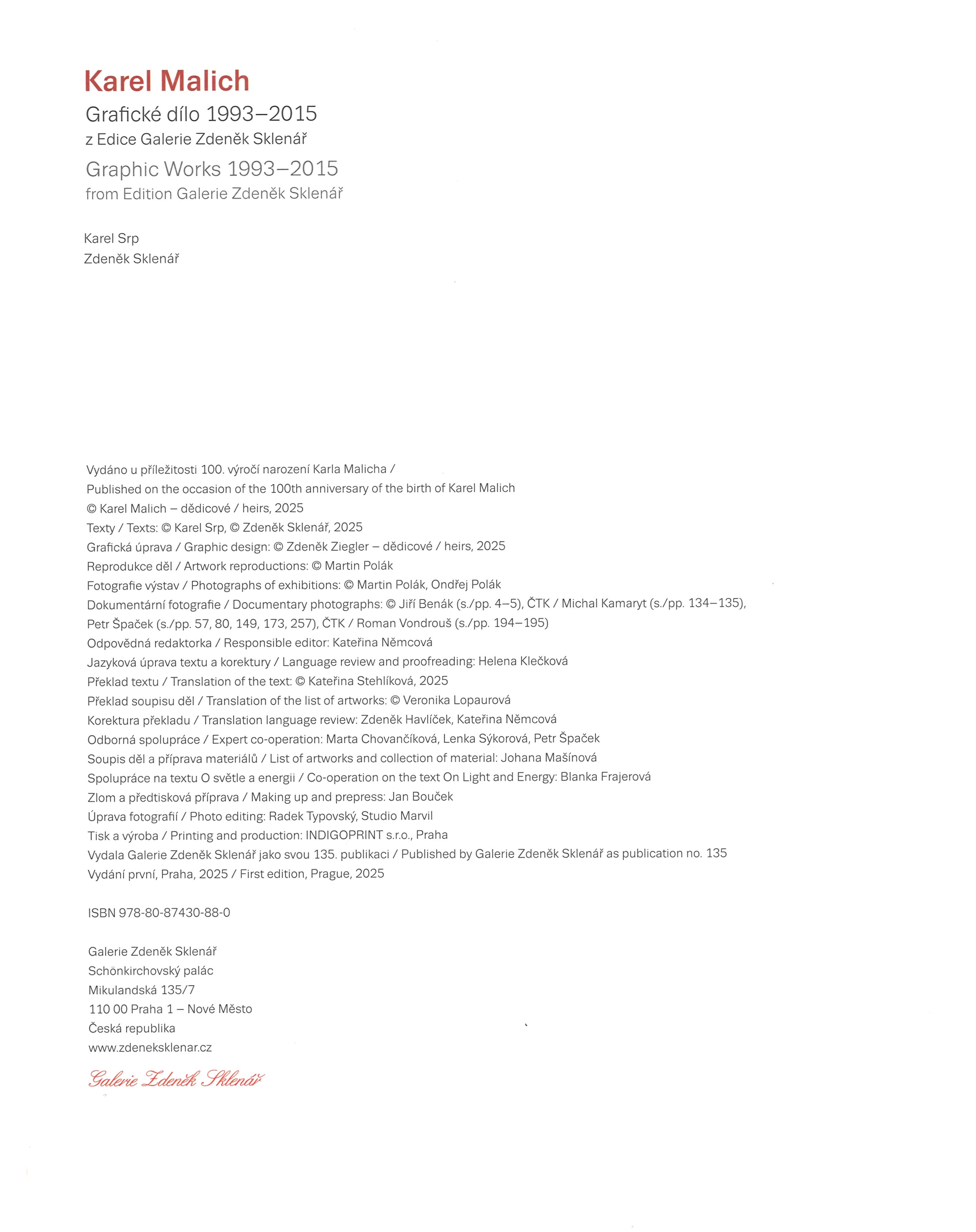 Názvové údaje Karel Malich : Galerie Benedikta Rejta - Muzeum moderního umění, 19.6. - 05.09.2004 / [foto Rudolf Prekop, Vasil Stanko ; text Karel Srp] Osobní jméno Malich, Karel, 1924- (Umělec) Další autoři Prekop, Rudo, 1959- (Fotograf) Stanko, Vasil, 1962- (Fotograf) Srp, Karel, 1958- (Autor úvodu atd.) Korp. Galerie Benedikta Rejta (Louny, Česko) (Nakladatel, vydavatel) Nakladatel V Lounech : Galerie Benedikta Rejta, 2004 Rozsah [20] s. : il. ; 21 cm Osobní hesla Malich, Karel, 1924- - malíř, grafik, sochař Chronologie 20. stol. Předmětová hesla české výtvarné umění - 20. stol * objekty (umění) - Česko Klíčová slova katalog výstavy * české výtvarné umění * moderní umění * sochařství * čeští výtvarní umělci * Malich K. * Louny * Česko * r. 2004 Počet ex. 1, z toho volných 1 Druh dok. monografie Signatura EJulis 0682 Názvové údaje Karel Malich : Wires = Dráty / [itroduction, documentation and concept Jiří Ševčík et al.] Osobní jméno Malich, Karel, 1924-2019 (Umělec) Další autoři Ševčík, Jiří, 1974- (Autor úvodu atd.) Nakladatel Praha : [VVP AVU - Vědecko výzkumné pracoviště Akademie výtvarných umění], 2005 Rozsah 223 s. : il. (některé barev.) Osobní hesla Malich, Karel, 1924-2019 - malíř, grafik, sochař Klíčová slova české výtvarné umění * plastiky * Česko * stol. 20. * dočasné výstavy * katalogy výstav * fotografické publikace Počet ex. 1, z toho volných 1 Druh dok. monografie Signatura C12b 8840 Názvové údaje Přišedší odjinud : portrét Karla Malicha / napsal Petr Volf ; [grafická úprava Aleš Najbrt a Bohumil Vašák (Studio Najbrt)] Osobní jméno Volf, Petr, 1965- (Autor) Další autoři Najbrt, Aleš, 1962- (Knižní grafik) Vašák, Bohumil, 1931-1992 (Knižní grafik) Korp. Galerie Zdeněk Sklenář (Praha, Česko) (Nakladatel, vydavatel) Nakladatel Praha : Galerie Zdeněk Sklenář, 2013 Výrobce T. A. Print) Rozsah 158 s. : il. + portréty Osobní hesla Malich, Karel, 1924-2019 - malíř, grafik, sochař Klíčová slova české výtvarné umění * čeští výtvarní umělci * Malich K. * rozhovory * biografické vzpomínky * biografie * obrazové publikace Počet ex. 1, z toho volných 1 Druh dok. monografie Signatura C12b 15325 Názvové údaje 8 Künstler aus Prag im München : 27. Mai-26. Juni 1983 Další autoři Storms, Walter (Autor) Korp. Künstlerwerkstatt Lothringer Strasse 13 (Organizátor akce) Mnichov (Německo). (Nakladatel, vydavatel) Kulturreferat Nakladatel [München] : Kultureferat der Landeshaupstadt München, 1983 Rozsah 31 stran : ilustrace, portréty ; 21 cm Osobní hesla Boštík, Václav, 1913-2005 - malíř, grafik, ilustrátor * Boudník, Vladimír, 1924-1968 - grafik, malíř, fotograf, performer * Demartini, Hugo, 1931-2010 - sochař * Grygar, Milan, 1926- - malíř, grafik, ilustrátor, typograf * Jetelová, Magdalena, 1946- - sochařka, fotografka, výtvarná pedagožka * Kolíbal, Stanislav, 1925- - sochař, výtvarník, ilustrátor * Malich, Karel, 1924-2019 - malíř, grafik, sochař * Šimotová, Adriena, 1926-2014 - malířka, grafička, sochařka Klíčová slova české umění * čeští umělci * stol. 20. * moderní umění * katalogy výstav Počet ex. 1, z toho volných 1 Druh dok. monografie Signatura JVladislav 2919 Názvové údaje Eleven contemporary artists from Prague : Jiří Kolář, Stanislav Kolíbal, Aleš Veselý, Milan Grygar, Eva Kmentová , Karel Nepraš, Karel Malich, Alena Kučerová, Adriena Šimotová, Vladimír Janoušek : New York University, Dec. 9, 1980 - Jan. 5, 1981; Michigan University, Jan. 15, 1981 - Feb. 20, 1981 / [Meda Mládková, Jindřich Chalupecký] Další autoři Mládková, Meda, 1919-2022 (Autor úvodu atd.) Chalupecký, Jindřich, 1910-1990 (Autor úvodu atd.) Korp. New York University University of Michigan. Museum of Art Nakladatel [Ann Arbor : University of Michigan, 1981] Rozsah Nestr. : il. Osobní hesla Kolář, Jiří, 1914-2002 - básník, výtvarník a překladatel * Kolíbal, Stanislav, 1925- - výtvarník * Veselý, Aleš, 1935-2015 - malíř, grafik, sochař * Grygar, Milan, 1926- - malíř, grafik, ilustrátor, typograf * Kmentová, Eva, 1928-1980 - akademická sochařka * Nepraš, Karel, 1932-2002 - keramik, sochař, restaurátor, grafik a ilustrátor (karikaturista) * Malich, Karel, 1924-2019 - malíř, grafik, sochař * Kučerová, Alena, 1935- - výtvarnice, grafička a ilustrátorka * Hadlíz, Jaroslav, 1925-1999 - výtvarník, prozaik, básník, překladatel * Šimotová, Adriena, 1926-2014 - malířka, grafička, sochařka * Janoušek, Vladimír, 1922-1986 - sochař a malíř Klíčová slova české výtvarné umění * čeští výtvarní umělci * české malířství * české sochařství * česká grafika * moderní umění * stol. 20. * katalog výstavy Počet ex. 2, z toho volných 2 Druh dok. monografie Signatura BVolkova 0513, BVolkova 0676 Názvové údaje Karel Malich : grafické dílo 1993-2015 z edice Galerie Zdeněk Sklenář = graphic works 1993-2015 from edition Galerie Zdeněk Sklenář / Karel Srp, Zdeněk Sklenář ; překlad textu: Kateřina Stehlíková Osobní jméno Malich, Karel, 1924-2019 (Umělec) Další autoři Srp, Karel, ml. 1958- (Autor) Sklenář, Zdeněk, 1961- (Autor) Stehlíková, Kateřina (Překladatel) Korp. Galerie Zdeněk Sklenář (Praha, Česko) (Nakladatel, vydavatel) Indigoprint (tiskárna) (Tiskař) Nakladatel Praha : Galerie Zdeněk Sklenář, 2025 Výrobce Indigoprint, s.r.o. Rozsah 273 stran : ilustrace (převážně barevné), portréty, faksimile ; 33 cm Osobní hesla Malich, Karel, 1924-2019 - malíř, grafik, sochař Klíčová slova výtvarné umění * moderní umění * abstraktní umění * čeští výtvarní umělci * grafika * malířství * stol. 20.-21. * jubilejní publikace * obrazové publikace Počet ex. 1, z toho volných 1 Druh dok. monografie Signatura LITd 0320 Názvové údaje Malich : Jíz