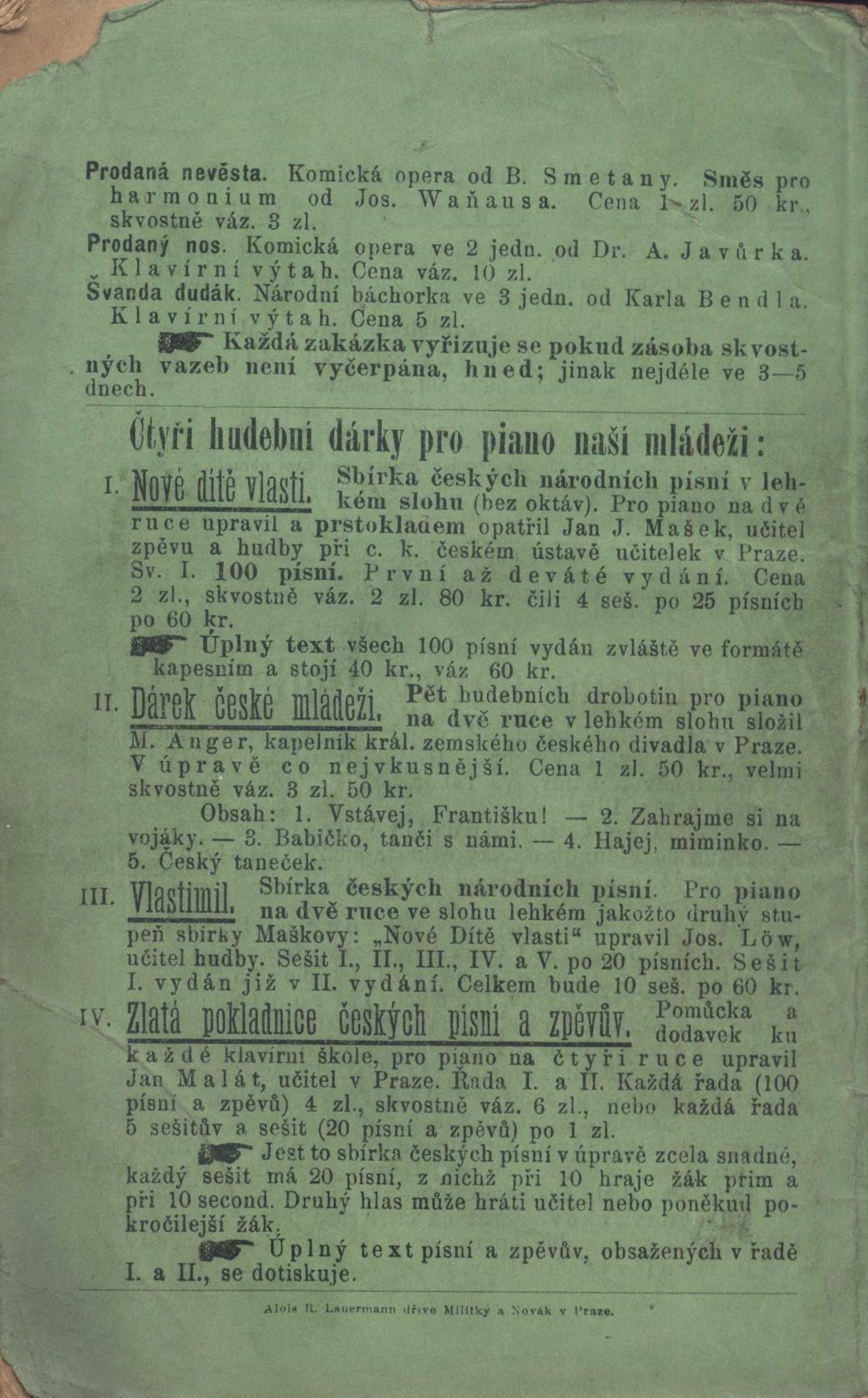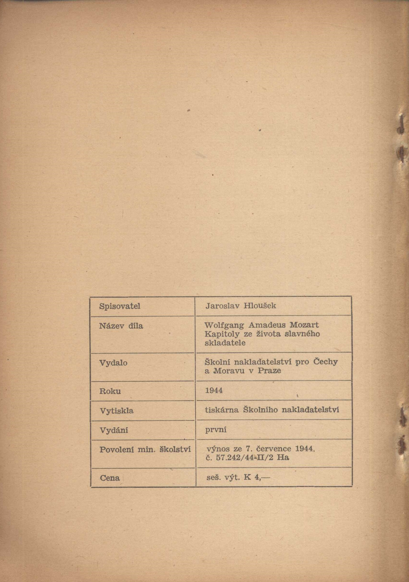 Názvové údaje Bertramka / Vlastimil Blažek Osobní jméno Blažek, Vlastimil, 1878-1950 (Autor) (Autor doslovu, tiráže atd.) (Nakladatel, vydavatel) Další autoři V. Helebrant (Praha) (Tiskař) Nakladatel V Praze : V. Blažek, 1934 Výrobce (V. Helebrant) Rozsah 39 s. : il. Klíčová slova Praha * česká literatura * pragensia * Mozart W. A. * Smíchov (Praha) Počet ex. 1, z toho volných 1 Druh dok. monografie Signatura KaG XIII D 37 Názvové údaje Der Musiker der Liebe : ein buch für Mozartfreunde / Alfred Burgartz ; [Einbandzeichnung: Willi Johannsmeier] Osobní jméno Burgartz, Alfred, 1890-1987 (Autor) Další autoři Wilhelm Limpert Verlag (Nakladatel, vydavatel) (Tiskař) Nakladatel Berlin : Wilhelm Limpert-Verlag, 1942 Rozsah 160 s., [8] s. obr. příl. : il. Osobní hesla Mozart, Wolfgang Amadeus, 1756-1791 - rakouský hudební skladatel Klíčová slova německá literatura * německá próza * životopisné romány * životopisný román * hudba * Mozart W. A. Počet ex. 1, z toho volných 1 Druh dok. monografie Signatura KaG LII B 7 Názvové údaje Don Juan : zpěvohra o 4 jednáních / z vlaského Lorenza da Ponte přeložil a pro české jeviště upravil V.J. Novotný ; hudba od W.A. Mozarta Osobní jméno Da Ponte, Lorenzo, 1749-1838 (Autor) Další autoři Novotný, Václav Juda, 1849-1922 (Autor adaptace, upravovatel) (Překladatel) (Autor úvodu atd.) Mozart, Wolfgang Amadeus, 1756-1791 (Skladatel) Korp. Fr. A. Urbánek (nakladatelství) (Nakladatel, vydavatel) Alois R. Lauermann (nakladatelství, tiskárna, knihtiskárna, komisionářství) (Tiskař) Nakladatel V Praze : Nakladatel Fr. A. Urbánek, český knihkupec, 1884 Výrobce V Praze : Alois R. Lauermann dříve Militký a Novák Rozsah 114 stran ; 18 cm Klíčová slova italská literatura * libreto * Mozart W. A. * Don Giovanni (opera) * český překlad * Novotný V. J. * r. 1884 Počet ex. 1, z toho volných 1 Druh dok. monografie Signatura VZinková 0676 Názvové údaje Wolfgang Amadeus Mozart : kapitoly ze života slavného skladatele / Jaroslav Hloušek Osobní jméno Hloušek, Jaroslav, 1875-1957 (Autor) Další autoři Školní nakladatelství pro Čechy a Moravu (Nakladatel, vydavatel) tiskárna Školního nakladatelství (Tiskař) Nakladatel [Praha] : Školní nakladatelství pro Čechy a Moravu v Praze, 1944 Výrobce [Praha] : tiskárna Školního nakladatelství Rozsah 46 stran : noty ; 21 cm Osobní hesla Mozart, Wolfgang Amadeus, 1756-1791 - rakouský hudební skladatel a klavírní virtuos Předmětová hesla hudební skladatelé - Rakousko - 18. století * composers - Austria - 18th century Klíčová slova česká literatura * Hloušek J. * hudební skladatelé * monografie * Mozart W. A. * učební pomůcka * literatura pro děti a mládež * r. 1944 Počet ex. 1, z toho volných 1 Druh dok. monografie Signatura VZinková 0305 Názvové údaje Bertramka v době Mozartově i nyní / Luboš Jeřábek Osobní jméno Jeřábek, Luboš, 1864-1937 (Autor) Další autoři Umělecká beseda (spolek). Hudební odbor (Nakladatel, vydavatel) Cyrilometodějská knihtiskárna, knihkupectví a nakladatelství (Tiskař) Nakladatel V Praze : Nákladem Hudebního odboru Umělecké besedy, [19--] Výrobce (Knihtiskárna V. Kotrba) Rozsah 24 s. Klíčová slova česká literatura * Praha * pragensia * Smíchov (Praha) * Mozart W. A. Počet ex. 1, z toho volných 1 Druh dok. monografie Signatura KaG XIII D 36 Názvové údaje V Praze byl šťastný (W. A. Mozart) / Rudolf Kadeřábek Osobní jméno Kadeřábek, Rudolf, 1951- (Autor) Další autoři Šafrata, Jan (Fotograf) Roháčová, Nina, 1930-2012 (Autor obálky) (Knižní grafik) Staněk, Jaroslav, 1961- (Kreslič) Korp. Dialog (nakladatelství) (Nakladatel, vydavatel) Akropolis - Jiří Tomáš (nakladatelství) (Spolupracovník) Tiskařské závody, n.p. (Tiskař) Unifikovaný název V Praze byl šťastný (W. A. Mozart) Nakladatel Praha : Dialog, a. s., ve spolupráci s nakladatelstvím Akropolis, 1991 Výrobce Praha : Tiskařské závody, a. s. Rozsah 68 stran, 10 nečíslovaných stran obrazové přílohy : ilustrace, plány ; 15 cm Osobní hesla Mozart, Wolfgang Amadeus, 1756-1791 - rakouský hudební skladatel a klavírní virtuos Předmětová hesla hudební skladatelé - Rakousko - 18. stol. * cesty a pobyt - Česko * hudební život - Česko - 18. stol. * hudební místopis - Česko Klíčová slova česká literatura * pojednání * Kadeřábek R. * hudební skladatelé * Rakousko * monografie * Mozart W. A. * Praha * obrazové přílohy Počet ex. 1, z toho volných 1 Druh dok. monografie Signatura VZinková 0014 Názvové údaje Mozart v Praze : hudební kronika let 1787-1791 / Karel Koval ; [ilustroval, obálku a vazbu navrhl Cyril Bouda ; s doslovem Pavela Eisnera ; poznámkami a vysvětlivkami opatřil Josef Špičák] Osobní jméno Koval, Karel, 1896-1956 (Autor) Další autoři Bouda, Cyril, 1901-1984 (Ilustrátor) (Autor obálky) Eisner, Pavel, 1889-1958 (Autor úvodu atd.) Špičák, Josef, 1918-1989 (Autor komentáře textu) Korp. Svobodné slovo - Melantrich (nakladatelství) (Nakladatel, vydavatel) Nakladatel Praha : Svobodné slovo - Melantrich, 1956 Rozsah 679 s., [8] s. obr. příl. : il. Osobní hesla Mozart, Wolfgang Amadeus, 1756-1791 - rakouský hudební skladatel Klíčová slova česká literatura * Mozart W. A. * hudební skladatelé * Rakousko * Praha * Česko * r. 1787-1791 * česká próza * románová kronika * životopisný román Počet ex. 2, z toho volných 2 Druh dok. monografie Signatura C12b 10910, MEL 2081 Názvové údaje Sbohem, můj krásný plameni : zlomky o životě a díle W.A. Mozarta z fiktivních vzpomínek Josefíny Duškové provázených poznámkami neznámého nálezce / Zdeněk Mahler Osobní jméno Mahler, Zdeněk, 1928-2018 (Autor) Další autoři Sudek, Josef, 1896-1976 (Fotograf) Koubek, Petr, 1953- (Fotograf) Krejčí, Jaroslav, 1929-2006 (Ilustrátor) (Fotograf) (Knižní grafi