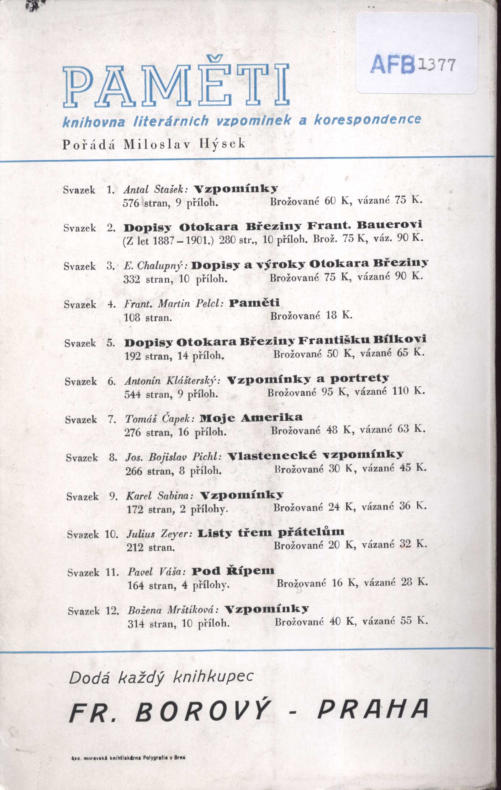 Názvové údaje O Janu Nerudovi / J. Arbes ; k vydání připravil a poznámkami opatřil Karel Polák ; graficky upravil Jaroslav Šváb Osobní jméno Arbes, Jakub, 1840-1914 (Autor) Další autoři Polák, Karel, 1903-1956 (Editor) (Autor komentáře textu) Šváb, Jaroslav, 1906-1999 (Knižní grafik) Korp. Melantrich (nakladatelství) (Nakladatel, vydavatel) Nakladatel Praha : Melantrich, 1952 Výrobce Kroměříž : Moravskoslez. tisk. 1001 Rozsah 213 stran Osobní hesla Neruda, Jan, 1834-1891 - novinář, básník, prozaik, překladatel Klíčová slova česká literatura * Neruda J. * fejetony * vzpomínky * recenze Počet ex. 7, z toho volných 7 Druh dok. monografie Signatura MEL 1264, MEL 1264a, KQ IV 38, P 65 b 42, P 136 f 21, M 147 f 35, Thon 3320 Názvové údaje Jan Neruda dnešku / František Buriánek ; [obálku navrhl Josef Paukert] Osobní jméno Buriánek, František, 1917-1995 (Autor) Další autoři Paukert, Josef, 1915-1991 (Autor obálky) Nakladatel Praha : Československý spisovatel, 1955 Rozsah 36 s. Osobní hesla Neruda, Jan, 1834-1891 - novinář, básník, prozaik, překladatel Klíčová slova česká literatura * Neruda J. * dílo * studie Počet ex. 1, z toho volných 1 Druh dok. monografie Signatura AČS 06012 Názvové údaje Neruda prozaik / Aleš Haman ; [obálku, vazbu a grafickou úpravu navrhl Milan Hegar] Osobní jméno Haman, Aleš, 1932-2023 (Autor) Další autoři Hegar, Milan, 1921-1987 (Grafický technik) (Autor obálky) Nakladatel Praha : Odeon, 1968 Rozsah 208 s. Osobní hesla Neruda, Jan, 1834-1891 - novinář, básník, prozaik, překladatel Klíčová slova česká literatura * studie * rozbor literárního díla * osobnosti * Neruda J. * r. 1968 Počet ex. 1, z toho volných 1 Druh dok. monografie Signatura MUK 1879 Názvové údaje Tři stálice moderní české prózy: Neruda, Čapek, Kundera / Aleš Haman ; [k vydání připravil Radim Kopáč ; obálka Kateřina Řezáčová ; grafická úprava Jan Šerých] Osobní jméno Haman, Aleš, 1932-2023 (Autor) Další autoři Kopáč, Radim, 1976- (Editor) Řezáčová, Kateřina, 1955- (Autor obálky) Šerých, Jan, 1972- (Knižní grafik) Korp. Nakladatelství Karolinum (Tiskař) Tiskárna nakladatelství Karolinum (Tiskař) Nakladatel Praha : Karolinum, 2014 Výrobce (tiskárna Nakladatelství Karolinum) Rozsah 346 s. Osobní hesla Neruda, Jan, 1834-1891 - novinář, básník, prozaik, překladatel * Čapek, Karel, 1890-1938 - spisovatel, dramatik, novinář * Kundera, Milan, 1929-2023 - prozaik a básník, esejista, literární teoretik, překladatel Klíčová slova česká próza * literatura * společnost * literární estetika * interpretace literárního díla * přijetí literárního díla * literárněvědné rozbory * Neruda J. * Čapek K. * Kundera M. * Česko * stol. 19.-21. * studie * stati * sborníky Počet ex. 1, z toho volných 1 Druh dok. monografie Signatura C12b 15553 Názvové údaje Od tvaru k smyslu textu : stylistické reflexe a interpretace / Karel Hausenblas ; uspoř. Alena Macurová a Petr Mareš ; rejstř. sestav. Petr Mareš ; graf. zpracov. Drahomíra Marešová ; foto na obálce Bohumila Tomková Osobní jméno Hausenblas, Karel, 1923-2003 (Autor) Další autoři Macurová, Alena, 1946- (Sestavovatel, kompilátor) Mareš, Petr, 1954- (Sestavovatel, kompilátor) (Bibliografický předchůdce) Marešová, Drahomíra, 19-- (Grafický technik) Tomková, Bohumila (Fotograf) Nakladatel Praha : Filozofická fakulta UK, 1996 Rozsah 226 s. Klíčová slova česká literatura * literární rozbor * literární kritika * styl * stylistika * Mathesius V. * Mukařovský J. * Neruda J. * stol. 19.-20. Počet ex. 1, z toho volných 0 Druh dok. monografie Signatura C12b 545 Názvové údaje Dva večery ze života : stará vzpomínka z mládí začátečníkova / Ignát Herrmann Osobní jméno Herrmann, Ignát, 1854-1935 (Autor) (Nakladatel, vydavatel) (Autor podpisu) (Dedikátor) Další autoři Topič, František, 1858-1941 (Dedikant) Korp. Unie (tiskárna) (Tiskař) Nakladatel [Praha] : nákladem vlastním, 1917 Výrobce tiskem Unie) Rozsah 8 s. : il. ; 23 cm Osobní hesla Neruda, Jan, 1834-1891 - novinář, básník, prozaik, překladatel Klíčová slova česká literatura * próza * povídka * Herrmann I. * autobiografická próza * Neruda J. Počet ex. 1, z toho volných 1 Druh dok. monografie Signatura Topič 0826 Názvové údaje Román lásky a cti : [dramatická montáž] / Jindřich Honzl ; [v grafické úpravě a obálce Františka Muziky ; s kresbou sceny Bohumila Němce] Osobní jméno Honzl, Jindřich, 1894-1953 (Autor) (Sestavovatel, kompilátor) Další autoři Neruda, Jan, 1834-1891 (Autor) Světlá, Karolina, 1830-1899 (Autor) Muzika, František, 1900-1974 (Grafický technik) Němec, Bohumil, 1912-1985 (Ilustrátor) Korp. Fr. Borový (firma) (Nakladatel, vydavatel) Akciová moravská knihtiskárna Polygrafie (Tiskař) Nakladatel Praha : Fr. Borový, 1941 Výrobce Akciová moravská knihtiskárna Polygrafie) Rozsah 85 - [III] s., [6] s. obr. příl. : il. ; 8° Osobní hesla Neruda, Jan, 1834-1891 - novinář, básník, prozaik, překladatel * Světlá, Karolina, 1830-1899 - spisovatelka Klíčová slova česká literatura * vzpomínková literatura * osobnosti * čeští spisovatelé * osobní korespondence * Neruda J. * Světlá K. * Podlipská S. * Holinová A. * stol. 19. Počet ex. 2, z toho volných 2 Druh dok. monografie Signatura MUK 2099, AFB 1377 Názvové údaje Jan Neruda / kritická studie Jiřího Karáska ze Lvovic Osobní jméno Karásek ze Lvovic, Jiří, 1871-1951 (Autor) (Autor podpisu) Další autoři Hynek, Alois, 1842-1909 (Nakladatel, vydavatel) Rokyta, J. (Tiskař) Nakladatel V Praze : Nakladatel Alois Hynek, knihkupec, b. d. Výrobce (J. Rokyta) Rozsah 78 s. Osobní hesla Neruda, Jan, 1834-1891 - novinář, básník, prozaik, překladatel Klíčová slova literární studie * Neruda J. * česká poezie * monografické publikace