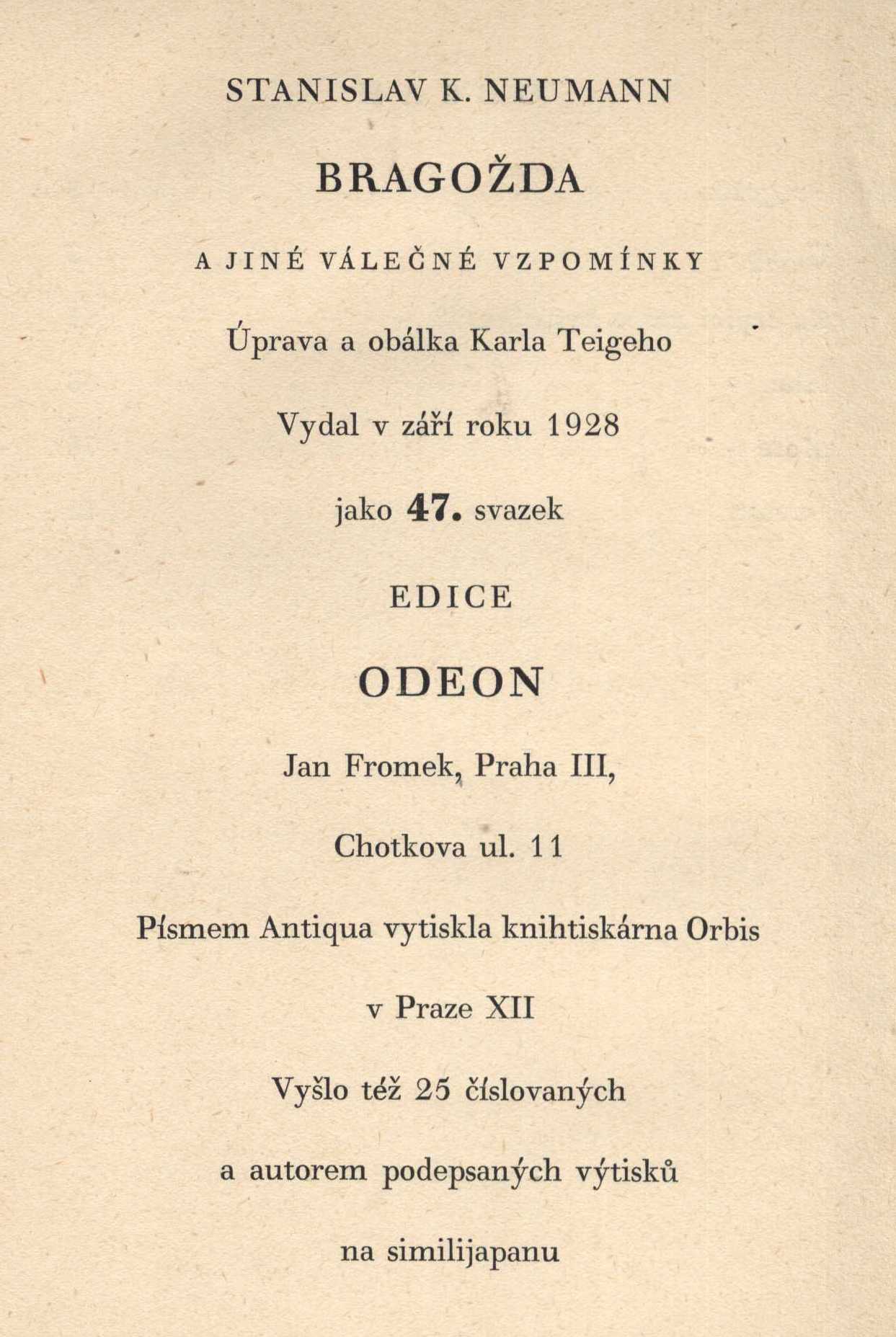 Názvové údaje S K N : 28. VI. 1947 [na paměť národního umělce soudruha St. K. Neumanna, který zemřel 28. června 1947 v Praze] / Konstantin Biebl ; [v úpravě Františka Muziky] Osobní jméno Biebl, Konstantin, 1898-1951 (Autor) (Dedikátor) Další autoři Muzika, František, 1900-1974 (Knižní grafik) Slabý, Zdeněk Karel, 1930-2020 (Dedikant) Neumann, Stanislav Kostka, 1875-1947 (Poctěná osoba) Korp. Nakladatelství Svoboda (Nakladatel, vydavatel) Nakladatel Svoboda, 1947 Rozsah 11 s. Osobní hesla Neumann, Stanislav Kostka, 1875-1947 - básník a publicista, překladatel Klíčová slova čeští básníci * Česko * stol. 19.-20. * česká poezie * oslavná báseň Počet ex. 1, z toho volných 1 Druh dok. monografie Signatura ZKSlabý 0649 Názvové údaje SKN : 28. VI. 1947 / Konstantin Biebl ; [v úpravě Františka Muziky] Osobní jméno Biebl, Konstantin, 1898-1951 (Autor) Další autoři Muzika, František, 1900-1974 (Knižní grafik) Korp. Nakladatelství Svoboda (Nakladatel, vydavatel) Nakladatel V Praze : Svoboda, 1947 Rozsah 11 s. Osobní hesla Neumann, Stanislav Kostka, 1875-1947 - básník a publicista, překladatel Klíčová slova česká literatura * česká poezie * verše * pamětní tisk Počet ex. 1, z toho volných 1 Druh dok. monografie Signatura KSynek 0057 Názvové údaje První knižní grafika Josefa Čapka / Josef Glivický Osobní jméno Glivický, Josef, 1903-1991 (Autor adaptace, upravovatel) (Dedikátor) Další autoři Tomeš, Jan Marius, 1913-2010 (Dedikant) Čapek, Josef, 1887-1945 (Umělec) Korp. Památník národního písemnictví (muzeum literatury) Nakladatel Praha, 1982 Rozsah Strany 205-211, 4 nečíslované strany obrazových příloh : ilustrace ; 25 cm Osobní hesla Čapek, Josef, 1887-1945 - malíř, grafik, scénický výtvarník a spisovatel * Neumann, Stanislav Kostka, 1875-1947 - básník a publicista, překladatel Klíčová slova čeští výtvarní umělci * malíři * grafici * knižní ilustrace * knižní grafika * Česko * stol. 20., léta 10. * korespondence * studie * dopisy Počet ex. 1, z toho volných 1 Druh dok. separáty Signatura C12c 4682 Názvové údaje Tvář ve stínu : medailóny / Zdeněk Kalista Osobní jméno Kalista, Zdeněk, 1900-1982 (Autor) Nakladatel České Budějovice : Růže, 1969 Rozsah 298 s. Osobní hesla Hora, Josef, 1891-1945 - básník, prozaik, překladatel, publicista * Ráž, Arnošt, 1884-1925 - advokát, básník * Bidlo, Jaroslav, 1868-1937 - historik, překladatel * Blatný, Lev, 1894-1930 - čes. JUDr., prozaik, dramatik a divadelní kritik. * Sova, Antonín, 1864-1928 - básník, beletrista, esejista, překladatel * Toman, Karel, 1877-1946 - archivář, básník, překladatel * Neumann, Stanislav Kostka, 1875-1947 - básník a publicista, překladatel * Píša, Antonín Matěj, 1902-1966 - básník, literární a divadelní kritik a historik, editor * Weil, J * Hůlka, Jaroslav, 1899-1924 - čes. prozaik * Nezval, Vítězslav, 1900-1958 - básník, překladatel a prozaik * Halas, František, 1901-1949 - básník, esejista, redaktor, překladatel Klíčová slova česká literatura * čeští spisovatelé * medailony osobností Počet ex. 2, z toho volných 2 Druh dok. monografie Signatura M 68 d 9, M 69 b 9 Názvové údaje St. K. Neumann : člověk a dílo (1875-1917) / František Kautman Osobní jméno Kautman, František, 1927-2016 (Autor) Další autoři Ústav pro českou literaturu (Československá akademie věd) (Nakladatel, vydavatel) Academia (nakladatelství) (Nakladatel, vydavatel) Nakladatel Praha : Academia, 1966 Rozsah 205 s., (4) s. obr. příl. Osobní hesla Neumann, Stanislav Kostka, 1875-1947 - básník a publicista, překladatel Klíčová slova čeští básníci * život a dílo Počet ex. 4, z toho volných 4 Druh dok. monografie Signatura Thon 1269, M 39 b 6, M 39 b 7, M 28 g 1 Názvové údaje Neumannův Červen / Jaromír Lang ; [graficky upravil a přebal navrhl Jaroslav Šváb] Osobní jméno Lang, Jaromír, 1914-1979 (Autor) Další autoři Šváb, Jaroslav, 1906-1999 (Knižní grafik) (Autor obálky) Korp. Melantrich (nakladatelství) (Nakladatel, vydavatel) Nakladatel Praha : Melantrich, 1974 Výrobce Tisk 2) Rozsah 316 s., [24] s. obr. příl. ; 8° Osobní hesla Neumann, Stanislav Kostka, 1875-1947 - básník a publicista, překladatel Klíčová slova česká literatura * Neumann S. K. * žurnalistika * studie Počet ex. 1, z toho volných 1 Druh dok. monografie Signatura MEL 0990 Názvové údaje St. K. Neumann : Čtyři přednášky / Jaromír Lang ; Obálku, vazbu a předsádku navrhl Josef Zhoř Osobní jméno Lang, Jaromír, 1914-1979 (Autor) Další autoři Zhoř, Josef (Grafický technik) Nakladatel Praha : Československý spisovatel, 1957 Rozsah 243 s. Osobní hesla Neumann, Stanislav Kostka, 1875-1947 - básník a publicista, překladatel Klíčová slova česká literatura * studie * přednášky * Neumann S. K. Počet ex. 2, z toho volných 2 Druh dok. monografie Signatura AČS 01360, AČS 01360a Názvové údaje Básně / Stanislav Kostka Neumann ; [k vyd. připr. A. M. Píša ; doslov naps. Zdeněk Pešat ; graf. úpr. František Muzika]. [Sv.] I. Osobní jméno Neumann, Stanislav Kostka, 1875-1947 (Autor) Další autoři Píša, Antonín Matěj, 1902-1966 (Editor) Pešat, Zdeněk, 1927-2010 (Editor) Muzika, František, 1900-1974 (Grafický technik) Korp. Československá akademie věd (Nakladatel, vydavatel) Státní nakladatelství krásné literatury a umění (Nakladatel, vydavatel) Nakladatel Praha : Státní nakladatelství krásné literatury a umění, 1962 Výrobce (Rudé právo) Rozsah 386 s. : il. Osobní hesla Neumann, Stanislav Kostka, 1875-1947 - básník a publicista, překladatel Klíčová slova česká literatura * poezie * básně * kritické vydání Počet ex. 2, z toho volných 2 Druh dok. monografie Signatura C12b 3936, LK P 81 e 20 Názvové údaje Bragožda a jiné válečné vzpomínky / Stanislav K