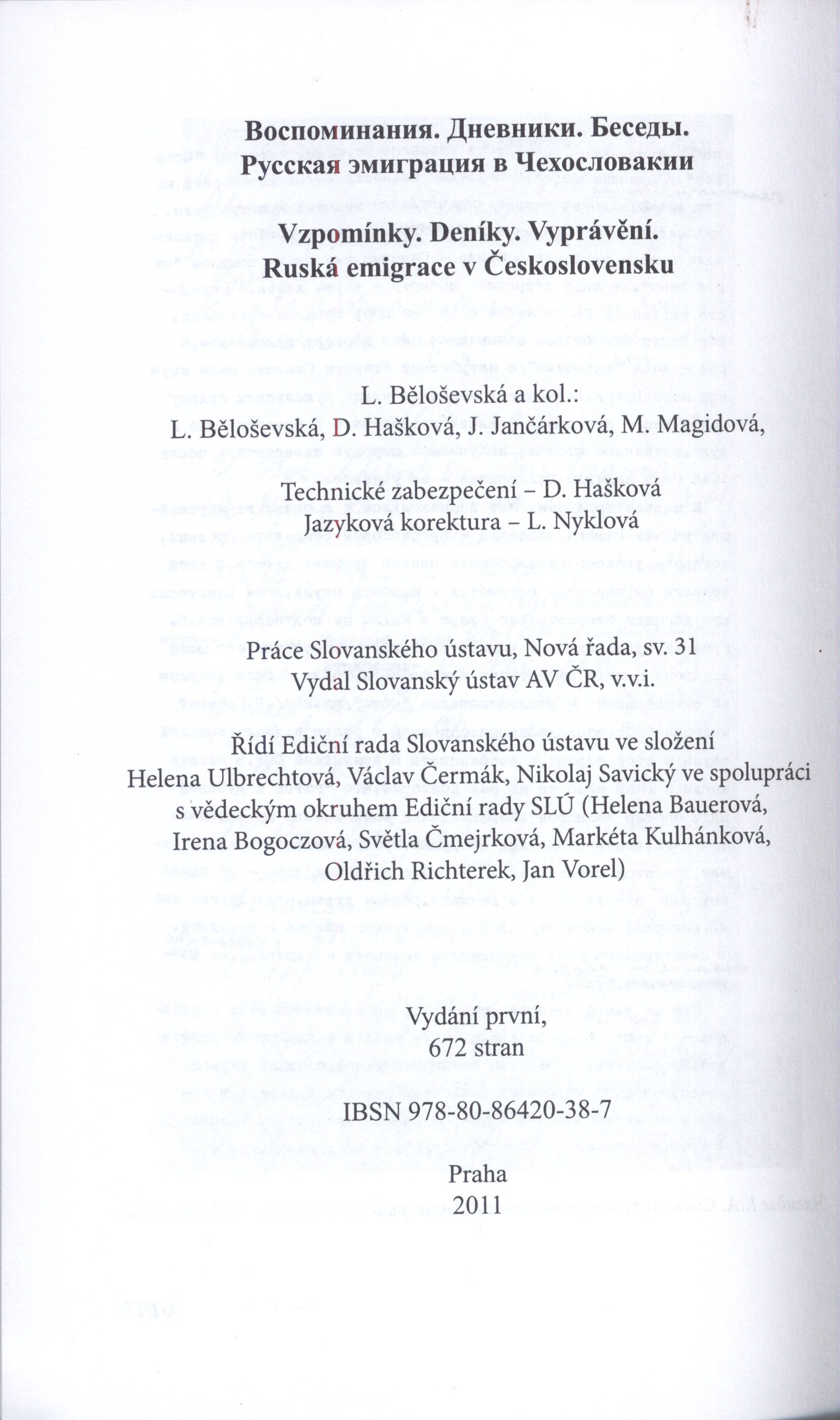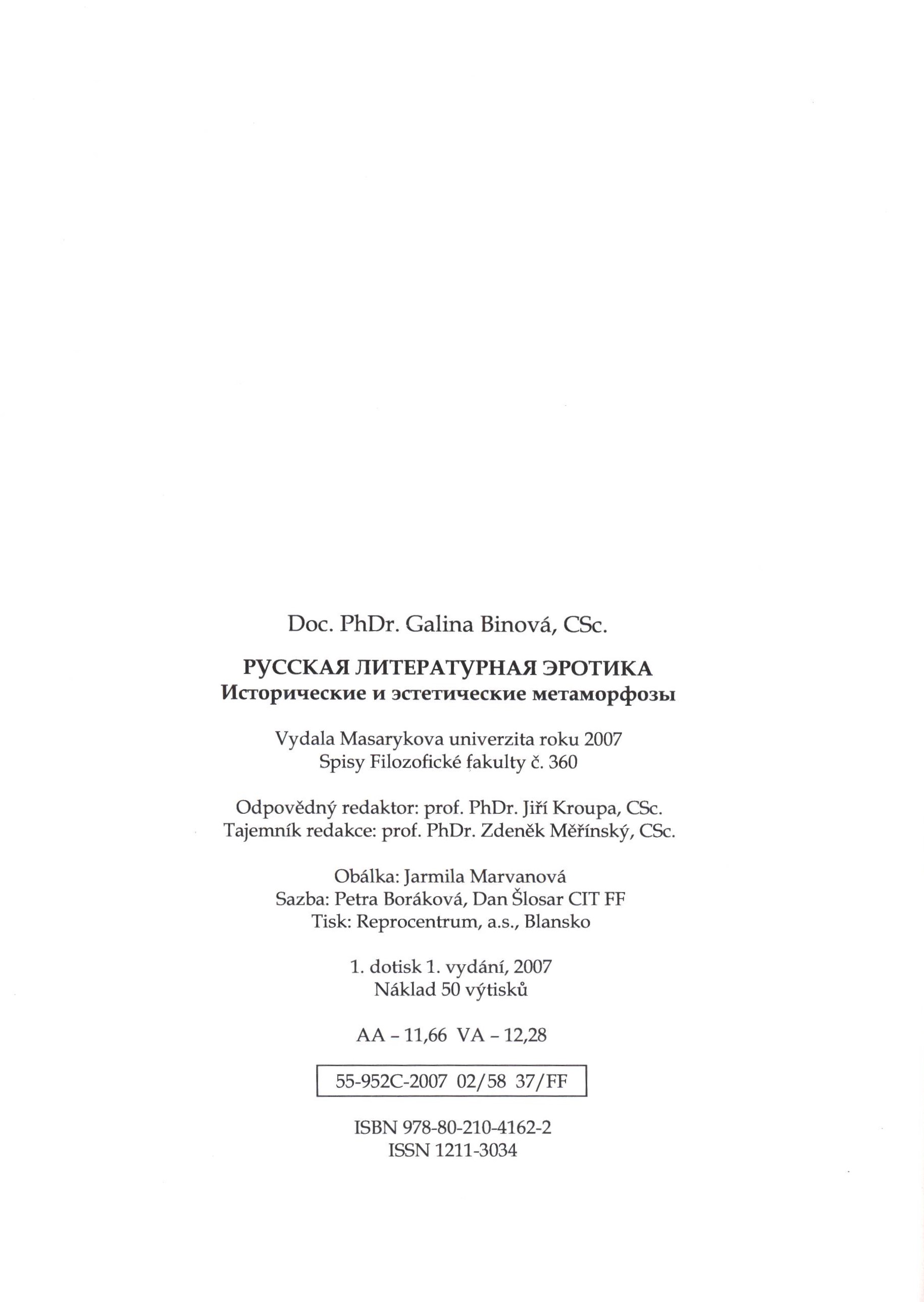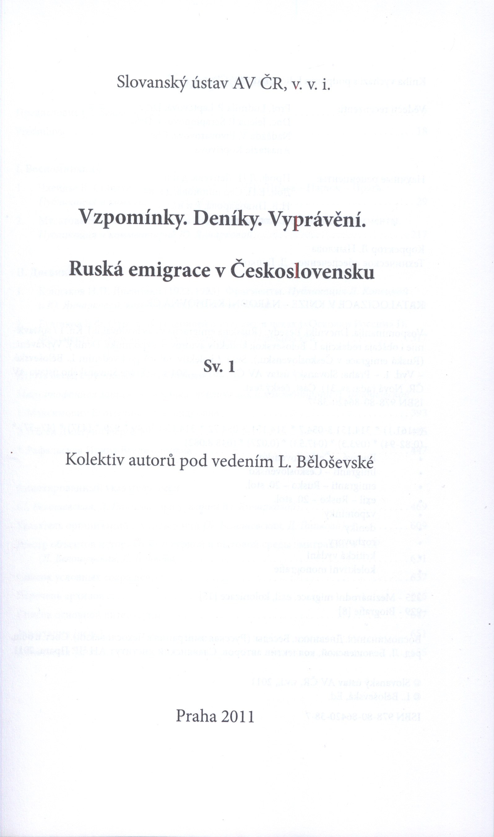 Názvové údaje Osobnosti emigrace z území Ruské říše v meziválečném Československu : biografický slovník / Dana Hašková, Anastazie Kopřivová, Ljubov Běloševská, Julie Jančárková, Sergej Gagen Osobní jméno Hašková, Dana, 1965- (Autor) Další autoři Kopřivová, Anastazie, 1936- (Autor) Běloševská, Ljubov, 1946-2013 (Autor) Jančárková, Julie, 1970- (Autor) Gagen, Sergej Jakovlevič (Autor) Korp. Academia (nakladatelství) (Nakladatel, vydavatel) Slovanský ústav (Akademie věd ČR) (Nakladatel, vydavatel) ART D - Grafický atelier Černý (Tiskař) Nakladatel Praha : Academia : Slovanský ústav AV ČR, v.v.i., 2023 Výrobce ART D - Grafický atelier Černý, s.r.o. Rozsah 750 stran : ilustrace, portréty, faksimile ; 25 cm Předmětová hesla political emigration - Russia - 1918-1939 * immigrants - Czechoslovakia - 1918-1939 Klíčová slova exil * emigrace * politická emigrace * ruská emigrace * imigrace * Československo * osobnosti kultury * biografický slovník * r. 1918-1939 Počet ex. 1, z toho volných 1 Druh dok. monografie Signatura PS 0001 Názvové údaje Russkaja literaturnaja erotika : istoričeskije i estetičeskije metamorfozy / Galina Binova Osobní jméno Binová, Galina Pavlovna, 1949- (Autor) Další autoři Masarykova univerzita (Brno, Česko) (Nakladatel, vydavatel) Tiskárna Reprocentrum (Tiskař) Nakladatel Brno : Masarykova univerzita, 2007 Výrobce Blansko : Reprocentrum, a.s. Rozsah 176 stran ; 24 cm Předmětová hesla 19th-20th centuries * erotic literature - Russia - 19th-20th centuries * aesthetics of literature - Russia - 19th-20th centuries * literary movements - Russia - 19th-20th centuries * literary criticism and history Klíčová slova odborná literatura * odborná studie * dějiny literatury * literární věda * interpretace literárního díla * estetika * erotická literatura * Rusko * ruská literatura * stol. 19.-20. Počet ex. 1, z toho volných 1 Adr. el. zdr. https://digilib.phil.muni.cz/handle/11222.digilib/103695 Druh dok. monografie Signatura LITc 0794 Názvové údaje Vospominanija, dnevniki, besedy : (russkaja emigracija v Čechoslovakii). Kn. 1 / sostavlenije i obščaja redakcija L. Beloševskoj ; kollektiv avtorov = Vzpomínky, deníky, vyprávění : (ruská emigrace v Československu). Sv. 1 / kolektiv autorů pod vedením L. Běloševské Další autoři Běloševská, Ljubov, 1946-2013 (Autor) Nakladatel Praga : Slovanský ústav AV ČR v.v.i., 2011 Rozsah 504 stran : ilustrace, portréty, faksimile ; 23 cm Předmětová hesla Rusové - Československo * imigranti - Československo * emigranti - Rusko - 20. stol. * exil - Rusko - 20. stol. * Russians - Czechoslovakia * immigrants - Czechoslovakia * emigrants - Russia - 20th century * exile - Russia - 20th century Klíčová slova emigrace * Rusko * emigranti * imigranti * Československo * meziválečné období * vzpomínky * deníky * vyprávění * kritické vydání * kolektivní monografie Počet ex. 2, z toho volných 2 Druh dok. monografie Signatura C12c 5008, C12c 5008a
