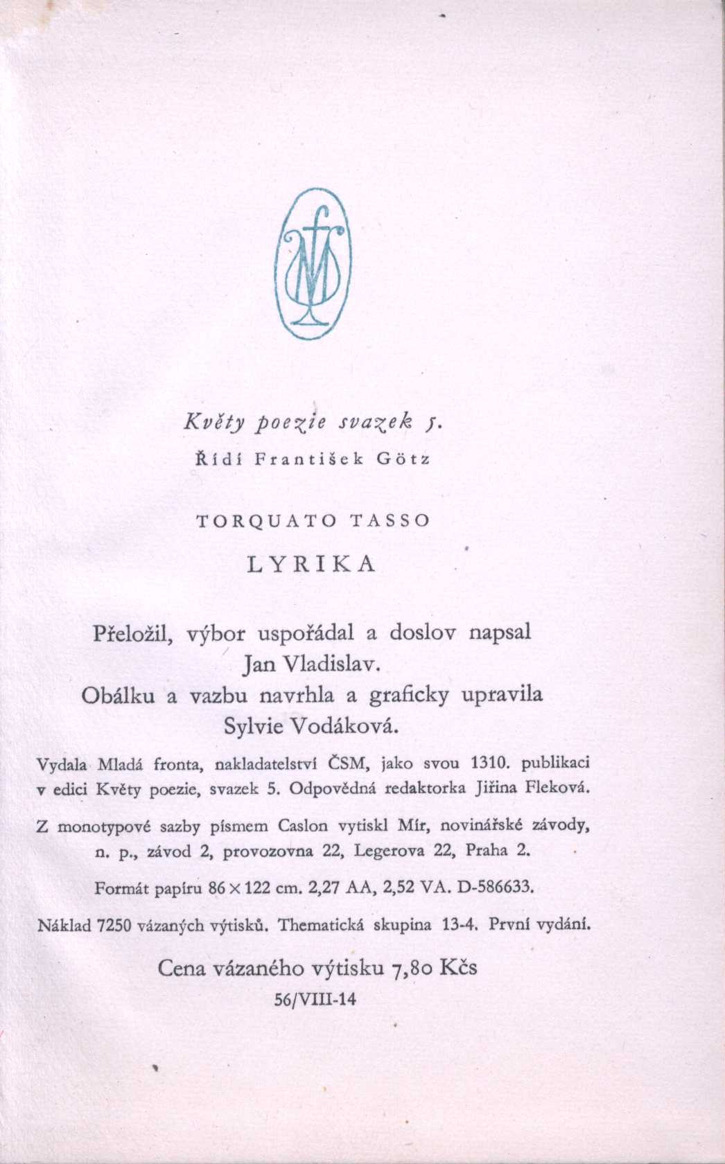 Názvové údaje Torquato Tasso : ein Schauspiel / von Goethe Osobní jméno Goethe, Johann Wolfgang von, 1749-1832 (Autor) Další autoři Rowohlt Verlag (nakladatelství) (Nakladatel, vydavatel) Offizin W. Drugulin (tiskárna) (Tiskař) Nakladatel In Leipzig : Ernst Rowohlt, 1910 Výrobce In Leipzig : In der Offizin W. Drugulin, 1910 Rozsah 123 stran Osobní hesla Tasso, Torquato, 1544-1595 - italský básník Klíčová slova německá literatura * německé divadlo * divadelní hra * divadelní hry * historická divadelní hra Počet ex. 1, z toho volných 1 Druh dok. monografie Signatura KaG III A 39 Názvové údaje Torquato Tasso : hra / J. W. Goethe ; přebásnil Bohuslav Mathesius ; s dramatickým úvodem Fr. Götze a s režijním doslovem K. Dostala ; v obálce Z. Sklenáře ; v redakci M. Hlávky Osobní jméno Goethe, Johann Wolfgang von, 1749-1832 (Autor) Další autoři Mathesius, Bohumil, 1888-1952 (Překladatel) (Dedikátor) Hellmuth-Brauner, Vladimír, 1910-1982 (Dedikant) (Dřívější majitel) Götz, František, 1894-1974 (Autor úvodu atd.) Dostal, Karel (Autor doslovu, tiráže atd.) Sklenář, Zdeněk, 1910-1986 (Autor obálky) Hlávka, Miloš, 1907-1945 (Editor) Korp. Českomoravský kompas (nakladatelství) (Nakladatel, vydavatel) (Tiskař) Nakladatel V Praze : Českomoravský kompas, 1942 Rozsah 134 stran, 6 nečíslovaných stran obrazové přílohy : ilustrace Osobní hesla Tasso, Torquato, 1544-1595 - italský básník Klíčová slova německá literatura * německé divadlo * divadelní hra * divadelní hry * historická divadelní hra Počet ex. 1, z toho volných 1 Druh dok. monografie Signatura VHB 3329 Názvové údaje Torquato Tasso : tragedie o čtyřech dějstvích / Jaroslav Maria Osobní jméno Maria, Jaroslav, 1870-1942 (Autor) Další autoři J. Otto (nakladatelství) (Nakladatel, vydavatel) Politika (tiskárna, nakladatelství) (Tiskař) Nakladatel V Praze : J. Otto, [1918] Výrobce (Tiskem "Politiky") Rozsah 81 s. Osobní hesla Tasso, Torquato, 1544-1595 - italský básník Klíčová slova česká literatura * české drama * divadelní hra * stol. 20., léta 20. Počet ex. 1, z toho volných 1 Druh dok. monografie Signatura KaG LXI 326 Názvové údaje Lyrika / Torquato Tasso ; přeložil [výbor uspořádal a doslov napsal] Jan Vladislav ; [obálku a vazbu navrhla a graficky upravila Sylvie Vodáková] Osobní jméno Tasso, Torquato, 1544-1595 (Autor) Další autoři Vladislav, Jan, 1923-2009 (Překladatel) (Sestavovatel, kompilátor) (Autor doslovu, tiráže atd.) Vodáková, Sylvie, 1926- (Autor obálky) (Výtvarník vazby) (Knižní grafik) Korp. Mladá fronta (nakladatelství) (Nakladatel, vydavatel) Mír, novinářské závody (tiskárna) (Tiskař) Nakladatel Praha : Mladá fronta, 1958 Výrobce Mír) Rozsah 125 s. Osobní hesla Tasso, Torquato, 1544-1595 - italský básník Klíčová slova italská literatura * lyrické básně * výbor básní Počet ex. 1, z toho volných 1 Druh dok. monografie Signatura JVladislav 232 Názvové údaje Dialoghi / di Torquato Tasso ; a cura di Alessandro Tortoreto Osobní jméno Tasso, Torquato, 1544-1595 (Autor) Další autoři Tortoreto, Alessandro (Editor) Korp. Bompiani (firma) (Nakladatel, vydavatel) Nakladatel Milano : Bompiani, 1945 Výrobce La Cromotipia E. Sormani Rozsah 256 stran ; 18 cm Osobní hesla Tasso, Torquato, 1544-1595 - italský básník Klíčová slova italská literatura * italští spisovatelé * stol. 16. * dialogy Počet ex. 1, z toho volných 1 Druh dok. monografie Signatura JVladislav 2373 Názvové údaje Dialoghi scelti / Torquato Tasso ; con gli argomenti del cavaliere Alessandro Mortara Osobní jméno Tasso, Torquato, (Autor) 1544-1595 Další autoři Mortara, Alessandro, (Autor komentáře textu) -1855 Korp. Casa musicale Sonzogno (Nakladatel, vydavatel) Stabilimento Grafico Matarelli (Tiskař) Nakladatel Milano : Casa editrice Sonzogno, 1928 Výrobce Stabilimento Grafico Matarelli Rozsah 349 stran ; 18 cm Osobní hesla Tasso, Torquato, 1544-1595 - italský básník Klíčová slova italská literatura * italští spisovatelé * dialogy * filozofie * krása * etika * italská poezie Počet ex. 1, z toho volných 1 Druh dok. monografie Signatura JVladislav 2372 Názvové údaje I grandi Italiani : Torquato Tasso Další autoři Casa musicale Sonzogno (Nakladatel, vydavatel) Stabilimento Grafico Matarelli (Tiskař) Nakladatel Milano : Casa editrice Sonzogno, 1927 Výrobce Alberto Matarelli Rozsah 63 stran ; 16 cm Osobní hesla Tasso, Torquato, 1544-1595 - italský básník Klíčová slova italská literatura * italští básníci * životopisné pojednání * stol. 16. Počet ex. 1, z toho volných 1 Druh dok. monografie Signatura JVladislav 2420 Názvové údaje Lettere autobiografiche / Torquato Tasso ; a cura di Alessandro Tortoreto Osobní jméno Tasso, Torquato, 1544-1595 (Autor) Další autoři Tortoreto, Alessandro (Editor) (Dedikátor) Vladislav, Jan, 1923-2009 (Dedikant) Korp. Carlo Signorelli (firma) (Nakladatel, vydavatel) Nakladatel Milano : Carlo Signorelli editore, 1934 Rozsah 104 stran ; 15 cm Osobní hesla Tasso, Torquato, 1544-1595 - italský básník Klíčová slova autobiografie * autobiografický text * dopisy * italská literatura * italští básníci * stol. 16. Počet ex. 1, z toho volných 1 Druh dok. monografie Signatura JVladislav 2421 Názvové údaje Literární listy : časopis věnovaný zájmům literárním Další autoři Dlouhý, František, 1852-1912 (Editor) Korp. J. F. Šašek (Velké Meziříčí, Česko) (Nakladatel, vydavatel) Roč., číslo ročník 13, číslo 1-24, 1891/1892 Nakladatel Ve Velkém Meziříčí : Tiskem a nákladem J. F. Šaška, 1891-1892 Rozsah 422 s., [4] s. obsahu ročníku Osobní hesla Tennyson, Alfred Tennyson, Baron, 1809-1892 - anglický básník * Whitman, Walt, 1819-1892 - americký básník a novinář * Komenský, Jan Amos, 1592-1670 - pedagog, českobratrský teolog * Tasso, Torquato, 1544-1595 -