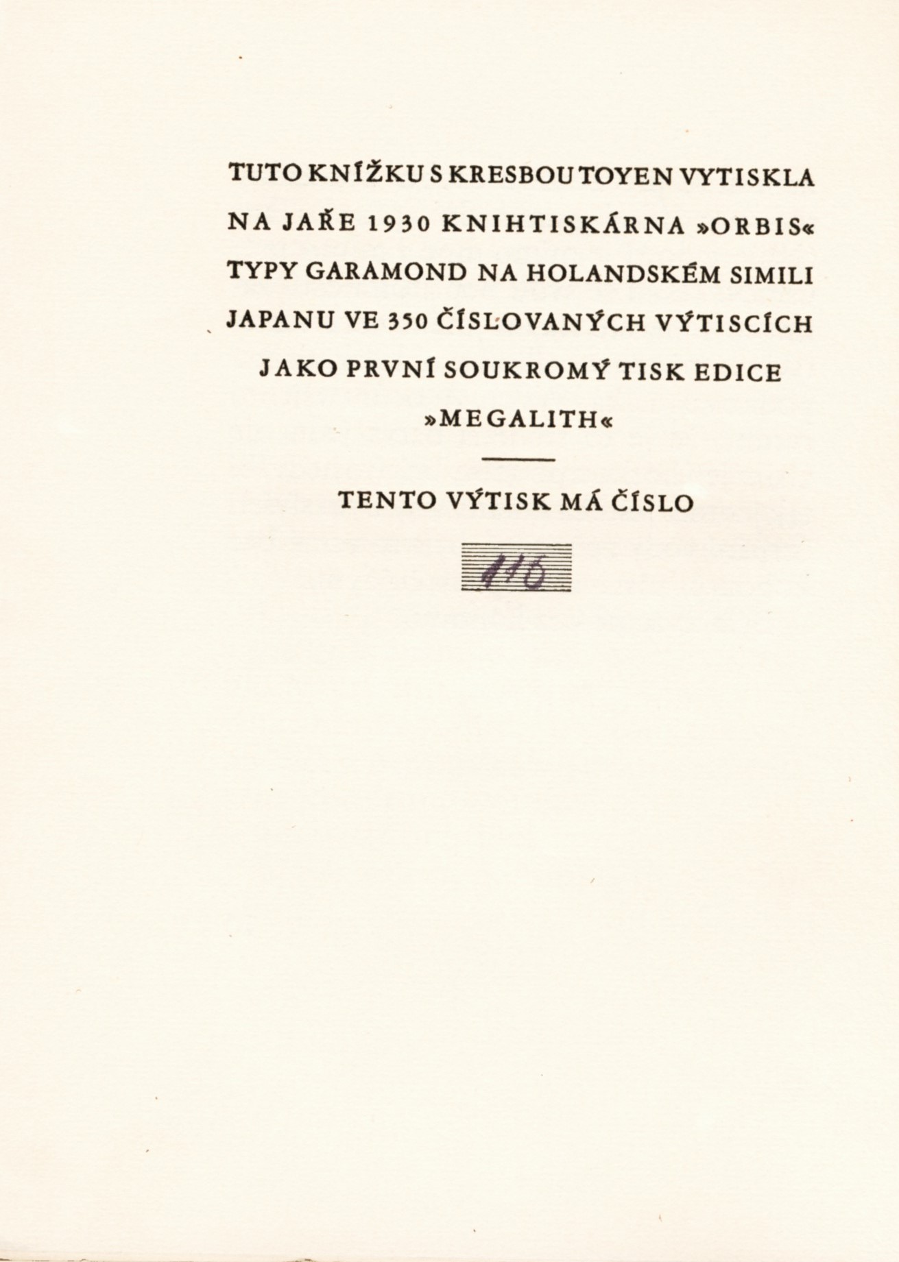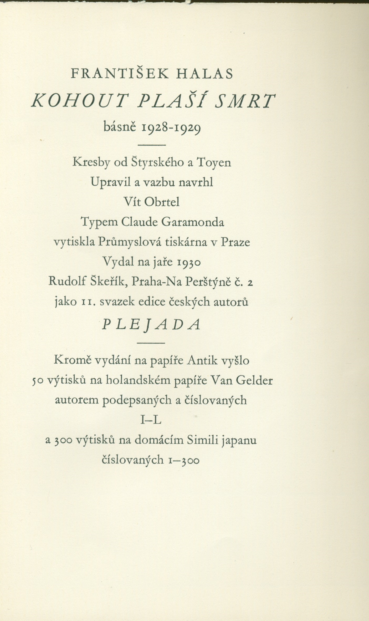 Názvové údaje Básně / Guillaume Apollinaire ; souborné vydání českých překladů Karla Čapka, Jindřicha Hořejšího, Zdeňka Kalisty a Jaroslava Seiferta Osobní jméno Apollinaire, Guillaume, 1880-1918 (Autor) Další autoři Čapek, Karel, 1890-1938 (Překladatel) Hořejší, Jindřich, 1886-1941 (Překladatel) (Dedikátor) (Autor podpisu) Kalista, Zdeněk, 1900-1982 (Překladatel) Seifert, Jaroslav, 1901-1986 (Překladatel) Teige, Karel, 1900-1951 (Autor úvodu atd.) Toyen, 1902-1980 (Knižní grafik) (Ilustrátor) (Autor podpisu) Hořejší, Růžena, 1899- (Dedikant) Korp. Ústřední dělnické nakladatelství a knihkupectví (Nakladatel, vydavatel) Svoboda (Kladno) (Tiskař) (Tiskař obrazu) Nakladatel V Praze : Ústřední dělnické knihkupectví a nakladatelství, 1935 Výrobce V Kladně : tiskárna "Svobody" Rozsah 4 nečíslované strany, 97 stran : ilustrace ; 21 cm Osobní hesla Apollinaire, Guillaume, 1880-1918 - francouzský básník Klíčová slova Čapek K. * francouzská literatura * poezie * Apollinaire G. * básně * české překlady * Hořejší J. * Kalista Z. * Seifert J. * frontispis * Toyen * r. 1935 Počet ex. 2, z toho volných 2 Druh dok. monografie Signatura VZinková 0425, AHO 0341 Názvové údaje Cesta do neznáma / Maurice Baring ; Úprava titul. listu, obálky a vazby od Toyen ; Přeložili J. Čep a T. Vodička Osobní jméno Baring, Maurice, 1874-1945 (Autor) Další autoři Toyen, 1902-1980 Čep, Jan, 1902-1974 (Překladatel) Vodička, Timotheus, 1910-1967 (Překladatel) Nakladatel Praha : R. Škeřík, 1936 Rozsah 473 s. : il Osobní hesla Toyen, 1902-1980 - malířka, grafička, ilustrátorka * Toyen, 1902-1980 - malířka, grafička, ilustrátorka Klíčová slova anglická literatura * próza * román * stol. 19. Počet ex. 1, z toho volných 1 Druh dok. monografie Signatura C12b 398 Názvové údaje Zločin / Georges Bernanos ; Přeložil Jan Čep ; Úpravu knihy, kresby a vazbu navrhla Toyen Osobní jméno Bernanos, Georges, 1888-1948 (Autor) Další autoři Čep, Jan, 1902-1974 (Překladatel) Toyen, 1902-1980 Nakladatel Praha : R. Škeřík a spol., 1937 Rozsah 267 s. : il Osobní hesla Toyen, 1902-1980 - malířka, grafička, ilustrátorka * Toyen, 1902-1980 - malířka, grafička, ilustrátorka Klíčová slova francouzská literatura * próza * román * stol. 20., 1. pol. Počet ex. 1, z toho volných 1 Druh dok. monografie Signatura C12b 384 Názvové údaje Stop Roma : Z deníku šestnáctileté / Alena Bernášková ; Obálku navrhl a typogr. upr. Oldřich Hlavsa ; Kresba na obálce Toyen Osobní jméno Bernášková, Alena, 1920-2007 (Autor) Další autoři Hlavsa, Oldřich, 1909-1995 (Grafický technik) Toyen, 1902-1980 (Ilustrátor) Nakladatel Praha : Československý spisovatel, 1967 Rozsah 93 s. Osobní hesla Bernášková, Alena, 1920-2007 - čes. prozaička, novinářka * Toyen, 1902-1980 - malířka, grafička, ilustrátorka * Toyen, 1902-1980 - malířka, grafička, ilustrátorka Klíčová slova česká literatura * próza * novela Počet ex. 2, z toho volných 2 Druh dok. monografie Signatura AČS 03105, AČS 03105a Názvové údaje Knihy s Toyen / Lenka Bydžovská & Karel Srp ; [soupis knižního díla Toyen zprac. Petr Ladman ; obálka a graf. úpr. Luboš Drtina] Osobní jméno Bydžovská, Lenka, 1956- (Autor) Další autoři Srp, Karel, 1958- (Autor) Ladman, Petr, 1954- (Sestavovatel, kompilátor) Drtina, Luboš, 1963- (Autor obálky) (Grafický technik) Nakladatel Praha : Akropolis, 2003 Výrobce (Trico, spol. s.r.o.) Rozsah 118 s. : il. Osobní hesla Toyen, 1902-1980 - malířka, grafička, ilustrátorka Klíčová slova knižní umění surrealismus (umění) Česko Francie stol. 20 malířky monografie Počet ex. 3, z toho volných 3 Druh dok. monografie Signatura US 0022, NK /03 13, NK /03 13a Názvové údaje Dávno = (Nekoga) / Dora Gabe ; přeložil Vítězslav Nezval ; ilustrovala Toyen Osobní jméno Gabe, Dora, 1888-1983 (Autor) (Dedikátor) Další autoři Toyen, 1902-1980 (Ilustrátor) Nezval, Vítězslav, 1900-1958 (Překladatel) Korp. Dědictví Komenského (vydavatelství) (Nakladatel, vydavatel) Pokrok (nakladatelství) (Tiskař obrazu) (Tiskař) Nakladatel V Praze : nákladem Dědictví Komenského, 1938 Výrobce V Praze : Pokrok Rozsah 52 stran, 1 nečíslovaný list obrazové přílohy : ilustrace ; 22 cm Klíčová slova bulharská literatura * próza * Gabe D. * vzpomínková próza * lyrická próza * český překlad * Nezval V. * ilustrace * Toyen * r. 1938 Počet ex. 5, z toho volných 5 Druh dok. monografie Signatura VZinková 0625, P 70 C 19, P 63 D 36, Václavek 0966, Nezval 1811 Názvové údaje Kohout plaší smrt : básně 1928-1929 / František Halas Osobní jméno Halas, František, 1901-1949 (Autor) (Dedikátor) (Autor podpisu) Další autoři Štyrský, Jindřich, 1899-1942 (Ilustrátor) Toyen, 1902-1980 (Ilustrátor) Obrtel, Vít, 1901-1988 (Knižní grafik) (Výtvarník vazby) Hořejší, Jindřich, 1886-1941 (Dedikant) Korp. Rudolf Škeřík (nakladatelství) (Nakladatel, vydavatel) Průmyslová tiskárna v Praze (Tiskař) (Tiskař obrazu) Nakladatel Praha : Plejada, Rudolf Škeřík, 1930 Výrobce V Praze : Průmyslová tiskárna Rozsah 55 stran : ilustrace ; 21 cm Klíčová slova česká literatura * poezie * sbírka básní * česká poezie * Halas F. * ilustrace * Štyrský J. * Toyen * r. 1930 Počet ex. 15, z toho volných 15 Druh dok. monografie Signatura N/A, P 33 f 12, M 200 e 92, P 66 e 57, ZA 1 d 51, Václavek 988, Nezval 1125, Nezval 114, ZA 3 e 50, P 120 f 31, N/A, P 58 d 39, M 174 f 43, C12b 14540, AHO 0352 Názvové údaje Dvojí stín / Karel Konrád Osobní jméno Konrád, Karel, 1899-1971 (Autor) (Dedikátor) (Autor podpisu) Další autoři Toyen, 1902-1980 (Ilustrátor) Slabý, Zdeněk Karel, 1930-2020 (Dedikátor) Korp. Orbis (tiskárna) (Tiskař) Nakladatel Praha : [vydavatel není známý], 1930 Výrobce [Praha] : knihtiskárna Orbis Rozsah 15 s