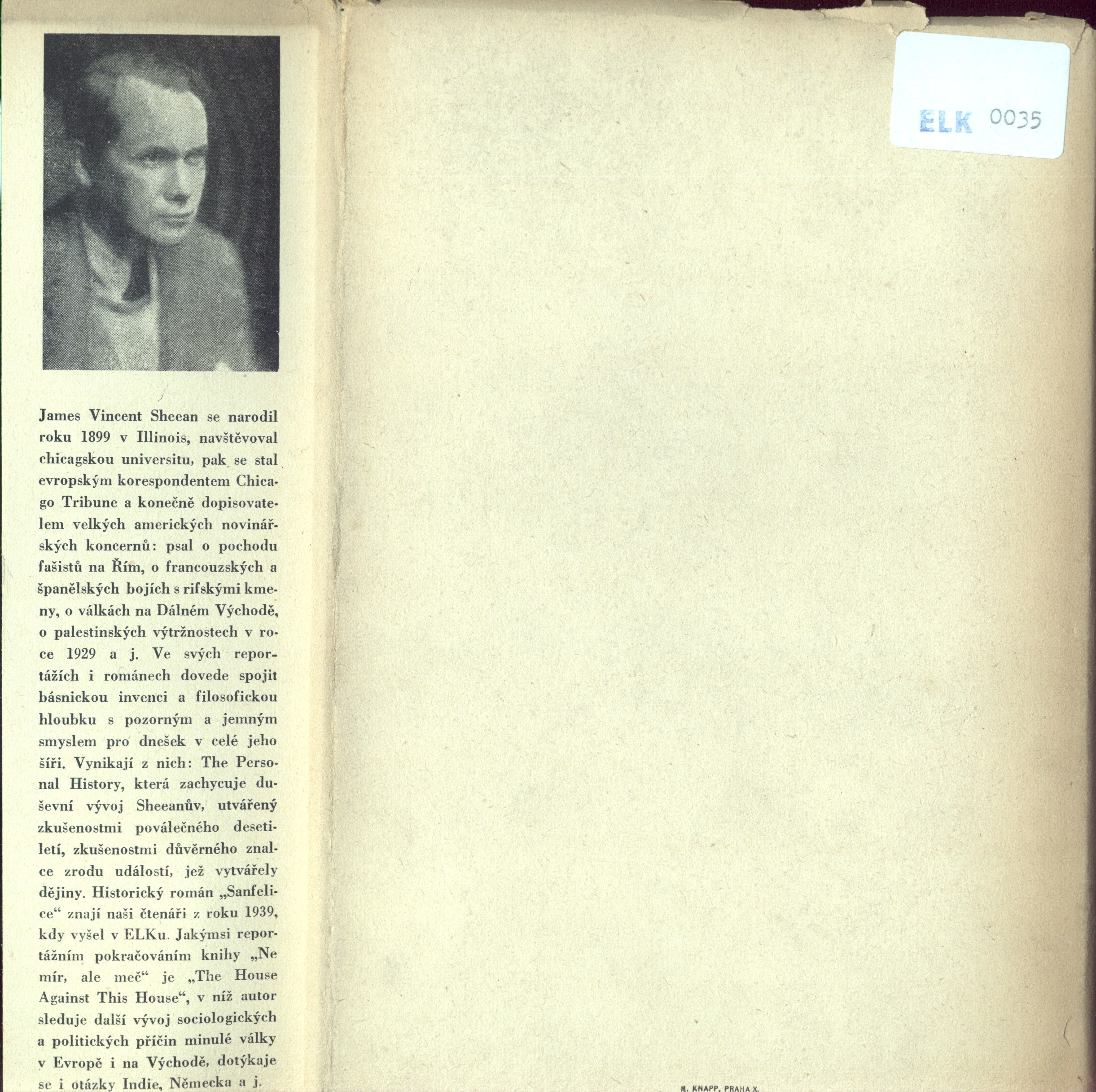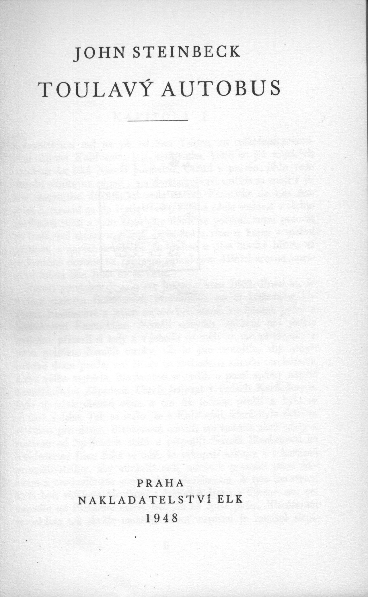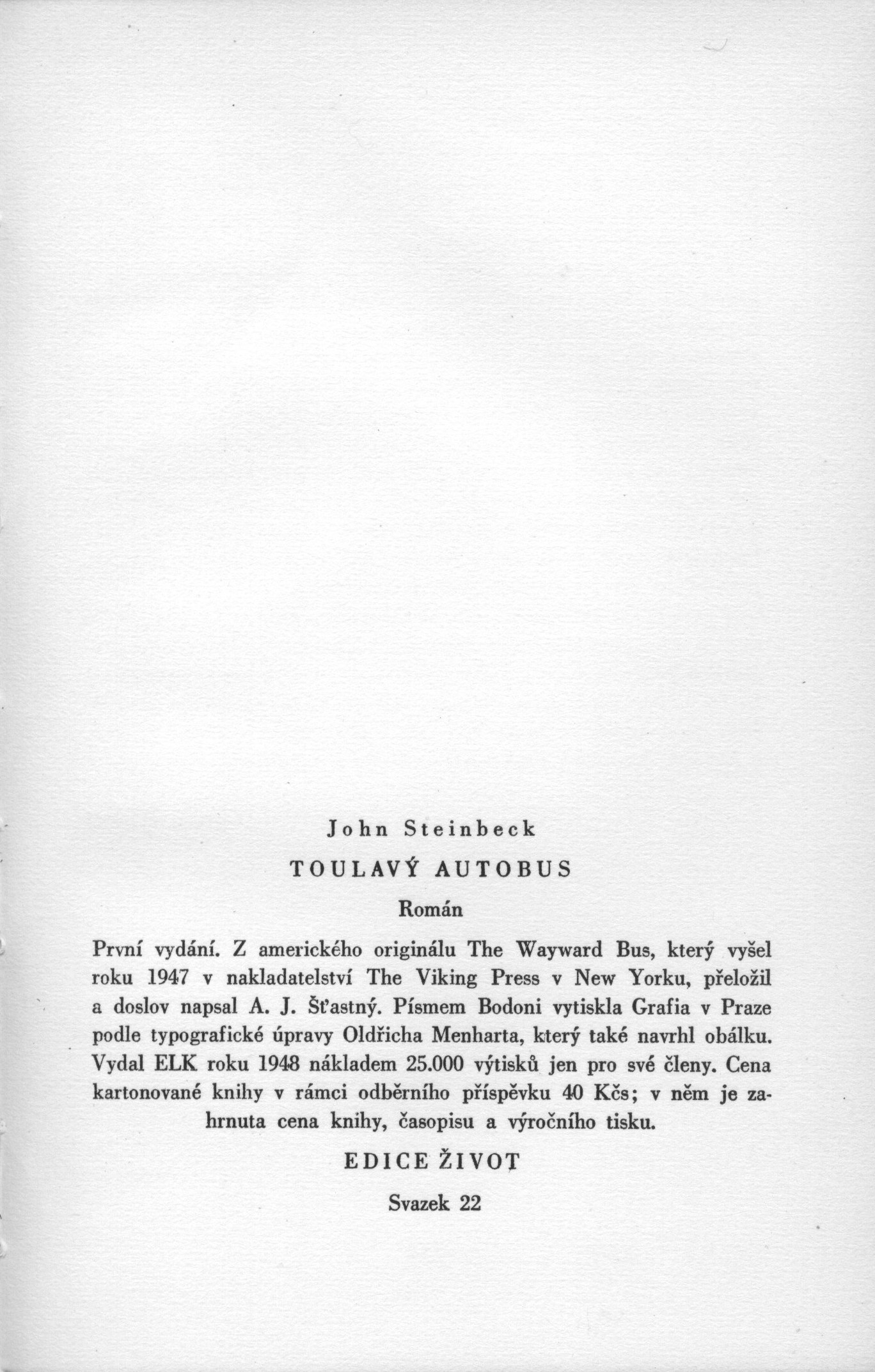 Názvové údaje Teplouš / William Burroughs ; Dopisy o Yage / William Burroughs, Allen Ginsberg ; přeložil [a doslov napsal] Josef Rauvolf ; [obálku navrhl Aleš Najbrt] Osobní jméno Burroughs, William S. (William Seward) 1914-1997 (Autor) Další autoři Ginsberg, Allen, 1926-1997 (Autor) Rauvolf, Josef, 1953- (Překladatel) (Autor doslovu, tiráže atd.) Najbrt, Aleš, 1962- (Autor obálky) Korp. X-Egem (nakladatelství) (Nakladatel, vydavatel) Nakladatel Praha : X-Egem, 1991 Rozsah 94 s. : il. Osobní hesla Burroughs, William S. (William Seward) 1914-1997 - americký spisovatel, esejista a sociální kritik * Ginsberg, Allen, 1926-1997 - americký básník Klíčová slova americká próza * americké romány * autobiografické romány * drogově závislí * homosexuálové * Spojené státy americké * stol. 20. Počet ex. 1, z toho volných 1 Druh dok. monografie Signatura C12c 4495 Názvové údaje Ne mír - ale meč / Vincent Sheean ; [z amerického originálu ... přeložil Vladimír Vendyš ; podle typografické osnovy Josefa Kaplického, který navrhl také obálku] Osobní jméno Sheean, Vincent, 1899-1975 (Autor) Další autoři Vendyš, Vladimír, 1896-1961 (Překladatel) Kaplický, Josef, 1899-1962 (Typograf) (Autor obálky) Šťastný, Alois Josef, 1901-1979 (Autor úvodu atd.) Korp. Evropský literární klub (nakladatelství) (Nakladatel, vydavatel) Jiří Jelen (tiskárna) (Tiskař) Nakladatel V Praze : Nakladatelství ELK, 1946 Výrobce Jiří Jelen) Rozsah 308 s. ; 21 cm Osobní hesla Sheean, Vincent, 1899-1975 - americký reportér, spisovatel Klíčová slova americká literatura * próza * překlad * román * autobiografické prvky * Evropa * evropské dění * r. 1938-1939 Počet ex. 2, z toho volných 2 Druh dok. monografie Signatura ELK 0035, ELK 0246 Názvové údaje Toulavý autobus : [román] / John Steinbeck ; [z amerického originálu ... přeložil a doslov napsal A. J. Šťastný ; [tisk] podle typografické úpravy Oldřicha Menharta, který také navrhl obálku] Osobní jméno Steinbeck, John, 1902-1968 (Autor) Další autoři Šťastný, Alois Josef, 1901-1979 (Překladatel) (Autor doslovu, tiráže atd.) Menhart, Oldřich, 1897-1962 (Typograf) (Autor obálky) Korp. Evropský literární klub (nakladatelství) (Nakladatel, vydavatel) Grafia (tiskárna, nakladatelství) (Tiskař) Nakladatel Praha : nakladatelství ELK, 1948 Výrobce (Grafia) Rozsah 244 s. ; 19 cm Osobní hesla Steinbeck, John, 1902-1968 - americký spisovatel Klíčová slova americká literatura * americká próza * psychologický román Počet ex. 2, z toho volných 2 Druh dok. monografie Signatura ELK 0074, ELK 0074a