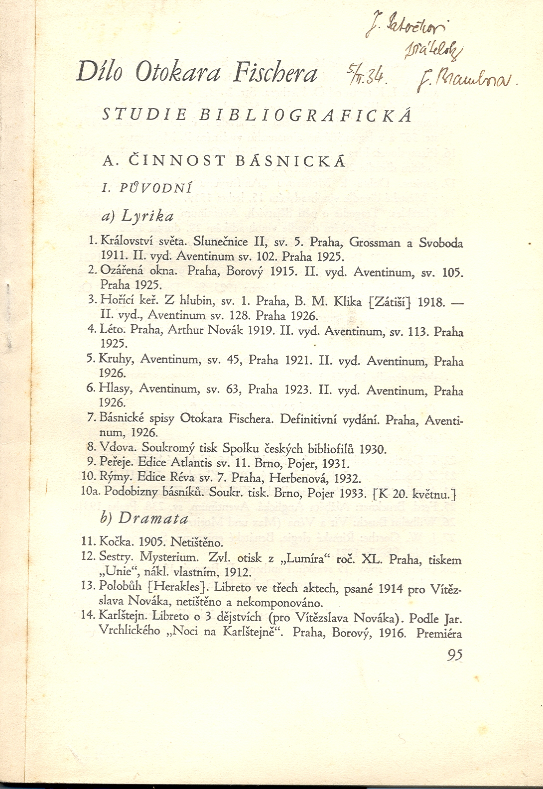 Názvové údaje Bibliografie života a díla Jana Nerudy / Josef Brambora ; dvěma dřevoryty doprovodil František Kobliha ; typograficky upravil Rudolf Hála Osobní jméno Brambora, Josef, 1904-1980 (Autor) (Dedikátor) Další autoři Kobliha, František, 1877-1962 (Ilustrátor) Hála, Rudolf, 1892-1968 (Knižní grafik) Patočka, Jan, 1907-1977 (Dedikant) Korp. Orbis (tiskárna) (Tiskař) Nakladatel Praha : Orbis, 1942 Výrobce Knihtiskárna Orbis Rozsah 15 stran : ilustrace ; 27 cm Osobní hesla Neruda, Jan, 1834-1891 - novinář, básník, prozaik, překladatel Klíčová slova čeští spisovatelé * čeští básníci * česká literatura * život a dílo * autorská bibliografie Počet ex. 2, z toho volných 2 Druh dok. separáty Signatura C12c 1768, Patočka 0127 Názvové údaje Dílo Otokara Fischera : studie bibliografická / Josef Brambora Osobní jméno Brambora, Josef, 1904-1980 (Autor) (Autor doslovu, tiráže atd.) (Dedikátor) Další autoři Patočka, Jan, 1907-1977 (Dedikant) Nakladatel [Česko] : [nakladatel není známý], [1933] Rozsah Strany 95-131 Osobní hesla Fischer, Otokar, 1883-1938 - germanista, literární historik, básník, překladatel Klíčová slova germanisté * Česko * stol. 19.-20. * autorská bibliografie Počet ex. 1, z toho volných 1 Druh dok. separáty Signatura Patočka 0131 Názvové údaje Autorenbegegnungen mit Kindern und Jugendlichen : Verzeichnis der Autorinnen und Autoren / des Bundesverbandes der Friedrich-Bödecker-Kreise e.V. ; [Redaktion Hans Bödecker ... et al.] Záhlaví-korpor. Bundesverband der Friedrich-Bödecker-Kreise (Nakladatel, vydavatel) Další autoři Bödecker, Hans (Editor) Nakladatel Hannover : Bundesverband der Friedrich-Bödecker-Kreise, 2003 Rozsah 320 s. : il. Klíčová slova němečtí spisovatelé * spisovatelé pro děti * spisovatelé pro mládež * stručné biografie * autorská bibliografie * nakladatelství * adresáře * přehledy Počet ex. 1, z toho volných 1 Druh dok. monografie Signatura C12b 11470 Názvové údaje La bibliographie d'Edouard Beneš / par Boris Jakovenko Osobní jméno Jakovenko, Boris Valentinovič, 1884-1949 (Autor) Další autoři Blahoslav (tiskárna) (Tiskař) Nakladatel Prague : [nakladatel není známý], 1936 Výrobce Imprimé chéz "Blahoslav" Rozsah viii, 123, xii stran ; 25 cm Osobní hesla Beneš, Edvard, 1884-1948 - sociolog, politik, prezident Klíčová slova autorská bibliografie * politika Počet ex. 1, z toho volných 1 Druh dok. monografie Signatura Patočka 0123 Názvové údaje Bibliografie : 1975-2000 / Oldřich Kašpar Osobní jméno Kašpar, Oldřich, 1952- (Autor) Nakladatel B.m. : b.n., b.r Rozsah 43 s. Osobní hesla Kašpar, Oldřich, 1952- - hispanista - iberoamerikanista, etnolog, překladatel, spisovatel, historik Klíčová slova česká literatura * autorská bibliografie * Kašpar O. Počet ex. 1, z toho volných 1 Druh dok. monografie Signatura C12a 1903 Názvové údaje Buďte blaženi / Josef Štefan Kubín ; [úvodní studie a bibliografické přehledy Josef Rodr ; obálka Jiří Balcar ; portrét J. Š. Kubína od Jiřího Kodyma] Osobní jméno Kubín, Josef Štefan, 1864-1965 (Autor) Další autoři Rodr, Josef, 1927-2007 (Sestavovatel, kompilátor) Balcar, Jiří, 1929-1968 (Autor obálky) Kodym, Jiří, 1927-2009 (Ilustrátor) Nakladatel Hradec Králové : Nakladatelství Krajského domu osvěty, 1960 Rozsah 68 s. : il Osobní hesla Kubín, Josef Štefan, 1864-1965 - prozaik, básník a folklorista Klíčová slova česká literatura * próza * povídky * autorská bibliografie * Kubín J. Š. * r. 1960 Počet ex. 2, z toho volných 2 Druh dok. monografie Signatura MUK 482, LK P 44 b 70 Názvové údaje Slavista Jiří Polívka v kontexte literatúry a folklóru. I-II : pripravené pri príležitosti 14. medzinárodného zjazdu slavistov v Ochride a venované PhDr. Viere Gašparíkovej, DrSc., k jej životnému jubileu / Hana Hlôšková, Anna Zelenková (editorky) Záhlaví-akce Medzinárodný zjazd slavistov (14._: 2008 : Ochrid) Další autoři Zelenková, Anna, 1964- (Editor) Nakladatel Bratislava : Katedra etnológie a kultúrnej antropológie FF UK : Slavistický ústav Jána Stanislava SAV : Ústav etnológie SAV ; Brno : Česká asociace slavistů : Slavistická společnost Franka Wollmana v Brně, 2008 Rozsah 248 s. + 1 příl. Osobní hesla Polívka, Jiří, 1858-1933 - filolog Klíčová slova slavisté * Česko * stol. 19., 2. pol.-stol. 20., léta 30. * život a dílo * literárněvědné studie * autorská bibliografie * mezinárodní literární konference * sborník studií Počet ex. 1, z toho volných 1 Druh dok. monografie Signatura C12b 11486 Názvové údaje Co ještě zbývá / uspořádal Miloslav Novotný ; upravil V.H. Brunner Osobní jméno Němcová, Božena, 1820-1862 (Autor) Další autoři Novotný, Miloslav, 1894-1966 (Editor) Brunner, Vratislav Hugo, 1886-1928 (Knižní grafik) Korp. Kvasnička a Hampl (nakladatelství) (Nakladatel, vydavatel) Politika (tiskárna, nakladatelství) (Tiskař) Nakladatel V Praze : Nakladatelé Kvasnička a Hampl, 1930 Výrobce [Praha] : Tiskem Politiky Rozsah 289 stran : ilustrace ; 17,5 cm Klíčová slova česká literatura * souborné dílo * česká próza * povídky * korespondence * česká poezie * básně * časopisecké články * folklor * pohádky * hry * autorská bibliografie * Čechy a Morava * Slovensko * slovanské země * Francie Počet ex. 2, z toho volných 2 Druh dok. monografie Signatura VMartínek 1508, P 79 E 57
