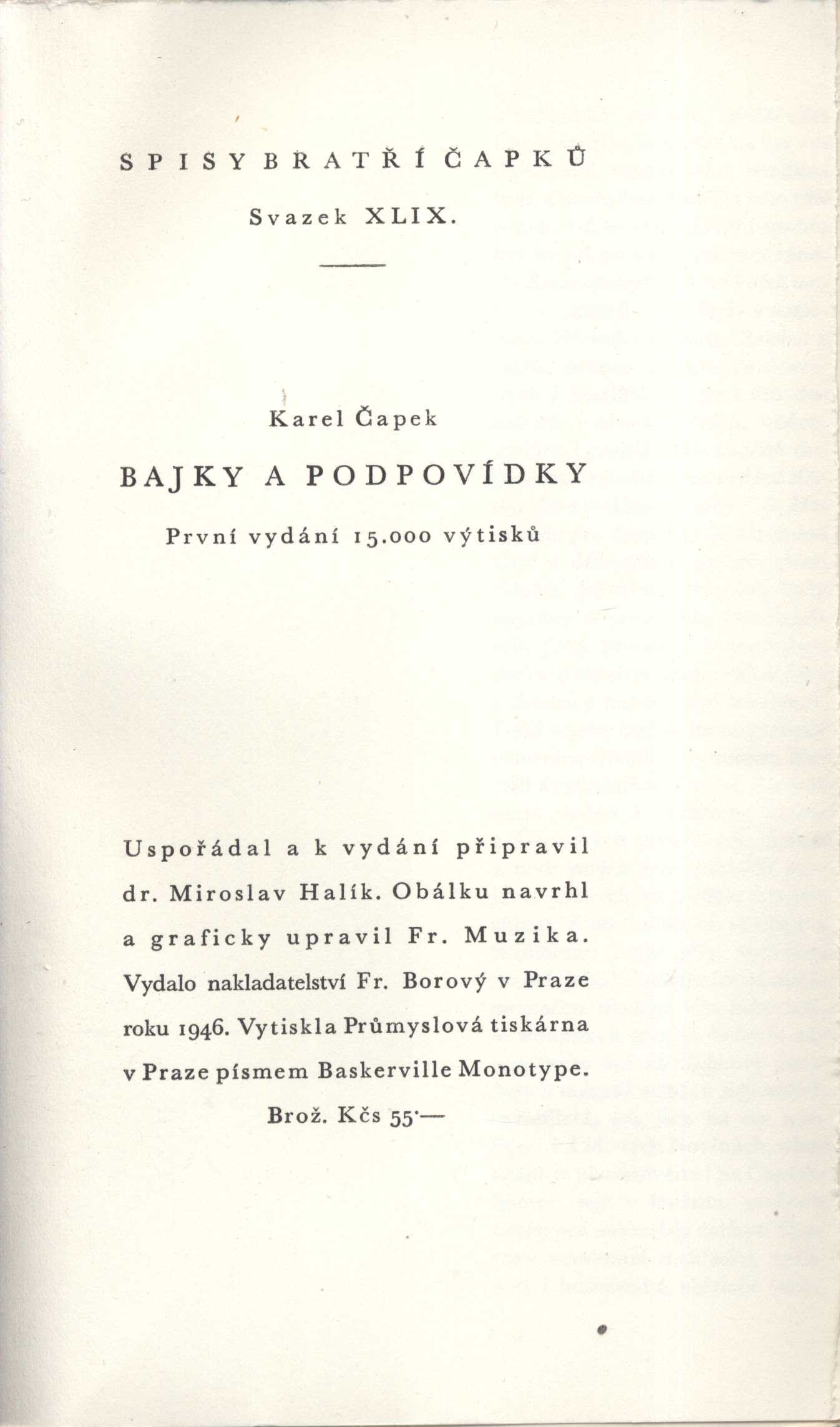 Názvové údaje Polska bajka ezopowa / Janina Abramowska ; redaktor techniczny Józef Madry Osobní jméno Abramowska, Janina, 1933- (Autor) Další autoři Madry, Józef (Editor) Nakladatel Poznan : Wydawnicto Naukowe UAM, 1991 Rozsah 282 s. Klíčová slova filologie * literární věda * bajky * rozbor * interpretace * Polsko * polské bajky * Ezopovy bajky Počet ex. 1, z toho volných 1 Druh dok. monografie Signatura M 217 c 13 Názvové údaje Hlasy v trávě / Rachil Baumvolová ; [ilustrovala Libuše Loskotová ; z ruského původního vydání ... vybrala a přeložila Milena Lukešová] Osobní jméno Baumvol', Rachil' L'vovna (Autor) Další autoři Lukešová, Milena, 1922-2008 (Překladatel) Loskotová, Libuše, 1931- (Ilustrátor) Nakladatel Praha : Státní nakladatelství dětské knihy, 1965 Výrobce Severografia) Rozsah [88] s. : il. ; příč. 8° Klíčová slova ruská próza * literatura pro děti * vyprávění pro nejmenší * bajky Počet ex. 1, z toho volných 1 Druh dok. monografie Signatura Holan 02778 Názvové údaje Známé tváře : satirické verše, bajky, feuilletony a epigramy / Děmjan Bědnyj ; přel. [a charakteristiku aut. tvorby naps.] Zikmund Skyba ; [obálka Antonína Pelce] Osobní jméno Bednyj, Dem'jan, 1883-1945 (Autor) Další autoři Skyba, Zikmund, 1909-1957 (Překladatel) (Autor komentáře textu) Pelc, Antonín, 1895-1967 (Autor obálky) Korp. Melantrich (nakladatelství) (Nakladatel, vydavatel) Nakladatel Praha : Melantrich, 1952 Rozsah 145 s. : il. Osobní hesla Bednyj, Dem'jan, 1883-1945 - ruský básník Klíčová slova ruská literatura * ruská poezie * bajky * satiry * epigramy Počet ex. 1, z toho volných 1 Druh dok. monografie Signatura MEL 0099 Názvové údaje Bájky Bidpajovy téměř do wšech jazykůw dáwno již přeložené. Svazek I.- II. / po česku wzdělané od Františka Třebovského [i.e. František Matouš Klácel] Autor Bidpaj (Autor) Další autoři Klácel, František Matouš, 1808-1882 (Sestavovatel, kompilátor) Korp. Ed. Hölzel (nakladatelství) (Nakladatel, vydavatel) Nakladatel W Brně ; W Holomouci : Mor. Národní Jednota sv. Cyrilla a Methoda : W komissi knihkupectví Bušaka a Irrganga : Eduard Hölzl, 1850 Rozsah 115, [1]; [2], 142 s. Klíčová slova česká literatura * bajky * beletrie Počet ex. 1, z toho volných 1 Druh dok. monografie Signatura L IV f 40 Názvové údaje Bájky Bidpajovy téměř do wšech jazykůw dáwno již přeložené. Swazek I. / po česku wzdělané od Františka Třebovského [i.e. František Matouš Klácel] Autor Bidpaj (Autor) Další autoři Klácel, František Matouš, 1808-1882 (Překladatel) Korp. Ed. Hölzel (nakladatelství) (Nakladatel, vydavatel) Nakladatel W Holomouci : Eduarda Hölzl, 1846 Rozsah 115, [1] s. Klíčová slova česká literatura * beletrie * bajky Počet ex. 1, z toho volných 1 Druh dok. monografie Signatura L VI e 85 Názvové údaje Bájky Bidpajovy téměř do wšech jazykůw dáwno již přeložené. Swazek II. / Bidpaj ; po česku wzdělané od Františka Třebovského [i.e. František Matouš Klácel] Autor Bidpaj (Autor) Další autoři Klácel, František Matouš, 1808-1882 (Překladatel) Korp. Národní jednota moravská sv. Cyrila a Metoděje (spolek) (Nakladatel, vydavatel) Nakladatel W Brně : w kommissi knihkupectwí Bušaka a Irrganga : wydala Mor. Národní Jednota sv. Cyrilla a Methoda, 1850 Rozsah [2], 142 s. Klíčová slova česká literatura * beletrie * bajky Počet ex. 1, z toho volných 1 Druh dok. monografie Signatura L IV f 41 Názvové údaje Kalíla a Dimna : Bajdabove bájky / z arabského orig. preložil, doslov a poznámku napísal Ladislav Drozdík Autor Bidpaj (Autor) Další autoři Drozdík, Ladislav, 1930-2017 (Překladatel) Korp. Slovenský spisovateľ (nakladatelství) (Nakladatel, vydavatel) Nakladatel Bratislava : Slovenský spisovateľ, 1958 Rozsah 302 s. Klíčová slova arabská literatura * bajky Počet ex. 1, z toho volných 1 Druh dok. monografie Signatura P 54 c 139 Názvové údaje Bajky a podpovídky / Karel Čapek ; [k vydání připravil, ediční poznámku napsal a vysvětlivky sestavil Miroslav Halík ; obálku a vazbu navrhl a typograficky upravil Milan Hegar] Osobní jméno Čapek, Karel, 1890-1938 (Autor) Další autoři Halík, Miroslav, 1901-1975 (Editor) (Autor úvodu atd.) (Autor komentáře) Hegar, Milan, 1921-1987 (Autor obálky) (Výtvarník vazby) (Typograf) Nakladatel Praha : Československý spisovatel, 1970 Rozsah 229 s. Klíčová slova česká literatura * próza * bajky * povídky Počet ex. 2, z toho volných 2 Druh dok. monografie Signatura AČS 00272, AČS 00272a Názvové údaje Bajky a podpovídky / Karel Čapek Osobní jméno Čapek, Karel, 1890-1938 (Autor) Další autoři Halík, Miroslav, 1901-1975 (Sestavovatel, kompilátor) (Editor) Muzika, František, 1900-1974 (Autor obálky) (Knižní grafik) Korp. Fr. Borový (firma) (Nakladatel, vydavatel) Průmyslová tiskárna v Praze (Tiskař) Nakladatel Praha : Fr. Borový, 1946 Výrobce V Praze : Průmyslová tiskárna Rozsah 249 stran ; 20 cm Klíčová slova česká literatura * Čapek K. * česká próza * bajky * povídky * fejetony Počet ex. 2, z toho volných 2 Druh dok. monografie Signatura AFB 1785, VZinková 0242