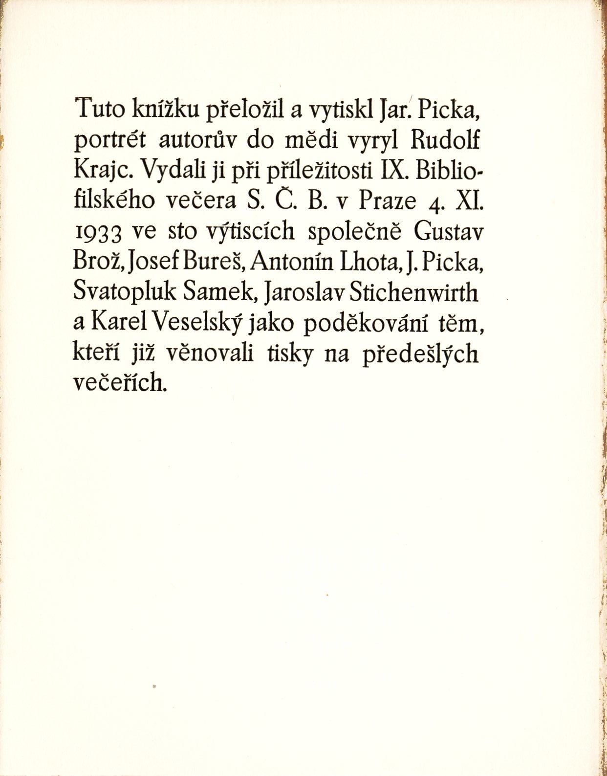 Názvové údaje A gentle madness : bibliophiles, bibliomanes, and the eternal passion for books / Nicholas A. Basbanes Osobní jméno Basbanes, Nicholas A., 1943- (Autor) (Autor úvodu atd.) Nakladatel Chapel Hill, NC : Fine Books Press, 2012 Rozsah xxv, 635, 24 nečíslovaných obrazových příloh : ilustrace ; 21 cm Klíčová slova knižní kultura * dějiny knižní kultury * dějiny knihy * sběratelství * bibliofilství * bibliofilové * bibliofilie * Velká Británie * Severní Amerika * monografie Počet ex. 1, z toho volných 0 Druh dok. monografie Signatura MetC 0243 Názvové údaje Táborská výjimka / Jaroslav Durych Osobní jméno Durych, Jaroslav, 1886-1962 (Autor) Další autoři Hlobilová-Mrkvičková, Marie, 1903-1999 (Ilustrátor) (Autor podpisu) (Dedikátor) Hnátek, Bořivoj, 1880-1954 (Dedikant) Korp. Kryl a Scotti (firma) (Tiskař) Nakladatel V Přerově : J. Beyr : F. Cinner : V. Hock : J. Kainar : J. Kratochvíl : E. Kvasnička : F. Pleusová : a S. Pleva, 1930 Výrobce V Nov. Jičíně : Kryl a Scotti Rozsah 20 nečíslovaných stran : ilustrace ; 15 cm Klíčová slova česká literatura * historie * úvaha * Durych J. * Tábor * stol. 17. * ilustrace * Mrkvičková-Hlobilová M. * soukromý tisk * bibliofilové * r. 1930 Počet ex. 1, z toho volných 1 Druh dok. monografie Signatura VZinková 0010 Názvové údaje Bibliofilská kniha : (prospekt) / Anatole France ; přeložil a vytiskl Jar. Picka Osobní jméno France, Anatole, 1844-1924 (Autor) Další autoři Krajc, Rudolf, 1907-1934 (Ilustrátor) (Autor podpisu) Samek, Svatopluk, 1885-1957 (Nakladatel, vydavatel) Veselský, Karel (Nakladatel, vydavatel) Stichenwirth, Jaroslav (Nakladatel, vydavatel) Lhota, Antonín (Nakladatel, vydavatel) Bureš, Josef (Nakladatel, vydavatel) Brož, Gustav (Nakladatel, vydavatel) Picka, Jaroslav, 1897-1957 (Tiskař) (Překladatel) Nakladatel V Praze : Gustav Brož ; Josef Bureš ; Antonín Lhota ; J. Picka ; Svatopluk Samek ; Jaroslav Stichewirth ; Karel Veselský, 1933 Výrobce V Praze : Jar. Picka, Rozsah 32 nečíslovaných stran : ilustrace ; 14 cm Klíčová slova francouzská literatura * esej * eseje * esejistické texty * bibliofilie * bibliofilové * bibliofilská vydání * bibliofilské tisky * bibliofilský tisk * bibliofilství * soukromé tisky * soukromý tisk Počet ex. 2, z toho volných 2 Druh dok. monografie Signatura P 136 G 36, AHO 0053 Názvové údaje Knihomilové / Anatole France ; přeložil Jan Karas Osobní jméno France, Anatole, 1844-1924 (Autor) Další autoři Picka, Jaroslav, 1897-1957 (Tiskař) (Sazeč) (Typograf) (Překladatel) (Nakladatel, vydavatel) Nakladatel V Praze : Jaroslav Picka, 1933 Rozsah 23 stran Klíčová slova francouzská literatura * esej * eseje * bibliofilie * bibliofilové * bibliofilská vydání * bibliofilské tisky * bibliofilský tisk * bibliofilství * kniha * knižní kultura Počet ex. 1, z toho volných 1 Druh dok. monografie Signatura Z A 2 D 58 Názvové údaje Liber viaticus Jana ze Středy : zmenšená reprodukce rukopisu XIII A 12 Knihovny Národního muzea Autor Jan, ze Středy, asi 1310-1380 (Autor) Další autoři Academia (nakladatelství) (Nakladatel, vydavatel) Národní muzeum (Praha, Česko) (Nakladatel, vydavatel) Indigoprint (tiskárna) (Tiskař obrazu) Nakladatel Praha : Academia ; Národní muzeum, 2016 Výrobce [Praha] : [Indigoprint] Rozsah 640 nečíslovaných stran : ilustrace (převážně barevné), faksimile Osobní hesla Jan, asi 1310-1380 ze Středy, - katolický kněz, biskup v Litomyšli a poté v Olomouci, kancléř Karla IV., humanistický spisovatel Heslo korporace (zkrác. heslo korp.) : Národní muzeum (Praha, Česko) Heslo unifik. názvu Liber Viaticus Jana ze Středy Chronologie 14. století Předmětová hesla breviáře * latinské rukopisy * iluminované rukopisy * pergamenové rukopisy * gotické rukopisy * iluminace rukopisů * knižní umění * bibliofilové Geografické heslo Morava (Česko) * Praha (Česko) * Česko Klíčová slova reprodukce * knižní umění * latinské rukopisy * stol. 14., 2. pol. * iluminované rukopisy * gotické umění * Česko * breviáře * Jan ze Středy Počet ex. 1, z toho volných 1 Druh dok. monografie Signatura C12d 2262/1 Odkazy (1) - Monografie Názvové údaje F.X. Šaldův svět knih : dva proslovy ve Spolku českých bibliofilů 17. III. 1957 a 2. IV. 1967 v Praze : faksimile dopisu F.X. Šaldy Bohumíru Lifkovi z Hofgasteinu 30. VII. 1928 / Bohumír Lifka Osobní jméno Lifka, Bohumír, 1900-1987 (Autor) (Dedikátor) (Autor podpisu) Další autoři Sonberg, Josef, 1892-1979 (Knižní grafik) Zink, Karel, 1889-1975 (Dedikant) Zinková, Viola, 1925-2017 (Dedikant) Šalda, F. X., 1867-1937 (Autor) Korp. Památník národního písemnictví (muzeum literatury) (Nakladatel, vydavatel) Spolek českých bibliofilů v Praze (Nakladatel, vydavatel) Mír, novinářské závody (tiskárna) (Tiskař) Nakladatel Praha : Spolek českých bibliofilů, 1967 Výrobce V Praze : knihtiskárna Mír Rozsah 39 stran ; 24 cm Osobní hesla Šalda, F. X., 1867-1937 - výtvarný a literární kritik, estetik, básník, dramatik, překladatel, pedagog, redaktor Předmětová hesla čeští spisovatelé - 19.-20. století * knižní kultura * bibliofilové * bibliofilství Klíčová slova česká literatura * Lifka B. * proslovy * Šalda F. X. * Spolek českých bibliofilů * prémie * bibliofilie * faksimile * r. 1967 Počet ex. 2, z toho volných 2 Druh dok. monografie Signatura VZinková 0769, VZinková 0805 Názvové údaje Vážený pane Tři B! : vzájemná korespondence Josefa Váchala a Bedřicha Beneše Buchlovana / [úvodní studii napsal Ladislav Vágner ; dopisy k vydání připravila Zuzana Zadrobílková ; grafická úprava a obálka Vladislav Zadrobílek] Osobní jméno Váchal, Josef, 1884-1969 (Autor) (Umělec) Další autoři Beneš Buchlovan, Bedřich, 1885-1953 (Autor) Vágner, Ladislav (Autor úvodu atd.) Zadrobílková, Zuzana,