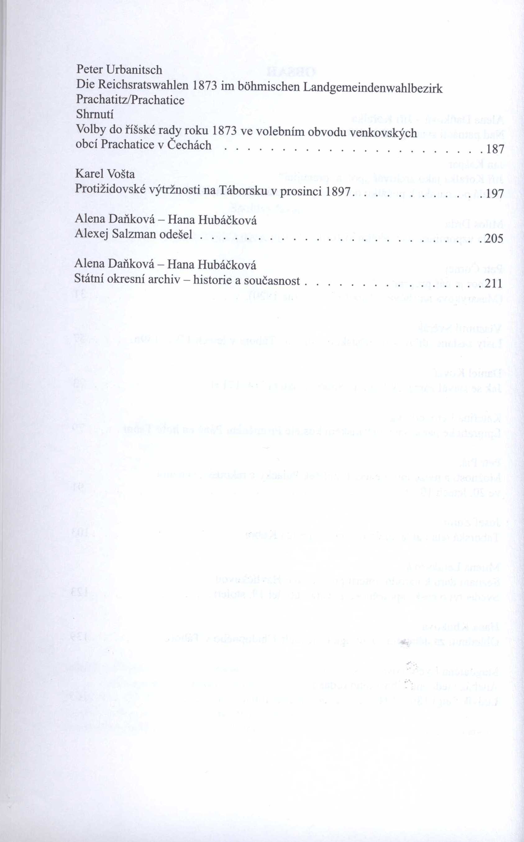 Názvové údaje Z dějin Ašského okresu / Marie Albertová ; předmluva Pavel Jetleb Osobní jméno Albertová, Marie (Autor) Další autoři Jetleb, Pavel (Autor úvodu atd.) Nakladatel Aš : Okresní vlastivědné museum, 1959 Výrobce Karlovy Vary : Stráž 301 Rozsah 87 stran Geografické heslo Aš (Česko) * Aš (Česko : oblast) Klíčová slova dějiny kraje * dějiny města * průmysl * geologie * vlastivěda kraje * západní Čechy Počet ex. 1, z toho volných 1 Druh dok. monografie Signatura J R II 87 Názvové údaje Starosta Oldřichovic Karl Hübl : sedlák, spisovatel a politik / Jiří Cihlář Osobní jméno Cihlář, Jiří, 1927-2021 (Autor) Nakladatel Ústí nad Orlicí : Oftis, 2006 Rozsah 96 s. : il., portréty, plány, faksim. ; 21 cm Osobní hesla Hübl, Karl, 1892-1968 - sedlák, spisovatel a politik Geografické heslo Ústí nad Orlicí-oblast (Česko) Klíčová slova starostové * sudetští Němci * českoslovenští Němci * Česko * Oldřichovice * Ústí nad Orlicí * sudetoněmecká otázka * národnostní poměry * biografie * dějiny kraje * vlastivědné studie Počet ex. 1, z toho volných 1 Druh dok. monografie Signatura C12b 9351 Názvové údaje Vlastivědný poutník : sborník pro Jičín a okolí Osobní jméno Čermák, Karel, 1954- (Autor) (Nakladatel, vydavatel) Nakladatel V Praze : Karel Čermák, 2012- Rozsah svazky : ilustrace ; 21 cm Klíčová slova Jičín * Jičínsko * dějiny kraje * vlastivěda kraje * významné osobnosti * vlastivědný sborník Druh dok. PERIODIKA - Souborný záznam periodika Odkazy (9) - PERIODIKA - Svázaný ročník periodika Názvové údaje Dějiny Karlovarského kraje. První díl, Od pravěku do konce feudálního období (1848) / Alexander Gross. [návrh obálky a grafická úprava od akademického malíře Břetislava Wernera] Osobní jméno Gross, Alexander, 1918-1986 (Autor) Další autoři Werner, Břetislav, 1911-1986 (Knižní grafik) (Autor obálky) Nakladatel Karlovy Vary : Krajské vlastivědné museum, 1954 Výrobce Západočeské tiskárny) Rozsah 167 s. : il. Geografické heslo Karlovy Vary (Česko : oblast) Klíčová slova dějiny lázeňství města panství * Karlovarsko * karlovarský kraj * Česko * dějiny kraje * feudalismus * šlechta * města * lázňství * do r. 1848 * přehledy Počet ex. 1, z toho volných 1 Druh dok. monografie Signatura ZKSlabý 0861 Názvové údaje V dobách umění bez hranic = W czasach sztuki bez granic / Radim Jež, David Pindur a kol. Osobní jméno Jež, Radim, 1982- (Autor) Další autoři Pindur, David, 1981- (Autor) Korp. Muzeum Těšínska (Český Těšín, Česko) (Nakladatel, vydavatel) Nakladatel Český Těšín : Muzeum Těšínska, 2013 Rozsah 383 s. : il., 1 mapa, portréty, plány, faksim., geneal. tabulky Osobní hesla Beinhart, Jacob, asi 1460-asi 1525 - německý malíř a sochař působící ve Vratislavi Klíčová slova Těšínsko * dějiny kraje * vlastivěda kraje * muzejnictví * muzeologie * regionální sborník Počet ex. 1, z toho volných 1 Druh dok. monografie Signatura C12c 4158 Názvové údaje Šumava : podhůří / Hynek Klimek ; [obálka a grafická úprava Miroslav Pechánek] Osobní jméno Klimek, Hynek, 1945- (Autor) Další autoři Pechánek, Miroslav, 1945-2015 (Knižní grafik) Korp. Regia (Praha) (Nakladatel, vydavatel) Nakladatel Praha : Regia, 2010 Rozsah 199 s. : il., portréty Geografické heslo Šumavské podhůří (Česko) Klíčová slova Šumava * šumavské pověsti * vlastivěda kraje * vlastivědné povídání * dějiny kraje Počet ex. 1, z toho volných 1 Druh dok. monografie Signatura C12b 12518 Názvové údaje Cieszyńskie studia muzealne = Těšínský muzejní sborník Záhlaví-korpor. Muzeum Těšínska (Český Těšín, Česko) Další autoři Jež, Radim, 1982- (Editor) Pindur, David, 1981- (Editor) Tesař, Petr (Autor obálky) Korp. Muzeum Śląska Cieszyńskiego Finidr (tiskárna) (Tiskař) Roč., číslo 4, 2010 Nakladatel Český Těšín : Muzeum Těšínska, 2011 Výrobce Finidr Rozsah 383 stran : ilustrace (převážně barevné), erby, faksimile, mapy, portréty Klíčová slova Těšínsko * dějiny kraje * vlastivěda kraje * muzejnictví * činnost muzea * muzejní sbírky * sborníky Nadřízená jednotka Cieszyńskie studia muzealne Počet ex. 1, z toho volných 1 Druh dok. PERIODIKA - Svázaný ročník periodika Signatura C12c 3497 Názvové údaje Cieszyńskie studia muzealne = Těšínský muzejní sborník. Dům, palác a zámek v hmotné kultuře Slezska = Dom, pałac i zamek w kulturze mateialnej Śląska Záhlaví-korpor. Muzeum Těšínska (Český Těšín, Česko) Další autoři Jež, Radim, 1982- (Editor) Pindur, David, 1981- (Editor) Tesař, Petr (Autor obálky) Korp. Muzeum Śląska Cieszyńskiego Finidr (tiskárna) (Tiskař) Roč., číslo 6, 2018 Nakladatel Český Těšín : Muzeum Těšínska ; [Cieszyn] : Muzeum Śląska Cieszyńskiego, 2018 Výrobce Finidr Rozsah 607 stran : ilustrace, fotografie, portréty, faksimile, plány ; 24 cm Klíčová slova Těšínsko * dějiny kraje * vlastivěda kraje * muzejnictví * činnost muzea * muzejní sbírky * sborníky Nadřízená jednotka Cieszyńskie studia muzealne Počet ex. 1, z toho volných 1 Druh dok. PERIODIKA - Svázaný ročník periodika Signatura C12c 5004 Názvové údaje Táborský archiv : sborník Státního okresního archivu v Táboře. 14 / [uspořádali Jiří Kořalka, Alena Daňková ; Státní okresní archiv v Táboře] Záhlaví-korpor. Státní okresní archiv Tábor (Nakladatel, vydavatel) Další autoři Kořalka, Jiří, 1931-2015 (Editor) Daňková, Alena (Editor) Nakladatel Tábor : Státní oblastní archiv v Třeboni, Státní okresní archiv Tábor, 2009 Výrobce Nová Tiskárna Pelhřimov) Rozsah 349 s. : tab., čb. fot., plány Osobní hesla Kořalková, Květa, 1930-2008 - historička, politoložka Klíčová slova Tábor * Táborsko * husitství * husité * vlastivěda k