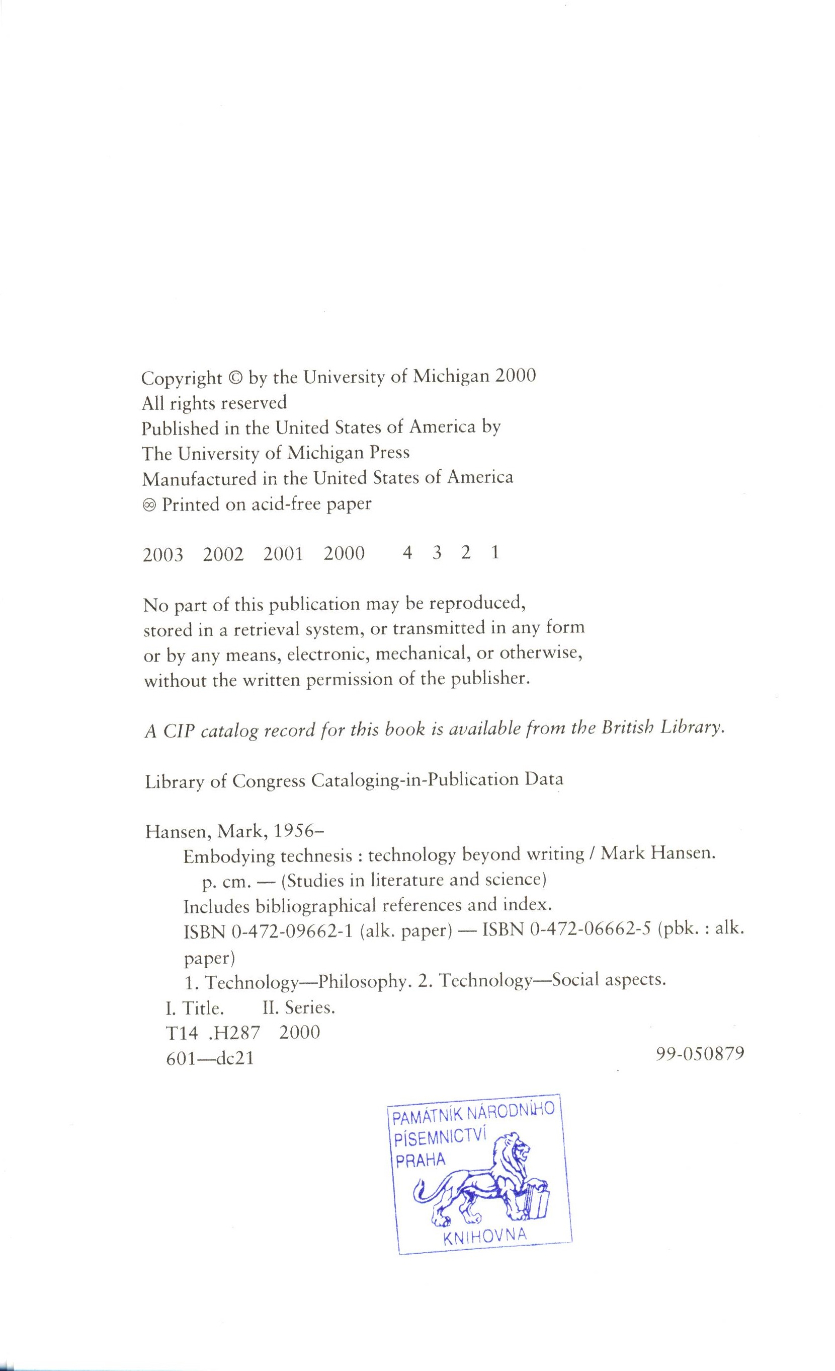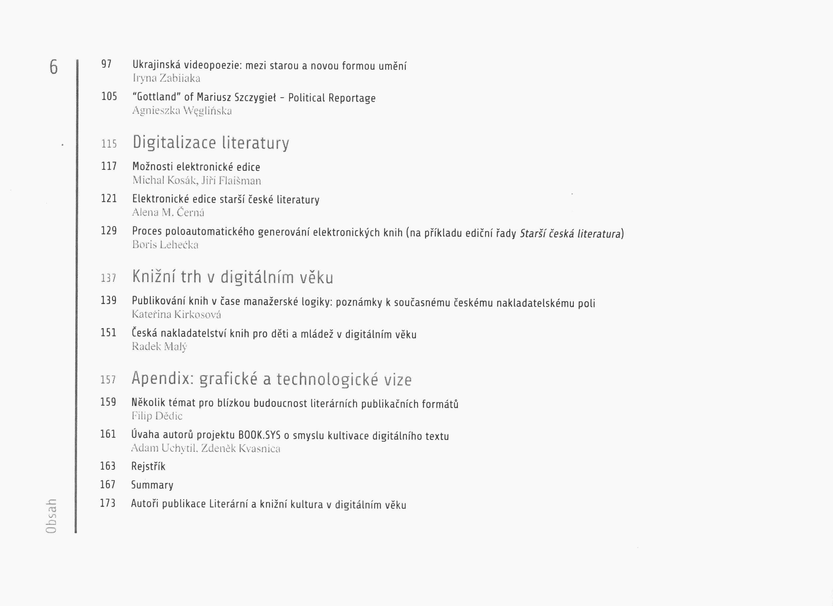 Názvové údaje Digital negroes : an ethnographic dictionary = Digitální černoši : etnografický slovník / Dalibor Knapp ; grafický design a typografie Zdeněk Růžička ; ilustrace Max Máslo ; překlad Ian Mikyska Osobní jméno Knapp, Dalibor, (Autor) (Autor koncepce) 1985- Další autoři Mikyska, Ian, 1994- (Překladatel) Růžička, Zdeněk (Knižní grafik) (Typograf) (Autor koncepce) Máslo, Max, (Ilustrátor) 1994- Korp. Powerprint (tiskárna) (Tiskař) Nakladatel [Praha] : Množina and Studio Famu, 2017 Výrobce PowerPrint, s. r. o. Rozsah 163 stran : ilustrace (částečně barevné), portréty ; 19 cm Klíčová slova česká literatura * dvojjazyčné vydání * obrazové publikace * odborná literatura * digitální technologie * digitální média * kyberkultura * kybernetika * technika * společnost * Nejkrásnější české knihy * r. 2017 Počet ex. 1, z toho volných 1 Druh dok. monografie Signatura C12b 18180 Názvové údaje Metamedia : American book fictions and literary print culture after digitization / Alexander Starre Osobní jméno Starre, Alexander, 1981- (Autor) Nakladatel Iowa City : University Iowa Press, [2015] Copyright ©2015 Rozsah xii, 310 stran : černobílé ilustrace, faksimile ; 22,5 cm Geografické heslo Spojené státy americké Klíčová slova americká literatura * knižní kultura * společnost * vliv literatury * digitální média * digitalizované dokumenty * stol. 21. * kulturní dějiny * studie Počet ex. 1, z toho volných 1 Druh dok. monografie Signatura MetC 0247 Názvové údaje Čtenáři, vrať se : mozek a čtení v digitálním světě / Maryanne Wolfová ; z anglického originálu Reader, come home ... přeložila Romana Hegedüsová Osobní jméno Wolf, Maryanne, 1947- (Autor) Další autoři Hegedüsová, Romana, (Překladatel) 1974- Nechaj, Andrej, 1984- (Autor obálky) (Knižní grafik) Korp. Host (nakladatelství) (Nakladatel, vydavatel) Finidr (tiskárna) (Tiskař) Unifikovaný název Reader, come home. Česky Nakladatel Brno : Host, 2020 Výrobce Český Těšín : Finidr Rozsah 262 stran : ilustrace ; 21 cm Předmětová hesla čtení - psychologické aspekty * čtenářství * dětští čtenáři * digitální média - psychologické aspekty * neuropsychologie * reading - psychological aspects * reading * child librarian readers * digital media - psychological aspects * neuropsychology Klíčová slova americká literatura * studie * psychologické aspekty * digitální média * čtení * čtenářství * čtenářský vývoj Počet ex. 1, z toho volných 0, prezenčně 1 Druh dok. monografie Signatura MetC 0258 Názvové údaje Embodying Technesis : technology Beyond Writing / Mark Hansen ; foreword by N. Katherine Hayles Osobní jméno Hansen, Mark B. N. (Mark Boris Nicola), 1965- (Autor) Další autoři Hayles, Katherine, (Autor úvodu atd.) 1943- Korp. University of Michigan Press (Nakladatel, vydavatel) Nakladatel Ann Arbor : University of Michigan Press, [2003] Copyright © 2000 Rozsah ix, 338 stran ; 24 cm Klíčová slova teorie literatury * filozofie * fenomenologie * postmodernismus * vlivy * technologie * moderní technologie * digitální média * digitální technologie * odborná literatura * stol. 21. Počet ex. 1, z toho volných 1 Adr. el. zdr. http://www.loc.gov/catdir/description/umich051/99050879.html Druh dok. monografie Signatura MetC 0369 Názvové údaje Orbis scholae. Vol 8, 2, 2014, Textbooks and educational media in a digital age / guest editors Zuzana Sikorová and Dominik Dvořák Další autoři Sikorová, Zuzana, 1964- (Editor) Dvořák, Dominik, 1964- (Editor) Korp. Univerzita Karlova (Nakladatel, vydavatel) Masarykova univerzita (Brno, Česko) (Spolupracovník) Karolinum (nakladatelství, tiskárna) (Tiskař) Nakladatel Prague : Charles University in Prague, 2015 Výrobce Karolinum Press Rozsah 103 stran ; 23 cm Klíčová slova učebnice * učební texty * vzdělávání * vzdělávací programy * digitální média * digitalizace * časopisy * kolektivní monografie Počet ex. 1, z toho volných 1 Druh dok. periodika Signatura MetC 0206 Názvové údaje The digital literary sphere : reading, writing, and selling books in the internet era / Simone Murray Osobní jméno Murray, Simone, 1972- (Autor) Další autoři Johns Hopkins University. Press (Nakladatel, vydavatel) Nakladatel Baltimore : Johns Hopkins University Press, [2018] Výrobce Printed in United States of America Copyright ©2018 Rozsah 235 stran : ilustrace ; 24 cm Klíčová slova literární věda * literární vlivy * vztahy * digitální média * digitální technologie * digitální knihovny * internetové publikování * interpretace a přijetí literárního díla * stol. 21. Počet ex. 1, z toho volných 1 Druh dok. monografie Signatura MetC 0400