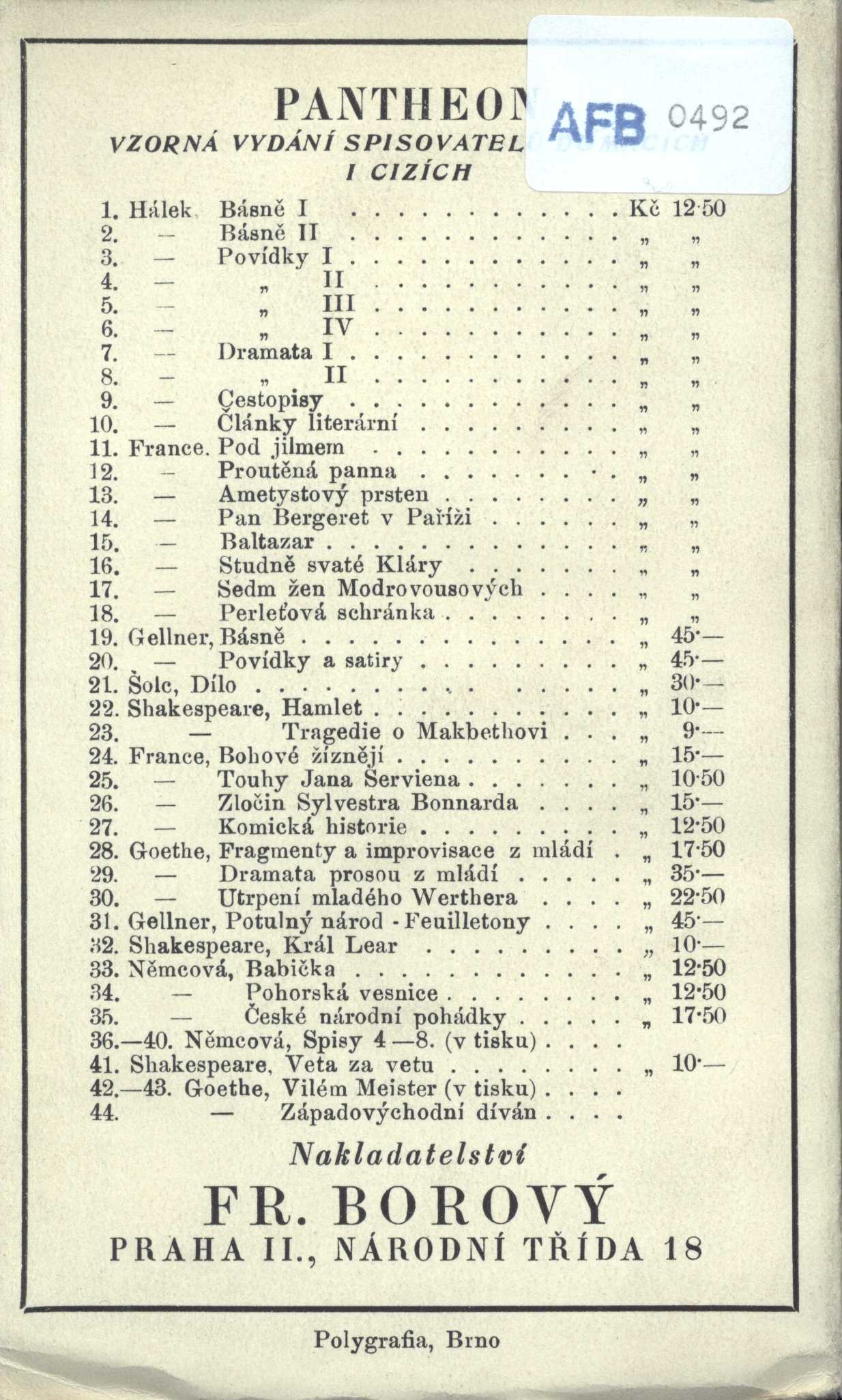 Názvové údaje Květy zla. Dodatky. / Charles Baudelaire ; [přeložil Svatopluk Kadlec] Osobní jméno Baudelaire, Charles, 1821-1867 (Autor) Další autoři Kadlec, Svatopluk, 1898-1971 (Překladatel) Portman, Josef, 1893-1968 (Dedikant) Kadlec, Svatopluk, 1898-1971 (Dedikátor) (Autor podpisu) Korp. Melantrich (nakladatelství : 1910-1950) (Nakladatel, vydavatel) (Tiskař) Nakladatel Praha : Melantrich, 1934 Rozsah 367, 15 s. Osobní hesla Portman, Josef, 1893-1968 - bibliofil, vydavatel, tiskař, sběratel * Kadlec, Svatopluk, 1898-1971 - básník, dramatik, překladatel Klíčová slova francouzská literatura * překlad * poezie * dramatické básně * epické básně * lyrické básně * satirické básně * epigrafy Počet ex. 4, z toho volných 4 Druh dok. monografie Signatura POR 120, LK P 49 G 56, LK P 21 A 61, LK VÁCLAVEK 1256 Názvové údaje Don Juan : satirický román ve verších / Lorda Byrona ; přeložil V.A. Jung. III. a IV. zpěv Osobní jméno Byron, George Gordon Byron, baron, 1788-1824 (Autor) Další autoři Jung, Václav Alois, 1858-1927 (Překladatel) Korp. J. Otto (nakladatelství) (Nakladatel, vydavatel) Nakladatel V Praze : Nakladatelství J. Otty, 1905 Rozsah 111 s. ; 8° Klíčová slova anglická literatura * překlad * dramata * dramatické básně Počet ex. 1, z toho volných 1 Druh dok. monografie Signatura C12b 8475/3 a 4 Názvové údaje Don Juan : satirický román ve verších. I. a II. zpěv / Lorda Byrona ; přeložil V.A. Jung Osobní jméno Byron, George Gordon Byron, baron, 1788-1824 (Autor) Další autoři Jung, Václav Alois, 1858-1927 (Překladatel) Korp. J. Otto (nakladatelství) (Nakladatel, vydavatel) Nakladatel V Praze : Nakladatelství J. Otty, 1904 Výrobce (Unie) Rozsah 193 s. ; 8° Klíčová slova anglická literatura * překlad * dramata * dramatické básně Počet ex. 1, z toho volných 1 Druh dok. monografie Signatura C12b 8475/1 a 2 Názvové údaje Fr. Lad. Čelakovského Sebrané spisy : spisův básnických knihy šestery Osobní jméno Čelakovský, František Ladislav, 1799-1852 (Autor) Další autoři I.L. Kober (nakladatelství, tiskárna, knihkupectví) (Nakladatel, vydavatel) Nakladatel V Praze : I.L. Kober, 1871 Rozsah 467 s. Klíčová slova česká poezie * epická poezie * epické básně * dramatická poezie * dramatické básně * výbor básní Počet ex. 1, z toho volných 1 Druh dok. monografie Signatura C12a 3640 Názvové údaje Sen jarního jitra ; Sen podzimního večera : dvě básně dramatické / Gabriele d'Annunzio ; přeložil Václav Jiřina Osobní jméno D'Annunzio, Gabriele, 1863-1938 (Autor) Další autoři Jiřina, Václav, 1886-1946 (Překladatel) Otto, Jan, 1841-1916 (Nakladatel, vydavatel) Nakladatel V Praze : vlastním náklademm vydal J. Otto, 1914 Výrobce Unie Rozsah 84 stran Klíčová slova italská poezie * dramatické básně Počet ex. 1, z toho volných 1 Druh dok. monografie Signatura M 149 g 37 Názvové údaje Sen jarního jitra ; Sen podzimního večera : dvě básně dramatické / Gabriele d'Annunzio ; přeložil Václav Jiřina Osobní jméno D'Annunzio, Gabriele, 1863-1938 (Autor) Další autoři D'Annunzio, Gabriele, 1863-1938 Sogno d'un mattino di primavera. D'Annunzio, Gabriele, 1863-1938 Sogno d'un tramonto d'autunno. Jiřina, Václav, 1886-1946 (Překladatel) Korp. J. Otto (nakladatelství) (Nakladatel, vydavatel) Nakladatel V Praze : J. Otto, [1908] Rozsah 84 stran Klíčová slova italská poezie * dramatické básně Počet ex. 1, z toho volných 1 Druh dok. monografie Signatura P 22 g 80 Názvové údaje Libušin soud : dramatická báseň v 3 dějství / podává Josef Václav Frič Osobní jméno Frič, Josef Václav, 1829-1890 (Autor) Nakladatel Geneva : Tisk Pfeffer-a i Puky-ho, 1861 Rozsah 112 s. ; 12° Klíčová slova česká literatura * české drama * poezie * básně * dramatická poezie * dramatické básně Počet ex. 1, z toho volných 1 Druh dok. monografie Signatura L VI g 18 Názvové údaje Západovýchodní díván : 1814-1820 / J. W. Goethe ; [přeložil a uspořádal Otokar Fischer ; v úpravě Josefa Kaplického] Osobní jméno Goethe, Johann Wolfgang von, 1749-1832 (Autor) Další autoři Fischer, Otokar, 1883-1938 (Sestavovatel, kompilátor) (Překladatel) Kaplický, Josef, 1899-1962 (Knižní grafik) Korp. Fr. Borový (firma) (Nakladatel, vydavatel) Polygrafia (nakladatelství a tiskárna, Brno) (Tiskař) Nakladatel V Praze : Fr. Borový, 1928 Výrobce Polygrafie) Rozsah 285 s. Klíčová slova německá literatura * německá poezie * dramatické básně * r. 1814-1820 * sebrané spisy Počet ex. 1, z toho volných 1 Druh dok. monografie Signatura AFB 0492 Názvové údaje Západovýchodní díván : 1814-1820 / J. W. Goethe ; [přeložil a uspořádal Otokar Fischer ; v úpravě Josefa Kaplického] Osobní jméno Goethe, Johann Wolfgang von, 1749-1832 (Autor úvodu atd.) Další autoři Fischer, Otokar, 1883-1938 (Překladatel) (Editor) (Dedikátor) Kaplický, Josef, 1899-1962 (Knižní grafik) Nakladatel V Praze : Fr. Borový, 1928 Výrobce Polygrafie) Rozsah 285 s. Klíčová slova německá poezie * dramatické básně * r. 1814-1820 * sebrané spisy Počet ex. 2, z toho volných 2 Druh dok. monografie Signatura Holan 49, C12a 3035 Názvové údaje Jan Bezzemek / Yvan Goll ; přel. Jiří Konůpek ; lept Jan Konůpek Osobní jméno Goll, Yvan, 1891-1950 (Autor) Další autoři Konůpek, Jiří, 1919-1968 (Překladatel) (Ilustrátor) (Autor podpisu) Nakladatel [Kladno] : b.n., 1948 Výrobce (Josef Cipra) Rozsah 52 s. : il. Osobní hesla Konůpek, Jan, 1883-1950 - malíř, grafik, ilustrátor Klíčová slova francouzská literatura * poezie * dramatické básně * bibliofilie Počet ex. 4, z toho volných 4 Druh dok. monografie Signatura POR 186, LK M 175 a 32, LK P 134 F 39, LK P 85 C 39