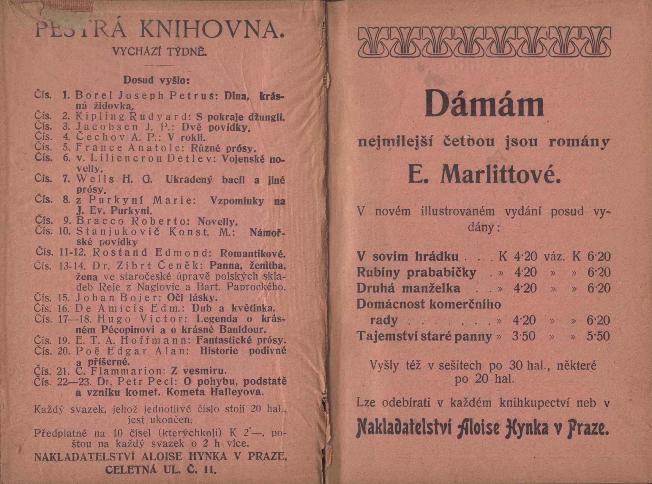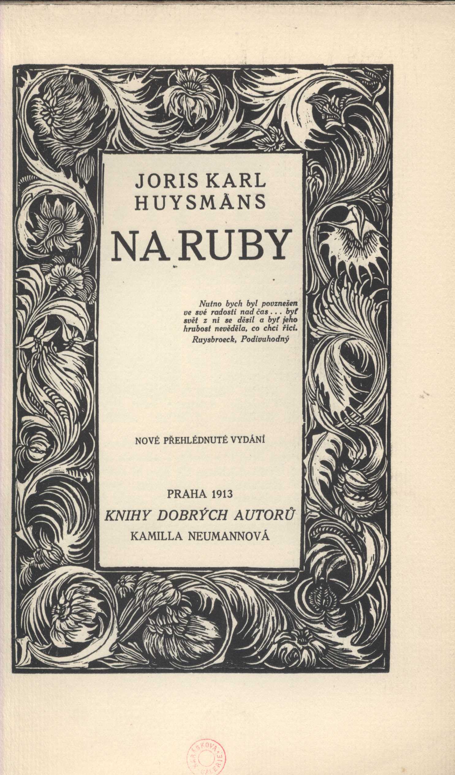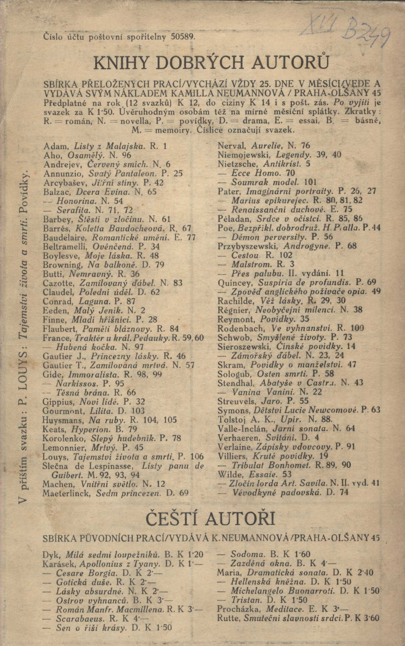 Názvové údaje Hašiš a víno / Charles Baudelaire ; přeložil J. Hart Osobní jméno Baudelaire, Charles, 1821-1867 (Autor) Další autoři Hart, Jan, 1880-1932 (Překladatel) Korp. Nakladatelství Alois Hynek (Nakladatel, vydavatel) Čeněk Mojžíš (tiskárna) (Tiskař) Nakladatel V Praze : Nakladatel Alois Hynek, knihkupec, [1910?] Výrobce V Chocni : Č. Mojžíš Rozsah 104 stran ; 15 cm Klíčová slova francouzská literatura * próza * Baudelaire Ch. * eseje * drogy * působení * vliv * stol. 19., léta 60. Počet ex. 2, z toho volných 2 Druh dok. monografie Signatura C12a 1319, VZinková 0637 Názvové údaje Petits poèmes en prose ; Les paradis artificiels / par Charles Baudelaire Osobní jméno Baudelaire, Charles, 1821-1867 (Autor) Další autoři Calmann-Lévy (firma) (Nakladatel, vydavatel) Imprimerie de J. Claye (Paris) (Tiskař) Nakladatel Paris : Michel Lévy frères, 1869 Výrobce (J. Claye) Rozsah 471 s. Klíčová slova francouzská literatura * dekadence * barokní poezie * esej * eseje * esejistické texty * drogy * drogová závislost * básně v próze Počet ex. 1, z toho volných 1 Druh dok. monografie Signatura VHB 2067 Názvové údaje The teaching of Don Juan : A Separate Reality : Tales of Power / Carlos Castaneda Osobní jméno Castaneda, Carlos, 1925-1998 (Autor) Nakladatel New York : Quality Paperback Book Club, [1974] Copyright ©1974 Rozsah 795 stran ; 21 cm Klíčová slova americká literatura * americká próza * přírodní národy * parapsychologie * šamanismus * drogy * mimosmyslové vnímání * vzpomínky Počet ex. 1, z toho volných 1 Druh dok. monografie Signatura BVolkova 0959 Názvové údaje Útěk do klece / Jan Cimický ; Ilustr. Václav Bláha ; Typografie Jan Jiskra Osobní jméno Cimický, Jan, 1948- (Autor) Další autoři Bláha, Václav, 1922-2021 (Ilustrátor) Jiskra, Jan, 1949- (Grafický technik) Nakladatel Praha : Československý spisovatel, 1990 Výrobce Stráž) Rozsah 234 s. ; 20 cm Klíčová slova česká literatura * próza * román * život mládeže * alkohol * drogy * psychiatrická léčebna * stol. 20., léta 80. Počet ex. 1, z toho volných 1 Druh dok. monografie Signatura C12b 3969 Názvové údaje Zpověď anglického poživače opia / Thomas De Quincey ; dle anglického vydání z roku 1823 přeložil Kamil Fiala ; vypravil Josef Marek Osobní jméno De Quincey, Thomas, 1785-1859 (Autor) Další autoři Fiala, Kamil, 1880-1930 (Překladatel) Marek, Josef Richard, 1883-1951 (Grafický technik) Korp. Nakladatelství Kamilla Neumannová (Nakladatel, vydavatel) Albert Malíř (tiskárna a nakladatelství) (Tiskař) Nakladatel [Praha] : Kamilla Neumannová, [19--] Výrobce Kr. Vinohrady : Alb. Malíř, [19--] Rozsah 130 stran ; 22 cm Klíčová slova anglická literatura * próza * román * drogová závislost * drogově závislí * drogy Počet ex. 5, z toho volných 4 Druh dok. monografie Signatura POR 58, P 65 F 5, P 77 B 67, Hoffmeister 0197, VHB 2816 Názvové údaje Aktuální drogové závislosti / Jiří Drtil Osobní jméno Drtil, Jiří, 1937-2007 (Autor) Další autoři Avicenum, zdravotnické nakladatelství (Nakladatel, vydavatel) Nakladatel Praha : Avicenum, 1978 Výrobce MTZ 21) Rozsah 95 s. ; 8° Klíčová slova toxikologie * drogy * drogová závislost * léčba * výzkum * odborné stati Počet ex. 1, z toho volných 1 Druh dok. monografie Signatura P I 2439 Názvové údaje Na ruby : nové přehlédnuté vydání / Joris Karl Huysmans ; [přeložil Arnošt Procházka ; původními dřevoryty vyzdobil František Kobliha] Osobní jméno Huysmans, Joris Karl, 1848-1907 (Autor) Další autoři Procházka, Arnošt, 1869-1925 (Překladatel) (Dedikátor) Karásek ze Lvovic, Jiří, 1871-1951 (Dedikant) Kobliha, František, 1877-1962 (Ilustrátor) (Autor podpisu) Neumannová, Kamila, 1874-1956 (Nakladatel, vydavatel) Korp. Lidová knihtiskárna J. Skalák a spol. (Tiskař) Nakladatel Praha : Kamilla Neumannová, 1913 Výrobce (Knihtiskárna J. Skaláka) Rozsah 200 s. : il. ; 21 cm Klíčová slova francouzská literatura * francouzská próza * romány * dekadence * přelom 19. a 20. stol. * drogy * sny * bibliofilie * moderní umění * vyznání Počet ex. 4, z toho volných 4 Druh dok. monografie Signatura Holan 2067, KaG XVI B 249, Hoffmeister 0199, VMartínek 0704