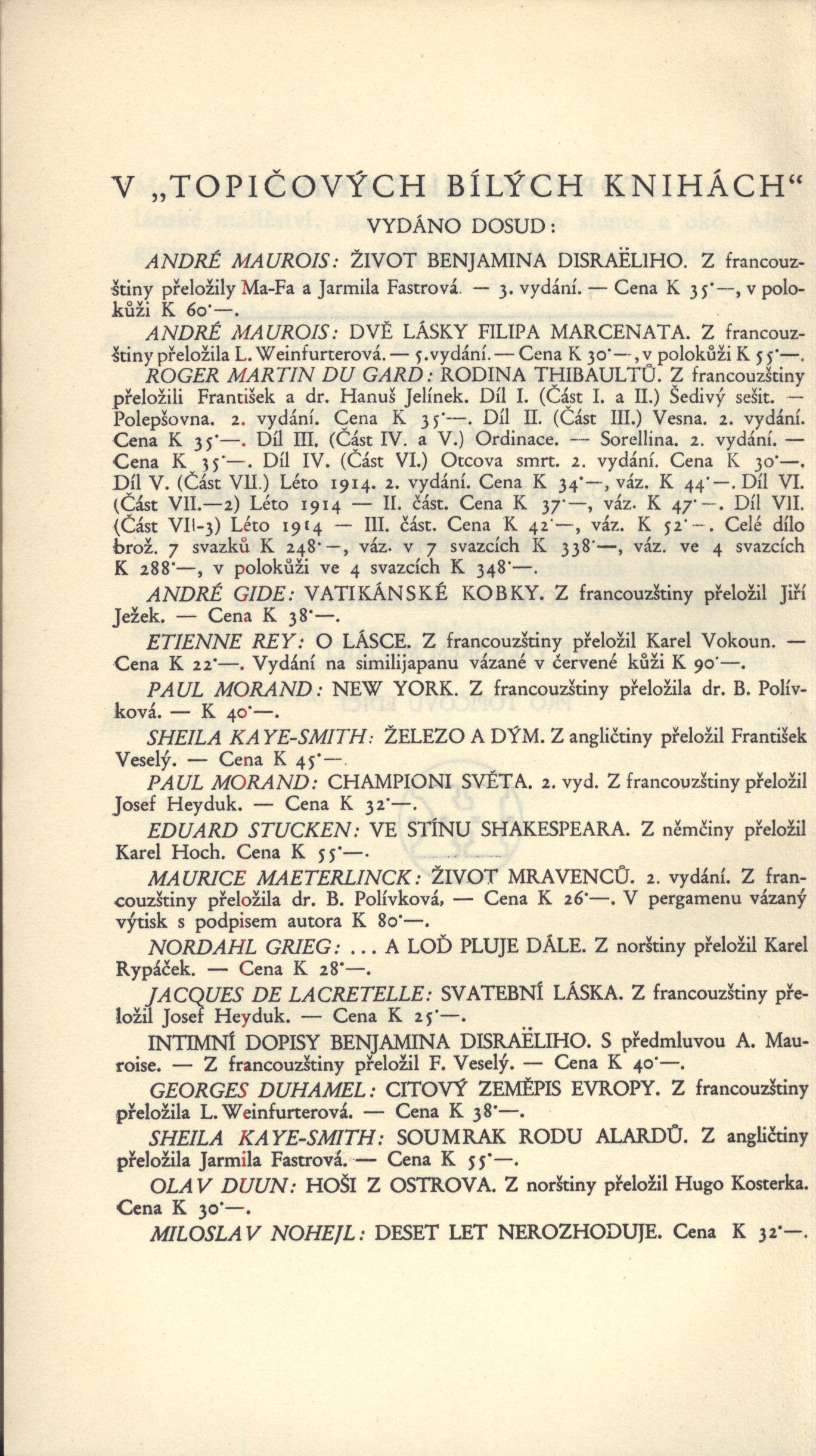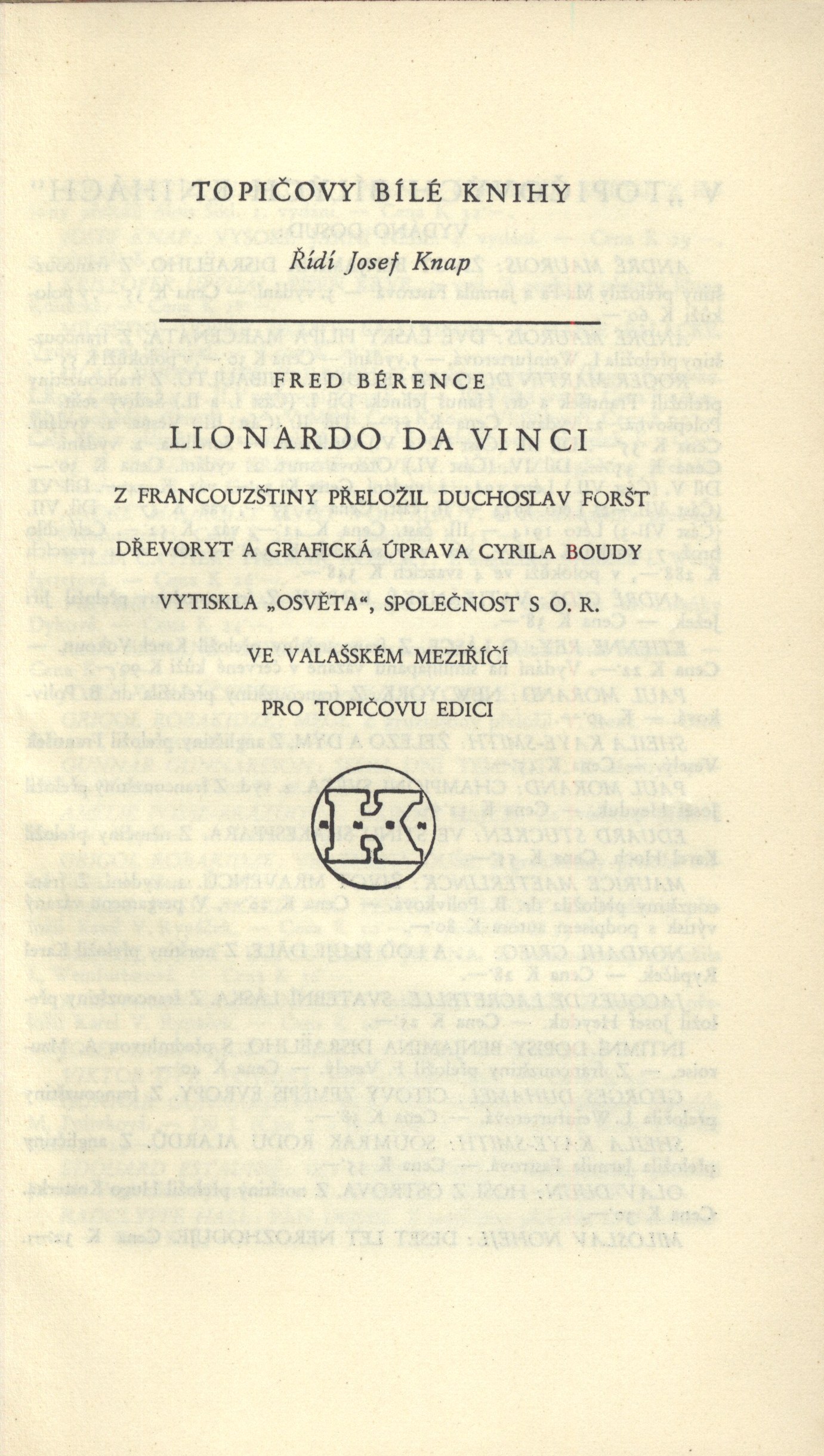 Názvové údaje Florentské malířství a jeho společenské pozadí : měšťanská republika, než převzal moc Cosimi de' Medici : XIV. století a počátek století XV. / Frederick Antal ; z anglického originálu přeložil Jan Vladislav ; doslov k dílu napsal Jaromír Neumann ; grafickou úpravu, obálku a vazbu navrhl Zdeněk Rossmann Osobní jméno Antal, Frederick, 1887-1954 (Autor) Další autoři Vladislav, Jan, 1923-2009 (Překladatel) Neumann, Jaromír, 1924-2001 (Autor doslovu, tiráže atd.) Rossmann, Zdeněk, 1905-1984 (Grafický technik) (Autor obálky) Korp. Státní nakladatelství krásné literatury, hudby a umění (Nakladatel, vydavatel) Orbis (tiskárna) (Tiskař) Nakladatel Praha : Státní nakladatelství krásné literatury, hudby a umění, 1954 Rozsah 305 stran, 166 nečíslovaných obrazových příloh Klíčová slova anglická literatura * dějiny umění * renesance * společenské poměry * Itálie * italské malířství * Florencie * studie Počet ex. 3, z toho volných 3 Druh dok. monografie Signatura MUK 1704, JVladislav 039, K Q I 51 Názvové údaje Raffael : der Maler reiner Schönheit : mit 72 Abbildungen / gewählt und eingeleitet von S. Aschner Osobní jméno Aschner, Siegfried, 1882-1942 (Autor) Další autoři Hugo Schmidt Verlag (München, Německo) (Nakladatel, vydavatel) Nakladatel München : Hugo Schmidt Verlag, [1920] Copyright München : Hugo Schmidt Verlag, [1920] c1920 Rozsah 107 stran : ilustrace Osobní hesla Raffael, 1483-1520 - italský malíř a kreslíř Klíčová slova německá literatura * dějiny umění * renesanční umění * renesanční malířství * italské malířství * italské umění * italští umělci Počet ex. 1, z toho volných 1 Druh dok. monografie Signatura KaG IV C 91 Názvové údaje Lionardo da Vinci, dělník rozumu / Fred Bérence ; z francouzštiny přeložil Duchoslav Foršt ; [dřevoryt a grafická úprava Cyrila Boudy] Osobní jméno Bérence, Fred, 1889-1977 (Autor) Další autoři Foršt, Duchoslav, 1901-1983 (Překladatel) Bouda, Cyril, 1901-1984 (Ilustrátor) (Knižní grafik) Korp. Topičova edice (nakladatelství) (Nakladatel, vydavatel) Osvěta (tiskárna) (Tiskař) Nakladatel V Praze : Topičova edice, 1939 Výrobce Osvěta, společnost s o. r.) Rozsah 369 s., [2] l. obr. příl. : il. ; 22 cm Osobní hesla Leonardo, da Vinci, 1452-1519 - italský malíř, sochař, architekt a vědec Klíčová slova francouzská literatura * próza * překlad * monografie * biografie * Leonardo da Vinci * italské malířství * obrazové přílohy Počet ex. 1, z toho volných 1 Druh dok. monografie Signatura Topič 0101 Názvové údaje Madona s harpyjemi : román / Fred Bérence ; z francouzštiny přeložil Duchoslav Foršt ; [dřevoryt a grafická úprava Cyrila Boudy] Osobní jméno Bérence, Fred, 1889-1977 (Autor) Další autoři Foršt, Duchoslav, 1901-1983 (Překladatel) Bouda, Cyril, 1901-1984 (Ilustrátor) (Knižní grafik) Korp. Topičova edice (nakladatelství) (Nakladatel, vydavatel) První západočeská společnost akciová pro průmysl tiskařský (Plzeň) (Tiskař) Nakladatel Praha : Topičova edice, společnost s r. o., 1946 Výrobce První západočeská spol. akc. pro průmysl tiskařský) Rozsah 235 s. : il. ; 22 cm Osobní hesla Andrea del Sarto, 1486-1530 - italský malíř, představitel florentského manýrismu Klíčová slova francouzská literatura * překlad * próza * román * biografický román * italské malířství * Florencie * Sarto A. del Počet ex. 1, z toho volných 1 Druh dok. monografie Signatura Topič 0128 Názvové údaje Raffael neboli moc ducha / Fred Bérence ; přeložil Václav Renč ; [dřevoryt a grafická úprava Cyrila Boudy] Osobní jméno Bérence, Fred, 1889-1977 Další autoři Renč, Václav, 1911-1973 (Překladatel) Bouda, Cyril, 1901-1984 (Ilustrátor) (Knižní grafik) Korp. F. Topič (nakladatelství) (Nakladatel, vydavatel) Politika (tiskárna, nakladatelství) (Tiskař) Nakladatel V Praze : Nakladatel F. Topič, 1936 Výrobce (Politika) Rozsah 309 s., [1] l. obr. příl. : il. ; 23 cm Osobní hesla Raffael, 1483-1520 - italský malíř a kreslíř Klíčová slova francouzská literatura * překlad * román * biografický román * Raffael * italské malířství * stol. 16. Počet ex. 1, z toho volných 1 Druh dok. monografie Signatura Topič 0162 Odkazy (1) - Monografie Názvové údaje Raphaël ou la puissance de l'esprit / Fred Bérence Osobní jméno Bérence, Fred, 1889-1977 (Autor) (Autor podpisu) (Dedikátor) Další autoři Raffael, 1483-1520 (Umělec) Blekastad, Hallvard, 1883-1966 (Dedikant) Blekastad, Milada, 1917-2003 (Dedikant) Korp. Payot (firma : Paříž, Francie) (Nakladatel, vydavatel) Bussière (firma) (Tiskař) Nakladatel Paris : Payot, 1936 Výrobce (Imprimerie R. Bussière) Rozsah 330, [34] s. obr. příl. : il. ; 23 cm Osobní hesla Raffael, 1483-1520 - italský malíř a kreslíř Klíčová slova francouzská literatura * román * biografický román * Raffael * italské malířství * stol. 16. * obrazové přílohy Počet ex. 1, z toho volných 1 Druh dok. monografie Signatura Topič 0837 Názvové údaje Von der hochedlen Malerei : Tractat / des Michel Angelo Biondo ; ; übersetzt, mit Einleitung und Noten versehen von Albert Ilg Osobní jméno Biondo, Michelangelo, 1497-1565 (Autor) Další autoři Karásek ze Lvovic, Jiří, 1871-1951 (Autor podpisu) Ilg, Albert, 1847-1896 (Autor úvodu atd.) (Překladatel) Korp. Wilhelm Braumüller. k. k. Universitäts-Verlagsbuchhandlung (Wien und Leipzig, Rakousko a Německo) (Nakladatel, vydavatel) K. u. k. Hofbuchdruckerei Carl Fromme (Wien) (Tiskař) Nakladatel Wien : Wilhelm Braumüller, 1873 Výrobce (Carl Fromme) Rozsah xiii, 66 s. Klíčová slova italská literatura * italské umění * italští umělci * italské malířství * malíři * malířská tvorba * malířství * teorie umění * dějiny umění * renesanční literatura * renesanční malířstv