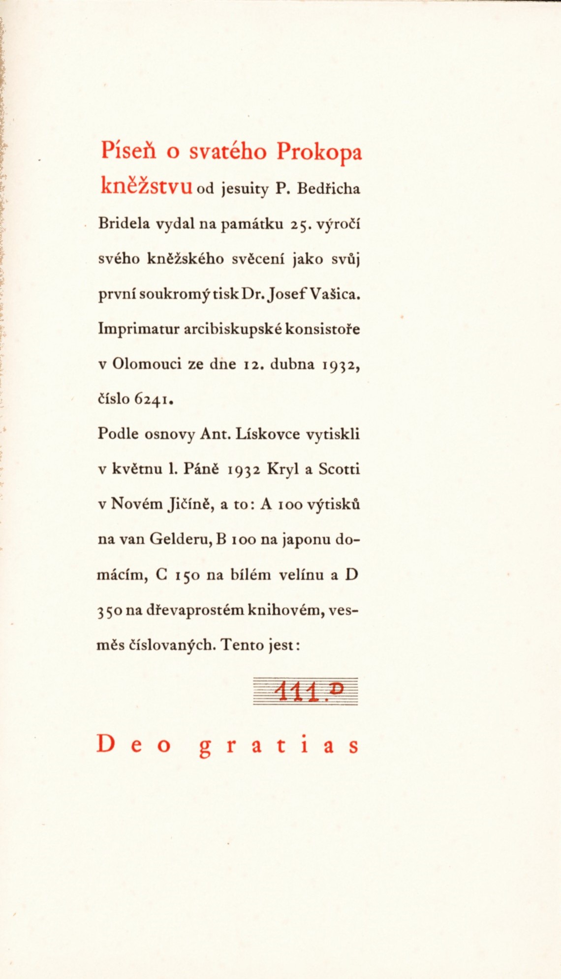 Názvové údaje Aus des Angelus Silesius Cherubinischem Wandersmann / [zusammengestellt von Ch. H. Kleukens] Autor Angelus Silesius, 1624-1677 (Autor) Další autoři Kleukens, Christian Heinrich, 1880-1954 (Sestavovatel, kompilátor) Korp. Insel-Verlag (nakladatelství) (Nakladatel, vydavatel) Breitkopf & Härtel (nakladatelství) (Tiskař) Nakladatel Leipzig : Insel-Verlag, [19--] Výrobce (Breitkopf & Härtel) Rozsah 45 s. Klíčová slova německá literatura * německá poezie * duchovní poezie * náboženská poezie * křesťanská poezie * barokní poezie * barokní literatura Počet ex. 1, z toho volných 1 Druh dok. monografie Signatura VHB 3524 Názvové údaje Cherubský poutník / Angelus Silesius ; [z německého originálu ...] přeložil Miroslav Matouš ; [obálka a grafika Adély Matasové] Autor Angelus Silesius, 1624-1677 (Autor) Další autoři Matouš, Miroslav, 1921-2021 (Překladatel) Matasová, Adéla, 1940- (Autor obálky) (Ilustrátor) Korp. Tiskařské závody, n.p. (Tiskař) Nakladatel [Praha] : Náboženská společnost československých Unitářů, 1984 Výrobce Tiskařské závody) Rozsah 159 s. Osobní hesla Angelus Silesius, 1624-1677 - slezský, německy píšící básník a mystik Klíčová slova náboženská literatura * náboženská poezie * duchovní literatura * duchovní poezie * barokní literatura * barokní poezie * křesťanská literatura * křesťanská poezie * křesťanská mystika * německy psaná literatura * německy psaná poezie * epigramy Počet ex. 1, z toho volných 1 Druh dok. monografie Signatura RSzpuk 0072 Názvové údaje Biblický třpyt v české poezii XX. století : ohlasy Nového zákona / Milan Balabán, Olga Nytrová ; [ilustrace Zdeněk Hajný] Osobní jméno Balabán, Milan, 1929-2019 (Autor) Další autoři Nytrová, Olga, 1949- (Autor) Hajný, Zdeněk, 1942-2014 (Ilustrátor) Nakladatel Davle : Kernberg Publishing, 2007 Rozsah 252 s. Klíčová slova Bible * Nový zákon * česká poezie * křesťanská poezie * literární náměty * stol. 20. * pojednání Počet ex. 1, z toho volných 1 Druh dok. monografie Signatura C12b 10536 Názvové údaje Chléb v kamení / Josef Berka ; [úprava a obálka F. J. Müllera] Osobní jméno Berka, Josef, 1909-1987 (Autor) Další autoři Müller, František Jan, 1896-1967 (Autor obálky) (Knižní grafik) Korp. Novina (firma) (Tiskař) Nakladatel V Praze : Novina, 1939 Výrobce Novina) Rozsah 47 s. Klíčová slova česká literatura * česká poezie * česká katolická poezie * křesťanská poezie * selský stav * venkov * venkovský život * český venkov * příroda Počet ex. 1, z toho volných 1 Druh dok. monografie Signatura VHB 0259 Názvové údaje Pokorná země / Josef Berka ; [frontispice a obálka - dřevoryty Jos. Hodka] Osobní jméno Berka, Josef, 1909-1987 (Autor) Další autoři Hodek, Josef, 1888-1973 (Autor obálky) (Ilustrátor) Čermák, Otakar, 1876-1939 (Nakladatel, vydavatel) Korp. Knihtiskárna Ot. Čermáka (Tiskař) Nakladatel V Klatovech : Nákladem a tiskem Ot. Čermáka, 1937 Rozsah 40 s. : il. Klíčová slova česká literatura * příroda * česká poezie * křesťanská poezie * venkov * selský stav * venkovský život * česká katolická poezie * český venkov Počet ex. 1, z toho volných 1 Druh dok. monografie Signatura VHB 0258 Názvové údaje Žluč a víno / Klement Bochořák Osobní jméno Bochořák, Klement, 1910-1981 (Autor) Další autoři Melantrich (nakladatelství : 1910-1950) (Tiskař) (Nakladatel, vydavatel) Nakladatel Praha : Melantrich, 1938 Rozsah 49 s. ; 21 cm Klíčová slova česká literatura * poezie * katolická literatura * katolická poezie * česká katolická poezie * křesťanská poezie * křesťanská literatura * básně Počet ex. 2, z toho volných 2 Druh dok. monografie Signatura C12b 14959, VHB 0282 Názvové údaje Slavík svatého Bonaventury / [překlad této středověké latinské a rýmované básně Svatého Bonaventury rozměrem originálu pořídil Oldřich Novotný ; původními dřevoryty ozdobil Josef Váchal ; knížku redigoval a vydal Vilém Bitnar] Autor Bonaventura, svatý, asi 1217-1274 (Autor) Další autoři Novotný, Oldřich, 1884-1959 (Překladatel) Váchal, Josef, 1884-1969 (Ilustrátor) (Dřevorytec) Bitnar, Vilém, 1874-1948 (Editor) (Nakladatel, vydavatel) Korp. Politika (tiskárna, nakladatelství) (Tiskař) Nakladatel [S. l.] : Nákladem Revue Meditace, 1910 Výrobce (V knihtiskárně Politiky) Rozsah 26 s. : il. Klíčová slova latinská literatura * bibliofilie * bibliofilské tisky * bibliofilský tisk * katolická literatura * křesťanská literatura * křesťanská poezie Počet ex. 1, z toho volných 1 Druh dok. monografie Signatura VHB 3157 Názvové údaje Píseň o svatého Prokopa kněžstvu / Bedřich Bridel Osobní jméno Bridel, Bedřich, 1619-1680 (Autor) Další autoři Lískovec, Antonín, 1894-1949 (Typograf) Vašica, Josef, 1884-1968 (Nakladatel, vydavatel) Korp. Kryl a Scotti (firma) (Tiskař) Nakladatel V Olomouci : Dr. Josef Vašica, 1932 Výrobce V Novém Jičíně : Kryl a Scotti Rozsah 24 stran ; 18 cm Osobní hesla Prokop, svatý, asi 985-1053 - duchovní, první opat Sázavského kláštera, zakladatel benediktinského klášteta Klíčová slova křesťanská literatura * křesťanská poezie * náboženská literatura * Bridel B. * duchovní literatura Počet ex. 3, z toho volných 3 Druh dok. monografie Signatura Holan 2162, VMartínek 1338, AHO 0077 Názvové údaje Noci bezmoci : studie o křesťanství a současné české poesii / Petr Cekota ; [typografickou úpravu a obálku navrhl Petr Palarčík ; redakce Pavel Šaradín] Osobní jméno Cekota, Petr, 1975- (Autor) Další autoři Palarčík, Petr, 1963- (Typograf) (Autor obálky) Šaradín, Pavel, 1969- (Editor) Korp. Votobia (nakladatelství) (Nakladatel, vydavatel) Nakladatel Olomouc : Votobia, 1997 Rozsah 87 s. Osobní hesla Cekota, Petr, 1975- - literární teoretik a hist