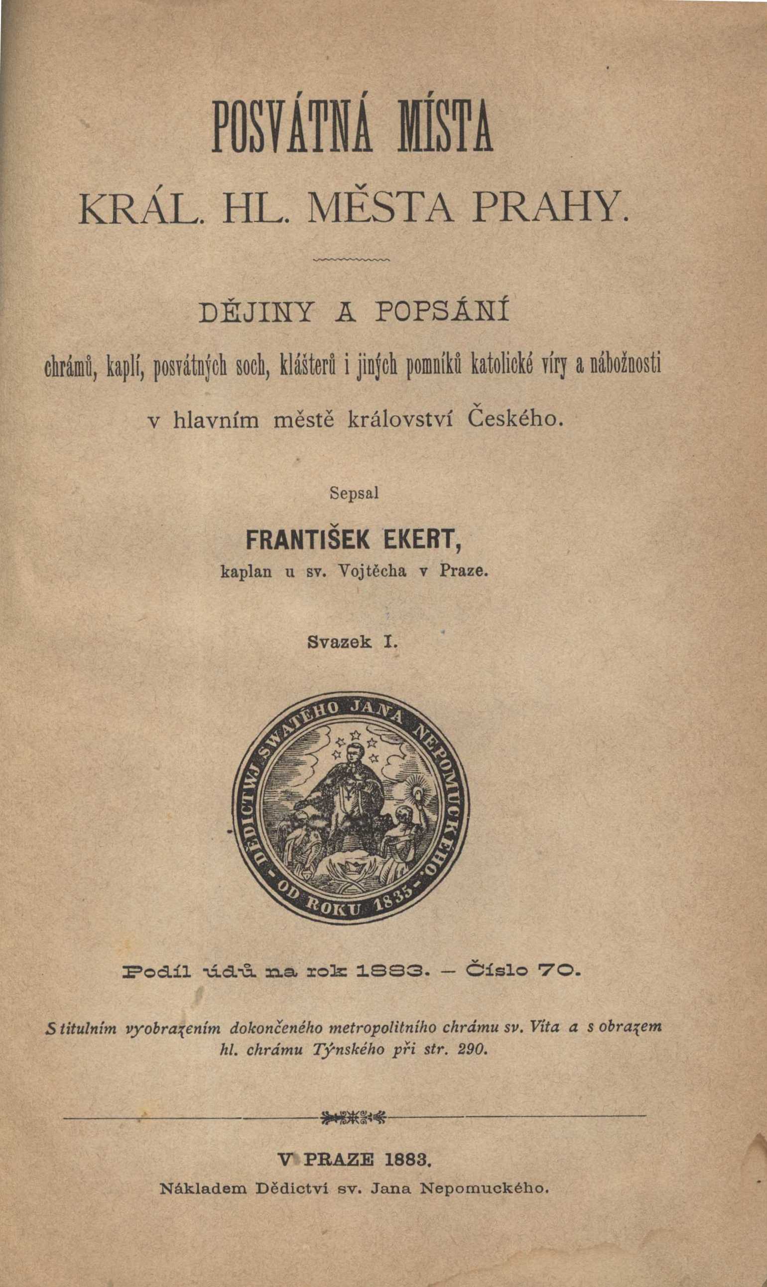 Názvové údaje Dominikánský kostel sv. Vavřince v Jablonném / Oldřich J. Blažíček, Pavel J. M. Preiss ; stať o zobrazování bl. Zdislavy napsal J. Šámal ; [obálku navrhl Petr Tučný] Osobní jméno Blažíček, Oldřich J. (Oldřich Jakub), 1914-1985 (Autor) Další autoři Preiss, Pavel, 1926-2023 (Autor) Šámal, Jindřich, 1902-1971 (Autor) Tučný, Petr, 1920-2012 (Autor obálky) Korp. Krystal (vydavatelství) (Nakladatel, vydavatel) Česká grafická Unie (tiskárna a nakladatelství) (Tiskař) Nakladatel V Olomouci : Krystal, 1948 Výrobce (Česká grafická Unie a. s.) Rozsah 32 s., [16] s. obr. příl. : il. Klíčová slova česká literatura * dějiny umění * náboženské památky * stavby * sakrální stavby * kostely * katolické kostely * dominikáni * dominikánský řád Počet ex. 1, z toho volných 1 Druh dok. monografie Signatura KaG LII D 141 Názvové údaje Pod tvými ochrannými křídly : od loretánského kostela k hrobce Dietrichsteinů v Mikulově / Dobromila Brichtová ; kresby Tereza Pirščová Brichtová (ilustrace a plánky), Petr Tybitanzl (rodokmen Dietrichsteinů) Osobní jméno Brichtová, Dobromila, 1948-2018 (Autor) Další autoři Pirščová-Brichtová, Tereza, 1978- (Ilustrátor) Tybitancl, Petr 1951- (Ilustrátor) Nakladatel Mikulov : Turistické informační centrum, 2014 Výrobce Brno : CCB, spol. s r. o. Rozsah 96 stran ; ilustrace (převážně barevné), portréty, plány, faksimile, 1 genealogická tabulka ; 21 cm Osobní hesla Dietrichstein, František, 1570-1636 - kardinál, politik na dvoře Rudolfa II. * Dietrichsteinové (rod). Heslo korporace (zkrác. heslo korp.) : Dietrichsteinská hrobka Klíčová slova katolické kostely * loretánské kaple * kardinálové * mariánský kult * hrobky * architektura * výzdoba * šlechtické rody * genealogie rodu * stručné biografie * Mikulov * Morava * Česko * stol. 16.-19. * přehledy Počet ex. 1, z toho volných 1 Druh dok. monografie Signatura C12b 16878 Názvové údaje Unter deinen schützenden Flügen : von der Loretto-Kirche zur Gruft der Familie Dietrichstein in Mikulov / Dobromila Brichtová ; [Übersetzung Blanka Michalisková ; Zeichnungen Tereza Pirščová Brichtová (Illustrationene und Planskizzen), Petr Tybitanzl (Stammbaum der Familie Dietrichstein) Osobní jméno Brichtová, Dobromila, 1948-2018 (Autor) Další autoři Pirščová-Brichtová, Tereza, 1978- (Ilustrátor) Michalisková, Blanka (Překladatel) Tybitancl, Petr 1951- (Ilustrátor) Nakladatel Mikulov : Turistické informační centrum, 2014 Výrobce CCB, spol. s r. o.) Rozsah 108 s. : il. (převážně barev.), portréty, plány, faksim., 1 genealog. tabulka Osobní hesla Dietrichsteinové (rod). * Dietrichstein, František, 1570-1636 - kardinál, politik na dvoře Rudolfa II. Heslo korporace (zkrác. heslo korp.) : Dietrichsteinská hrobka Klíčová slova katolické kostely * loretánské kaple * kardinálové * mariánský kult * hrobky * architektura * výzdoba * šlechtické rody * genealogie rodu * stručné biografie * Mikulov * Morava * Česko * stol. 16.-19. * přehledy Počet ex. 1, z toho volných 1 Druh dok. monografie Signatura C12b 15319 Názvové údaje Posvátná místa král. hl. města Prahy : dějiny a popsání chrámů, kaplí, posvátných soch, klášterů i jiných pomníků katolické víry a nábožnosti v hlavním městě království Českého. Svazek I / sepsal František Ekert Osobní jméno Ekert, František, 1845-1902 (Autor) Další autoři Dědictví sv. Jana Nepomuckého. 1875-1918 (Praha (Česko)) (Nakladatel, vydavatel) Bedřich Stýblo (firma) (Tiskař) Nakladatel V Praze : Nákladem Dědictví sv. Jana Nepomuckého, 1883 Výrobce Knihtiskárna B. Stýbla Rozsah 479, xiii stran, 1 strana obrázkové přílohy : fotografie ; 23 cm Geografické heslo Praha (Česko) Klíčová slova posvátná místa * poutní místa * církevní památky * církevní architektura * katolická víra * katolické kostely * pražské kostely * chrámy * kláštery * sochy * pražská předměstí * Nové Město (Praha) * Vyšehrad (Praha) * dějiny * průvodce * přehledy Počet ex. 2, z toho volných 2 Druh dok. monografie Signatura C12c 5233/1, C12b 19306 Názvové údaje Posvátná místa král. hl. města Prahy : dějiny a popsání chrámů, kaplí, posvátných soch, klášterů i jiných pomníků katolické víry a nábožnosti v hlavním městě království Českého. Svazek II / sepsal František Ekert Osobní jméno Ekert, František, 1845-1902 (Autor) Další autoři Dědictví sv. Jana Nepomuckého. 1875-1918 (Praha (Česko)) (Nakladatel, vydavatel) Bedřich Stýblo (firma) (Tiskař) Nakladatel V Praze : Nákladem Dědictví sv. Jana Nepomuckého, 1884 Výrobce Knihtiskárna B. Stýbla Rozsah 539, xiii stran, 1 list obrázkové přílohy : ilustrace ; 23 cm Geografické heslo Praha (Česko) Klíčová slova posvátná místa * poutní místa * církevní památky * církevní architektura * katolická víra * katolické kostely * pražské kostely * chrámy * kláštery * sochy * pražská předměstí * Nové Město (Praha) * Vyšehrad (Praha) * dějiny * průvodce * přehledy Počet ex. 2, z toho volných 2 Druh dok. monografie Signatura C12c 5233/2, C12b 19307 Názvové údaje Kostel Nejsvětějšího Srdce Páně / editor Zdenek Wasserbauer ; fotografie Martin Frouz ; [obálka a grafická úprava Jakub Krč] Osobní jméno Frouz, Martin, 1970- (Fotograf) Další autoři Wasserbauer, Zdenek, 1966- (Editor) Krč, Jakub, 1973- (Autor obálky) Korp. Nakladatelství Triton (Nakladatel, vydavatel) Protisk (tiskárna, České Budějovice) (Tiskař) Nakladatel Praha : Triton, 2012 [i.e. 2013] Výrobce Protisk) Rozsah 299 s. : il. (převážně barev.), portréty, plány, faksim. ; 31 cm Osobní hesla Plečnik, Jože, 1872-1957 - slovinský architekt Heslo korporace (zkrác. heslo korp.) : Kostel Nejsvětějšího Srdce Páně (Praha, Česko) Klíčová slova architektur