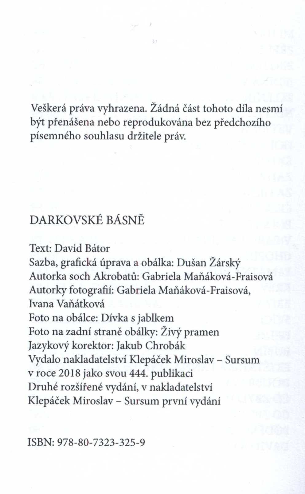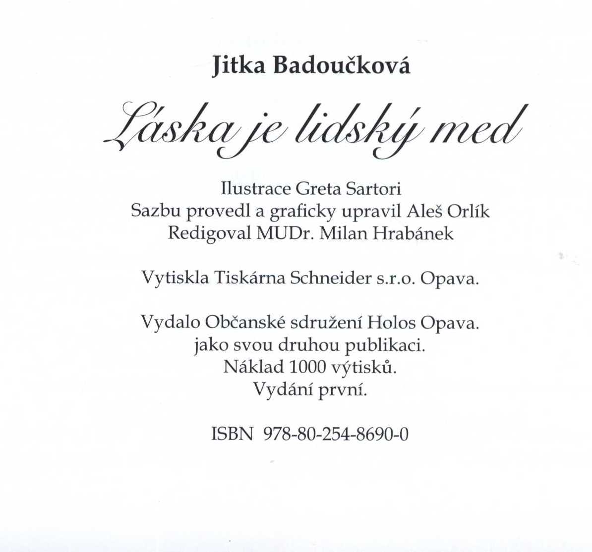 Názvové údaje Zakázané myšlenky / autorská skupina A.S.V Záhlaví-korpor. A.S.V. (autorská skupina) Nakladatel Tišnov : Sursum, 1998 Rozsah 106 s. : il. Klíčová slova česká poezie * lyrická poezie * básně Počet ex. 1, z toho volných 1 Druh dok. monografie Signatura C12b 8287 Názvové údaje Labyrint života / Eve Adams ; [obálka a ilustrace Cecílie Černochová] Osobní jméno Adams, Eve, 1957- (Autor) Další autoři Černochová, Cecílie (Autor obálky) (Ilustrátor) Nakladatel Petřvald : Vladimír Kostiha - Alisa, 2007 Výrobce Printo) Rozsah 119 s. : il. ; 22 cm Klíčová slova česká poezie * lyrická poezie * básně Počet ex. 2, z toho volných 2 Druh dok. monografie Signatura C12b 13368, C12b 13368a Názvové údaje Žalář smíchu : lyrika z let 1929-1932 / Jan Alda ; grafická úprava a kresba Jaroslava Krátkého Osobní jméno Alda, Jan, 1901-1970 (Autor) Další autoři Krátky, Jozef (Knižní grafik) Korp. Sdružení západočeských výtvarných umělců (Nakladatel, vydavatel) Nakladatel Plzeň : Sdružení západočeských výtvarných umělců, 1933 Rozsah 29 stran Klíčová slova česká poezie * lyrická poezie * básně * r. 1929-1932 * bibliofilie Počet ex. 1, z toho volných 1 Druh dok. monografie Signatura P 80 b 49 Názvové údaje --aniž ťala hlavou / Svatava Antošová ; [fotografií na frontispici vyzdobila V. Rybáková] Osobní jméno Antošová, Svatava, 1957- (Autor) Další autoři Rybáková, Viktorie, 1961- (Fotograf) Korp. Krásné nakladatelství (Nakladatel, vydavatel) Nakladatel Praha : Krásné nakladatelství, 1994 Výrobce T. Kotvalt) Rozsah 34 s. Klíčová slova česká literatura * lyrická poezie * sbírka básní * stol. 20., léta 90. Počet ex. 3, z toho volných 3 Druh dok. monografie Signatura M 220 g 44, C12a 647, RSzpuk 0566 Názvové údaje Zvon v pustě : básně / János Arany ; z maďarských originálů výbor uspořádal a poznámkami doprovodil Ladislav Hradský ; přeložili Kamil Bednář a Ladislav Hradský ; předmluvu napsal Richard Pražák ; graficky upravil František Muzika Osobní jméno Arany, János, 1817-1882 (Autor) Další autoři Bednář, Kamil, 1912-1972 (Překladatel) (Dedikátor) Hradský, Ladislav, 1911-1987 (Překladatel) Pražák, Richard, 1931-2010 (Autor úvodu atd.) Holan, Vladimír, 1905-1980 (Dedikant) Korp. Státní nakladatelství krásné literatury, hudby a umění (Nakladatel, vydavatel) Nakladatel Praha : Státní nakladatelství krásné literatury, hudby a umění 1957 Rozsah 154 stran Klíčová slova maďarská literatura * maďarští básníci * epická poezie * epické skladby * lyrická poezie * lyrické básně * balady Počet ex. 1, z toho volných 1 Druh dok. monografie Signatura Holan 603 Názvové údaje Ozvěny : [verše] / J. J. Balcárek Osobní jméno Balcárek, Jaroslav Josef, 1907-1984 (Autor) Nakladatel V Praze : Nakladatelství Aloisa Srdce, 1932 Výrobce (Orbis) Rozsah 67 s. Klíčová slova česká poezie lyrická poezie básně stol. 20., léta 30. Počet ex. 2, z toho volných 2 Druh dok. monografie Signatura C12b 7273, C12b 7273a Názvové údaje Visiony / Jindřich Beránek ; Výtv. doprov. Jan Konůpek ; Typogr. upr. Josef Sonberg ; Jan nakladatelPohořelý Osobní jméno Beránek, Jindřich, 1838-1907 (Autor) Další autoři Konůpek, Jan, 1883-1950 (Ilustrátor) Sonberg, Josef, 1892-1979 (Grafický technik) Pohořelý, Jan, 1913-1995 (Dedikátor) Pohořelý, Jan, 1913-1995 Nakladatel Praha : Jan Pohořelý, 1944 Rozsah 42 s. : il Osobní hesla Pohořelý, Jan, 1913-1995 - nakladatel a knihkupec * Pohořelý, Jan, 1913-1995 - nakladatel a knihkupec Klíčová slova česká literatura * lyrická poezie * báseň * stol. 20., léta 40. Počet ex. 1, z toho volných 1 Druh dok. monografie Signatura C12a 1340