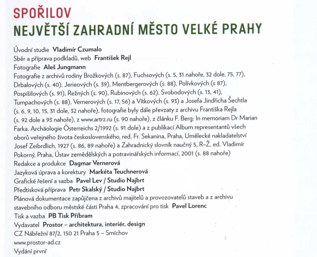 Názvové údaje Spořilov : komunita a její osobnosti / František Rejl, Dagmar Vernerová (eds). ; Jitka Bažantová, Jan Blüml, Eduard Burget, Marcela Buřilová, Vladimír Czumalo, Alice Dubská, Jana Fojtíková, Michal Jareš, Markéta Kabelková, Roman Kanda, Marie Klimešová, Kristina Kopáčková, Petr Koura, Jan Němec, Vlasta Reittererová, Jan Rous, Radomíra Sedláková, Petr Šámal, Dagmar Vernerová, Lucie Vlčková ; grafické řešení: Pavel Lev / Studio Najbrt. Osobní jméno Bažantová, Jitka (Autor) Další autoři Blüml, Jan, 1980- (Autor) Burget, Eduard, 1972-2023 (Autor) Buřilová, Marcela, (Autor) 1956- Czumalo, Vladimír, 1954-2024 (Autor) Dubská, Alice, 1938- (Autor) Fojtíková, Jana, 1944- (Autor) Jareš, Michal, 1973- (Autor) Kabelková, Markéta, 1962- (Autor) Kanda, Roman, 1976- (Autor) Klimešová, Marie, 1952- (Autor) Kopáčková, Kristina (Autor) Koura, Petr, 1978- (Autor) Němec, Jan, 1953- (Autor) Reittererová, Vlasta, 1947- (Autor) Rous, Jan, 1943- (Autor) Sedláková, Radomíra, 1950- (Autor) Šámal, Petr, 1972- (Autor) Vernerová, Dagmar, 1958- (Autor) (Editor) Vlčková, Lucie, 1975- (Autor) Rejl, František, 1938- (Editor) Branald, Adolf, 1910-2008 (Autor) Fárová, Anna, 1928-2010 (Autor doslovu, tiráže atd.) Lev, Pavel, 1954- (Knižní grafik) Korp. Prostor - architektura, interiér, design (nakladatelství) (Nakladatel, vydavatel) PBtisk (tiskárna) (Tiskař) (Vazač) Nakladatel Praha : Prostor - architektura, interiér, design, 2017 Výrobce Příbram : PB Tisk Rozsah 133 stran : ilustrace, portréty ; 21 cm Klíčová slova Spořilov (Praha) * městské části * komunity * osobnosti * medailony * biografie * slovníky Počet ex. 2, z toho volných 2 Druh dok. monografie Signatura C12b 17856, C12b 18845 Názvové údaje Kateřinky 1608-2008 : přehled dějin a rozvoje kdysi samostatné obce k 400. výročí jejího založení / Jiří Bock Osobní jméno Bock, Jiří (Autor) Nakladatel Liberec : Česká beseda v Liberci, 2008 Rozsah 54 s. : il. (některé barev.), mapy, faksim. ; 21 cm Geografické heslo Kateřinky (Liberec XVII, Česko) Klíčová slova Liberec * městské části * dějiny obce * vlastivěda * informační publikace * jubilejní sborník Počet ex. 1, z toho volných 1 Druh dok. monografie Signatura C12b 11482 Názvové údaje Zmizelá poezie opavských předměstí Jaktaře, Kateřinek a Kylešovic : ze soukromé sbírky Rudolfa Dybowicze / Jiří Siostrzonek Osobní jméno Siostrzonek, Jiří, 1954- (Autor) Další autoři Dybowicz, Rudolf (Sběratel) Korp. Grafico (tiskárna) (Tiskař) Nakladatel [Frýdek-Místek] : Lukáš Horký - Surbanz, 2018 Výrobce Opava : Grafico Rozsah 329 stran : ilustrace (některé barevné), portréty, faksimile ; 27 cm Klíčová slova Opava * městské části * Jaktař * Kateřinky * Kylešovice * vlastivěda kraje * historický místopis * historické pohlednice * soukromé sbírky * r. 1900-1945 * fotografická publikace Počet ex. 1, z toho volných 1 Druh dok. monografie Signatura C12c 5272 Názvové údaje Praha 4 Další autoři Malinová, Ivona (Knižní grafik) Nakladatel Praha : Informatorium, 2001 Výrobce [Havlíčkův Brod] : Tiskárny Havlíčkův Brod Rozsah 242 stran, 8 nečíslovaných stran obrazové přílohy : ilustrace, mapy, portréty ; 27 cm Klíčová slova Praha 4 * městské části * dějiny města * přehledy Druh dok. monografie Signatura Branald 0018 Názvové údaje Spořilov : největší zahradní město Velké Prahy / úvodní studie Vladimír Czumalo ; sběr a příprava podkladů, web František Rejl ; fotografie Aleš Jungmann Další autoři Czumalo, Vladimír, 1954-2024 (Autor úvodu atd.) Rejl, František, 1938- (Jiná role) Jungmann, Aleš, 1971- (Fotograf) Korp. Prostor - architektura, interiér, design (nakladatelství) (Nakladatel, vydavatel) PBtisk (tiskárna) (Tiskař) Nakladatel Praha : Prostor - architektura, interiér, design, 2015 Výrobce Příbram : PB Tisk Rozsah 95 stran : ilustrace (převážně barevné), portréty, plány ; 21 cm Klíčová slova Praha * Spořilov (Praha) * městské části * městská architektura * domy * bytová výstavba * moderní architektura * územní rozvoj * urbanismus * významné osobnosti * stol. 20. Počet ex. 1, z toho volných 1 Druh dok. monografie Signatura C12b 16616