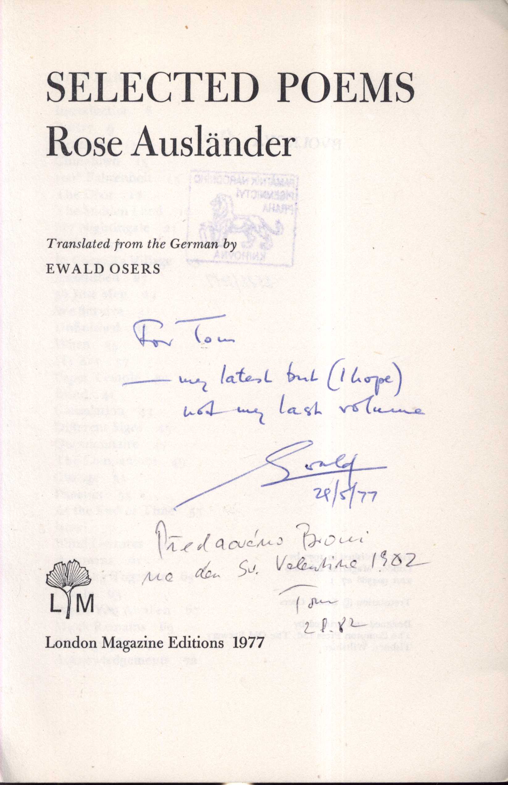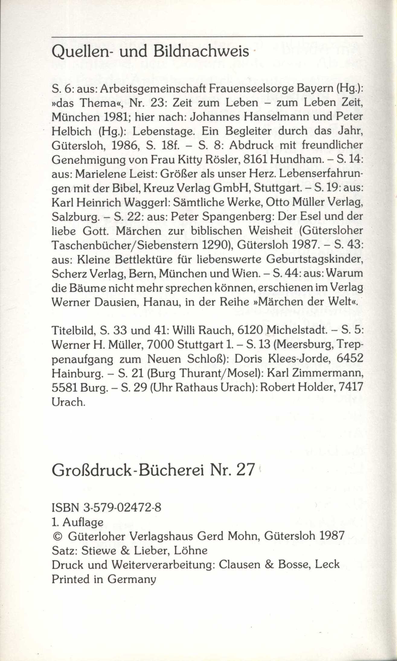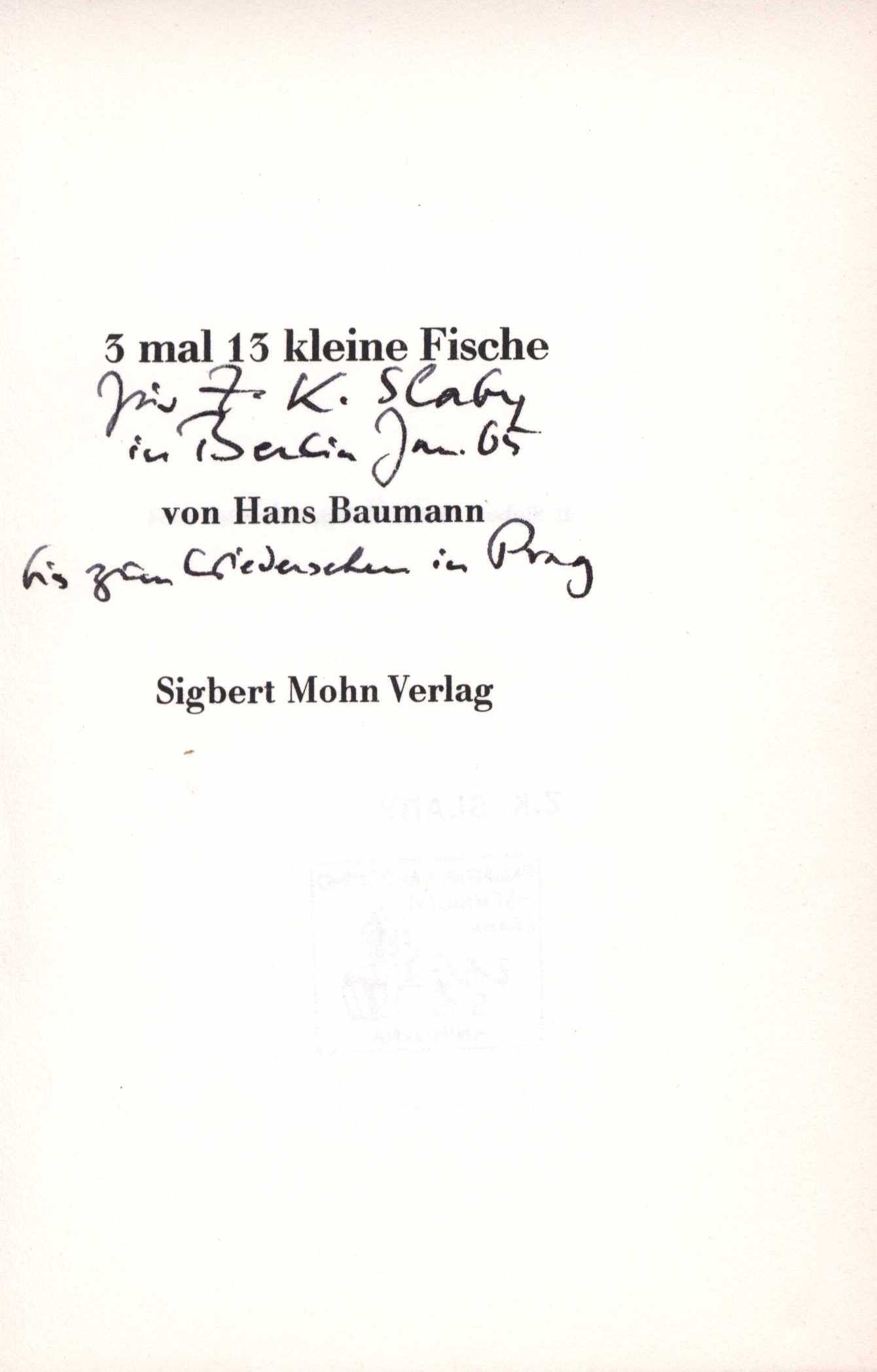 Názvové údaje Vom goldenen Kragen / Friedrich Adler ; [die Zeichnungen sind von Richard Teschner] Osobní jméno Adler, Friedrich, 1857-1938 (Autor) Další autoři Süssland, Walter (Dřívější majitel) Teschner, Richard, 1879-1948 (Ilustrátor) Korp. Carl Bellmann (nakladatelství) (Nakladatel, vydavatel) Nakladatel Prag : Carl Bellmann, 1907 Rozsah 32, [1] listů : il. ; 26 x 19 cm Klíčová slova německá literatura * německá poezie * rakouská literatura * poezie * bibliofilské tisky * bibliofilská vydání * bibliofilie * secese * přelom 19. a 20. stol. * r. 1907 Počet ex. 1, z toho volných 1 Druh dok. monografie Signatura KaG IV B 77 Názvové údaje Aus des Angelus Silesius Cherubinischem Wandersmann / [zusammengestellt von Ch. H. Kleukens] Autor Angelus Silesius, 1624-1677 (Autor) Další autoři Kleukens, Christian Heinrich, 1880-1954 (Sestavovatel, kompilátor) Korp. Insel-Verlag (nakladatelství) (Nakladatel, vydavatel) Breitkopf & Härtel (nakladatelství) (Tiskař) Nakladatel Leipzig : Insel-Verlag, [19--] Výrobce (Breitkopf & Härtel) Rozsah 45 s. Klíčová slova německá literatura * německá poezie * duchovní poezie * náboženská poezie * křesťanská poezie * barokní poezie * barokní literatura Počet ex. 1, z toho volných 1 Druh dok. monografie Signatura VHB 3524 Názvové údaje Der Cherubinische Wandersmann / Angelus Silesius ; [herausgegeben und mit einem Nachwort versehen von Hanns H. Bormann ; Einbandzeichnung und Buchschmuck von Rudolf Nicolai] Autor Angelus Silesius, 1624-1677 (Autor) Další autoři Bormann, Hanns Heinrich, 1895- (Editor) Nicolai, Rudolf, 1896-1974 (Knižní grafik) Korp. Deutsche Buch-Gemeinschaft (Nakladatel, vydavatel) A. Seydel & Cie (Berlin) (Tiskař) Nakladatel Berlin : Deutsche Buch-Gemeinschaft, [19--] Výrobce (A. Seydel & Cie) Rozsah 119 s. Klíčová slova německá literatura * německá poezie * barokní poezie * barokní literatura Počet ex. 1, z toho volných 1 Druh dok. monografie Signatura VHB 4037 Názvové údaje Cherubinský poutník : výbor : úvod do německé mystiky, zvláště do Cherubinského poutníka / Alois Lang ; [upravil V. H. Brunner] Autor Angelus Silesius, 1624-1677 (Autor) Další autoři Brunner, Vratislav Hugo, 1886-1928 (Grafický technik) Lang, Alois, 1869-1957 (Autor) (Překladatel) Holan, Vladimír, 1905-1980 (Autor podpisu) Korp. Ladislav Kuncíř (nakladatelství a knihkupectví) (Nakladatel, vydavatel) František Obzina (tiskárna, nakladatelství) (Tiskař) Nakladatel V Praze : Ladislav Kuncíř, 1922 Výrobce Frant. Obzina) Rozsah 233 s. ; 20 cm Klíčová slova česká literatura * německá literatura * německá poezie * barokní literatura * barokní poezie * výbor Počet ex. 2, z toho volných 2 Druh dok. monografie Signatura Holan 1707, VHB 0739 Názvové údaje Poutník cherubínský / Angelus Silesius ; rozměrem originálu přeložil a studii napsal Alois Lang ; vyzdobil Jan Konůpek Autor Angelus Silesius, 1624-1677 (Autor) Další autoři Lang, Alois, 1869-1957 (Překladatel) Konůpek, Jan, 1883-1950 (Ilustrátor) Korp. Meditace (Nakladatel, vydavatel) A. Lapáček (nakladatelství a knihtiskárna) (Tiskař) Nakladatel Praha : Meditace, 1909 Výrobce A. Lapáček Rozsah 187 stran Klíčová slova poezie * německá mystika * německá poezie * mystika * sbírka básní Počet ex. 1, z toho volných 1 Druh dok. monografie Signatura P 19 g 10 Názvové údaje Selected poems / Rose Ausländer ; traslated from the German by Ewald Osers Osobní jméno Ausländer, Rose, 1901-1988 (Autor) Další autoři Osers, Ewald, 1917-2011 (Překladatel) Nakladatel London : London Magazine Editions, 1977 Rozsah 72 stran ; 21 cm Klíčová slova německá literatura * německá poezie * dvojjazyčné vydání * výbor básní Počet ex. 1, z toho volných 1 Druh dok. monografie Signatura BVolkova 1303 Názvové údaje 3 mal 13 kleine Fische / von Hans Baumann Osobní jméno Baumann, Hans, 1914-1988 (Autor) (Dedikátor) Další autoři Slabý, Zdeněk Karel, 1930-2020 (Dedikant) Nakladatel Gütersloh : Sigbert Mohn Verlag, c1964 Rozsah 44 s. Klíčová slova německá poezie * básně Počet ex. 1, z toho volných 1 Druh dok. monografie Signatura ZKSlabý 0230 Názvové údaje Du krönst das Jahr : Geburtstagsgrüsse / Herausgegeben von Manfred Baumotte Osobní jméno Baumotte, Manfred, 1942- (Editor) Další autoři Gütersloher Verlagshaus (Nakladatel, vydavatel) Clausen & Bosse (tiskárna) (Tiskař) Nakladatel Gütersloh : Gütersloher Verlagshaus Gerd Mohn, 1987 Výrobce Leck : Clausen & Bosse Rozsah 46 stran : fotografie ; 19 cm Klíčová slova německá literatura * německá próza * německá poezie * náboženská četba Počet ex. 2, z toho volných 2 Druh dok. monografie Signatura JVladislav 197, JVladislav 2395