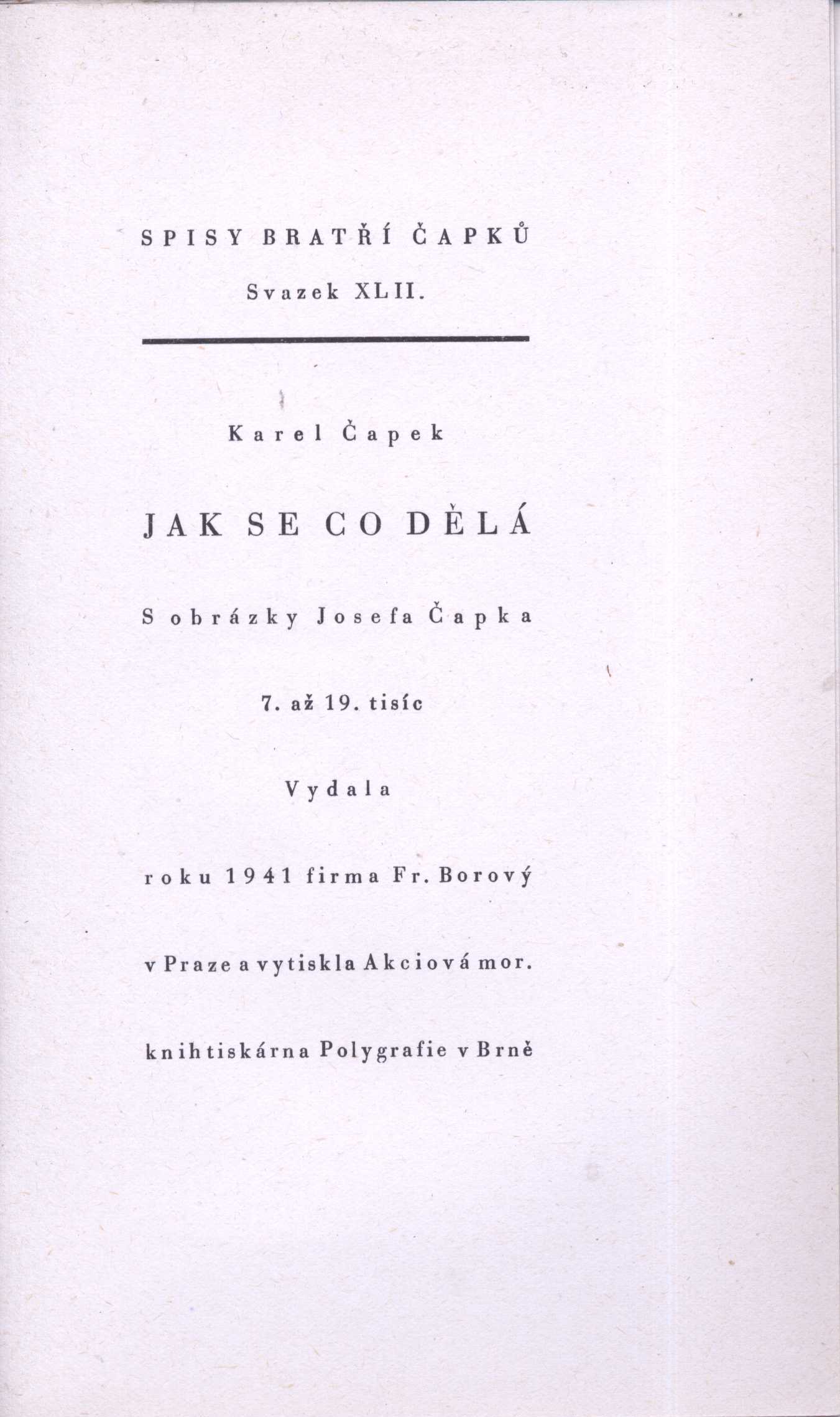 Názvové údaje Potulky pražského reportera / EDuard Bass ; frontispic nakreslil Ad. Hoffmeister ; typograficky knihu upravil Karel Svolinský Osobní jméno Bass, Eduard, 1888-1946 (Autor) Další autoři Hoffmeister, Adolf, 1902-1973 (Ilustrátor) Svolinský, Karel, 1896-1986 (Typograf) Korp. J. Otto (nakladatelství) (Nakladatel, vydavatel) Průmyslová tiskárna v Praze (Tiskař) Nakladatel V Praze : nakladatelství J. Otto, společnost s r. o., 1929 Výrobce [Praha] : Průmyslová tiskárna Rozsah 183 stran ; 20 cm Klíčová slova česká literatura * próza * články * Bass E. * stol. 20., léta 20. * Praha * reportáže * výbor * výbor článků * Lidové noviny Počet ex. 1, z toho volných 1 Druh dok. monografie Signatura Hoffmeister 0907 Názvové údaje Poetické noviny / Jana Bednářová Osobní jméno Bednářová, Jana, 1957- (Autor) Nakladatel Opočno : Prameny, 1992 Rozsah Nestr Osobní hesla Bednářová, Jana, 1957- - básnířka, spisovatelka Klíčová slova česká literatura * poezie * Poetické noviny * lyrickoepická poezie Počet ex. 2, z toho volných 2 Druh dok. monografie Signatura M 216 a 12, M 216 a 12a Názvové údaje Vývoj regionálního tisku na Kroměřížsku / [Vojtěch Březina] Osobní jméno Březina, Vojtěch, 1929-2019 (Autor) Rozsah 1997, číslo 5, s. 107-113 Klíčová slova česká literatura * bibliografie * periodika * tiskoviny * noviny * regionální tvorba * Kroměříž * Kroměřížsko * studie * r. 1848-1996 Počet ex. 1, z toho volných 1 Druh dok. separáty Signatura PK 0039 Názvové údaje Jak se co dělá ; O lidech / Karel Čapek ; [k vyd. připravil, vydavatel. poznámky napsal a vysvětlivky sestavil Miroslav Halík ; doslov napsal Ivan Klíma ; ilustrace Josefa Čapka ; graficky upravil, obálku, vazbu a předsádku navrhl Zdenek Seydl] Osobní jméno Čapek, Karel, 1890-1938 (Autor) Další autoři Halík, Miroslav, 1901-1975 (Editor) (Autor úvodu atd.) Klíma, Ivan, 1931-2025 (Autor úvodu atd.) Čapek, Josef, 1887-1945 (Ilustrátor) Seydl, Zdenek, 1916-1978 (Grafický technik) (Autor obálky) Korp. Československý spisovatel (nakladatelství) (Nakladatel, vydavatel) Nakladatel Praha : Československý spisovatel, 1960 Rozsah 318, [2] s. : il. ; 8° Klíčová slova česká literatura * společnost * lidé * vlastnosti * fejetony * sloupky * noviny * divadelní hry * film Počet ex. 2, z toho volných 2 Druh dok. monografie Signatura MUK 1306, P 42B41 Názvové údaje Jak se co dělá / Karel Čapek ; [s obrázky Josefa Čapka] Osobní jméno Čapek, Karel, 1890-1938 (Autor) Další autoři Čapek, Josef, 1887-1945 (Ilustrátor) Muzika, František, 1900-1974 (Výtvarník vazby) Korp. Fr. Borový (firma) (Nakladatel, vydavatel) Akciová moravská knihtiskárna Polygrafie (Tiskař) Nakladatel Praha : Fr. Borový, 1941 Výrobce Akciová mor. knihtiskárna Polygrafie) Rozsah 206 s. : il. Klíčová slova česká literatura * fejetony * noviny * film * divadlo * r. 1938 Počet ex. 1, z toho volných 1 Druh dok. monografie Signatura AFB 1457 Názvové údaje Jak se co dělá / Karel Čapek ; [s obrázky Josefa Čapka] Osobní jméno Čapek, Karel, 1890-1938 (Autor) Další autoři Čapek, Josef, 1887-1945 (Ilustrátor) Korp. Fr. Borový (firma) (Nakladatel, vydavatel) Akciová moravská knihtiskárna Polygrafie (Tiskař) Nakladatel Praha : Fr. Borový, 1941 Výrobce Akciová mor. knihtiskárna Polygrafie) Rozsah 206 s. : il. Klíčová slova česká literatura * fejetony * noviny * film * divadlo * r. 1938 Počet ex. 2, z toho volných 2 Druh dok. monografie Signatura AFB 1456, VHB 3678 Názvové údaje Jak se co dělá / Karel Čapek ; [s obrázky Josefa Čapka ; v obálce Fr. Muziky] Osobní jméno Čapek, Karel, 1890-1938 (Autor) Další autoři Čapek, Josef, 1887-1945 (Ilustrátor) Muzika, František, 1900-1974 (Autor obálky) Korp. Fr. Borový (firma) (Nakladatel, vydavatel) Akciová moravská knihtiskárna Polygrafie (Tiskař) Nakladatel Praha : Fr. Borový, 1938 Výrobce Akciová mor. knihtiskárna Polygrafie) Rozsah 206 s. : il. Klíčová slova česká literatura * fejetony * noviny * film * divadlo * r. 1938 Počet ex. 1, z toho volných 1 Druh dok. monografie Signatura AFB 1131 Názvové údaje Jak se co dělá / Karel Čapek ; S obr. Josefa Čapka ; V obál. Fr. Muziky Osobní jméno Čapek, Karel, 1890-1938 (Autor) Další autoři Čapek, Josef, 1887-1945 (Ilustrátor) Muzika, František, 1900-1974 (Grafický technik) Čapek, Karel, 1890-1938 (Dedikátor) Mukařovský, Jan, 1891-1975 (Dedikant) Čapek, Karel, 1890-1938 (Autor podpisu) Nakladatel Praha : Fr. Borový, 1938 Rozsah 206 s. : il Osobní hesla Čapek, Karel, 1890-1938 - spisovatel, dramatik, novinář * Mukařovský, Jan, 1891-1975 - literární vědec, estetik, pedagog * Čapek, Karel, 1890-1938 - spisovatel, dramatik, novinář Klíčová slova česká literatura * fejetony * noviny * film * divadlo * r. 1938 Počet ex. 4, z toho volných 4 Druh dok. monografie Signatura MUK 485, LK Janeček 884, LK Hora I 414, LK Václavek 1152 Názvové údaje Jak se dělají noviny / Karel Čapek Osobní jméno Čapek, Karel, 1890-1938 (Autor) Další autoři Lidová tiskárna (Brno, Česko) (Nakladatel, vydavatel) Akciová moravská knihtiskárna Polygrafie (Tiskař) Nakladatel V Brně : Lidová tiskárna, 1937 Výrobce (Akciová mor. knihtiskárna Polygrafie) Rozsah 37 s. Klíčová slova česká literatura * fejetony * noviny * film * divadlo * r. 1938 Počet ex. 1, z toho volných 1 Druh dok. monografie Signatura VHB 3680 Názvové údaje Tres profesiones al desnudo : Prensa. Cine. Teatro / Karel Chapek ; Traducción de Fernando Durán Osobní jméno Čapek, Karel, 1890-1938 (Autor) Další autoři Durán, Fernando (Překladatel) Nakladatel Barcelona : Editorial juventud, 1947 Rozsah 187 s. : il Osobní hesla Čapek, Karel, 1890-1938 - spisovatel, dramatik, novinář * Čapek, Karel, 1890-1938 - spisovatel, dramatik, novinář Klíčová slova česká 