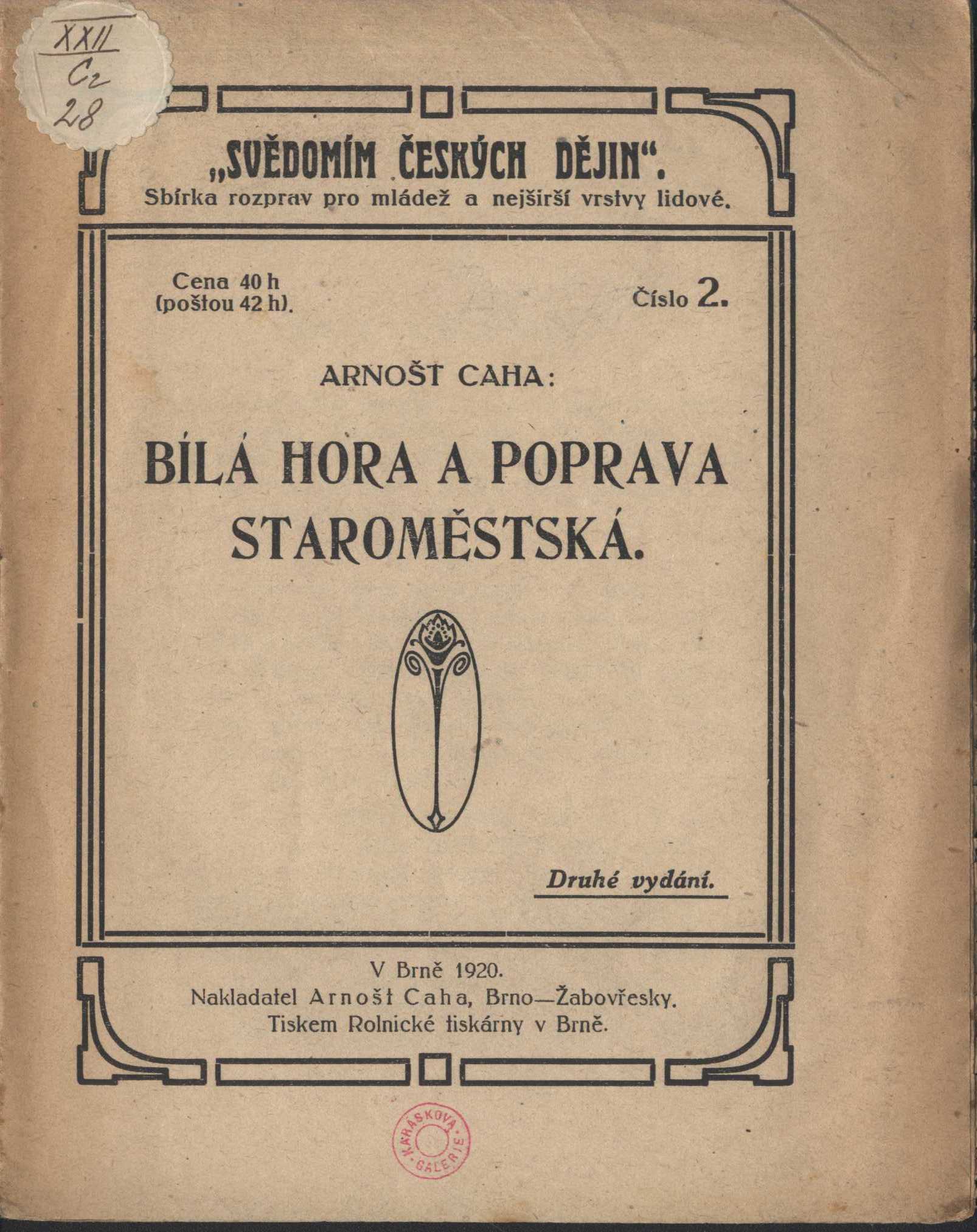 Názvové údaje Památník třicetileté činnosti bývalého Amerického klubu dam v Praze (1865-1895) : jejž založil Vojta Náprstek ... : k památce jeho 70. narozenin Záhlaví-korpor. Americký klub dam (Nakladatel, vydavatel) Další autoři F. Šimáček (nakladatelství, tiskárna) (Tiskař) Nakladatel V Praze : Nákladem vlastním, 1896 Výrobce (Tiskem F. Šimáčka) Rozsah [4], 159, [1] s., [10] listů obr. příl. : il. Heslo korporace (zkrác. heslo korp.) : Americký klub dam - český dámský spolek Klíčová slova česká literatura * česká kultura * stol. 19., léta 60.-90. * české spolky * ženské spolky * historie spolků * spolkový život * české ženy * osvěta * ženské hnutí * Náprstek V. Počet ex. 1, z toho volných 1 Druh dok. monografie Signatura KaG XLVII D2 49 Názvové údaje Blaho v zahradě kvetoucích broskví : o Juliu Zeyerovi / Bedřich Beneš Osobní jméno Beneš Buchlovan, Bedřich, 1885-1953 (Autor) Další autoři Kukaň, Václav, 1859-1925 (Dřívější majitel) Korp. Rolnická tiskárna (tiskárna) (Tiskař) Tělocvičná jednota Sokol. Bubeneč (Dřívější majitel) Nakladatel [S. l. : S. n.], 1918 Výrobce Tiskem Rolnické tiskárny) Rozsah 16 s. Osobní hesla Zeyer, Julius, 1841-1901 - básník, prozaik, dramatik, překladatel Klíčová slova česká literatura * básníci * životopisy * povídky * lumírovci * Zeyer J. * Vodňany * stol. 19. * osvěta Počet ex. 1, z toho volných 1 Druh dok. monografie Signatura KaG XXIV B 97 Názvové údaje Brixenský mučedník : o Karlu Havlíčkovi / Bedřich Beneš Osobní jméno Beneš Buchlovan, Bedřich, 1885-1953 (Autor) Další autoři Kukaň, Václav, 1859-1925 (Dřívější majitel) Korp. Rolnická tiskárna (tiskárna) (Tiskař) Tělocvičná jednota Sokol. Bubeneč (Dřívější majitel) Nakladatel [S. l. : S. n.], 1918 Výrobce Tiskem Rolnické tiskárny) Rozsah 16 s. Osobní hesla Havlíček Borovský, Karel, 1821-1856 - spisovatel, publicista a politik Klíčová slova česká literatura * básníci * životopisy * povídky * Brixen * Havlíček Borovský K. * stol. 19. * osvěta Počet ex. 1, z toho volných 1 Druh dok. monografie Signatura KaG XXIV B 97 Názvové údaje Kníže básníků : o Jaroslavu Vrchlickém / Bedřich Beneš Osobní jméno Beneš Buchlovan, Bedřich, 1885-1953 (Autor) Další autoři Kukaň, Václav, 1859-1925 (Dřívější majitel) Korp. Rolnická tiskárna (tiskárna) (Tiskař) Nakladatel [S. l. : S. n.], 1918 Výrobce Tiskem Rolnické tiskárny) Rozsah 16 s. Osobní hesla Vrchlický, Jaroslav, 1853-1912 - básník, dramatik, prozaik a překladatel Klíčová slova česká literatura * životopisy * povídky * lumírovci * básníci * Vrchlický J. * stol. 19. * osvěta Počet ex. 1, z toho volných 1 Druh dok. monografie Signatura KaG XXIV B 97 Názvové údaje Pět obrázků o Karlu Havlíčku Borovském / Bedřich Beneš-Buchlovan Osobní jméno Beneš Buchlovan, Bedřich, 1885-1953 (Autor) Další autoři Svoboda, Stanislav (Dřívější majitel) Korp. Státní nakladatelství (Nakladatel, vydavatel) Nakladatel V Praze : Státní nakladatelství, 1921 Rozsah 48 s. Osobní hesla Havlíček Borovský, Karel, 1821-1856 - spisovatel, publicista a politik Klíčová slova česká literatura * národní obrození * čeští básníci * čeští beletristé * osvěta Počet ex. 2, z toho volných 2 Druh dok. monografie Signatura KaG I D2 108, KaG XXXVIII D 56 Názvové údaje Věštec slovanský : o Janu Kollárovi / Bedřich Beneš Osobní jméno Beneš Buchlovan, Bedřich, 1885-1953 (Autor) Další autoři Kukaň, Václav, 1859-1925 (Dřívější majitel) Korp. Rolnická tiskárna (tiskárna) (Tiskař) Tělocvičná jednota Sokol. Bubeneč (Dřívější majitel) Nakladatel [S. l. : S. n.], 1919 Výrobce Tiskem Rolnické tiskárny) Rozsah 15 s. Osobní hesla Kollár, Ján, 1793-1852 - spisovatel a folklorista Klíčová slova česká literatura * básníci * životopisy * slovenská literatura * slovenská poezie * povídky * stol. 19. * Kollár J. * osvěta Počet ex. 1, z toho volných 1 Druh dok. monografie Signatura KaG XXIV B 97 Názvové údaje Z tanečních hodin : o Karolině Světlé / Bedřich Beneš Osobní jméno Beneš Buchlovan, Bedřich, 1885-1953 (Autor) Další autoři Kukaň, Václav, 1859-1925 (Dřívější majitel) Korp. Rolnická tiskárna (tiskárna) (Tiskař) Nakladatel [S. l. : S. n.], 1919 Výrobce Tiskem Rolnické tiskárny) Rozsah 15 s. Osobní hesla Světlá, Karolina, 1830-1899 - spisovatelka Klíčová slova česká literatura * životopisy * povídky * stol. 19. * osvěta Počet ex. 1, z toho volných 1 Druh dok. monografie Signatura KaG XXIV B 97 Názvové údaje Za mořem : o Jos. Václ. Sládkovi / Bedřich Beneš Osobní jméno Beneš Buchlovan, Bedřich, 1885-1953 (Autor) Další autoři Kukaň, Václav, 1859-1925 (Dřívější majitel) Korp. Rolnická tiskárna (tiskárna) (Tiskař) Nakladatel [S. l. : S. n.], 1918 Výrobce Tiskem Rolnické tiskárny) Rozsah 16 s. Osobní hesla Sládek, Josef Václav, 1845-1912 - básník a překladatel Klíčová slova česká literatura * básníci * životopisy * povídky * lumírovci * Sládek J. V. * stol. 19. * osvěta Počet ex. 1, z toho volných 1 Druh dok. monografie Signatura KaG XXIV B 97 Názvové údaje Politika / Josef Bubník Osobní jméno Bubník, Josef, 1879-1957 (Autor) Další autoři Lidová knihtiskárna J. Skalák a spol. (Tiskař) Ústřední dělnické nakladatelství a knihkupectví (Nakladatel, vydavatel) Nakladatel V Praze : Nákladem Ústředního dělnického nakladatelství a knihkupectví, 1920 Výrobce Lidová knihtiskárna J. Skalák a spol.) Rozsah 53 s. Klíčová slova česká literatura * česká politika * osvěta Počet ex. 1, z toho volných 1 Druh dok. monografie Signatura KaG II C2 75 Názvové údaje Bílá hora a poprava staroměstská / Arnošt Caha Osobní jméno Caha, Arnošt, 1891-1935 (Autor) (Nakladatel, vydavatel)