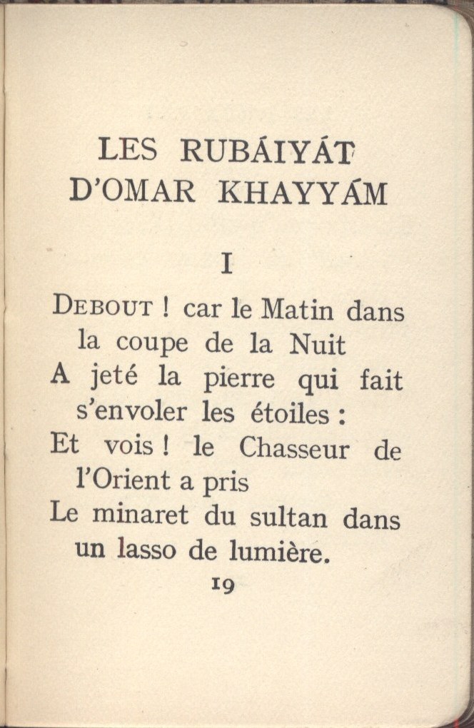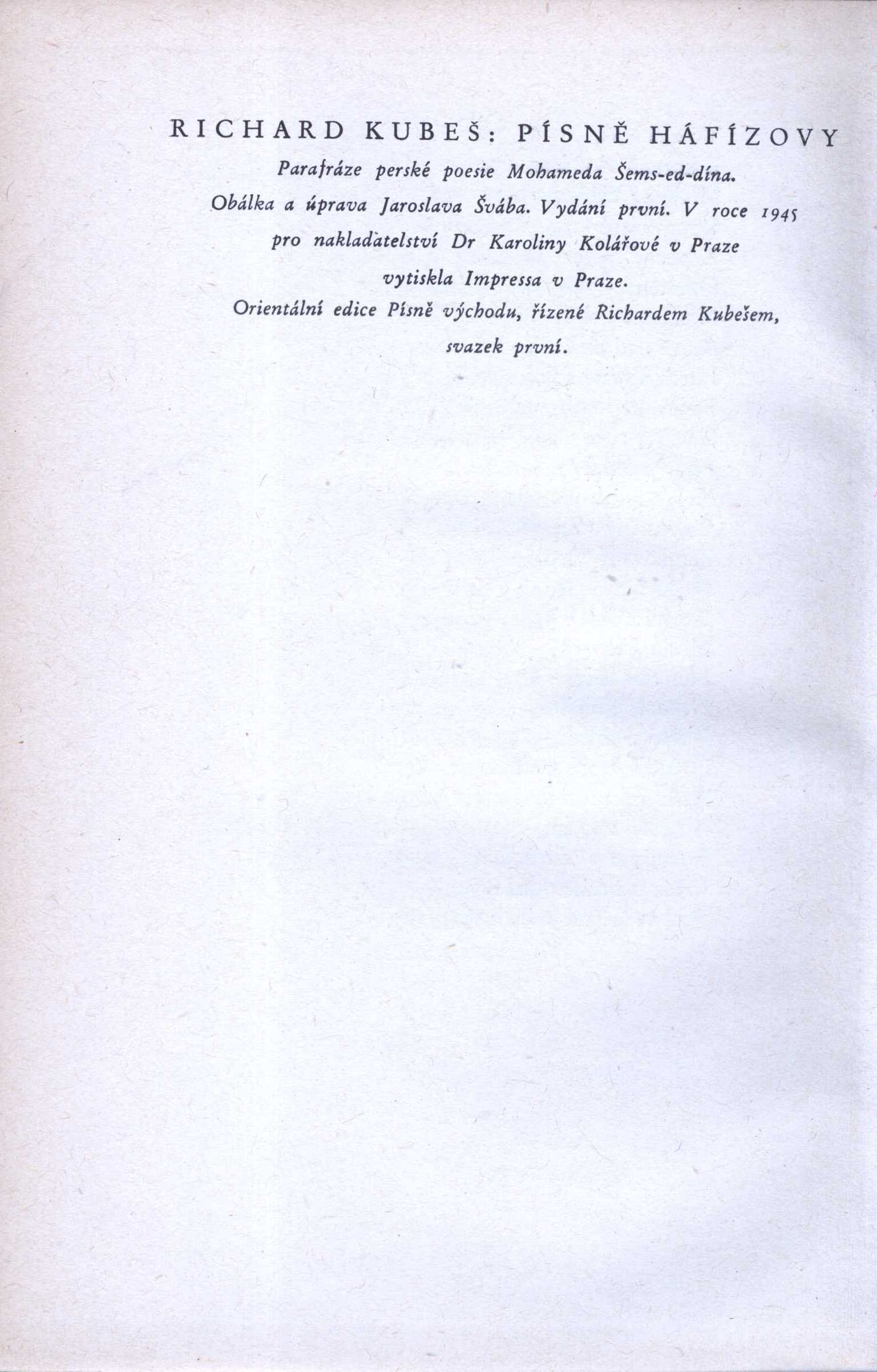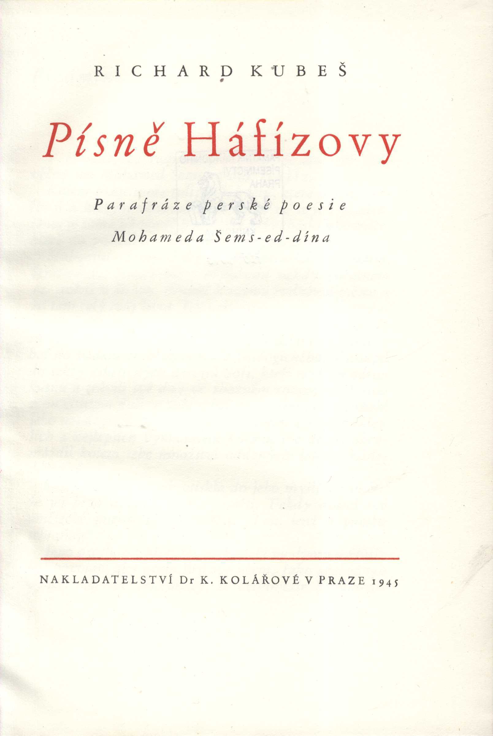 Názvové údaje Pláč Bábá Táhirův, čili, Rubá'iját Bábá Táhira Hamadáni ('Urján) / z perského tekstu vydaného s poznámkami a anglickým překladem od Edwarda Heron-Allena přeložil Josef Štýbr ; [upravil a frontispic vyryl O. Menhart] Autor Bábá Táhir Urján, činný 11. století (Autor) Další autoři Štýbr, Josef, 1864-1938 (Překladatel) Menhart, Oldřich, 1897-1962 (Knižní grafik) (Ilustrátor) Korp. Jan V. Pojer (Brno) (Nakladatel, vydavatel) Karel Kryl (firma : Nový Jičín, Česko) (Tiskař) Nakladatel Brno : Jan V. Pojer, 1938 Výrobce Karel Kryl) Rozsah ix, 61 s. ; 8° Klíčová slova perská poezie * verše * čtyřverší * stol. 11. * bibliofilie Počet ex. 2, z toho volných 2 Druh dok. monografie Signatura C12a 173, VMartínek 1144 Názvové údaje Zpěvák hamadánský / Bábá Táhir ; z perštiny přeložila, vyprávěním o básníkovi spojila a doslov napsala Věra Kubíčková ; vyzdobil Miloslav Troup ; vytiskl J. Picka Autor Bábá Táhir Urján, činný 11. století (Autor) Další autoři Kubíčková, Věra, 1918-2009 (Překladatel) (Autor úvodu atd.) (Autor doslovu, tiráže atd.) Troup, Miloslav, 1917-1993 (Ilustrátor) Picka, Jaroslav, 1897-1957 (Tiskař) Nakladatel [Česko] : J. Picka, [mezi 1945 a 1957] Rozsah 29 stran : barevné ilustrace ; 18,5 cm Klíčová slova Orient * perská poezie * středověká literatura * překlady poezie * překlady do češtiny * bibliofilie Počet ex. 1, z toho volných 1 Druh dok. monografie Signatura P 74 E 10 Názvové údaje Les Rubáíyát d'Omar Khayyám / Edward FitzGerald ; traduction française de Charles Grolleau Osobní jméno FitzGerald, Edward, 1809-1883 (Autor) Další autoři Grolleau, Charles , 1867-1940 (Překladatel) Omar Chajjám, 1048-1131 (Autor) Korp. Nelson (nakladatelství, Paříž, Francie) (Nakladatel, vydavatel) Richard Clay and Sons (Tiskař) Nakladatel Paris : Nelson, Éditeurs, [192-] Výrobce Richard Clay & Sons Ltd.) Rozsah 95 s. ; 9 cm Osobní hesla Omar Chajjám, 1048-1131 - perský matematik, astronom a fyzik, básník Klíčová slova perská literatura * perská poezie * poezie * překlad * francouzština Počet ex. 1, z toho volných 1 Druh dok. monografie Signatura Topič 0964 Názvové údaje Písně Háfízovy : parafráze perské poesie Mohameda Šems-ed-dína / Richard Kubeš ; [obálka a úprava Jaroslava Švába] Osobní jméno Háfíz, Chvádže Šamsuddín Muhammad, asi 1320-1390 (Autor) Další autoři Kubeš, Richard, 1920-1977 (Autor) (Autor adaptace, upravovatel) Šváb, Jaroslav, 1906-1999 (Autor obálky) (Knižní grafik) Korp. Karla Kolářová (nakladatelství) (Nakladatel, vydavatel) Impressa (tiskárna) (Tiskař) Nakladatel V Praze : K. Kolářové, 1945 Výrobce Impressa) Rozsah 98 s. Osobní hesla Háfíz, Chvádže Šamsuddín Muhammad, asi 1320-1390 - perský básník Klíčová slova perská literatura * perská poezie * parafráze * přebásnění Počet ex. 1, z toho volných 1 Druh dok. monografie Signatura KSynek 0027 Názvové údaje Z dívánu / Šamsuddín Muhammad Háfez ; [z perštiny přeložila a poznámku napsala Věra Kubíčková ; šesti barevnými kombinovanými technikami doprovodil Josef Istler ; graficky upravil Vladimír Viener ; o vydání pečoval Vladimír Beneš ; část nákladu byla vydána v umělecké vazbě Jiřího Faltuse] Osobní jméno Háfíz, Chvádže Šamsuddín Muhammad, asi 1320-1390 (Autor) Další autoři Beneš, Vladimír, 1932-2018 (Editor) Faltus, Jiří, 1911-1993 (Vazač) Kubíčková, Věra, 1918-2009 (Překladatel) Istler, Josef, 1919-2000 (Ilustrátor) Viener, Vladimír, 1935-2005 (Knižní grafik) Nakladatel Praha : Supraphon, 1986 Rozsah 68 s. : barev. il. ; 30 cm Klíčová slova perská poezie * bibliofilie Počet ex. 1, z toho volných 1 Druh dok. monografie Signatura Bbf VI 0013 Názvové údaje Poselství z Východu / Muhammad Ikbál ; z perského originálu Pajám-e mašrik, vydaného nakladatelstvím Sultan Book Depot v Hajdarábádu (Dakkhin) přeložil Jan Marek ; přebásnil Kamil Bednář ; ilustroval a typograficky upravil Miloslav Troup Osobní jméno Ikbál, Muhammad, Sir, 1877-1938 (Autor) Další autoři Bednář, Kamil, 1912-1972 (Překladatel) (Autor) Troup, Miloslav, 1917-1993 (Ilustrátor) Marek, Jan, 1931- (Překladatel) Korp. Nakladatelství Československé akademie věd (Nakladatel, vydavatel) Knihtisk (tiskárna) (Tiskař) Nakladatel Praha : Nakladatelství Československé akademie věd, 1960 Výrobce Knihtisk I Rozsah 45 stran, 4 listy nečíslovaných volně vložených obrazových příloh: ilustrace ; 20,5 cm Klíčová slova perská literatura * perská poezie * překlady * překlady básní * lyrika * přírodní lyrika * reflexivní básně Počet ex. 1, z toho volných 1 Druh dok. monografie Signatura P 140 C 46 Názvové údaje Hâfiz : jeho život a jeho básně / z pozůstalosti Jaromíra Košuta Osobní jméno Košut, Jaromír Břetislav, 1854-1880 (Autor) (Překladatel) Další autoři Vrchlický, Jaroslav, 1853-1912 (Překladatel) Korp. Nakladatelství Jan Otto (Nakladatel, vydavatel) J. Otto (knihtiskárna) (Tiskař) Nakladatel V Praze : nakladatel J. Otto, knihkupec, 1881 Výrobce Knihtiskárna J. otto Rozsah 45 stran ; 21 cm Osobní hesla Háfíz, Chvádže Šamsuddín Muhammad, asi 1320-1390 - perský básník Klíčová slova perská poezie * perští spisovatelé * verše * překlady básní * rozbory básní * biografie * stol. 14. * studie Počet ex. 1, z toho volných 1 Druh dok. monografie Signatura Patočka 0452 Názvové údaje Příběh panice : který se chtěl oddat rozkoši s milenkou v zahradě, ale pokaždé se vyskytla překážka / Nizámí ; [podle převodu z perštiny, který pořídil Jan Rypka ; přebásnil Vítězslav Nezval ; grafická úprava, obálka a vazba jsou provedeny podle návrhů Jindřicha Štyrského] Osobní jméno Nizámí, Iljás, asi 1141-1209 (Autor) Další autoři Rypka, Jan, 1886-1968 (Překladatel