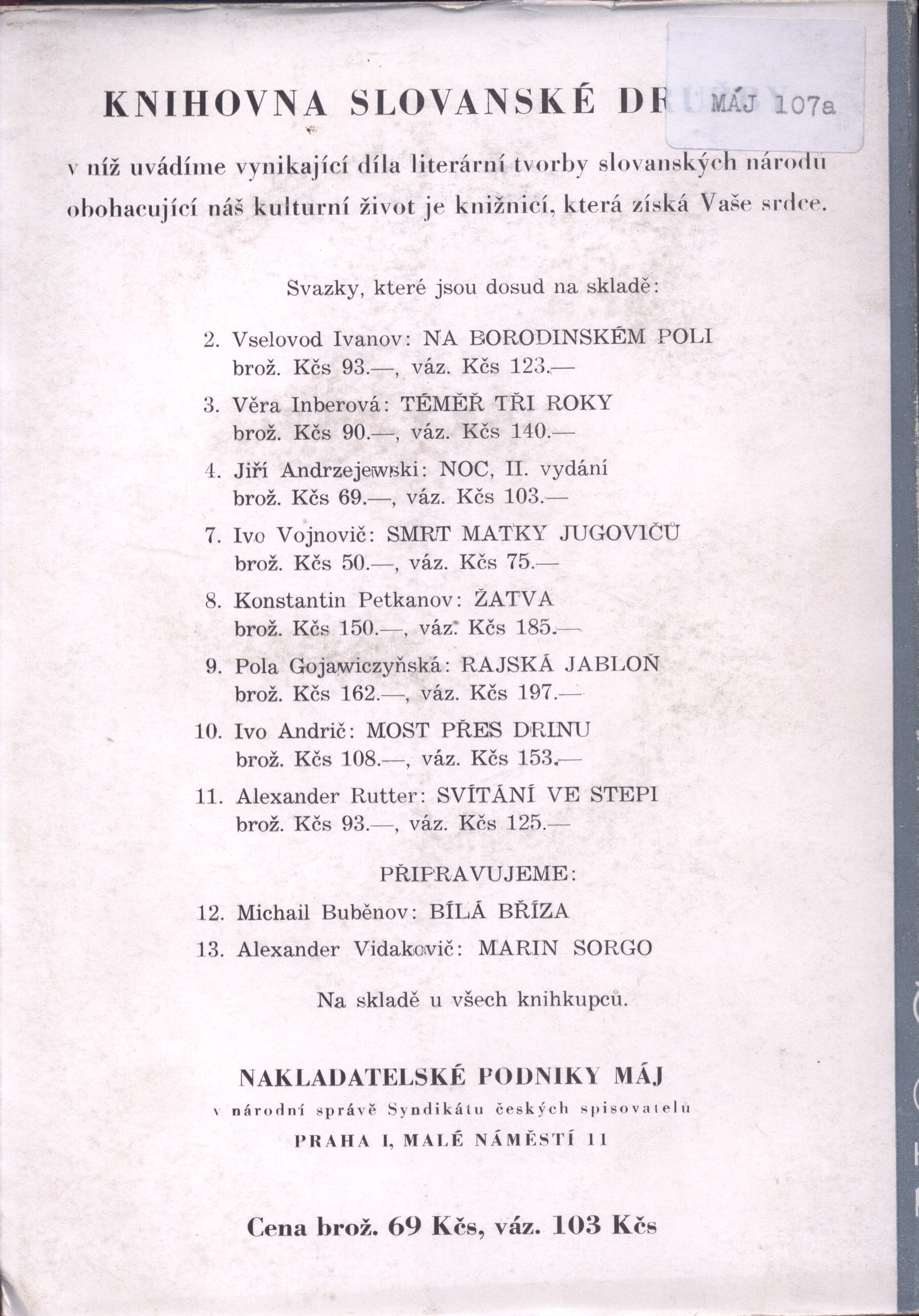 Názvové údaje XIV=14. aukce : Knihovna Arnošta Procházky : třetí část : 4. a 5. května 1928 : hotel "Beránek" na Kr. Vinohradech / [sestavili Miloslav Novotný a Karel Zink ; obálku a frontispic do dřeva ryl František Kobliha ; kromě obyčejného vydání vytištěno 50 exemplářů na holandském ručním papíru s původním leptem T. F. Šimona] Záhlaví-akce XIV=14. aukce (Knihovna Arnošta Procházky) (část třetí) (4.-5. 5. 1928 : Hotel Beránek, Praha, Česko) Další autoři Zink, Karel, 1889-1975 (Sestavovatel, kompilátor) (Nakladatel, vydavatel) (Autor podpisu) Novotný, Miloslav, 1894-1966 (Sestavovatel, kompilátor) (Autor podpisu) Kobliha, František, 1877-1962 (Autor obálky) (Grafický technik) (Ilustrátor) (Autor podpisu) Šimon, Tavík František, 1877-1942 (Grafický technik) Karásek ze Lvovic, Jiří, 1871-1951 (Autor podpisu) Korp. Karel Zink (Praha, Česko) (Nakladatel, vydavatel) Státní tiskárna v Praze (Tiskař) Nakladatel V Praze : Karel Zink, 1928 Výrobce (Tiskem Státní tiskárny) Rozsah [92] s., [2] l. obr. příl. : il. Osobní hesla Procházka, Arnošt, 1869-1925 - básník, esejista, literární a výtvarný kritik, překladatel Klíčová slova česká literatura * katalog * vzácné knihy * bibliofilie * autografy * aukce * katalog knih * vzácné tisky * aukční katalog * autografy spisovatelů * aukční katalog knih * bibliofilská vydání * bibliofilské tisky * věnování * světová literatura * francouzská literatura * německá literatura * holandská literatura * rakouská literatura * polská literatura * španělská literatura * portugalská literatura * italská literatura * stol. 20., léta 20. * r. 1928 * soukromé knihovny Počet ex. 1, z toho volných 1 Druh dok. monografie Signatura KaG XVII B 30/14 Názvové údaje Manžel ze šetrnosti : fraška ve třech jednáních / napsali Ad. Abrahamowicz a R. Ruszkowski ; z polského přeložil Arnošt Schvab Polabský Osobní jméno Abrahamowicz, Adolf, 1849-1899 (Autor) Další autoři Ruszkowski, Ryszard, 1856-1898 (Autor) Schwab-Polabský, Arnošt, 1860-1936 (Překladatel) Knapp, Mamert, 1837-1896 (Nakladatel, vydavatel) Nakladatel V Praze : M. Knapp, 1885 Rozsah 120 s. Klíčová slova polská literatura * dramata * divadelní hry * stol. 19., léta 80. Počet ex. 2, z toho volných 2 Druh dok. monografie Signatura DSK 002, DSK 002a Názvové údaje Adam Mickiewicz a Slované : materiály z mezinárodní vědecké konference uskutečněné v Ostravě ve dnech 29.-30. listopadu 2005 u příležitosti 150. výročí úmrtí Adama Mickiewicze / vědecký redaktor Mieczysław Balowski Záhlaví-akce Adam Mickiewicz a Slované (2005 : Ostrava, Česko) Další autoři Balowski, Mieczysław, 1956- (Editor) Korp. Ostravská univerzita. Filozofická fakulta Uniwersytet im. Adama Mickiewicza w Poznaniu (univerzita) Vilniaus Pedagoginis universitetas Nakladatel Ostrava : Ostravská univerzita, Filozofická fakulta, 2008 Rozsah 347 s. : barev. il. ; 21 cm Osobní hesla Mickiewicz, Adam, 1798-1855 - polský básník Klíčová slova polští spisovatelé * polská literatura * stol. 19. * sborníky z konferencí Počet ex. 1, z toho volných 1 Druh dok. monografie Signatura C12b 11599 Názvové údaje "Żywot Józefa ... " Mikołaja Reja : studium porównacze / Maria Adamczyk Osobní jméno Adamczyk, Maria, (Autor) 1938-2013 Další autoři Instytut Badań literackich (Polska Akademia Nauk) Zakład Narodowy imienia Ossolińskich (instituce, nakladatelství) (Nakladatel, vydavatel) Nakladatel Wrocław : Zakład Narodowy im. Ossolińskich, 1971 Rozsah 189 stran : tabulky Klíčová slova polská literatura * dramata Druh dok. monografie Názvové údaje Lietajúci mlyn / Alina Afanasjewa, Jerzy Afanasjew ; z polského originálu Czarodziejski młyn preložila Oľga Silnická ; ilustrácie Katarína Ševellová-Šuteková Osobní jméno Afanasjew, Alina, 1930-2018 (Autor) Další autoři Afanasjew, Jerzy, 1932-1991 (Autor) Silnická, Oľga (Překladatel) Ševellová-Šuteková, Katarína, 1948- (Ilustrátor) Korp. Mladé letá (firma) (Nakladatel, vydavatel) Nakladatel Bratislava : Mladé letá, 1978 Rozsah 70 strab : ilustrace Klíčová slova polská literatura * pohádky * literatura pro děti Počet ex. 1, z toho volných 1 Druh dok. monografie Signatura Z H 2a 35 Názvové údaje Začarovaný mlýn : pro děti od 5 let / Alina a Jerzy Afanasjewovi ; z polštiny přeložil Jan Pišta ; ilustroval František Skála jr ; graficky upravil Otakar Karlas Osobní jméno Afanasjew, Alina, 1930-2018 (Autor) Další autoři Afanasjew, Jerzy, 1932-1991 (Autor) Pišta, Jan, (Překladatel) 1937- Skála, František, 1956- (Ilustrátor) Korp. Nakladatelství Albatros (Nakladatel, vydavatel) Nakladatel Praha : Albatros, 1987 Výrobce Hradištko pod Medníkem : OTK Rozsah 72 stran : ilustrace ; 24 cm Klíčová slova polská literatura * pohádky * literatura pro děti Počet ex. 1, z toho volných 1 Druh dok. monografie Signatura F I 5082 Názvové údaje Lov na smrtihlava / Joe Alex ; [z polského originálu ... přeložila Anetta Balajková ; obálku navrhl Zdeněk Majzner ; typografie Vlasta Machová] Osobní jméno Alex, Joe, 1920-1998 (Autor) Další autoři Balajková, Anetta, 1923-2002 (Překladatel) Majzner, Zdeněk, 1932- (Autor obálky) Machová, Vlasta (Typograf) Korp. Melantrich (nakladatelství) (Nakladatel, vydavatel) Nakladatel Praha : Melantrich, 1980 Výrobce (Mír 3) Rozsah 139 s. ; 8° Klíčová slova polská literatura * překlad * próza * detektivní román Počet ex. 1, z toho volných 1 Druh dok. monografie Signatura MEL 1926 Názvové údaje Noc : povídky / Jiří Andrzejewski ; [z polského originálu ... přeložila Helena Teigová ; s obálkou Josefa Říhy] Osobní jméno Andrzejewski, Jerzy, 1909-1983 (Autor) Další autoři Teigová, Helena, 1902-1986 (Překladatel) Říha, Josef, 1920-1994 (Autor obálky) Korp. Máj (nakladatelství) (Nakladatel, vydavate