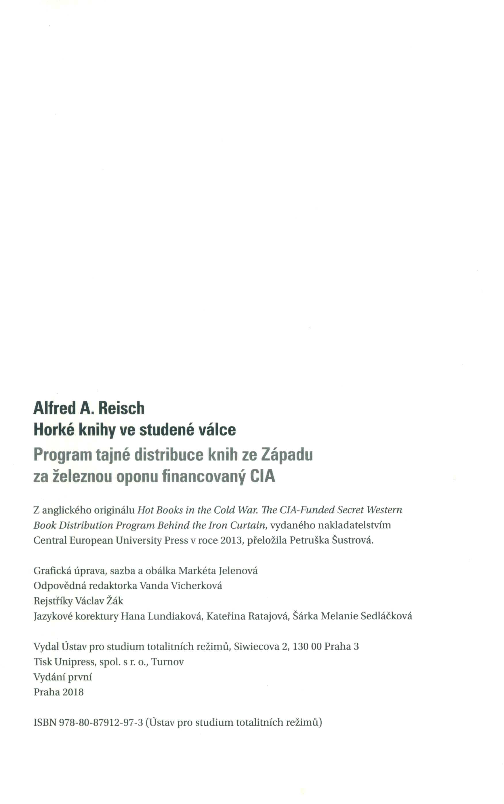 Názvové údaje Academia 1966-2016 : výroční sborník s kompletní bibliografií Záhlaví-korpor. Academia (nakladatelství) (Autor) Další autoři Müllerová, Eliška, 1986- (Sestavovatel, kompilátor) Kubec, Daniel, 1988- (Sestavovatel, kompilátor) (Autor komentáře) Troják, Jakub, 1978- (Autor obálky) (Sazeč) Korp. Academia (nakladatelství) (Nakladatel, vydavatel) Akademie věd České republiky. Středisko společných činností (Nakladatel, vydavatel) Serifa (Praha) (Tiskař) Nakladatel Praha : Academia, 2016 Výrobce Praha : Serifa, s. r. o. Rozsah 338 stran ; 24 cm Heslo korporace (zkrác. heslo korp.) : Academia (nakladatelství) Chronologie 20.-21. století Předmětová hesla nakladatelství a vydavatelství - Česko - 20.-21. století * vydávání a distribuce knih - Česko - 20.-21. století * publishing houses - Czechia - 20th-21st centuries * publishing and bookselling - Czechia - 20th-21st centuries Klíčová slova bibliografie * česká nakladatelství * jubilejní sborník * r. 1966-2016 * Academia Počet ex. 2, z toho volných 1, prezenčně 1 Druh dok. monografie Signatura MetC 0228, LITc 0767 Názvové údaje SNKLU Odeon : 1953-1994 / Nikola Klímová Osobní jméno Klímová, Nikola, 1990- (Autor) Další autoři Vysoká škola uměleckoprůmyslová. Ateliér tvorby písma a typografie (Jiná role) Typo 305 (nakladatelství) (Nakladatel, vydavatel) QT STUDIO s.r.o. (grafické studio) (Tiskař) Nakladatel [Praha] : Typo 305, 2015 Výrobce [Praha] : QT studio s.r.o. Rozsah 223 stran : barevné ilustrace ; 26 cm Heslo korporace (zkrác. heslo korp.) : Státní nakladatelství krásné literatury a umění * Odeon (nakladatelství) Chronologie 1953-1994 Klíčová slova česká literatura * studentské práce * obrazové publikace * přehledy * nakladatelské edice * knižní design * knižní obálky * SNKLU * Odeon * r. 1953-1995 * Nejkrásnější české knihy * r. 2015 Počet ex. 1, z toho volných 1 Druh dok. monografie Signatura NK/15 051 Názvové údaje Paratexty a česká nakladatelství : (knižní strategie v 90. letech 20. století) / Lenka Müllerová Osobní jméno Müllerová, Lenka, 1965- (Autor) Další autoři LITTERAE (nakladatelství) (Nakladatel, vydavatel) Tribun EU (firma) (Tiskař) Nakladatel Kostelec nad Orlicí : LITTERAE, 2010 Výrobce Brno : Tribun EU s. r. o. Rozsah 231 stran : ilustrace ; 21 cm Předmětová hesla paratexts * paratexts - Czechia - 1991-2000 * book production - Czechia - 1991-2000 * publishing and bookselling - Czechia - 1991-2000 Klíčová slova česká literatura * studie * literární věda * paratexty * nakladatelství * vydavatelství * knižní produkce * vydávání knih * distribuce knih * Evropa * Česko * r. 1991-2000 Počet ex. 1, z toho volných 1 Druh dok. monografie Signatura C12b 18860 Názvové údaje Český historický ústav v Římě : stav a perspektivy ediční činnosti = L'Istituto Storico Ceco di Roma : situazione e prospettive dell'attività editoriale = The Czech Historical Institute in Rome : the status and perspectives of ediorial activities / Jaroslav Pánek a kolektiv ; typografie a technická redakce Petr Čížek Osobní jméno Pánek, Jaroslav, 1947- (Autor) (Editor) (Autor komentáře) Další autoři Čížek, Petr, 1971- (Typograf) Korp. Historický ústav AV ČR (Nakladatel, vydavatel) Istituto storico ceco di Roma (historický ústav) (Nakladatel, vydavatel) Nakladatelství Historický ústav (Tiskař) Nakladatel Praha : Historický ústav AV ČR ; Roma : Český historický ústav v Římě, 2018 Výrobce Praha : Nakladatelství Historický ústav Rozsah 223 stran ; 22 cm Heslo korporace (zkrác. heslo korp.) : Istituto storico ceco di Roma (historický ústav) Předmětová hesla research institutions - Italy * historical institutes - Italy * historiography - Italy * publication activity - Italy * publishing - Italy * historical sources - Vatican City * historical sources - Italy * church history Geografické heslo Rome (Italy) Klíčová slova česká literatura * kolektivní monografie * vědecké ústavy * zahraniční ústavy * činnost * církevní dějiny * historiografie * historické prameny * výzkum * publikační činnost * vydavatelská činnost * Vatikán * Řím, město * Itálie * r. 1994-2018 Počet ex. 1, z toho volných 1 Druh dok. monografie Signatura C12b 18495 Názvové údaje Horké knihy ve studené válce : program tajné distribuce knih ze Západu za železnou oponu financovaný CIA / Alfred A. Reisch ; z angličtiny přeložila Petruška Šustrová ; grafická úprava, sazba a obálka Markéta Jelenová Osobní jméno Reisch, Alfred A. (Alfred Alexander), 1931-2013 (Autor) Další autoři Šustrová, Petruška, 1947-2023 (Překladatel) Jelenová, Markéta, 1970- (Knižní grafik) (Sazeč) (Autor obálky) Korp. Ústav pro studium totalitních režimů (vědecký ústav) (Nakladatel, vydavatel) Unipress (tiskárna) (Tiskař) Unifikovaný název Hot books in the Cold War. Česky Nakladatel Praha : Ústav pro studium totalitních režimů, 2018 Výrobce Turnov : Unipress, spol. s r.o. Rozsah 444 stran : ilustrace (některé barevné), portréty, faksimile ; 25 cm Chronologie 1957-1980 Předmětová hesla publishing and bookselling - United States - 1948-1989 * exchange of documents - United States - 1948-1989 * international programs and projects - United States - 1948-1989 * East and West * cold war (1945-1989) * censorship - Europe, Central and Eastern - 1948-1989 * prohibited books - Europe, Central and Eastern - 1948-1989 * propaganda - United States - 1948-1989 * anti-communism - United States - 1948-1989 Klíčová slova americká literatura * překlad * politika * antikomunismus * propaganda * studená válka * cenzura * zakázané knihy * vydávání knih * distribuce knih * výměna publikací * mezinárodní projekty * východní Evropa * střední Evropa * západ * Spojené státy americké * r. 1948-1989 Počet ex. 1, z toho volných 