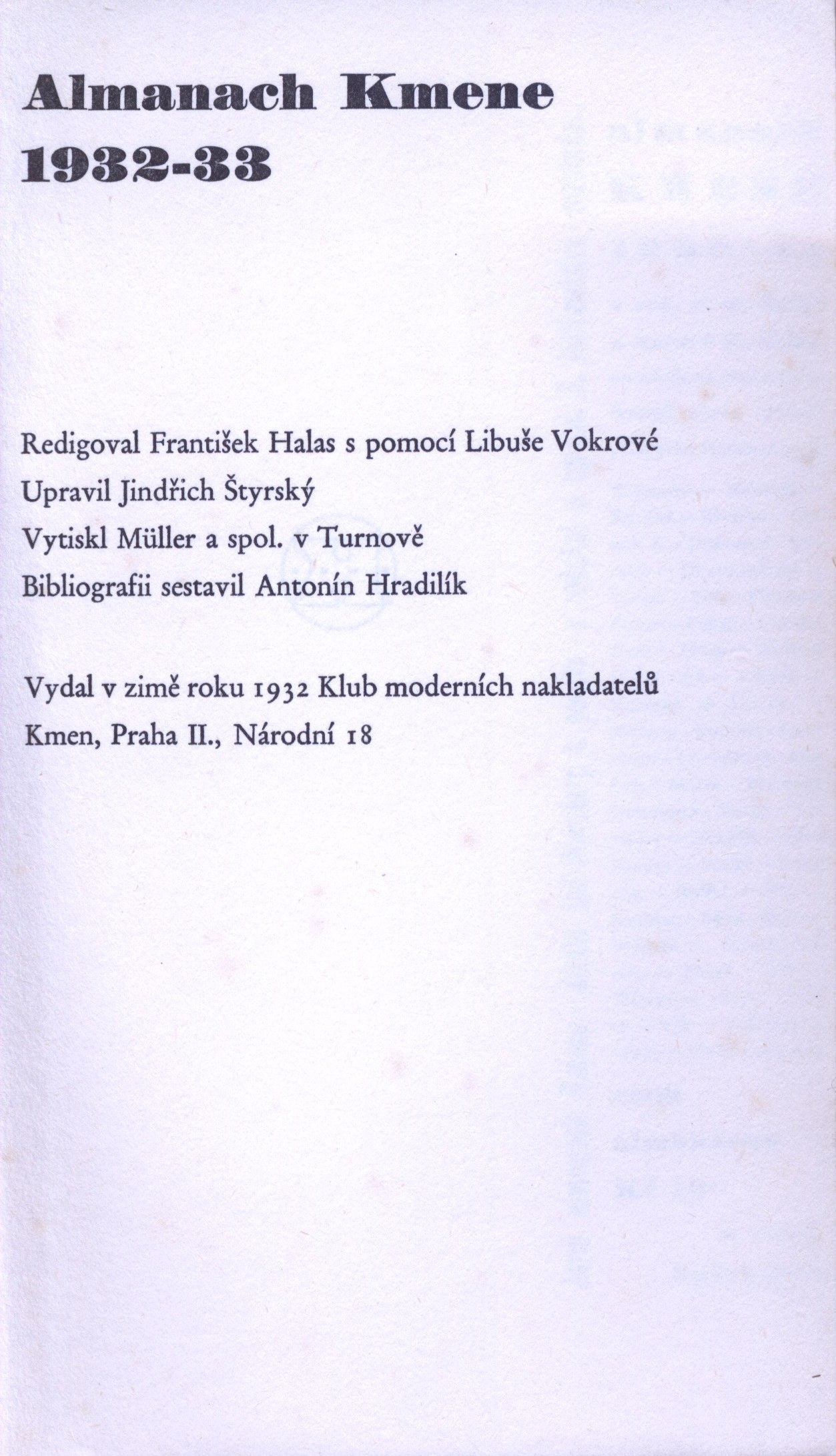Názvové údaje Spisy. IV, Červenec 1932 - září 1933 / Klement Gottwald ; redakce: Ústav dějin KSČ ; graficky upravil F. Muzika Osobní jméno Gottwald, Klement, 1896-1953 (Autor) Další autoři Muzika, František, 1900-1974 (Knižní grafik) Korp. Ústav dějin KSČ (Redaktor, výkonný redaktor) Nakladatelství Svoboda (Nakladatel, vydavatel) Svoboda (tiskárna) (Tiskař) Nakladatel Praha : Svoboda, 1951 Výrobce Svoboda, n.p., závod 1 Rozsah 301 stran, 3 nečíslované strany obrazových příloh : ilustrace ; 21 cm Osobní hesla Gottwald, Klement, 1896-1953 - komunistický funkcionář, prezident Klíčová slova Gottwald K. * politická publicistika * sebrané spisy * projevy * stati * články * r. 1932-1933 Počet ex. 4, z toho volných 5 Druh dok. monografie Signatura Branald 0334/IV, M 45 b 4, M 45 b 21, M 51 h 18, J Y VI 3/IV Názvové údaje Hořec / František Halas ; s frontispicem od Toyen ; upravil, obálku a vazbu navrhl Jindřich Štyrský Osobní jméno Halas, František, 1901-1949 (Autor) (Dedikátor) (Autor podpisu) Další autoři Toyen, 1902-1980 (Ilustrátor) Štyrský, Jindřich, 1899-1942 (Knižní grafik) (Autor obálky) (Výtvarník vazby) Klika, Břetislav Maria, 1884-1958 (Editor) Portman, Josef, 1893-1968 (Dedikant) Korp. Družstevní práce (nakladatelství) (Nakladatel, vydavatel) Orbis (tiskárna) (Tiskař) Nakladatel V Praze : Vydavatelstvo Družstevní práce, 1934 Výrobce V Praze : Knihtiskárna Orbis, 1934 Rozsah 48 stran : ilustrace Klíčová slova česká poezie * dramatické básně * sbírka básní * česká literatura * r. 1932-1933 Počet ex. 14, z toho volných 14 Druh dok. monografie Signatura N/A, LK P XXIX ch 41, LK P 66 F 4, LK P 99 D 32, LK P 134 G 72, LK M 181 f 70, LK JANEČEK 897, LK P 43 D 46, LK P 135 B 70, LK VÁCLAVEK 998, LK M 174 f 42, LK HORA I 479, C12b 15244, KaG LXV 322 Názvové údaje Šaldův zápisník : list pro poesii, politiku a život / František Xaver Šalda. Osobní jméno Šalda, F. X., 1867-1937 (Autor) Další autoři Otto Girgal (nakladatelství) (Nakladatel, vydavatel) Dr. Ed. Grégr (nakladatelství, tiskárna) (Tiskař) Roč., číslo Ročník 5, číslo 1-14, 1932/1933 Nakladatel Praha : Otto Girgal, 1932-1933 Výrobce Ed. Grégr Osobní hesla Šalda, F. X., 1867-1937 - výtvarný a literární kritik, estetik, básník, dramatik, překladatel Klíčová slova česká literatura * literární kritika * publicistika * r. 1932-1933 * české časopisy Nadřízená jednotka Šalda, F. X. Šaldův zápisník Počet ex. 1, z toho volných 1 Druh dok. PERIODIKA - Svázaný ročník periodika Signatura Aa 00077 Názvové údaje Šaldův zápisník. V., 1932-1933 / [František Xaver Šalda] Osobní jméno Šalda, F. X., 1867-1937 (Autor) Další autoři Vacík, Miloš, 1922-1999 (Dřívější majitel) Nakladatel Praha : Československý spisovatel : Lidové noviny, 1992 Výrobce Tiskárny Vimperk) Rozsah 449 s. ; 21 cm Osobní hesla Šalda, F. X., 1867-1937 - výtvarný a literární kritik, estetik, básník, dramatik, překladatel Klíčová slova Šalda F. X. * básně * r. 1932-1933 * literárněkritické dílo * česká literatura * próza * poezie * kritiky Počet ex. 5, z toho volných 5 Druh dok. monografie Signatura M 215 c 6, M 215 c 6a, C12b 8132/5, MUK 1368/5, C12b 9846/5 Názvové údaje Šaldův zápisník. V., 1932-1933 Osobní jméno Šalda, F. X., 1867-1937 (Autor) Další autoři Otto Girgal (nakladatelství) (pbl (nakladatelství)) Dr. Ed. Grégr a syn (nakladatelství, tiskárna) (prt (Praha)) Nakladatel Praha : Otto Girgal, [1933?] Výrobce (Dr. Eduard Grégr a syn) Rozsah 449 s. Osobní hesla Šalda, F. X., 1867-1937 - výtvarný a literární kritik, estetik, básník, dramatik, překladatel Klíčová slova česká literatura * básně * světová literatura * čeští spisovatelé * světoví spisovatelé * literární kritici * literární kritika * česká kultura * umění * společnost * Česko * r. 1932-1933 * literární kritiky * literární komentáře * politické komentáře * literárněkritické eseje Počet ex. 5, z toho volných 5 Druh dok. PERIODIKA - Souborný záznam periodika Signatura C12c 405, MEL 2302, MEL 2302a, O 39 G 1, VMartínek 0839 Názvové údaje Almanach Kmene : rok 1932/33 / redigoval F. Halas s pomocí Libuše Vokrové ; upravil Jindřich Štyrský ; bibliografii sestavil Antonín Hradilík Další autoři Halas, František, 1901-1949 (Editor) Vokrová-Ambrosová, Libuše, 1907-1997 (Editor) Štyrský, Jindřich, 1899-1942 (Knižní grafik) Korp. Kmen - klub nakladatelů (Nakladatel, vydavatel) Müller a spol. (tiskárna) (Tiskař) Nakladatel V Praze : Klub moderních nakladatelů Kmen ; 1932 Výrobce v Turnově : Müller a spol. Rozsah 238 stran : nečíslované fotografie ; 19 cm Klíčová slova česká literatura * česká poezie * stol. 20., léta 30. * avantgarda * almanach * české knihy * knihy * knižní produkce * knižní publikace * česká próza * almanach nakladatelství * r. 1932-1933 Počet ex. 2, z toho volných 2 Druh dok. monografie Signatura KaG LII F3 49, OŘíha 025 Názvové údaje Čin : týdeník Další autoři Majerová, Marie, 1882-1967 (Editor) Korp. Čin - tiskové a nakladatelské družstvo československých legionářů (Nakladatel, vydavatel) Jan Aubrecht (tiskárna) (prt (Praha)) Roč., číslo ročník 4, číslo 1-44, 1932/33 Nakladatel Praha : Čin, 1932-1933 Výrobce (Jan Aubrecht) Klíčová slova kultura * politika * česká literatura * světová literatura * beletrie * recenze * r. 1932-1933 * české časopisy Nadřízená jednotka Čin Počet ex. 2, z toho volných 2 Druh dok. PERIODIKA - Svázaný ročník periodika Signatura Q 12G8, O 13 G 10 Názvové údaje Dětský svět : časopis pro katolickou školní mládež Další autoři Šlajs, Václav, 1900-1975 (Editor) Daněk, Josef (Editor) Korp. Českoslovanská akciová tiskárna (Nakladatel, vydavatel) Roč., číslo ročník 14, číslo 1-10, 