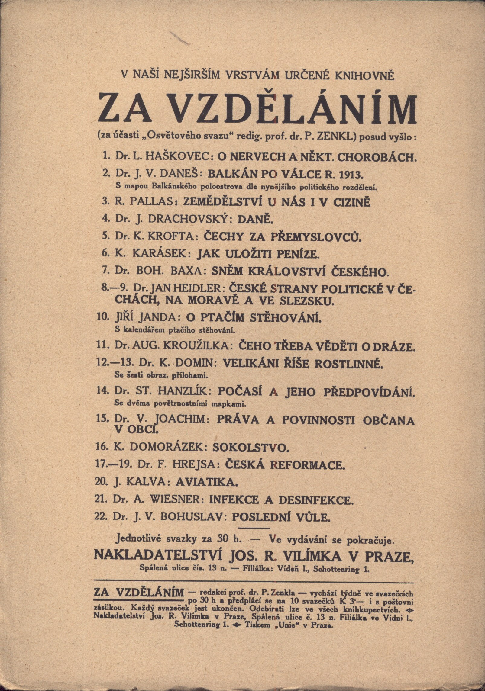Názvové údaje Sebeochrana a pohlavní zdravověda : svědomité a prospěšné rady i předpisy při všech nemocech pohlavních, poučení o pohlavní dospělosti, lásce a manželství, jakož i o následcích onanie, pohlavních výstředností a nákazy : s mnoha novými vyobrazeními / N. Batista ; k třetímu vydání upravil a náležitě doplnil Dr. L. Svoboda Osobní jméno Batista, N. (Autor) Další autoři Svoboda, L. (Sestavovatel, kompilátor) (Autor úvodu atd.) Korp. Rudolf Storch (firma) (Nakladatel, vydavatel) Carl Bellmann (nakladatelství) (Tiskař) Nakladatel V Praze-v Karlíně : Nakladatel Rudolf Storch, knihkupec, [1920] Výrobce Tiskem Karla Bellmanna) Rozsah 173 s. : il. ; 8° Klíčová slova osvětová literatura * naučná literatura * zdravověda * ochrana * sebeochrana * rady * předpisy * pohlavní choroby * pohlavní život * pohlavní dospělost * láska * těhotenství * manželství * r. 1920 Počet ex. 1, z toho volných 1 Druh dok. monografie Signatura AVrbova 324 Názvové údaje Dějiny řádu Tovaryšstva Ježíšova a jeho působení vůbec a v zemích království Českého zvláště / sepsal Tomáš V. Bílek Osobní jméno Bílek, Tomáš V. (Autor) Další autoři Dr. František Bačkovský (nakladatelství) (Nakladatel, vydavatel) Knihtiskárna B. Grunda a V. Svatoně (Tiskař) Nakladatel V Praze : Frant. Bačkovský, 1896 Výrobce Na Král. Vinohradech : Knihtiskárna B. Grunda a V. Svatoně Rozsah 550 stran ; 23 cm Klíčová slova české země * dějiny Čech * Tovaryšstvo Ježíšovo * jezuité * rekatolizace * řeholní řády Počet ex. 1, z toho volných 1 Druh dok. monografie Signatura M 121 e 16 Názvové údaje Poslední vůle / napsal Jos. V. Bohuslav Osobní jméno Bohuslav, Josef Václav, 1863-1952 (Autor) Další autoři Jos. R. Vilímek (nakladatelství) (Nakladatel, vydavatel) Unie (tiskárna) (Tiskař) Nakladatel V Praze : Nakladatel Jos. R. Vilímek, [1914?] Výrobce V Praze : tiskem Unie Rozsah 34 stran ; 20 cm Klíčová slova česká literatura * právníci * rady * poslední vůle * populárně naučná literatura * r. 1914 Počet ex. 1, z toho volných 1 Druh dok. monografie Signatura C12b 16625 Odkazy (1) - Monografie Názvové údaje Život svatého otce Františka zakladatele řádu bratří menších / sepsaný svatým Bonaventurou / z latiny přeložil Antonín L. Stříž ; [dřevoryty vyzdobil Ferdiš Duša] Autor Bonaventura, svatý, asi 1217-1274 (Autor) Další autoři Stříž, Antonín Ludvík, 1888-1960 (Překladatel) Duša, Ferdiš, 1888-1958 (Ilustrátor) Korp. Ladislav Kuncíř (nakladatelství a knihkupectví) (Nakladatel, vydavatel) Kryl a Scotti (firma) (Tiskař) Nakladatel V Praze : Ladislav Kuncíř, 1920 Výrobce Kryl a Scotti) Rozsah 147 s. : il. ; 22 s Osobní hesla František z Assisi, svatý, 1182-1226 - italský mnich a světec Klíčová slova křesťanství * italská literatura * náboženská literatura * italští františkáni * řeholní řády * křesťanští řeholníci * katolická literatura * františkánský řád * řeholní život * křesťanská literatura * František z Assisi Počet ex. 2, z toho volných 2 Druh dok. monografie Signatura Holan 151, VHB 3158 Názvové údaje Činnost řeholních řádů a kongregací v Čechách : 1848-1918 / Eliška Čáňová Osobní jméno Čáňová, Eliška, 1925- (Autor) Nakladatel Praha : Státní ústřední archiv, 1997 Rozsah 79 s. Klíčová slova česká literatura * řeholní řády * kongregace * činnost * Čechy * r. 1848-1918 Počet ex. 2, z toho volných 2 Druh dok. monografie Signatura LA, C12b 1758 Názvové údaje Chronologicum Necrologium Abbatum, et Canonicorum Praemonstratensium Sioneorum, qui mox a primo ingressu Sacris Ordinis in Bohemiam, aut Pragae in Monte Sion, aut aliis in locis ad Annum usque 1816 obierunt / descriptum a Godefrido Joanne Dlabacž, Pragae in Monte Sion Canonico, ibidem Bibliothecae Praefecto primo, domesticorum Annalium Scriptore, Regiarum Societarum Scientiarum Pragae in Bohemia, et Gorlicii in Lusatia Sodali, et (pl. Tit.) Archiepiscopi Pragensis Notario publico, et jurato Osobní jméno Dlabač, Bohumír Jan, 1758-1820 (Sestavovatel, kompilátor) (Autor) (Dedikátor) Další autoři Sommerová, Josefa, -1836 (Tiskař) Pfeiffer, Benedikt Jan Nepomucký, 1783-1834 (Dedikant) Korp. Strahovský klášter (Nakladatel, vydavatel) Sommerova tiskárna (tiskařský podnik) (Tiskař) Nakladatel Pragae : [Monasterium Strahoviensis], 1817 Výrobce (Litteris typographiae Sommerianae) Rozsah 96 s. Klíčová slova katolické řády * církevní dějiny * křesťanské kláštery * premonstráti * Strahovský klášter * církevní hodnostáři * úmrtí * stol. 12.-19. * chronologické přehledy * nekrologium * r. 1140-1816 * r. 1817-1897 Počet ex. 2, z toho volných 2 Druh dok. monografie Signatura C12b 10238, L XVII D 28 Názvové údaje Nachricht von dem Praemonstratenser Frauenstifte zu Kaunicz in Mähren / von Gottfried Johann Dlabacž, erstem Bibliothekar des Stftes Strahow, d. Z. Direktor der kön. böhm. Gesellschaft der Wissenschaften : Für die Abhandlungen der königl. böhm. Gesellschaft der Wissenschaften Osobní jméno Dlabač, Bohumír Jan, 1758-1820 (Autor) Další autoři Haase, Bohumil, 1763-1824 (Tiskař) Korp. Strahovský klášter (Nakladatel, vydavatel) Nakladatel Prag : [Strahovský klášter], 1817 Výrobce (gedruckt bei Gottlieb Haase) Rozsah 46, [2] s. ; 8° Klíčová slova české dějiny * církevní dějiny * katolické řády * řeholní řády * premonstráti * klášter premonstrátek * klášter Rosa coeli * Dolní Kounice * studie * r. 1183-1808 Počet ex. 1, z toho volných 1 Druh dok. monografie Signatura PK 0003
