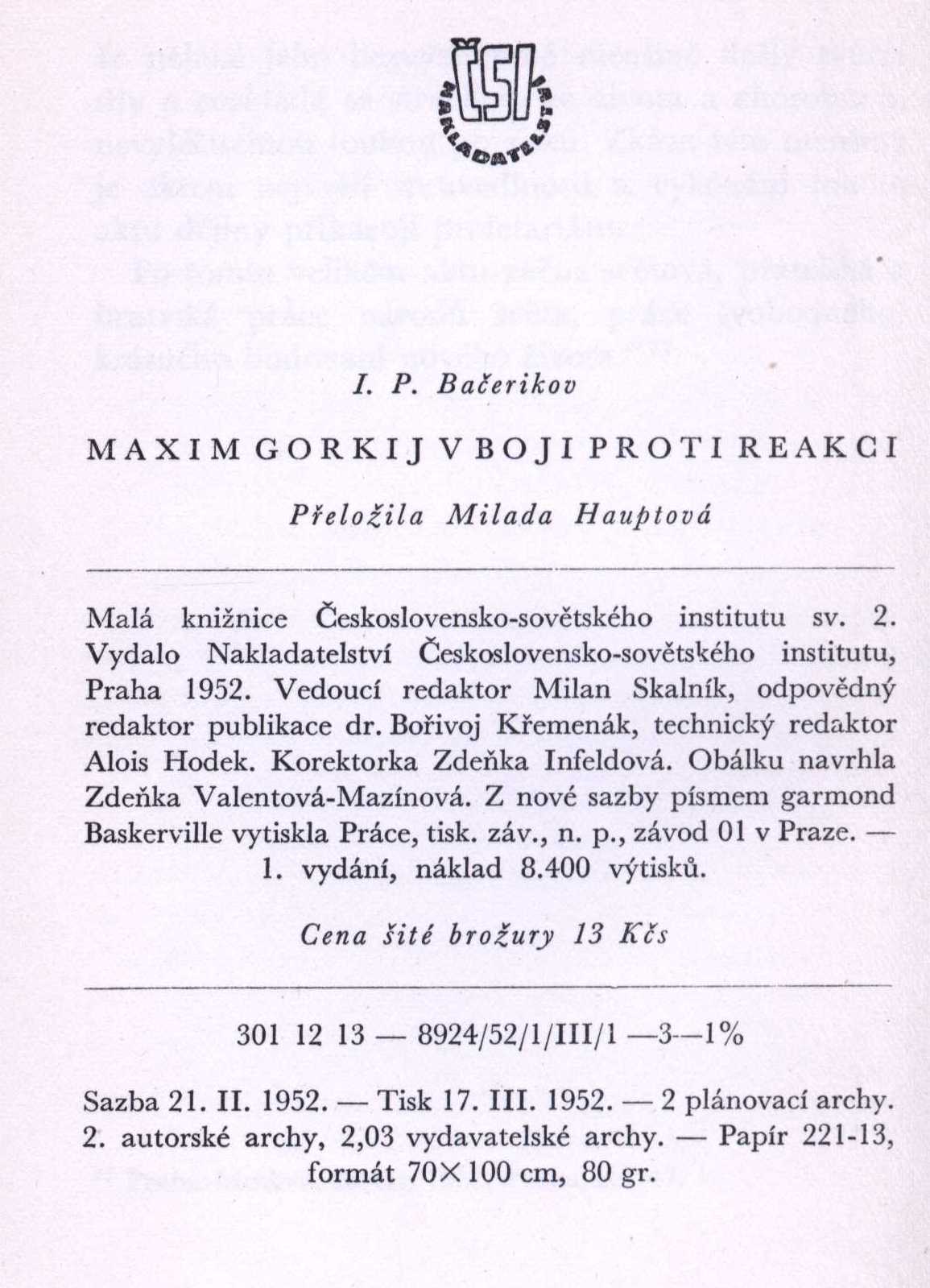 Názvové údaje Aleksandr Ivanovič Kuprin : kritiko-biografičeskij očerk / Vladislav Nikolajevič Afanas'jev Osobní jméno Afanas'jev, Vladislav Nikolajevič (Autor) Další autoři Chudožestvennaja literatura (nakladatelství) (Nakladatel, vydavatel) Nakladatel Moskva : Chudožestvennaja literatura, 1972 Rozsah 172 stran Osobní hesla Kuprin, Aleksandr Ivanovič, 1870-1938 - ruský prozaik Klíčová slova ruští spisovatelé * Rusko * stol. 19.-20. * biografie Počet ex. 2, z toho volných 2 Druh dok. monografie Signatura R 37a 44, M 96g 247 Názvové údaje O Puškine : stat'ji i zametki / Anna Achmatova Osobní jméno Achmatova, Anna Andrejevna, 1889-1966 (Autor) Nakladatel Leningrad : Sovetskij pisatel', 1977 Rozsah 316 s. Osobní hesla Puškin, Aleksandr Sergejevič, 1799-1837 - ruský básník, prozaik a dramatik Klíčová slova ruská literatura * ruští spisovatelé * Puškin A. S. * život a dílo * studie Počet ex. 1, z toho volných 1 Druh dok. monografie Signatura BVolkova 0033 Názvové údaje V bezesných nocích / Innokentij Anněnskij ; z ruského originálu Stichotvorenija i tragedii vybral a přeložil Václav Daněk Osobní jméno Annenskij, Innokentij Fedorovič, 1855-1909 (Autor) Další autoři Daněk, Václav, 1929-2025 (Sestavovatel, kompilátor) Honzík, Jiří, 1924-2018 (Autor úvodu atd.) Korp. Odeon (nakladatelství) (Nakladatel, vydavatel) Mír, novinářské závody (tiskárna) (Tiskař) Nakladatel Praha : Odeon, 1978 Výrobce Mír 1 Rozsah 185 stran Osobní hesla Annenskij, Innokentij Fedorovič, 1855-1909 - ruský básník, dramatik, překladatel a publicista Klíčová slova ruští básníci * ruští spisovatelé * překladatelé * Rusko * stol. 19.-20. * život a dílo * biografie Počet ex. 2, z toho volných 2 Druh dok. monografie Signatura P 136 b 73, M 111 f 58 Názvové údaje Proč a komu je zapotřebí poezie? / Nikolaj Asejev ; z ruského originálu ... a z různých sbírek a sborníků vybral, přeložil předmluvu a poznámky napsal a obrazovými přílohami opatřil Jiří Taufer ; obálku, vazbu a grafickou úpravu navrhl Zbyněk Sekal ; k Jeseninově básni Černý muž připojeny ilustrace Františka Tichého Osobní jméno Asejev, Nikolaj Nikolajevič, 1889-1963 (Autor) Další autoři Taufer, Jiří, 1911-1986 (Sestavovatel, kompilátor) (Překladatel) (Autor úvodu atd.) (Autor komentáře) Sekal, Zbyněk, 1923-1998 (Autor obálky) (Výtvarník vazby) Tichý, František, 1896-1961 (Ilustrátor) Korp. Odeon (nakladatelství) (Nakladatel, vydavatel) Rudé právo (tiskárna, Praha) (Tiskař) Nakladatel Praha : Odeon, 1967 Výrobce Rudé právo Rozsah 306 stran : ilustrace Klíčová slova ruská literatura * překlad * ruští spisovatelé * filozofie literatury * vliv poezie * úvahy * studie * vzpomínky * ukázky z děl * dokumenty Počet ex. 5, z toho volných 5 Druh dok. monografie Signatura C12a 1958, C12a 3747, RSzpuk 0708, P 106 g 36, P 106 g 35 Názvové údaje Maxim Gorkij v boji proti reakci / I.P. Bačerikov ; [přeložila Milada Hauptová] Osobní jméno Bačerikov, I.P. (Autor) (Dedikátor) Další autoři Pošarová, Milada, 1930- (Překladatel) Slabý, Zdeněk Karel, 1930-2020 (Dedikant) Nakladatel Praha : Nakladatelství Československo-sovětského institutu, 1952 Výrobce (Práce, n.p., záv. 01) Rozsah 59 s. Osobní hesla Gor‘kij, Maksim, 1868-1936 - ruský spisovatel, dramatik, publicista, politický činitel Klíčová slova ruští spisovatelé * sovětští politici * Sovětský svaz * stol. 20. * politické názory * studie Počet ex. 1, z toho volných 1 Druh dok. monografie Signatura ZKSlabý 0505 Názvové údaje Běsové : (životní drama Dostojevského) / Jan Bartoš Osobní jméno Bartoš, Jan, 1893-1946 (Autor) (Nakladatel, vydavatel) Další autoři Zink, Karel, 1889-1975 (Dřívější majitel) Korp. "Grafia", dělnická knihtiskárna (tiskárna, nakladatelství) (Tiskař) Nakladatel Praha : nákladem vlastním, 1914 Výrobce V Praze : tiskem "Grafie", dělnické knihtiskárny Rozsah 26 stran, 1 nečíslovaný list obrazové přílohy : fotografie ; 19 cm Osobní hesla Dostojevskij, Fedor Michajlovič, 1821-1881 - ruský spisovatel Klíčová slova česká literatura * pojednání * Bartoš J. * ruská literatura * ruští spisovatelé * Dostojevskij F. M. Počet ex. 1, z toho volných 1 Druh dok. monografie Signatura VZinková 0512 Názvové údaje N. V. Gogol / napsal Michal Bašmak Osobní jméno Bašmak, Michal, 1893-1976 (Autor) Další autoři Orbis (tiskárna) (Nakladatel, vydavatel) Nakladatel Praha : Orbis, 1947 Rozsah 29, [3] s. : il. ; 18 cm Osobní hesla Gogol‘, Nikolaj Vasil‘jevič, 1809-1852 - ruský prozaik, dramatik Klíčová slova ruští spisovatelé * Rusko * stol. 19. * život a dílo * biografie Počet ex. 3, z toho volných 3 Druh dok. monografie Signatura Holan 549, C12a 3823, KaG XXXII F2 9 Názvové údaje Evoluce obrazu Stavroginova / A.L. Bém ; přeložila Anna Tesková Osobní jméno Bem, Al‘fred Ljudvigovič, 1886-1945 (Autor) Další autoři Pražák, Albert, 1880-1956 (Dedikant) Tesková, Anna, 1872-1954 (Překladatel) Nakladatel [Praha] [nakladatel není známý] [1931] Rozsah Strany 148-180 ; 21, 5 cm Osobní hesla Dostojevskij, Fedor Michajlovič, 1821-1881 - ruský spisovatel Idiot Klíčová slova ruští spisovatelé * dílo * literární námět * rozbor postavy * literární rozbor Počet ex. 1, z toho volných 1 Druh dok. separáty Signatura M 75 e 19 Názvové údaje Tajemství osobnosti Dostojevského : několik kritických kapitol / A. L. Bém ; přeložila z rukopisu Anna Tesková ; s úvodem E. Svobody Osobní jméno Bem, Al‘fred Ljudvigovič, 1886-1945 (Autor) Další autoři Tesková, Anna, 1872-1954 (Překladatel) Svoboda, Emil, 1878-1948 (Autor úvodu atd.) Korp. J. Otto (nakladatelství) (Nakladatel, vydavatel) Veleslavín, spol. s r. o. (knihtiskárna) (Tiskař) Nakladatel [Praha] : nakladatelství J. Otto, spol. s r.o. [1928] V