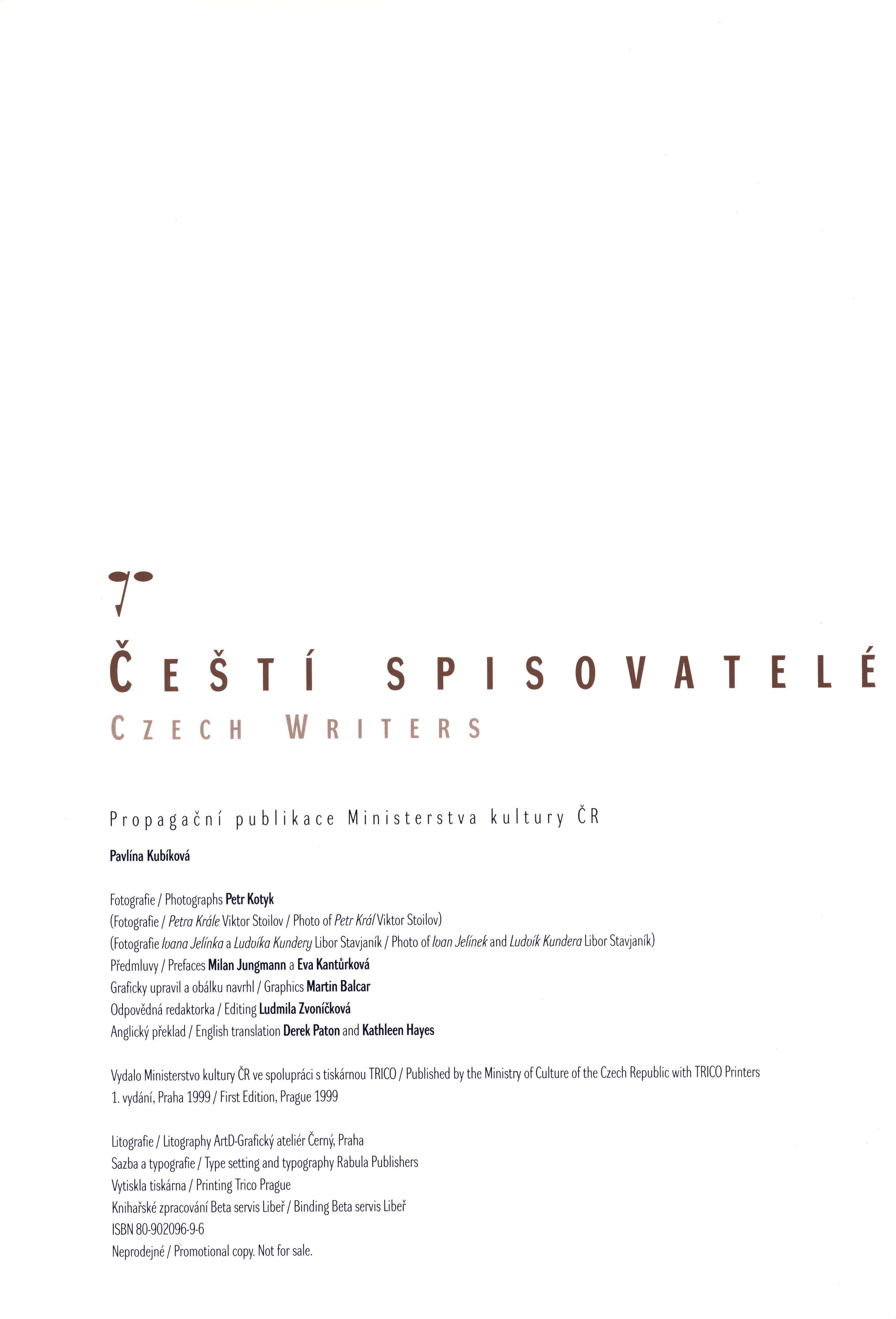 Názvové údaje Čeští spisovatelé = Czech Writers / Pavlína Kubíková ; fotografie Petr Kotyk ; fotografie Viktor Stoilov a Libor Stavjaník ; předmluvy Milan Jungmann a Eva Kantůrková ; grafickou úpravu a obálku navrhl Martin Balcar ; odpovědná redaktorka Ludmila Zvoníčková ; anglický překlad Derek Paton a Kathleen Hayes Osobní jméno Kubíková, Pavlína (Autor) Další autoři Kotyk, Petr, 1963- (Autor) (Fotograf) Stoilov, Viktor, 1961- (Fotograf) Stavjaník, Libor, 1965- (Fotograf) Jungmann, Milan, 1922-2012 (Autor úvodu atd.) Kantůrková, Eva, 1930- (Autor úvodu atd.) Balcar, Martin, 1957- (Grafický technik) (Autor obálky) Zvoníčková, Ludmila (Redaktor, výkonný redaktor) Paton, Derek, 1958- (Překladatel) Hayes, Kathleen, 1955- (Překladatel) Korp. Česko. Ministerstvo kultury (Nakladatel, vydavatel) Trico (tiskárna) (Tiskař) Nakladatel Praha : Ministerstvo kultury ČR, 1999 Výrobce Trico Rozsah 123 stran : fotografie ; 30 cm Klíčová slova česká literatura * současní spisovatelé * čeští spisovatelé * bibliografie * biografická data * stol. 20., 2. pol. Počet ex. 3, z toho volných 3 Druh dok. monografie Signatura C12d 448, Listopad 0378, Listopad 0381 Názvové údaje Dimension : contemporary German arts & letters : the image of America in contemporary German writing. Special issue 1983 / editor A. Leslie Willson Další autoři Willson, A. Leslie (Amos Leslie) 1923- (Editor) Korp. University of Texas at Austin (Dept. of Germanic Languages) Nakladatel Austin TX : The University of Texas, 1983 Rozsah 568 s. Klíčová slova němečtí spisovatelé * současní spisovatelé * Amerika * podoby * zobrazení * literární náměty * německá poezie * německá próza Počet ex. 2, z toho volných 2 Druh dok. monografie Signatura Fuks 0794, C12c 2717 Názvové údaje The return of Král Majáles : Prague's international literary renaissance 1990-2010 an anthology / edited by Louis Armand Další autoři Armand, Louis, 1972- (Editor) Nakladatel Praha : Univerzita Karlova, Filozofická fakulta, 2010 Výrobce (PB Tisk) Rozsah 937 s. : il., portréty ; 23 cm Klíčová slova Praha (Česko) * kulturní život * literatura * společenský život * stol. 20.-21. * společenské změny * současní spisovatelé * světoví spisovatelé * literární náměty * r. 1990-2010 * antologie Počet ex. 1, z toho volných 1 Druh dok. monografie Signatura C12c 3212