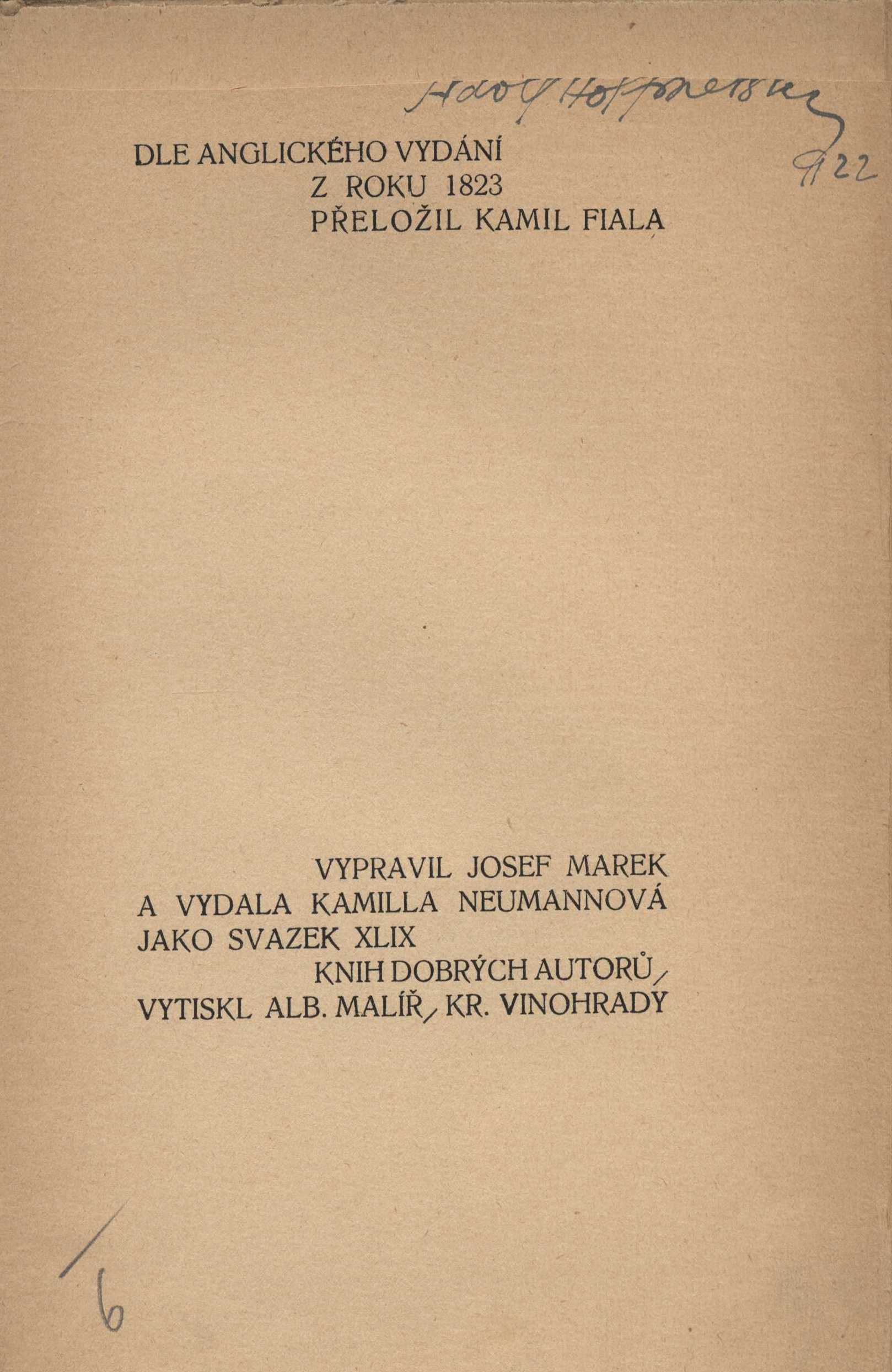 1. Title informationZpověď anglického poživače opia / Thomas De Quincey ; dle anglického vydání z roku 1823 přeložil Kamil Fiala ; vypravil Josef Marek