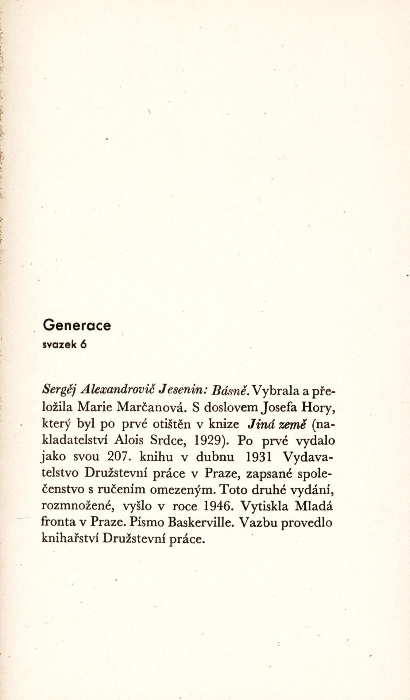 Title informationBásně / Sergej Jesenin ; vybrala a přeložila Marie Marčanová ; s doslovem Josefa Hory