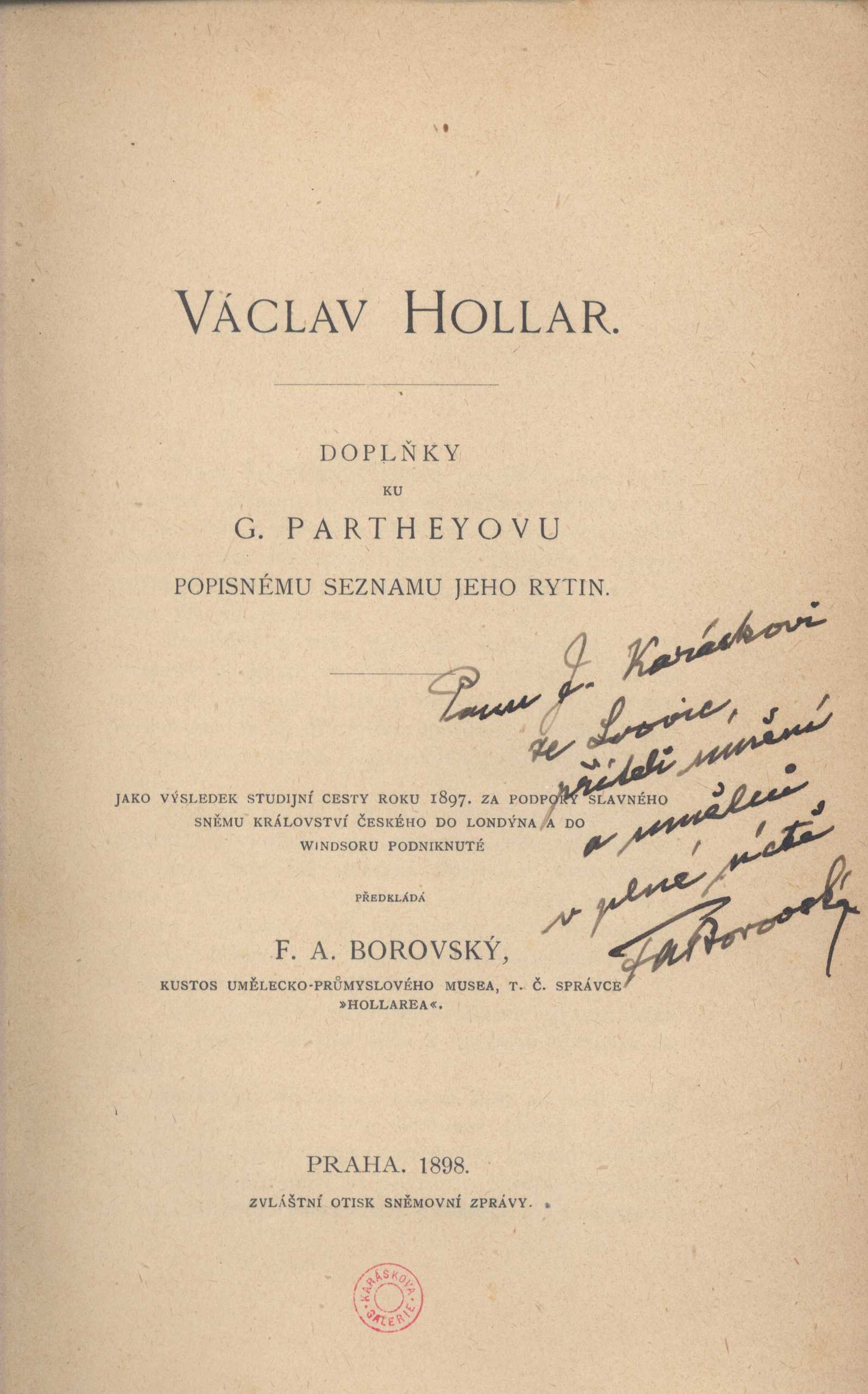 1. Title informationVáclav Hollar : doplňky ku Partheyovu popisnému seznamu jeho rytin / jako výsledek studijní cesty roku 1897. za podpory slavného Sněmu království českého do Londýna a do Windsoru podniknuté předkládá F. A. Borovský