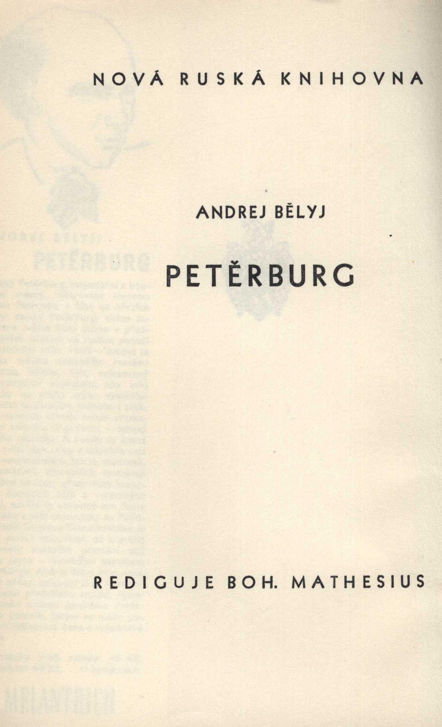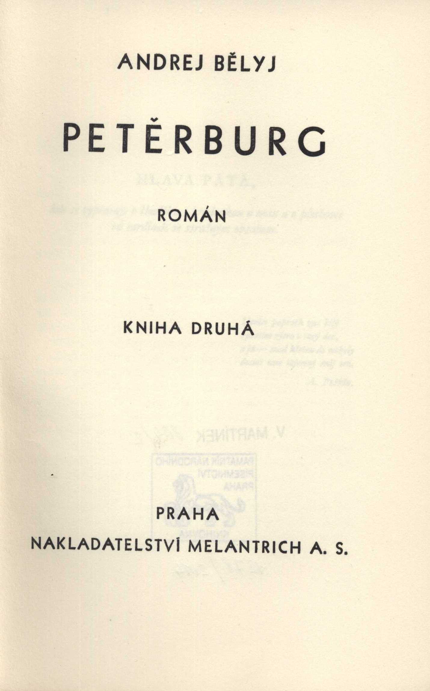 Názvové údajePetěrburg : román / Andrej Bělyj ; [přeložil Boh. Mathesius]. Kniha druhá