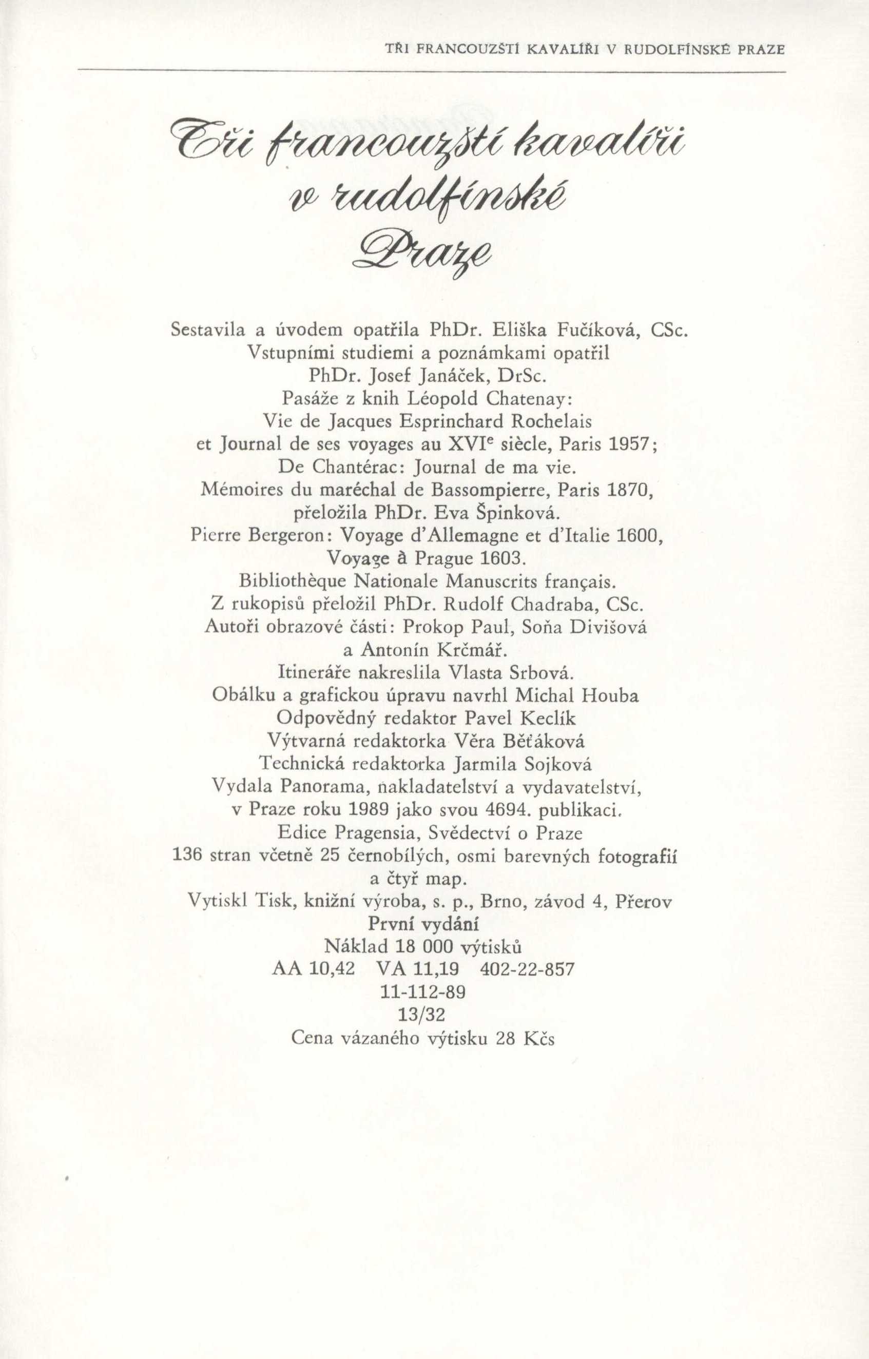 1. Title informationTři francouzští kavalíři v rudolfínské Praze / Jacques Esprinchard, Pierre Bergeron, François de Bassompierre ; [sestavila a úvodem opatřila Eliška Fučíková ; vstupními studiemi a poznámkami opatřil Josef Janáček ; pasáže z knih ... přeložila Eva Špinková ; z rukopisů přeložil Rudolf Chardraba. itineráře nakreslila Vlasta Srbová. obálku a grafickou úpravu navrhl Michal Houba]