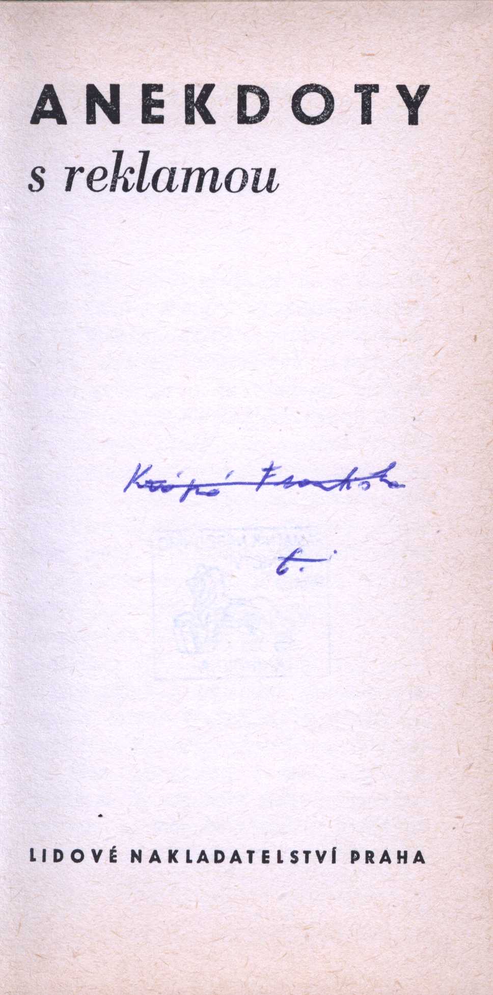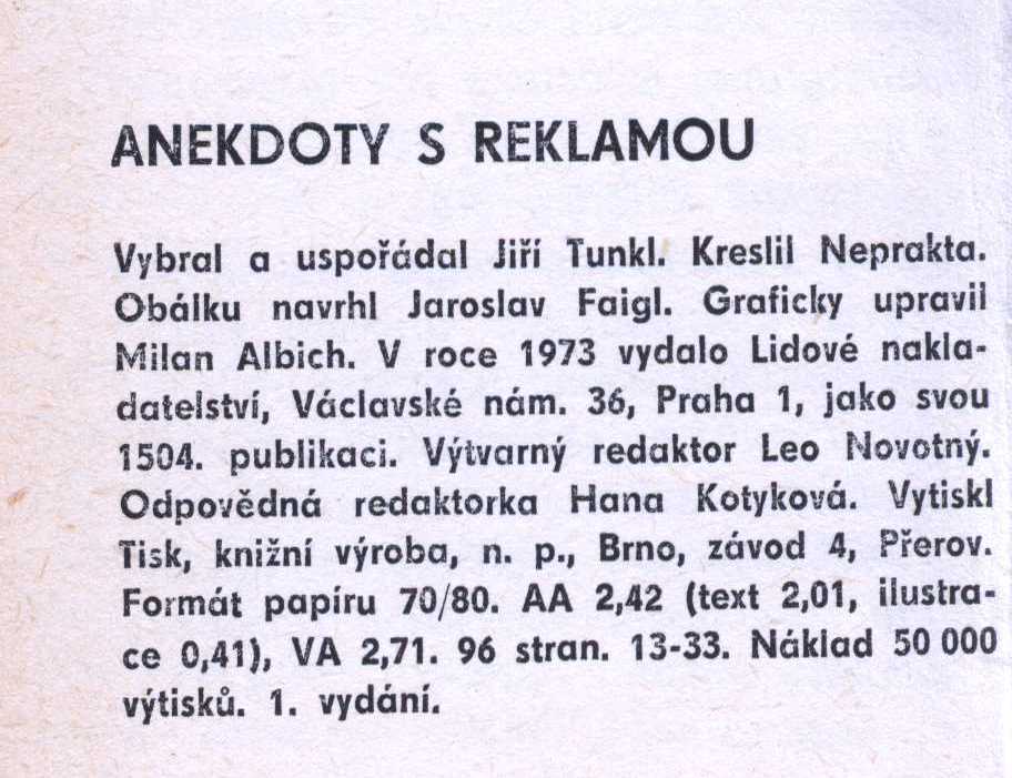 1. Title informationAnekdoty s reklamou / vybral a uspořádal Jiří Tunkl ; kreslil Neprakta ; obálku navrhl Jaroslav Faigl ; graficky upravil Milan Albich