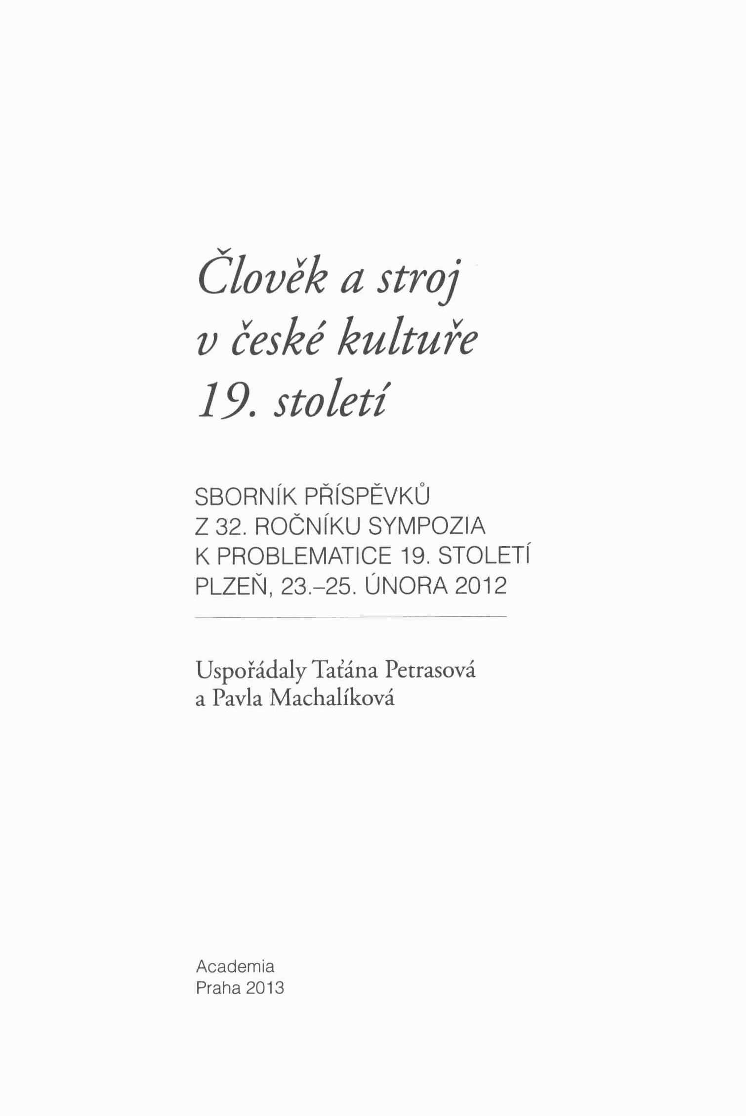 1. Title informationČlověk a stroj v české kultuře 19. století : sborník příspěvků z 32. ročníku sympozia k problematice 19. století : Plzeň, 23.–25. února 2012 / uspořádaly Taťána Petrasová a Pavla Machalíková ; [překlad resumé do angličtiny Kateřina Millerová ; obálka podle grafického návrhu Vladimíra Nárožníka Robin Brichta ; jmenný rejstřík sestavila Taťána Petrasová]